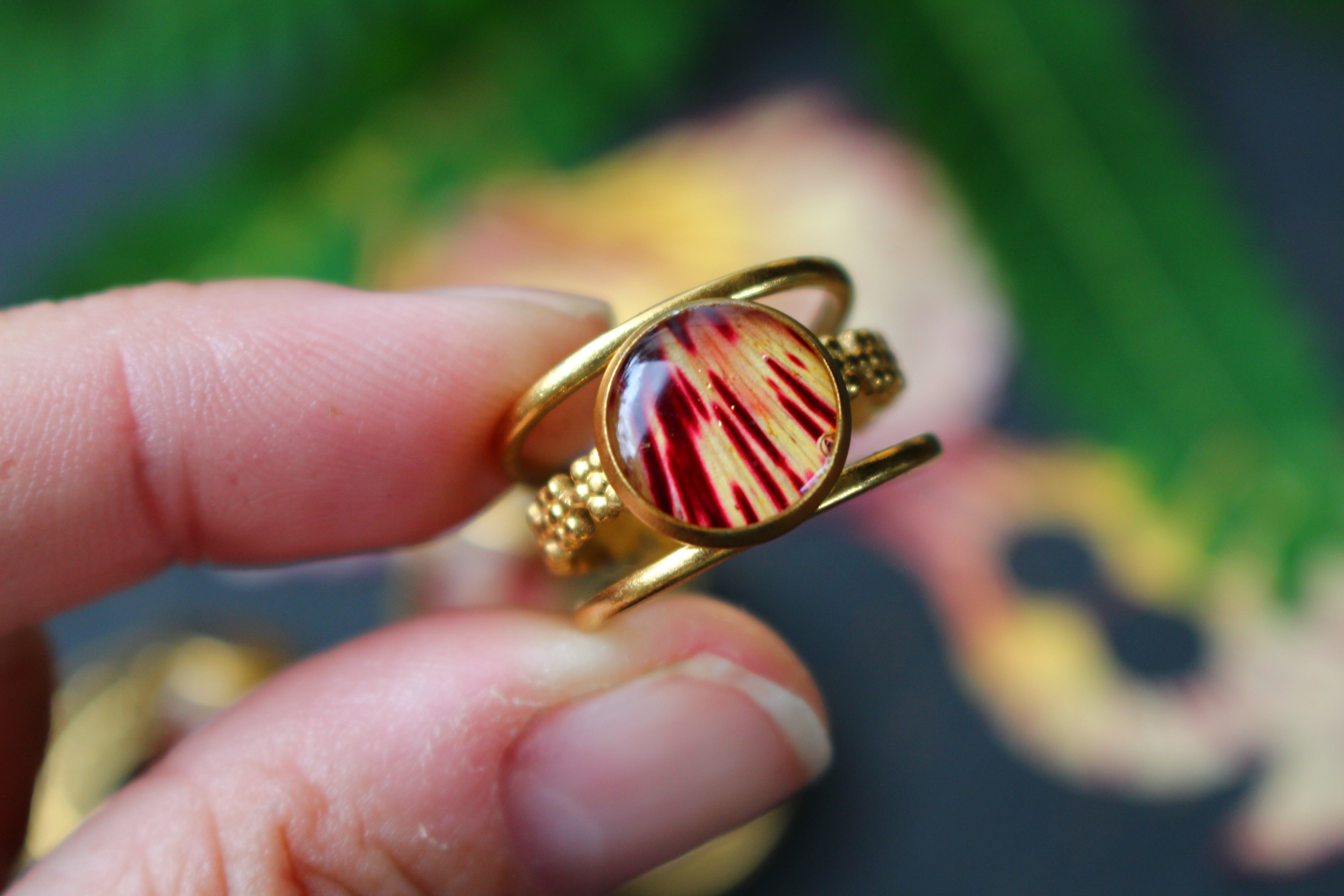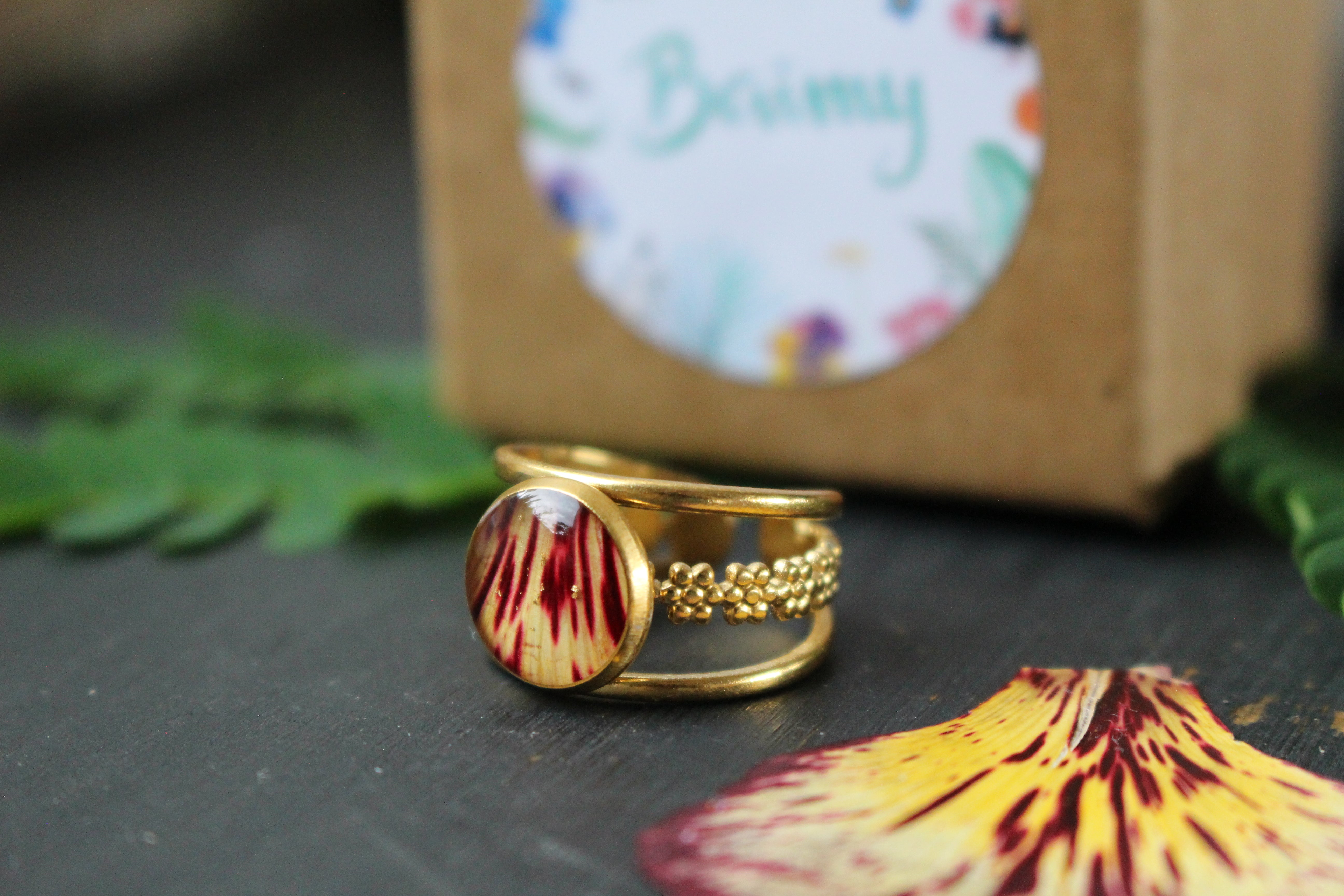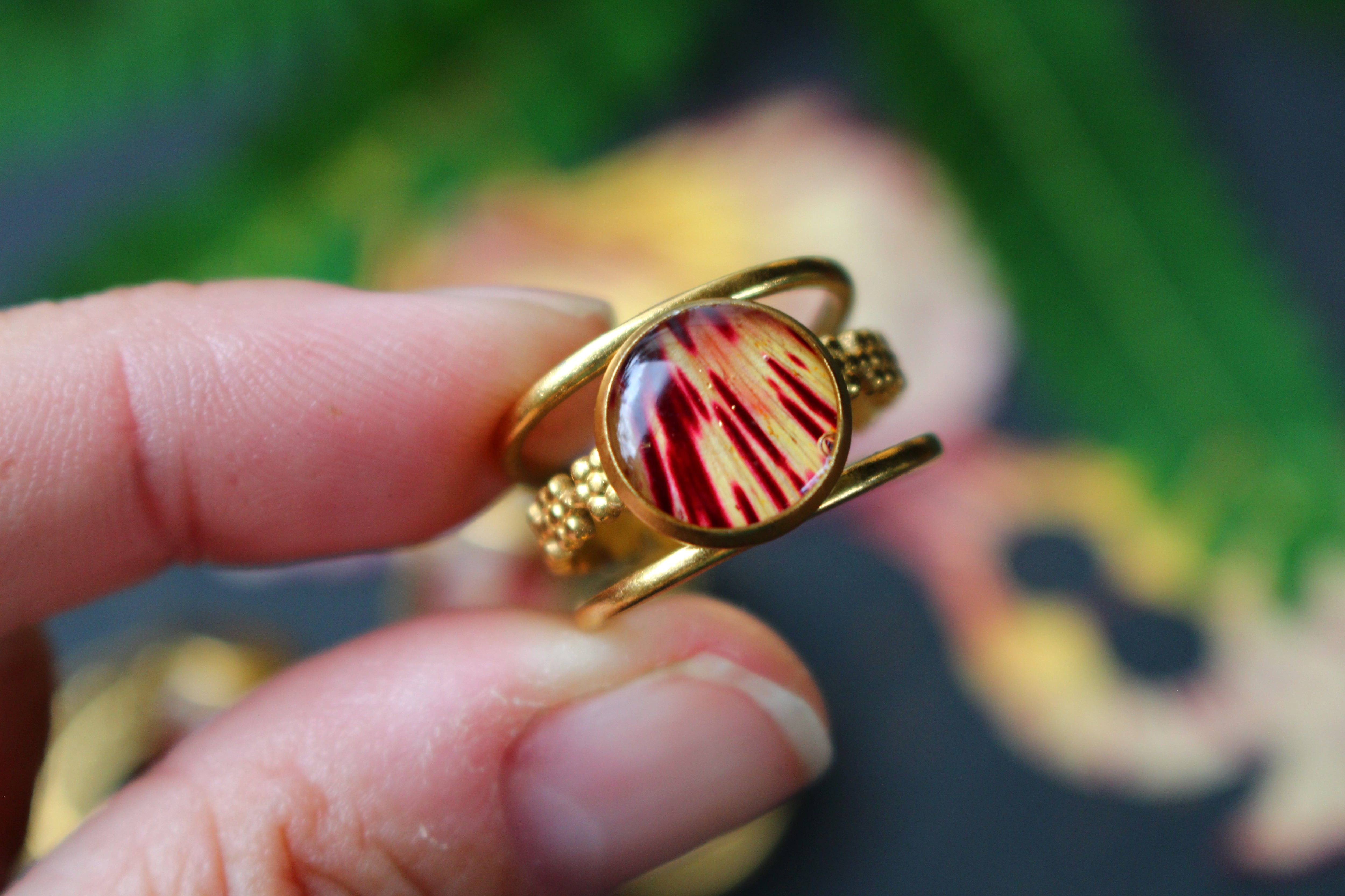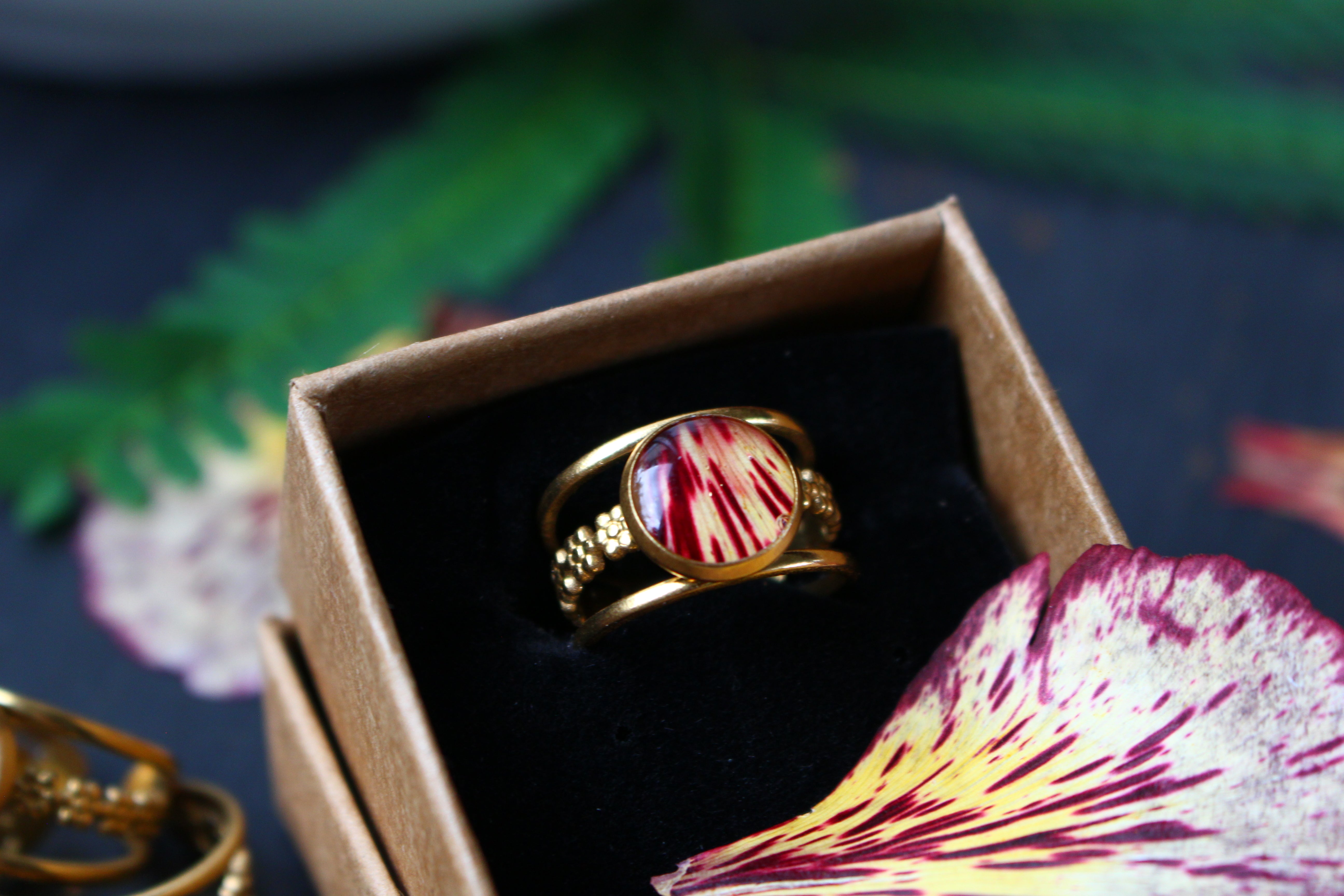 Bague composée d'un cabochon de 10mm de diamètre rempli de résine dans laquelle est incrustée une partie de pétale de flamboyant et quelques morceaux de feuilles d'or.