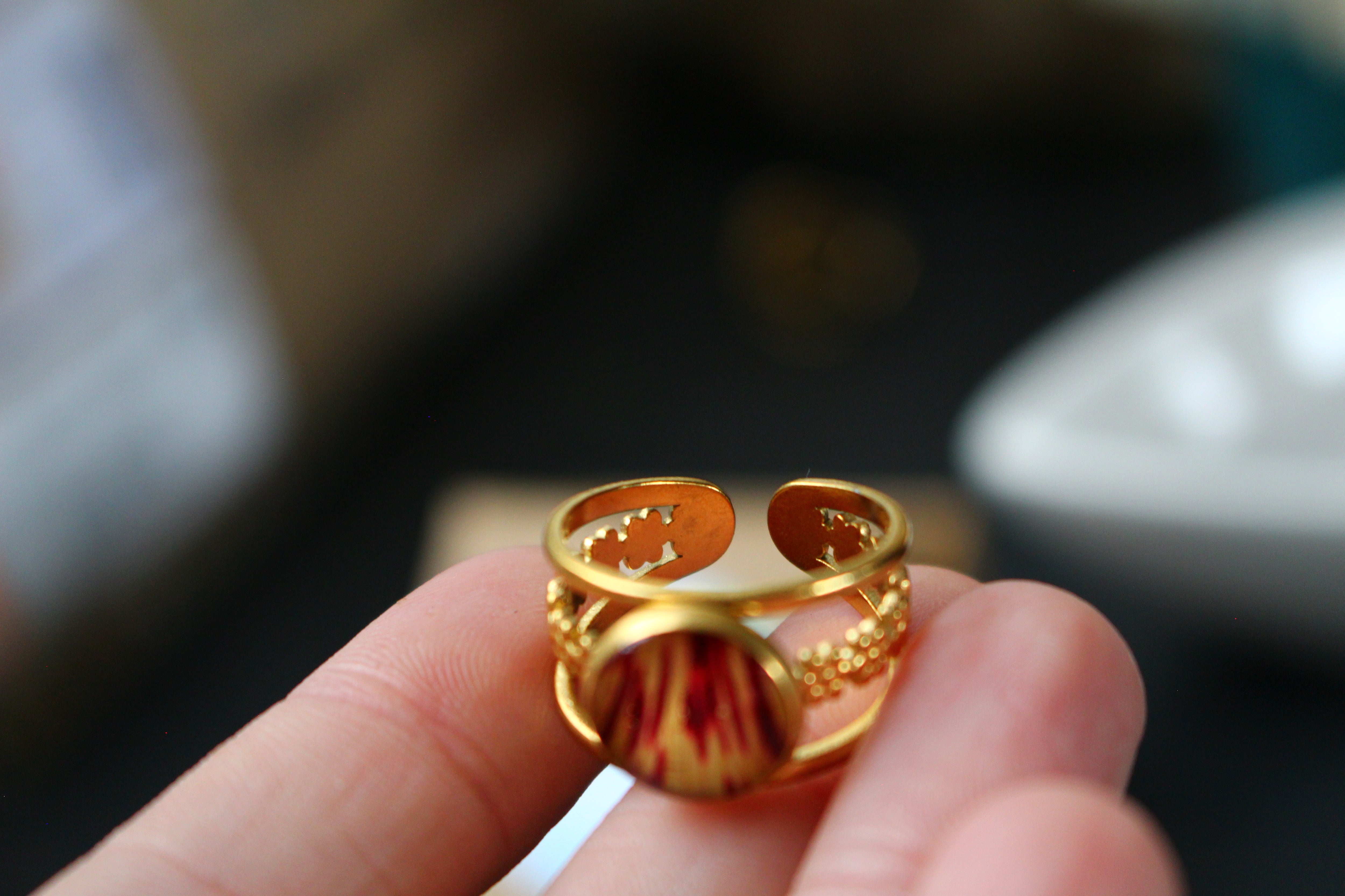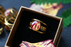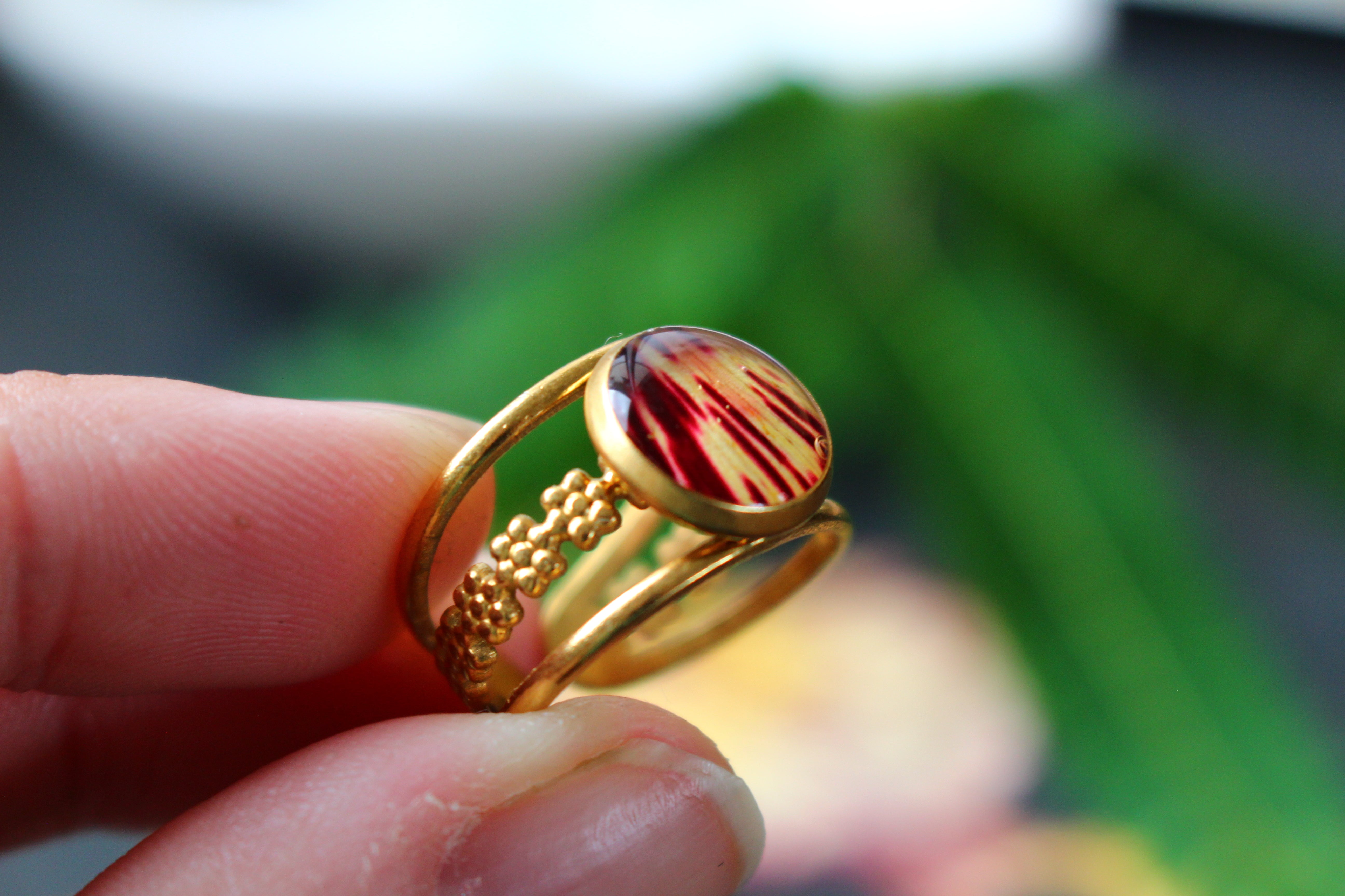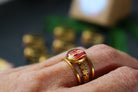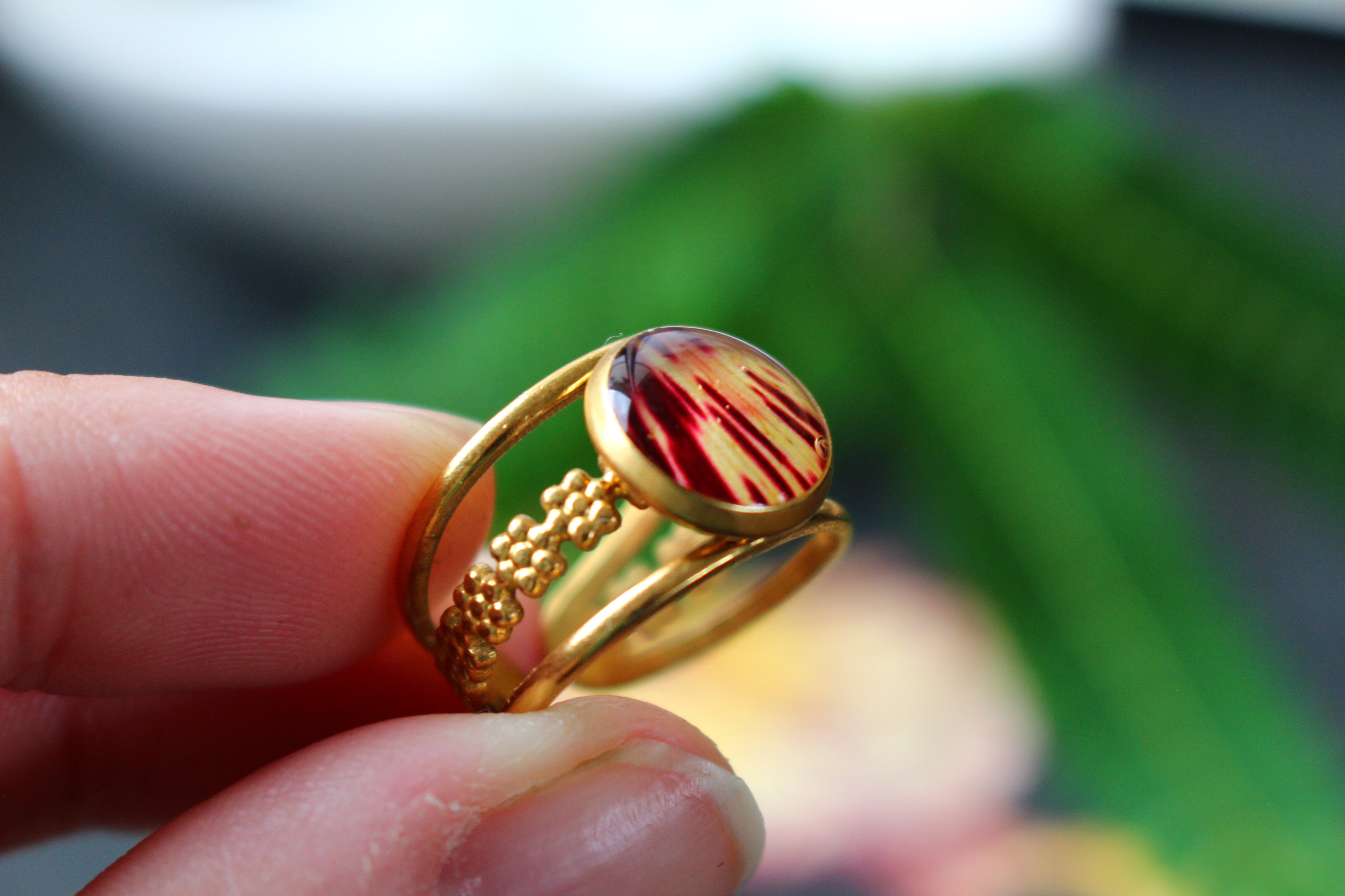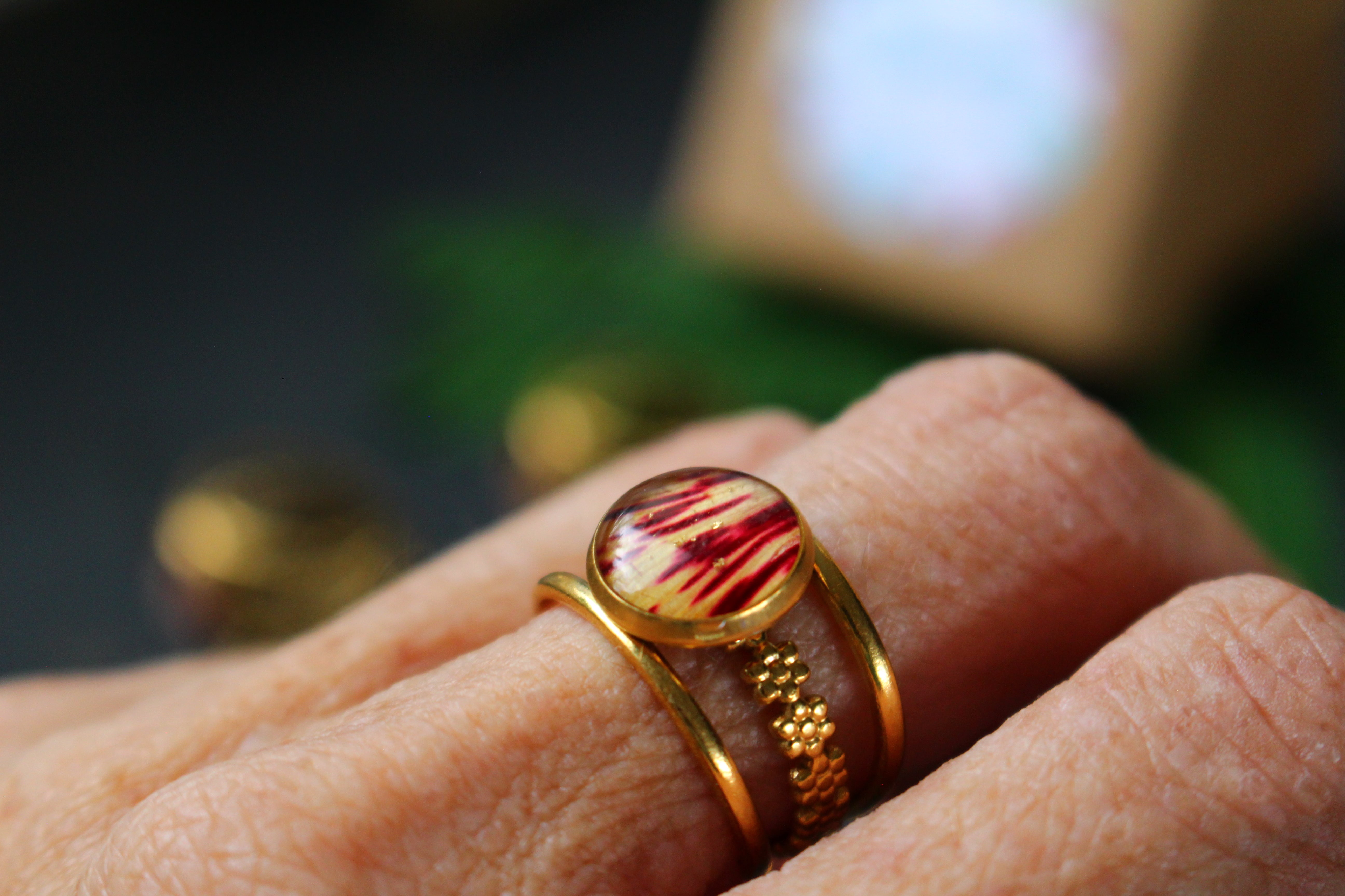 Bague composée d'un cabochon de 10mm de diamètre rempli de résine dans laquelle est incrustée une partie de pétale de flamboyant et quelques morceaux de feuilles d'or.