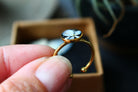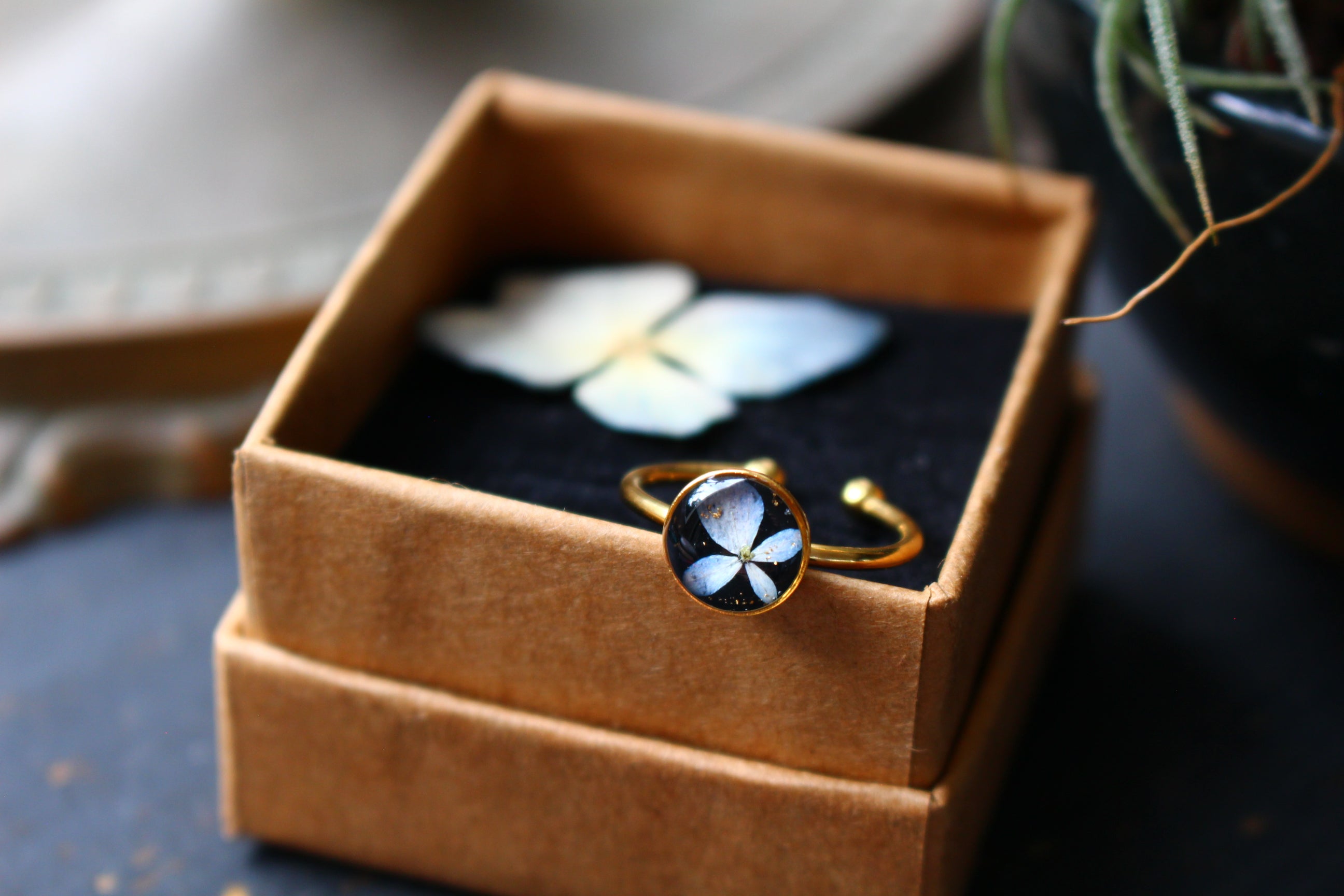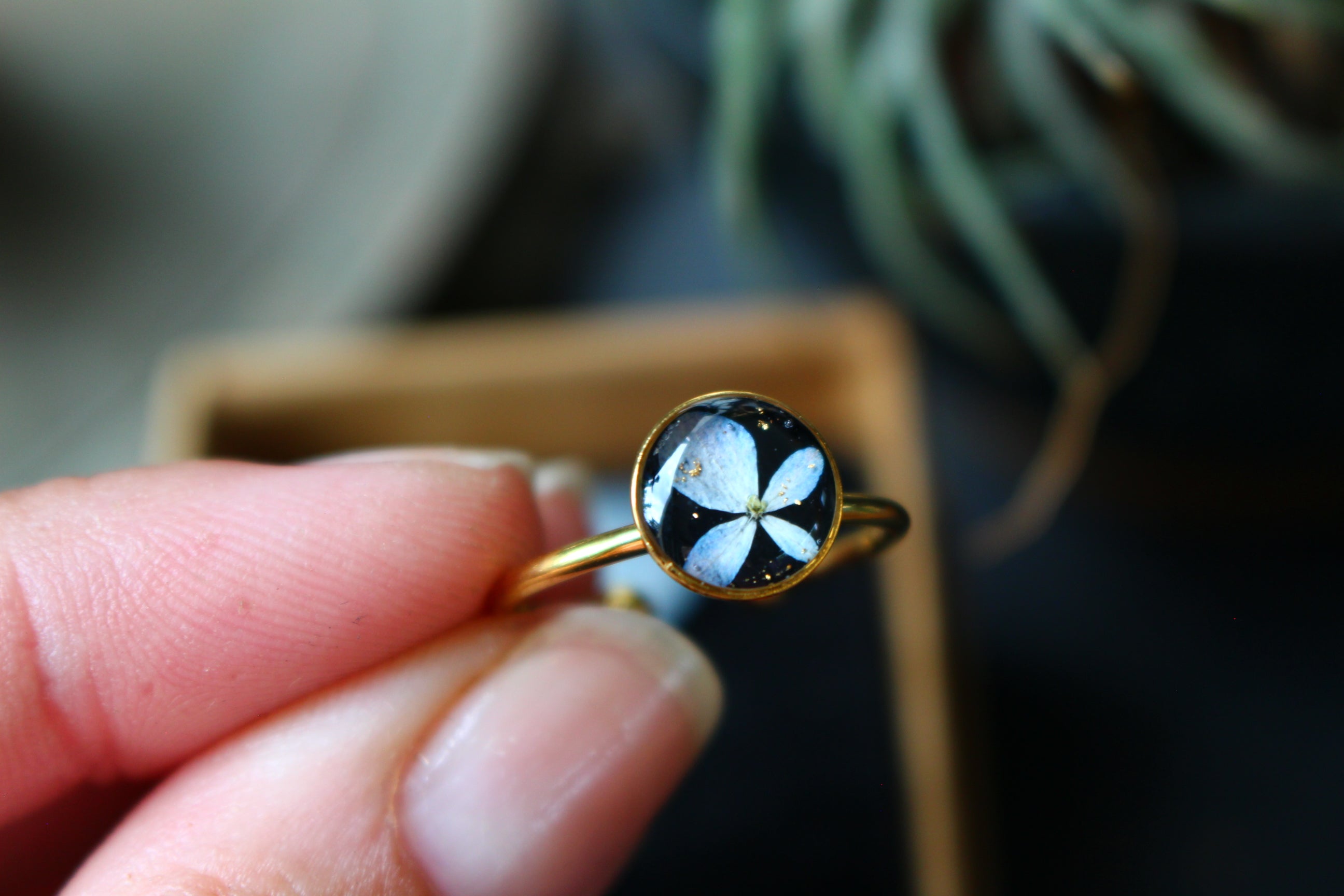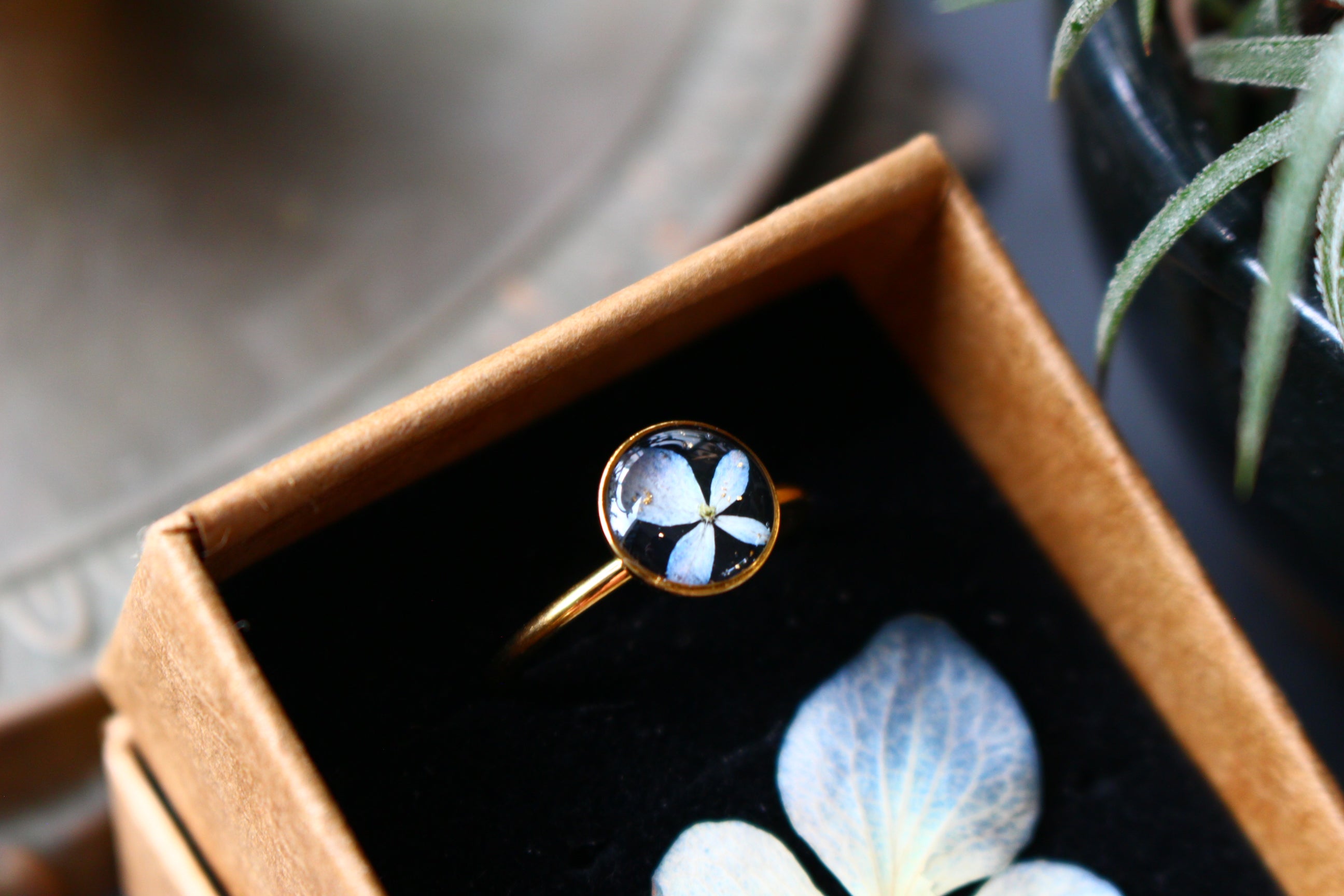 Bague composée d'un cabochon de 8mm de diamètre rempli de résine dans laquelle est incrustée une petite fleur d'hortensia et quelques morceaux de feuilles d'or.