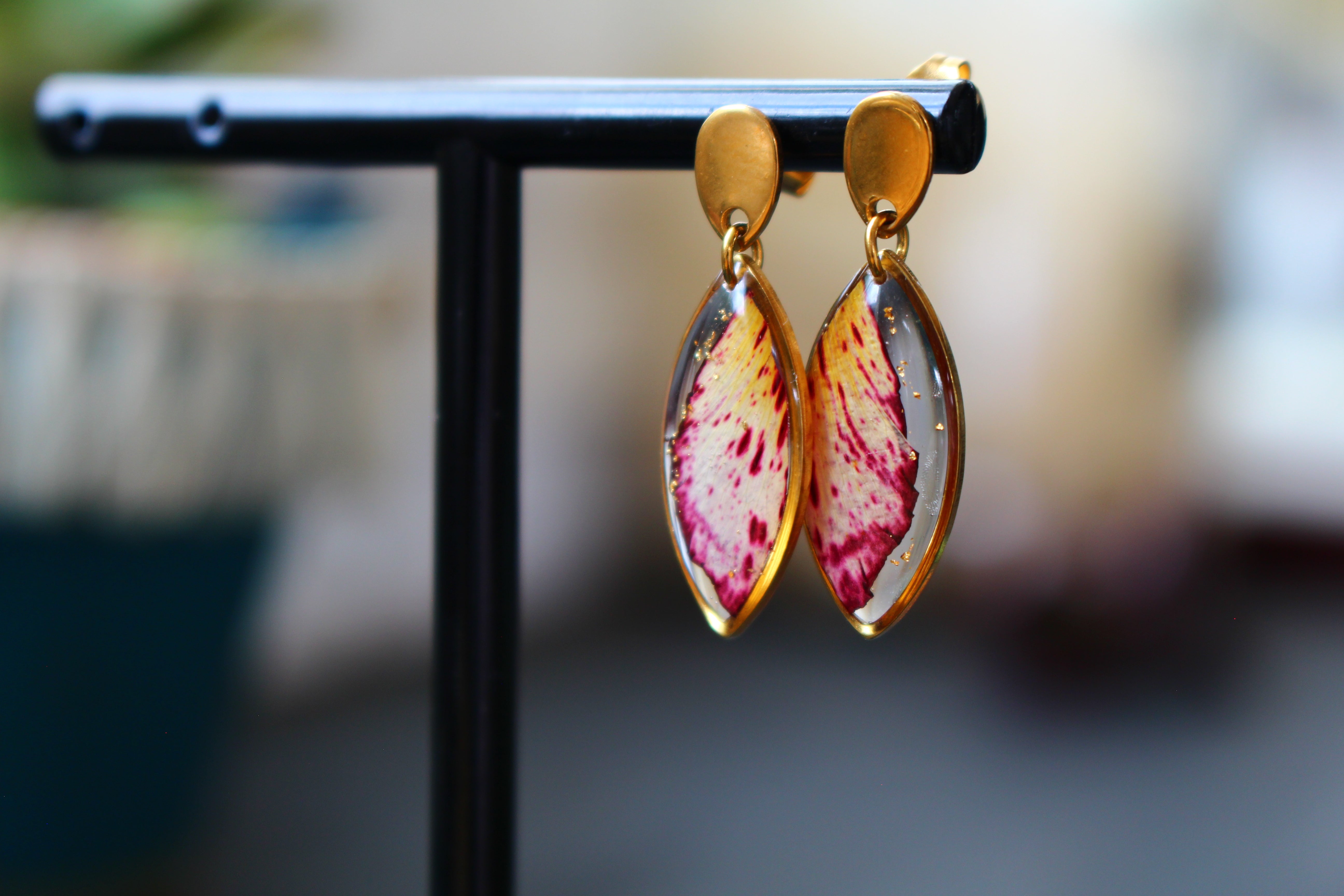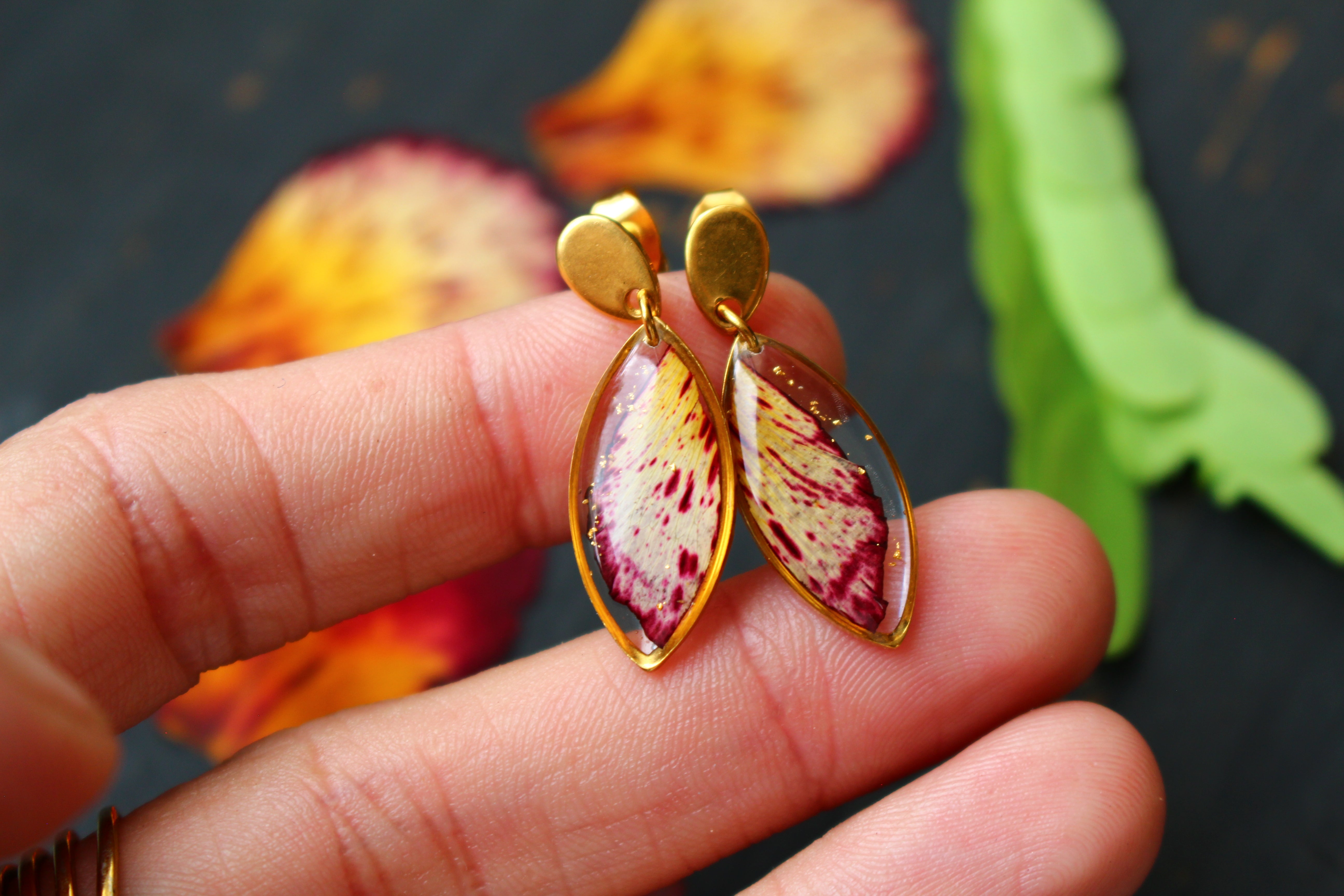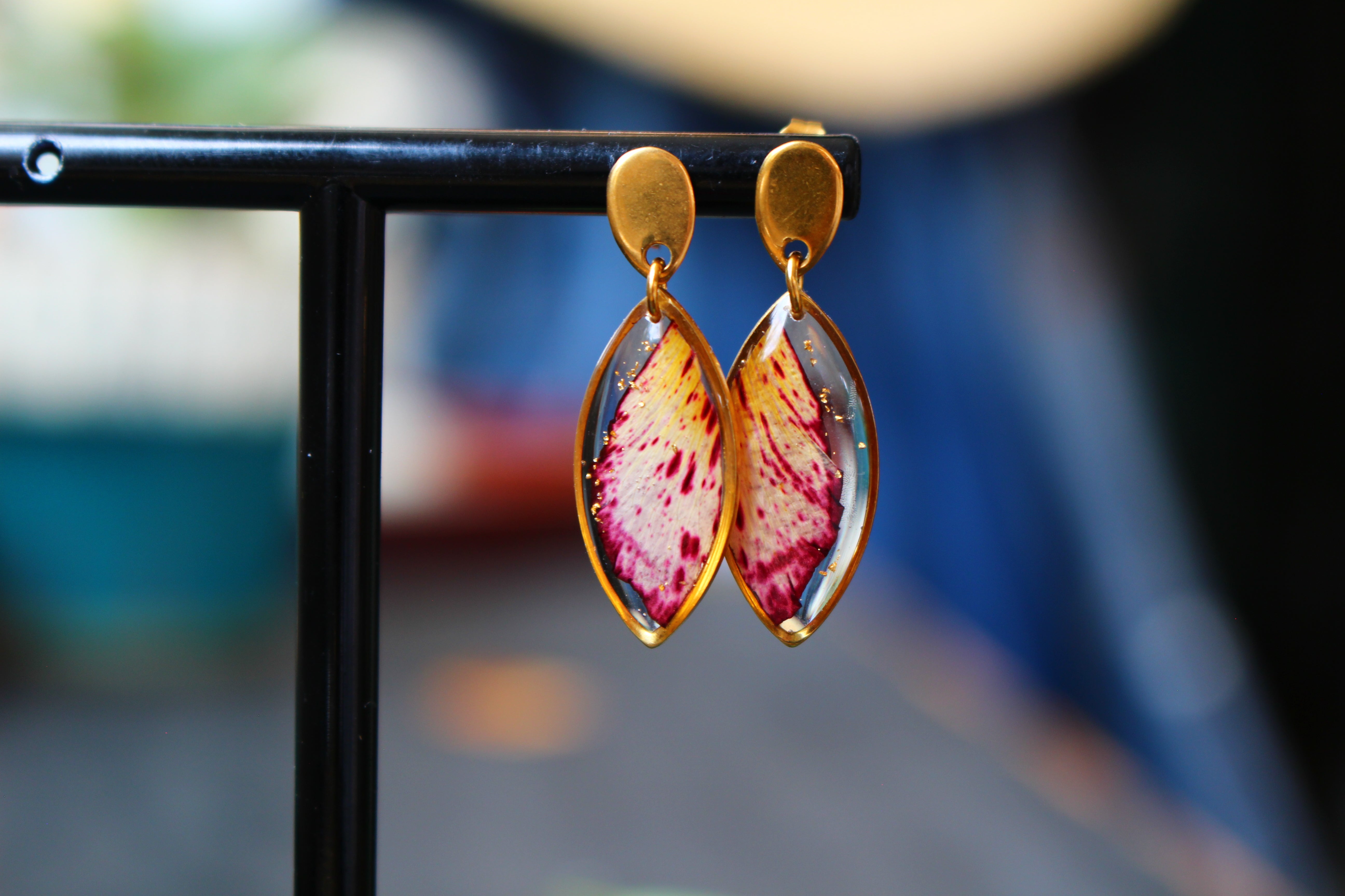 Boucles composées en forme d' "amandes" remplis de résine dans laquelle j'ai incrusté une partie de pétale de flamboyant et quelques feuilles d'or.