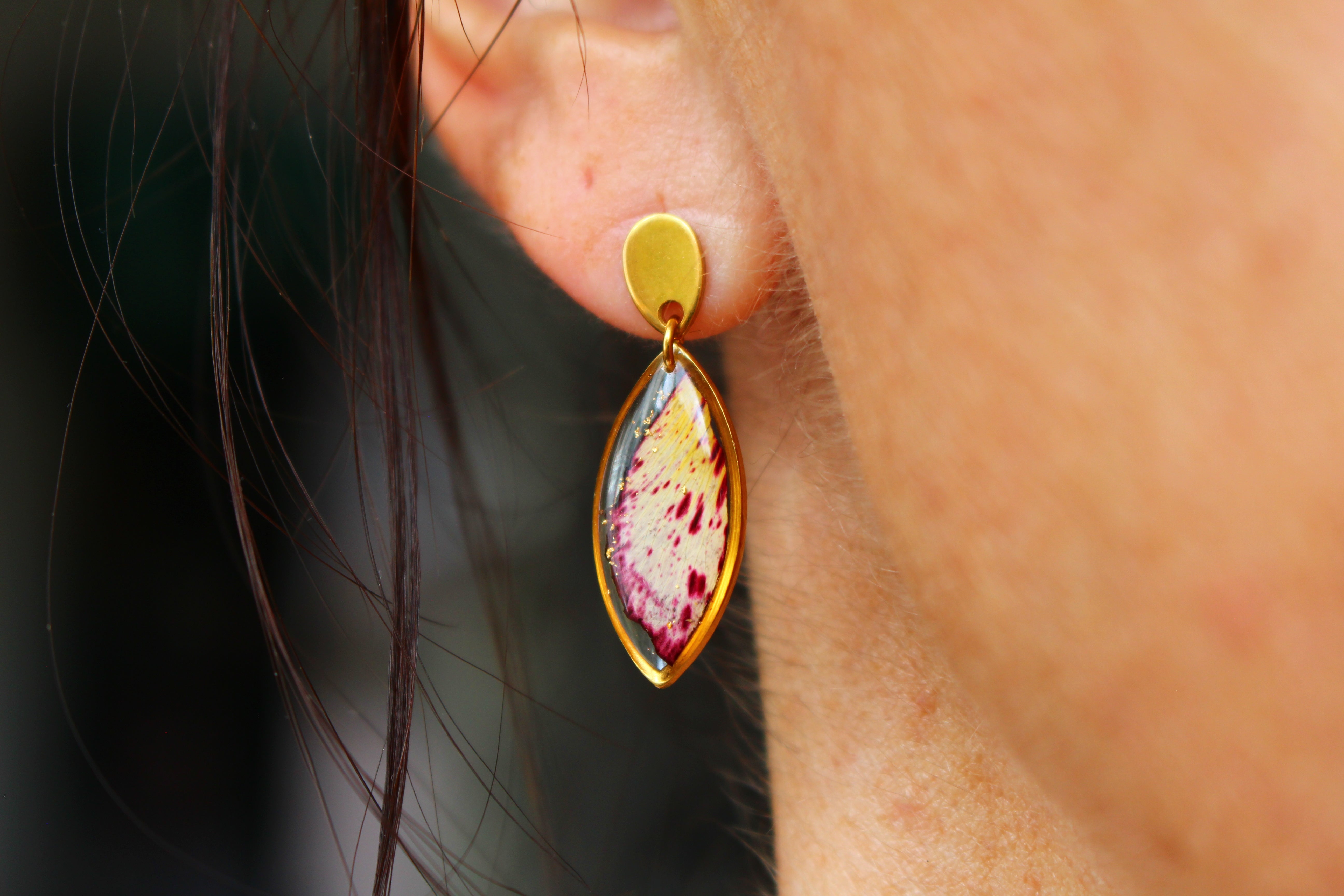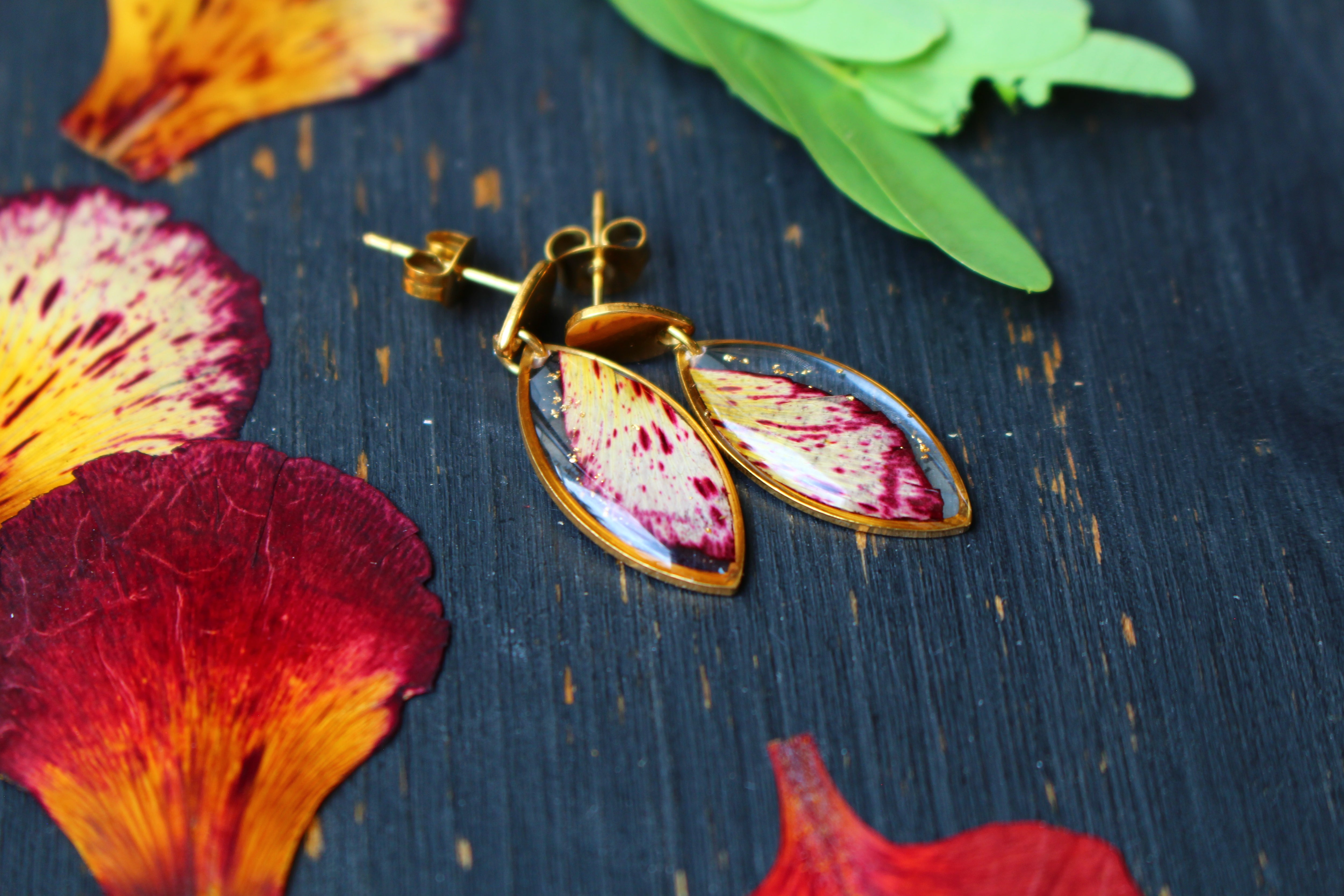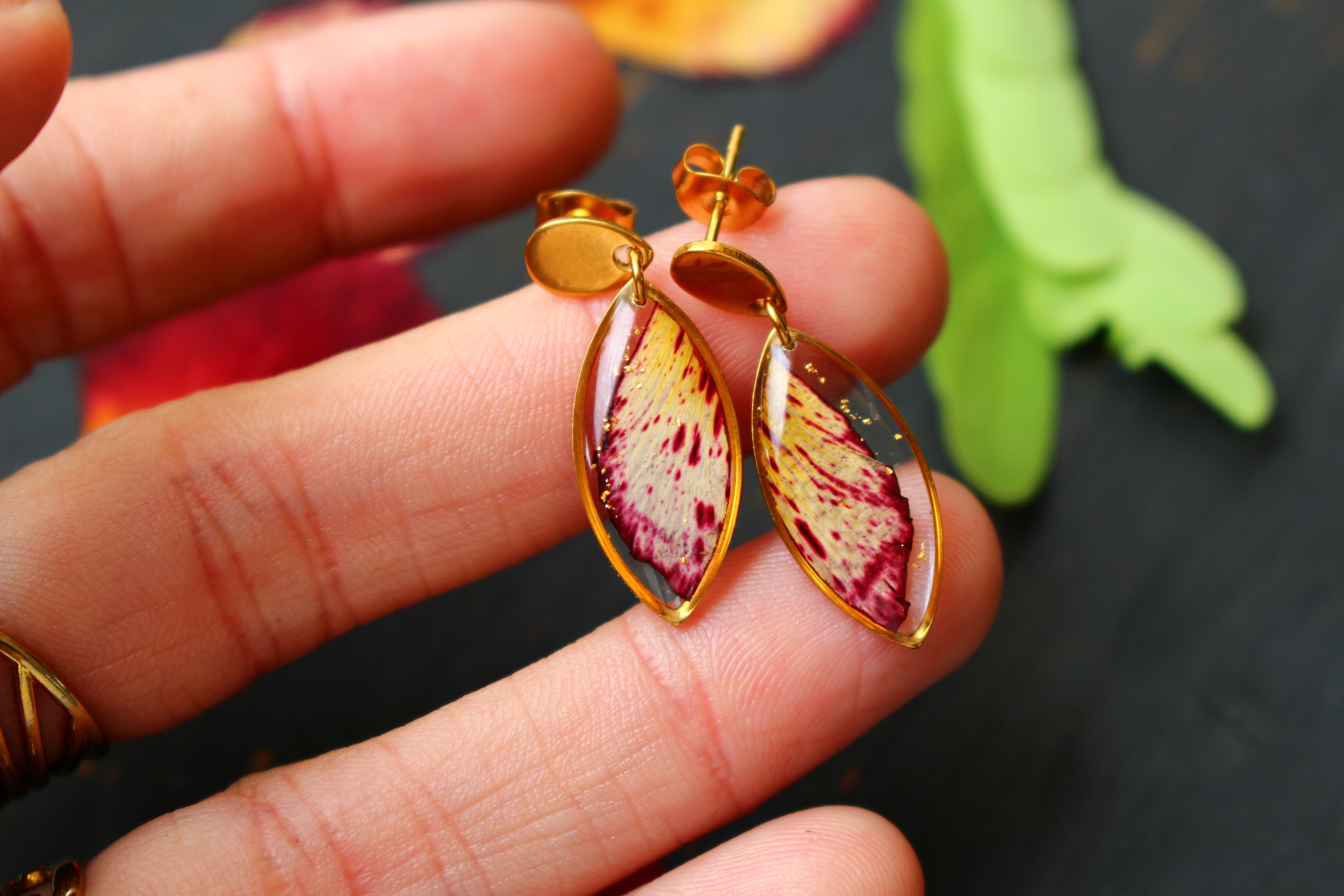 Boucles composées en forme d' "amandes" remplis de résine dans laquelle j'ai incrusté une partie de pétale de flamboyant et quelques feuilles d'or.