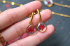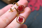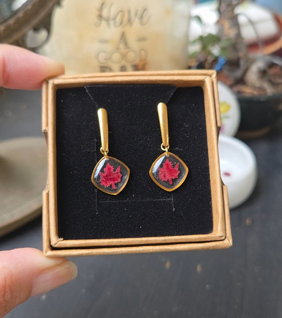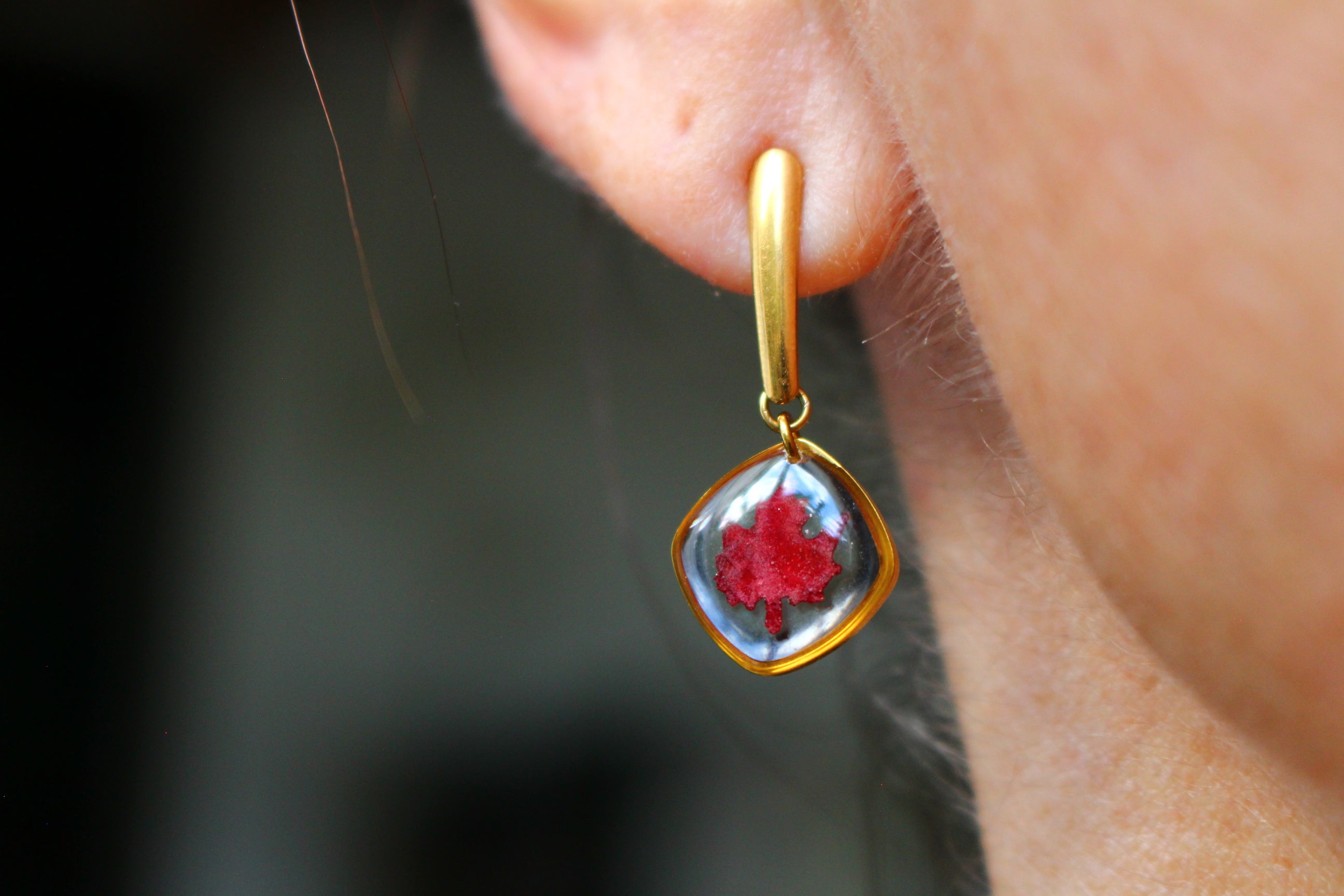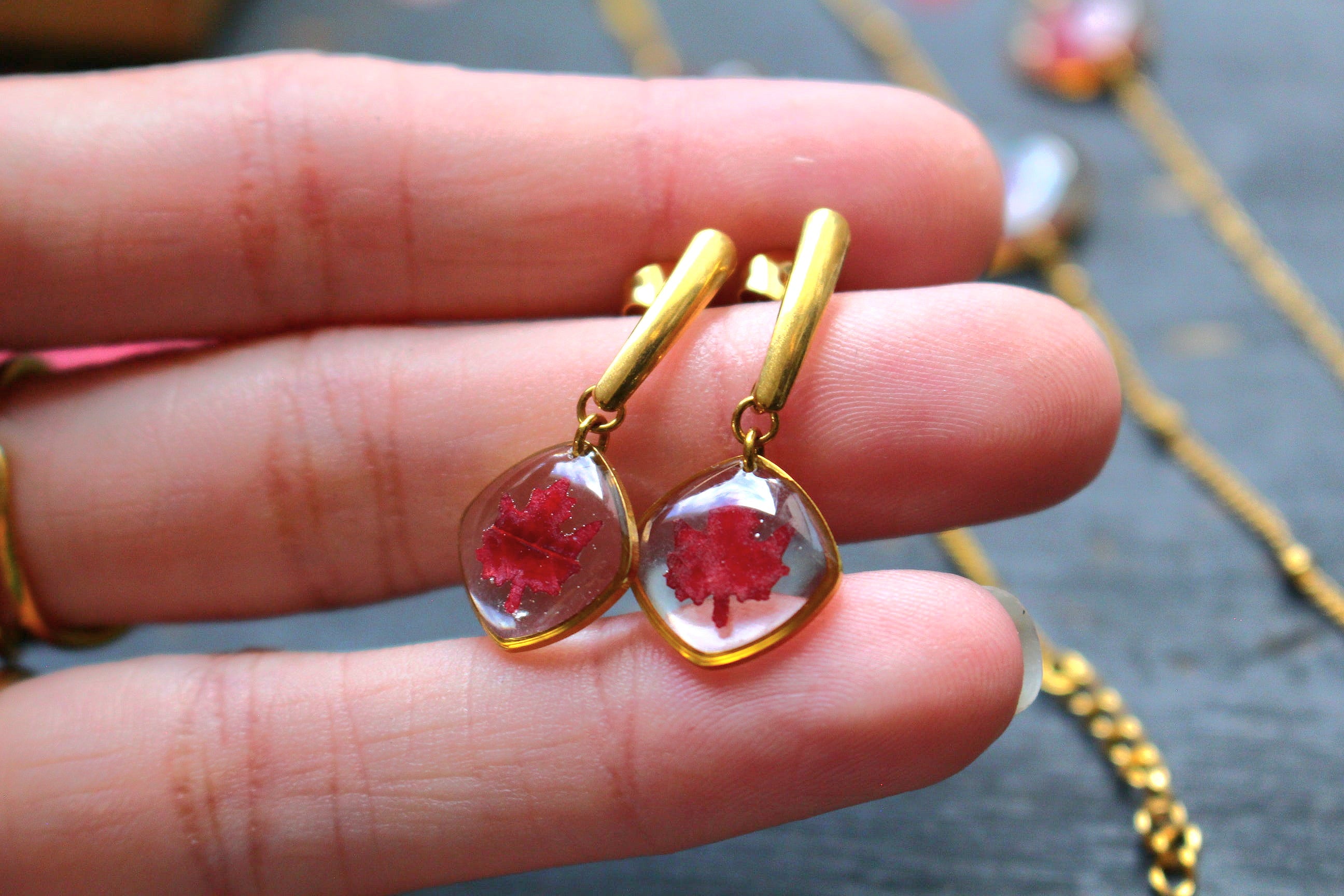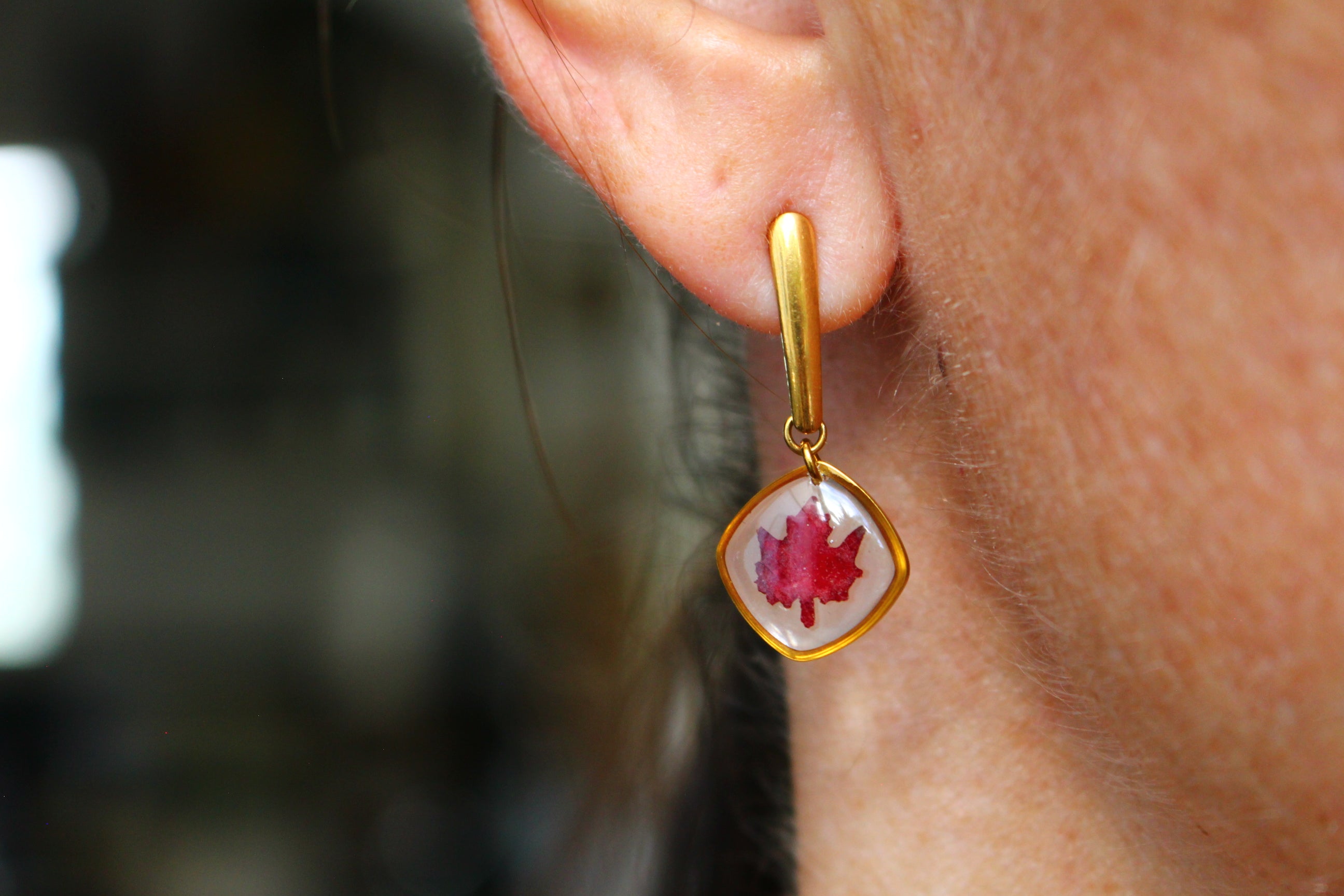 Boucles composées de médaillons en forme de carrés arrondis remplis de résine dans laquelle j'ai incrusté des minis feuilles d'érable faites à partir de vraies feuilles provenant du canada.
