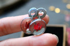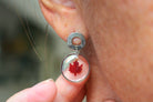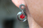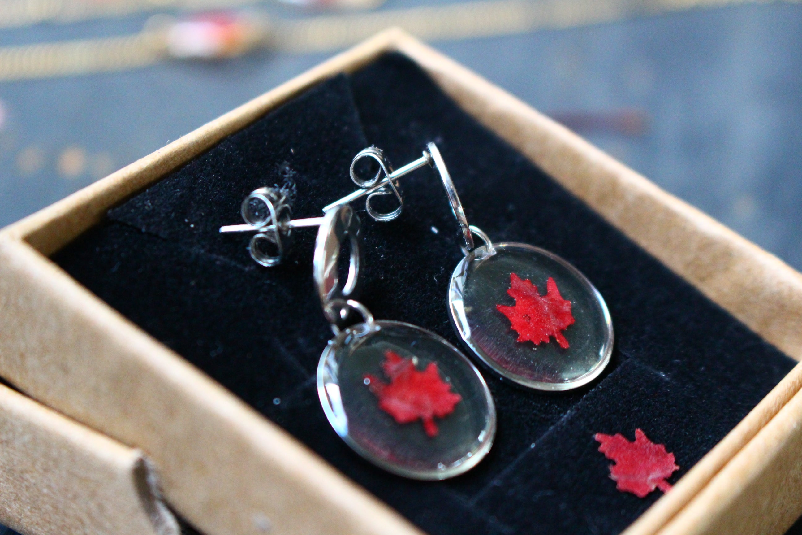 Boucles composées de médaillons de 15mm de diamètres remplis de résine dans laquelle j'ai incrusté des minis feuilles d'érable faites à partir de vraies feuilles provenant du canada.