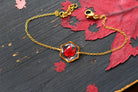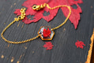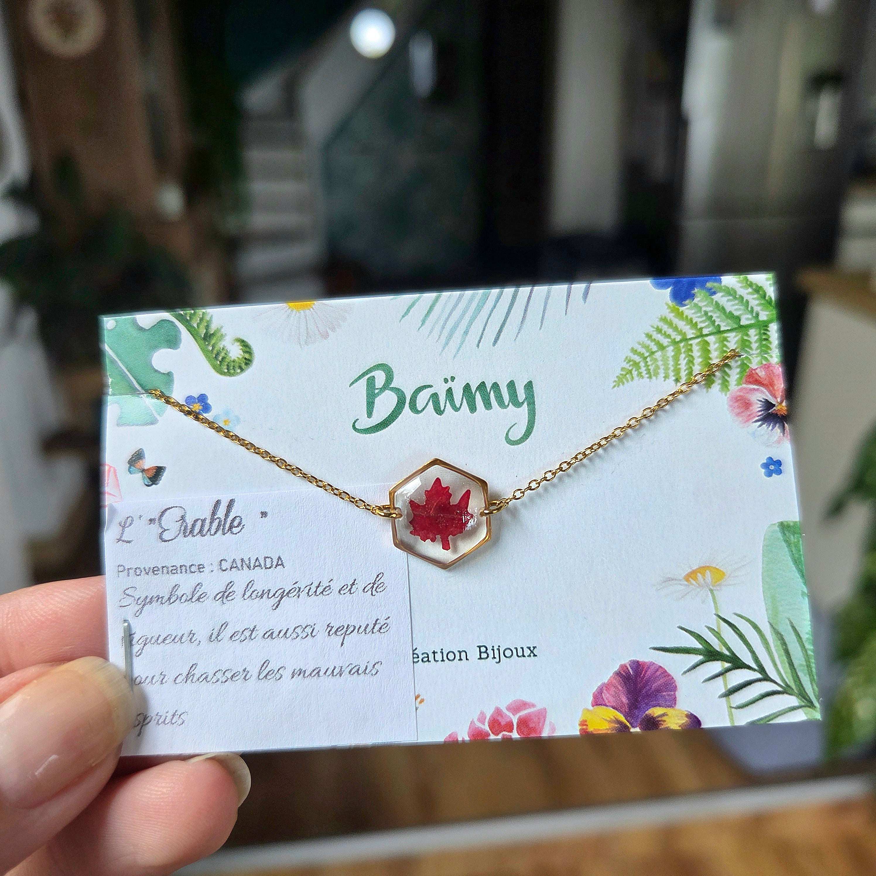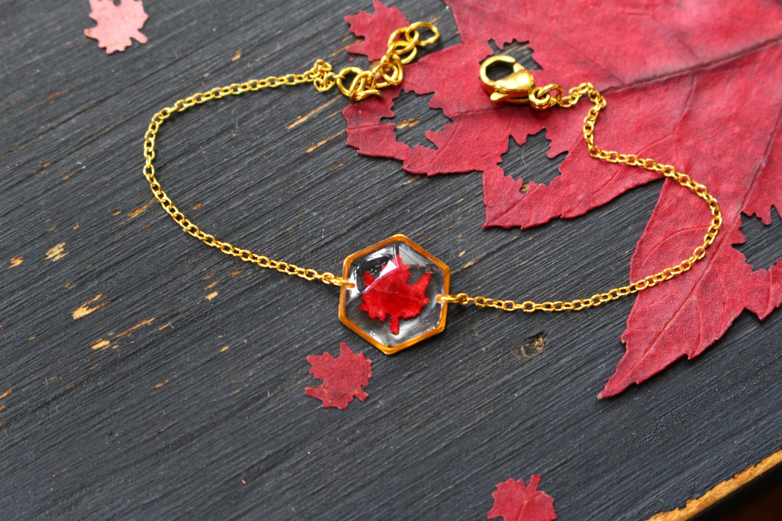 Bracelet composé d'un médaillon hexagonale rempli de résine dans laquelle j'ai incrusté une mini feuille d'érable faite à partir d'une vraie feuille provenant du Canada et quelques paillettes de feuilles d'or.