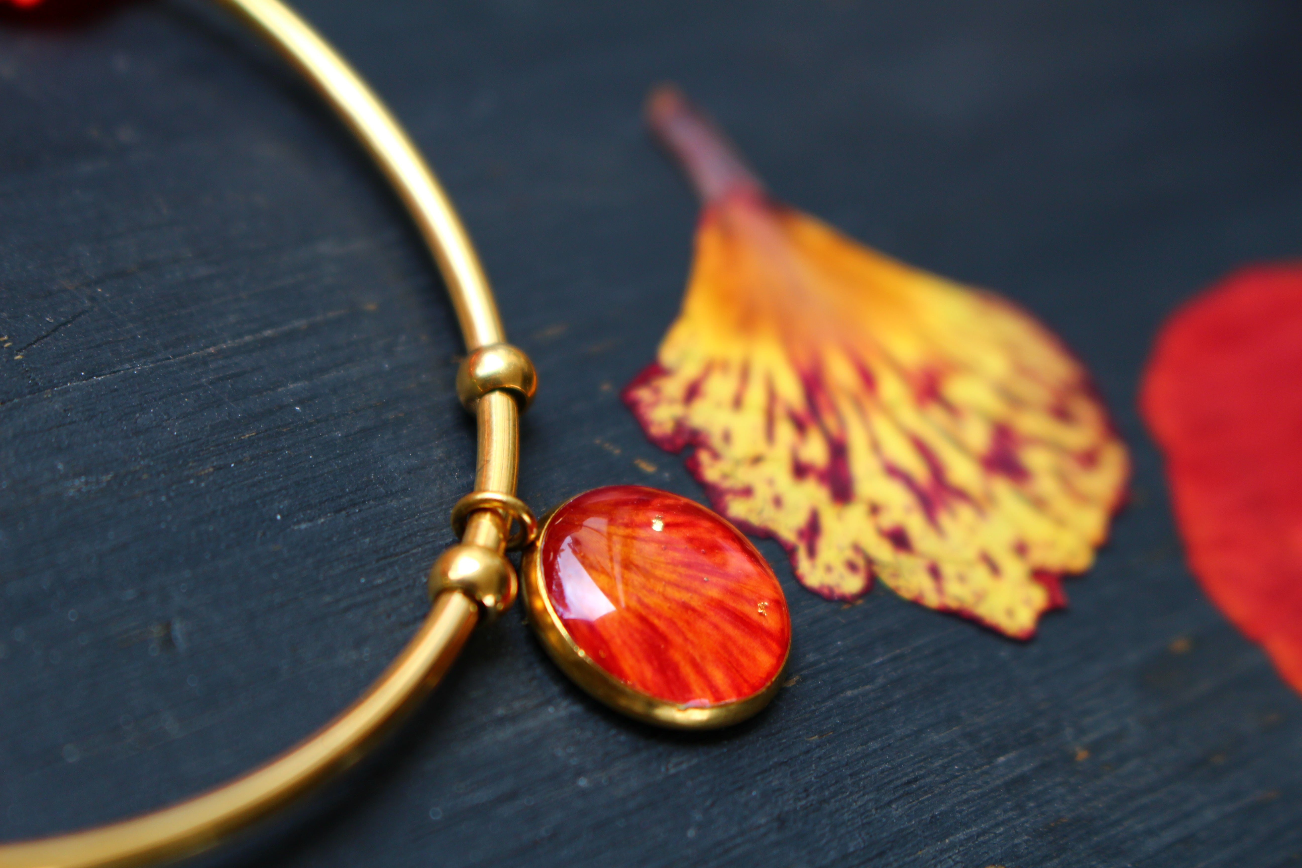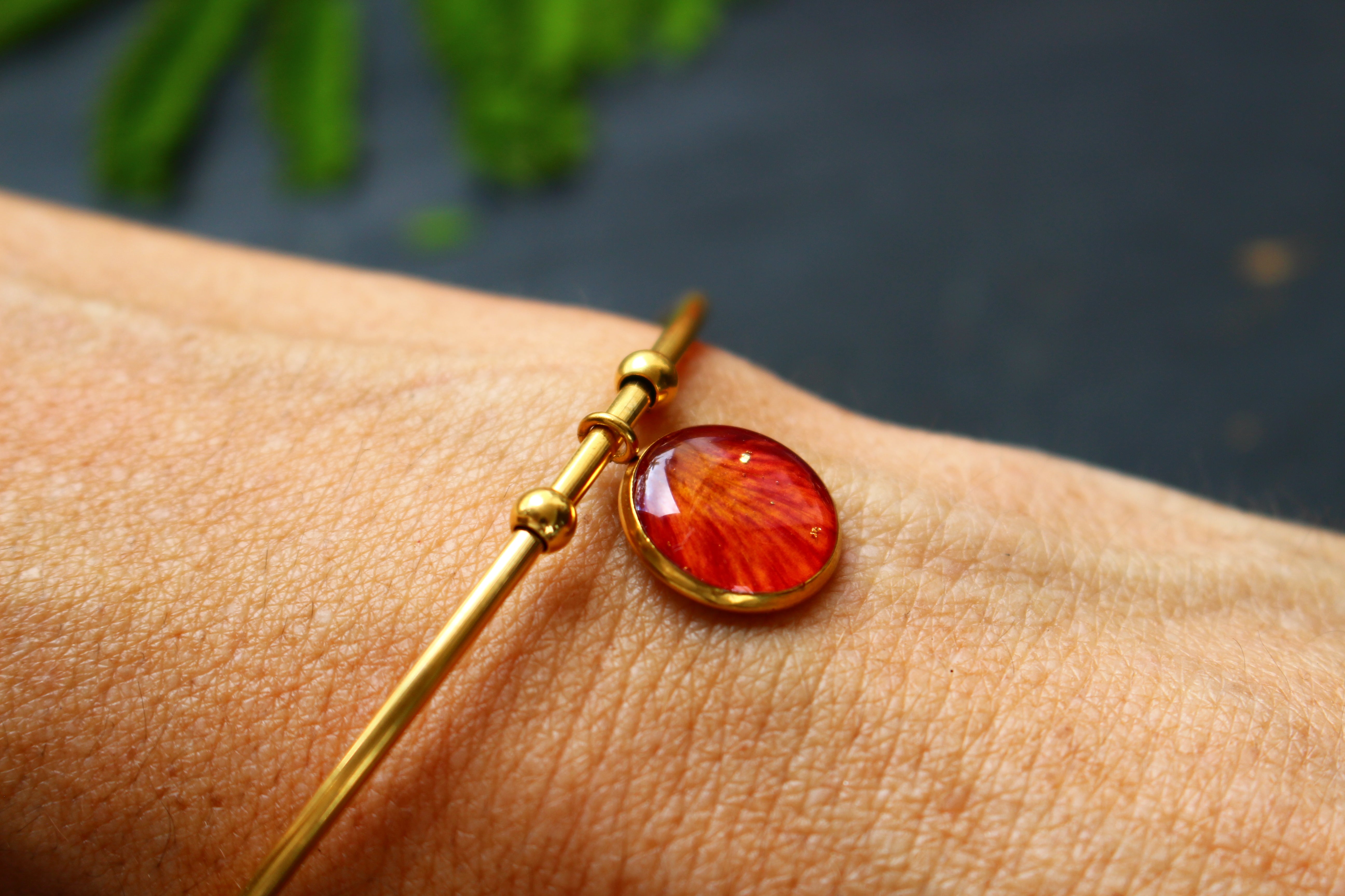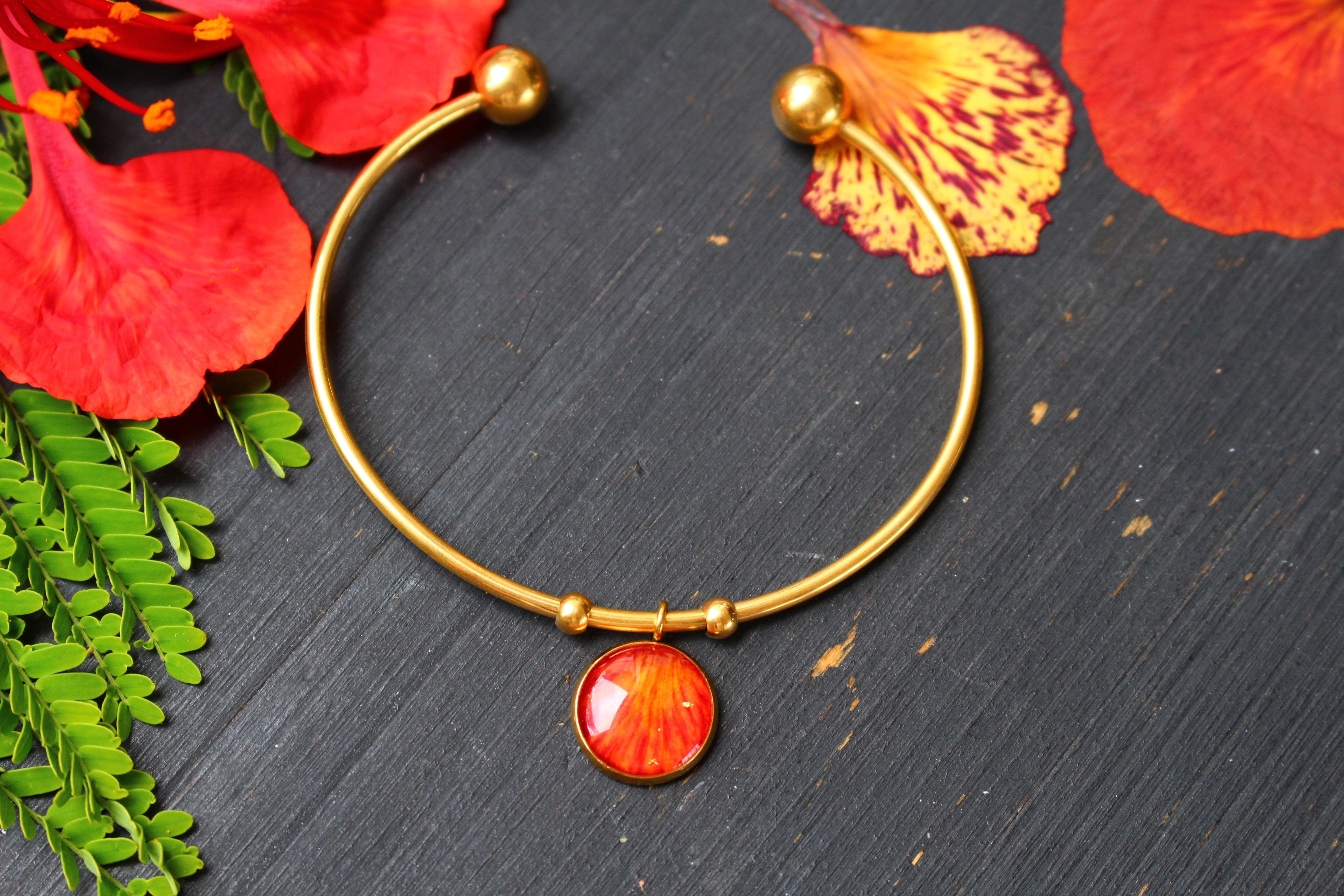 Bracelet rigide composé d'un médaillon de 12mm de diamètre rempli de résine dans laquelle j'ai incrusté une partie de pétale de flamboyant et quelques morceaux de feuilles d'or.