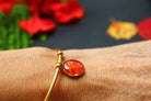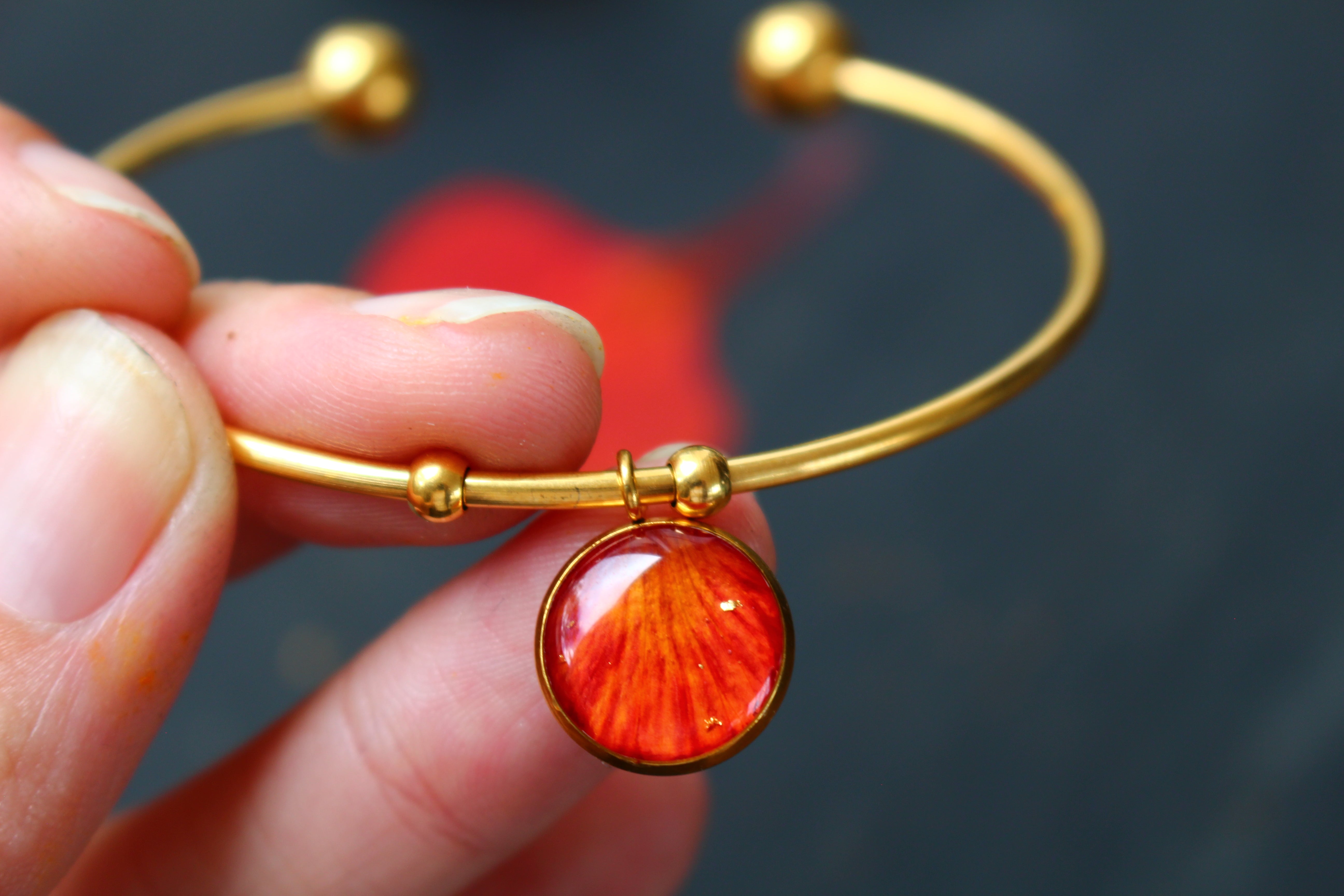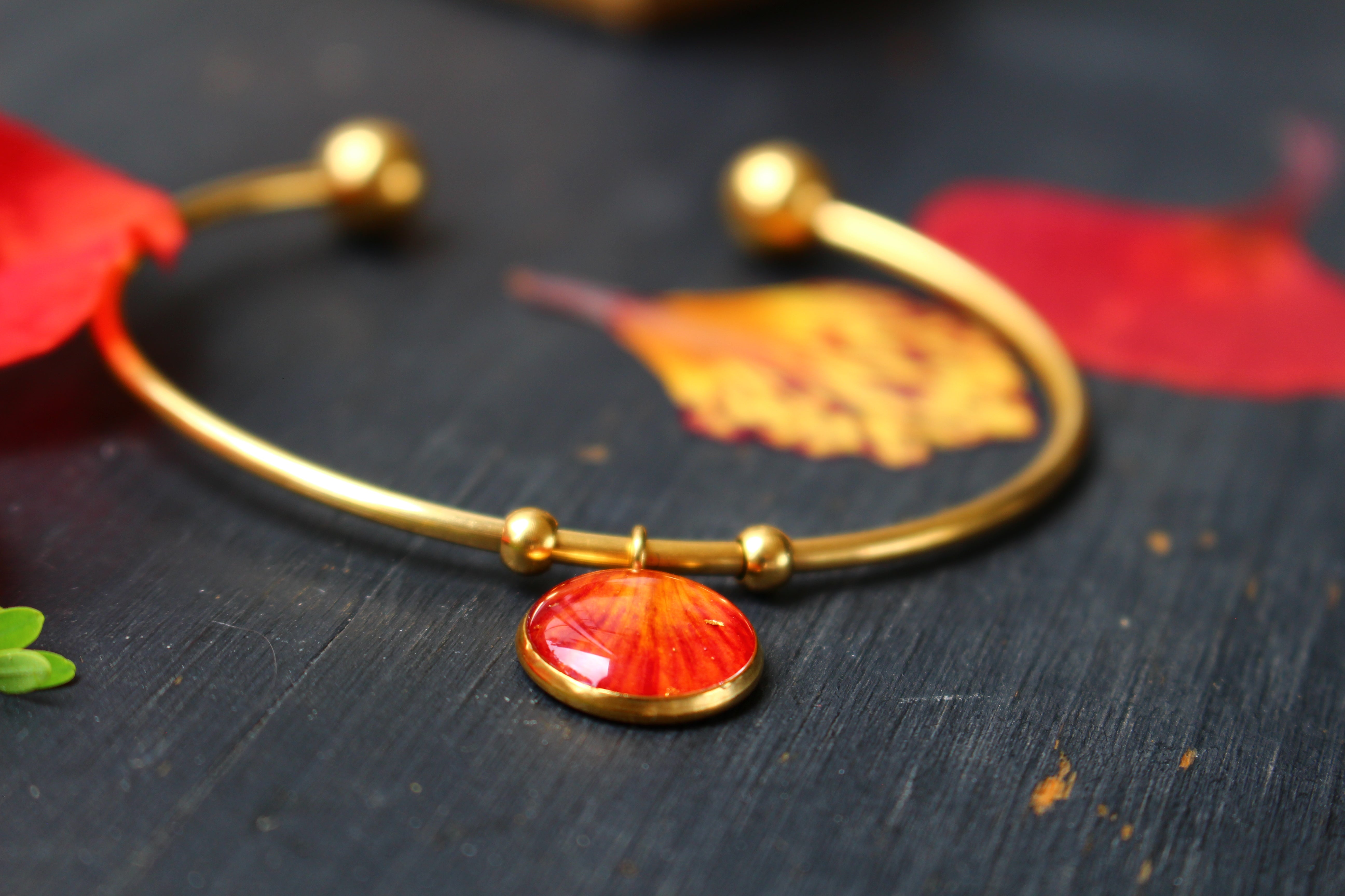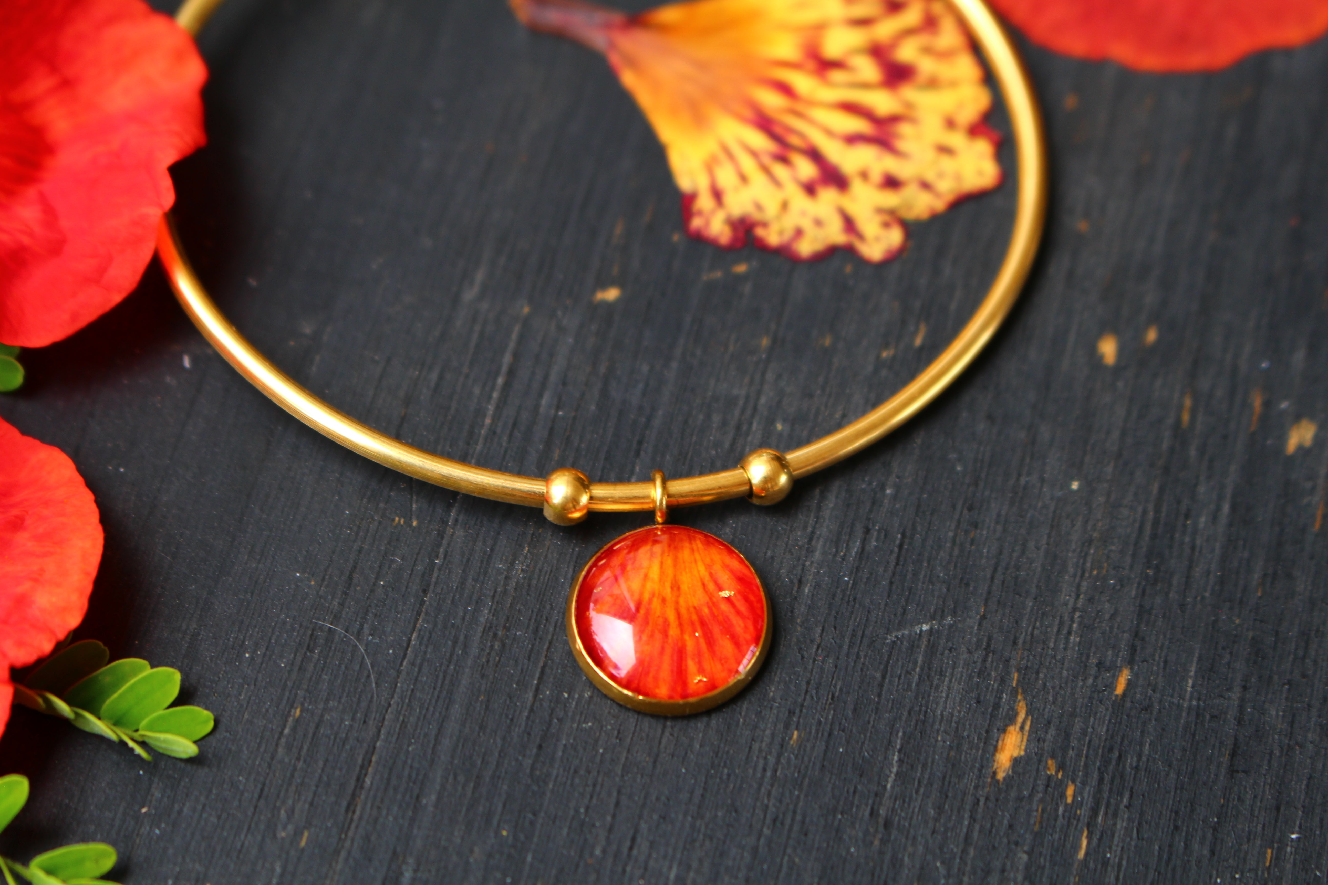 Bracelet rigide composé d'un médaillon de 12mm de diamètre rempli de résine dans laquelle j'ai incrusté une partie de pétale de flamboyant et quelques morceaux de feuilles d'or.