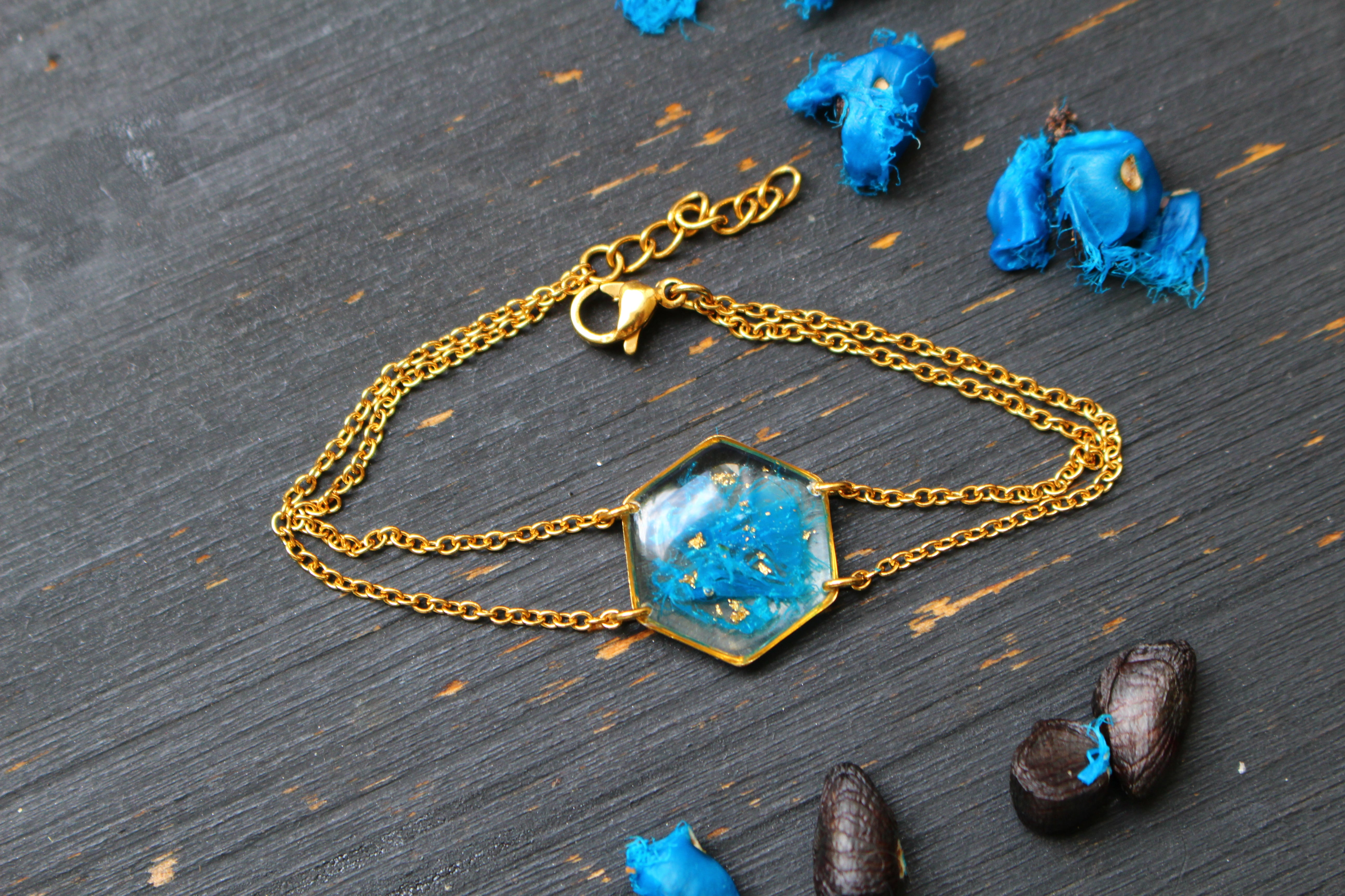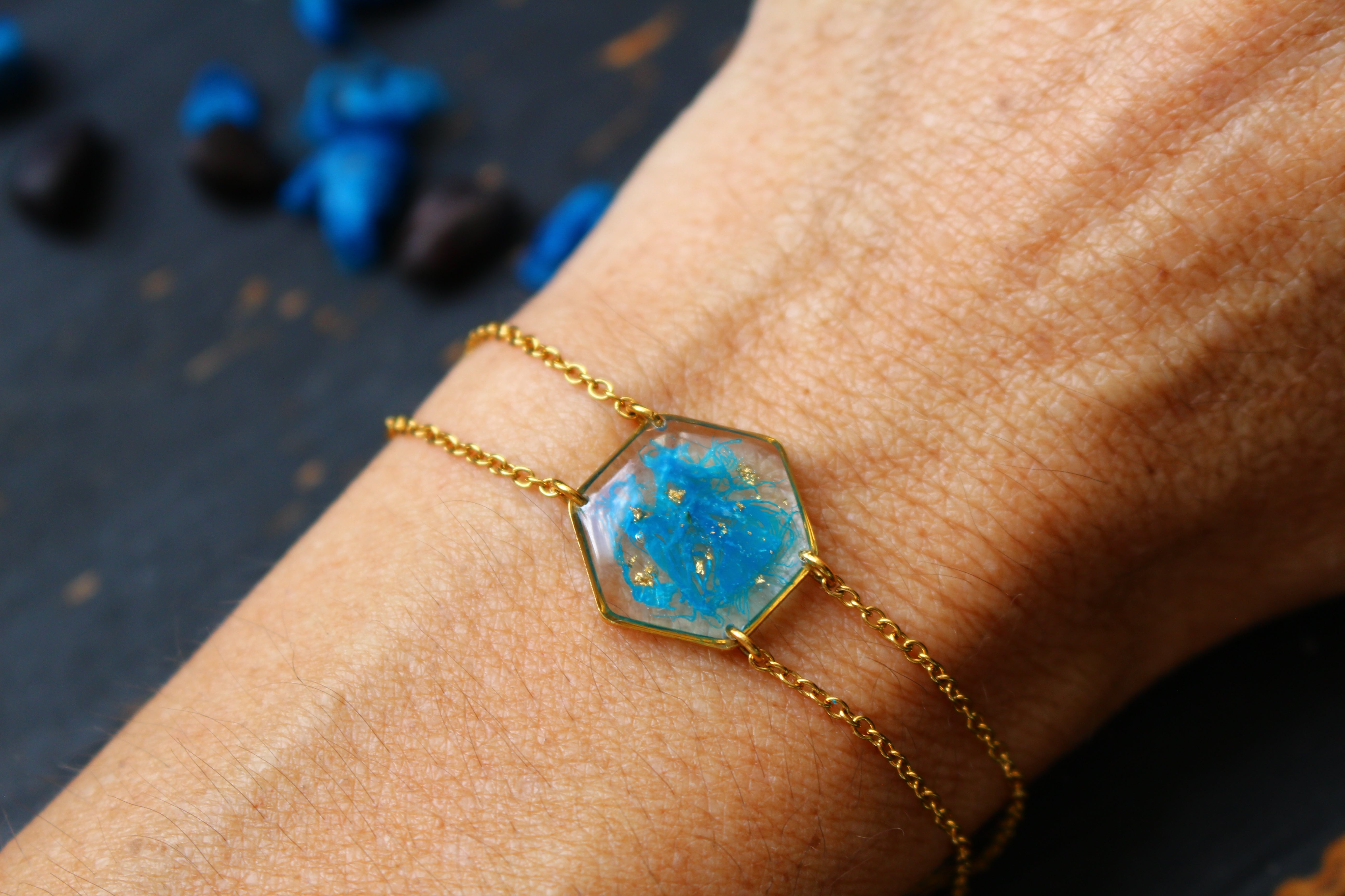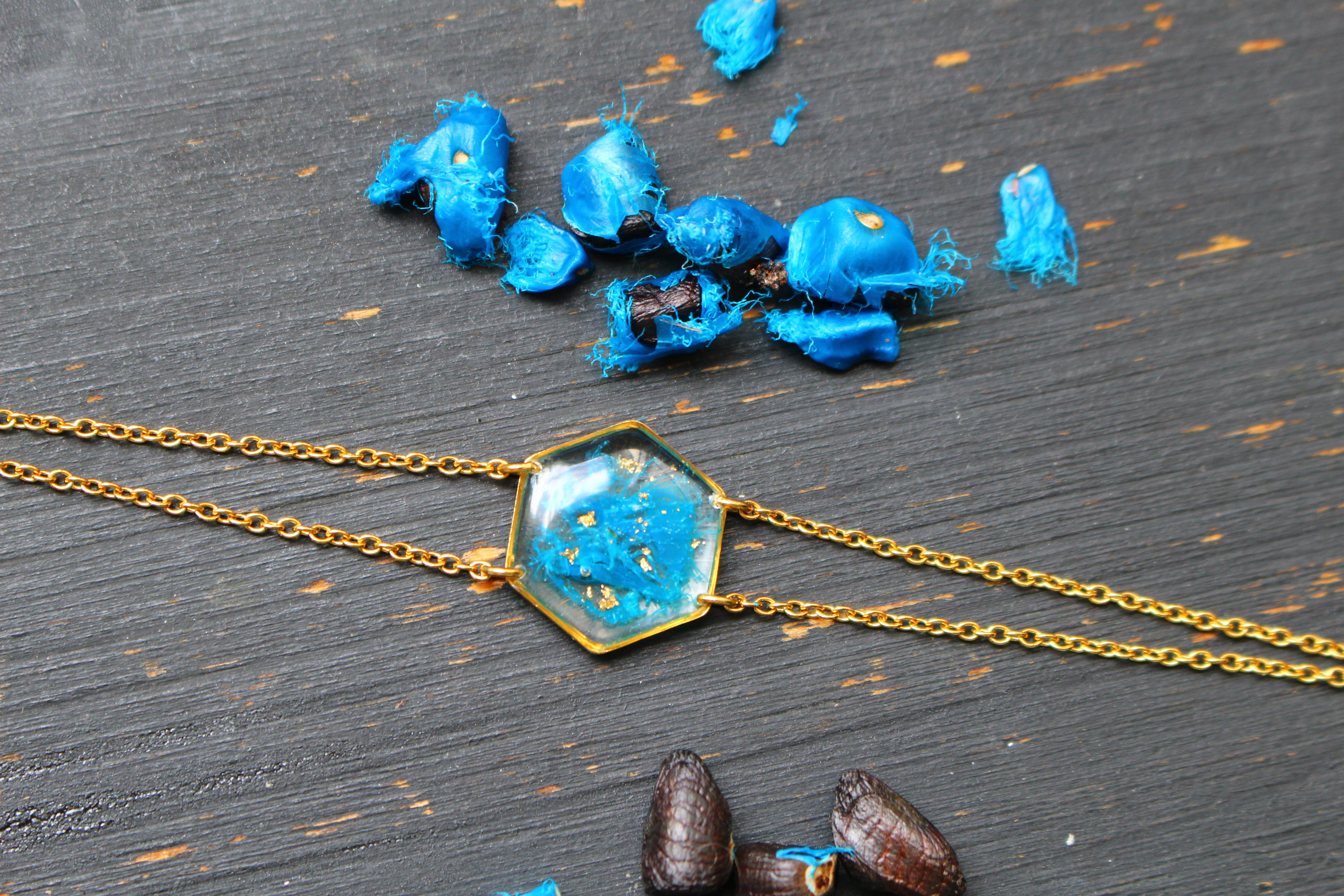 bracelet composé d'un médaillon hexagonal rempli de résine dans laquelle j'ai incrusté des morceaux d'"arille" (la pellicule bleue qui entoure les graines de ravenale pour attirer la faune) et de la feuille d'or