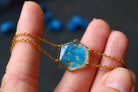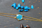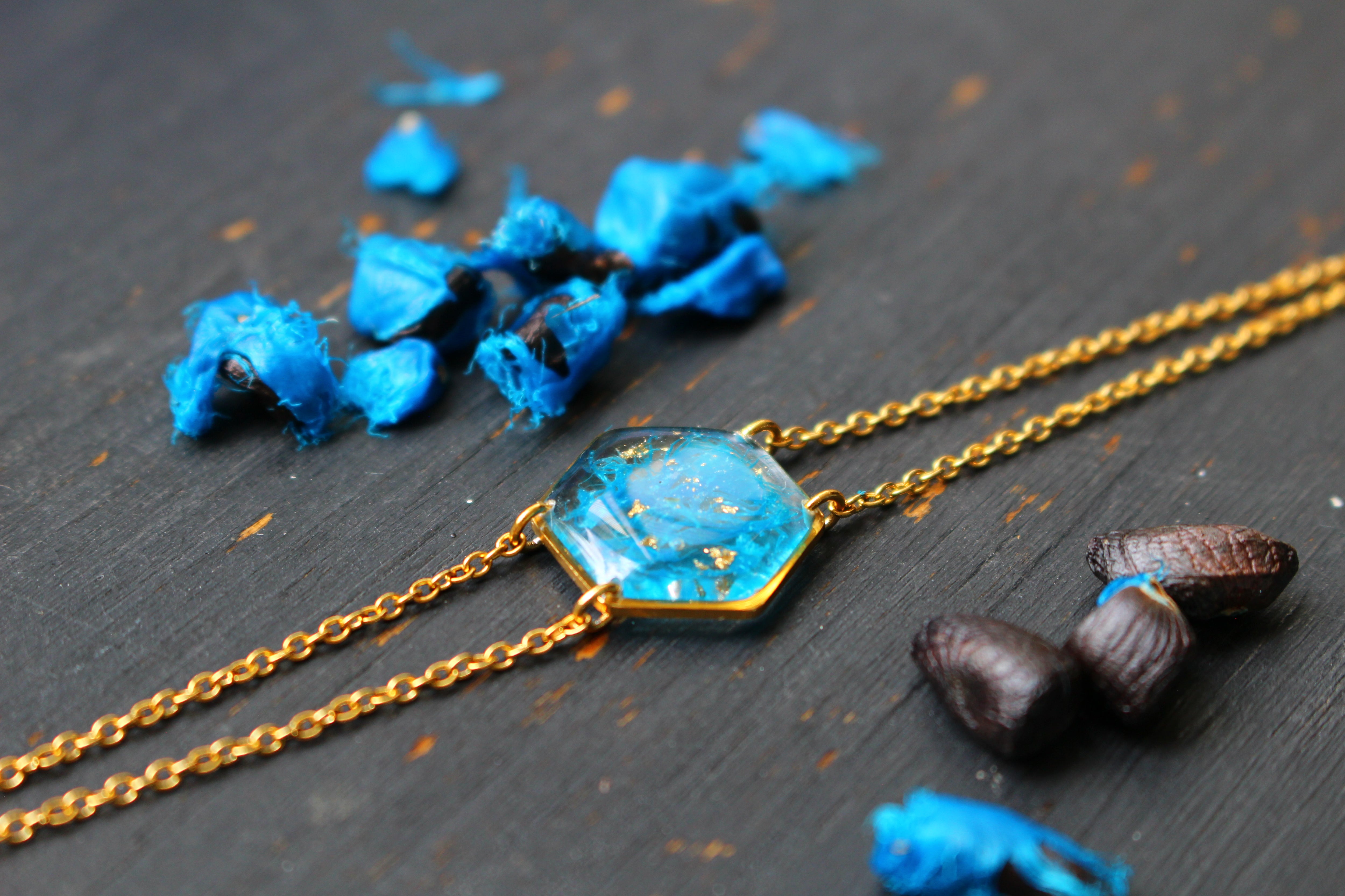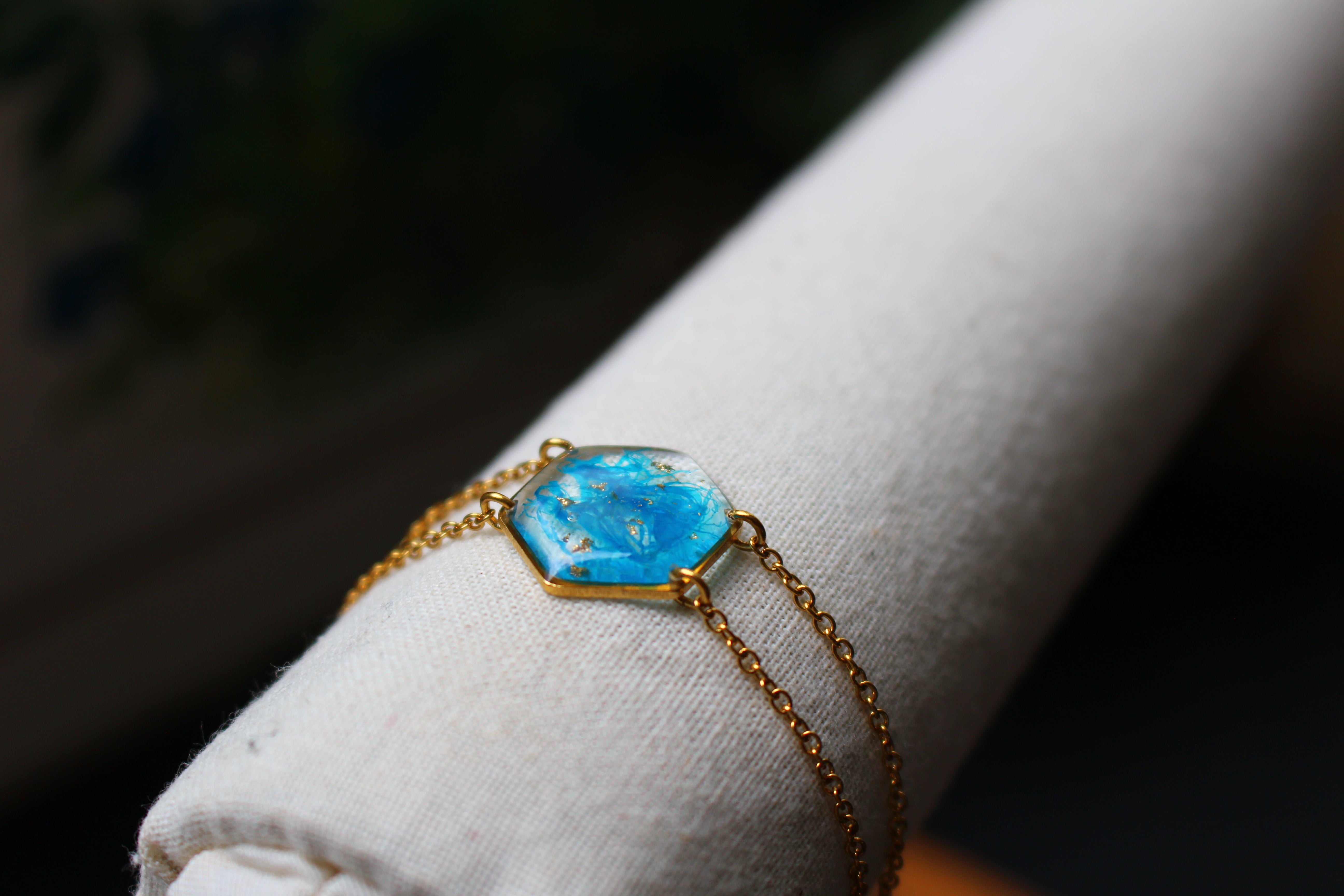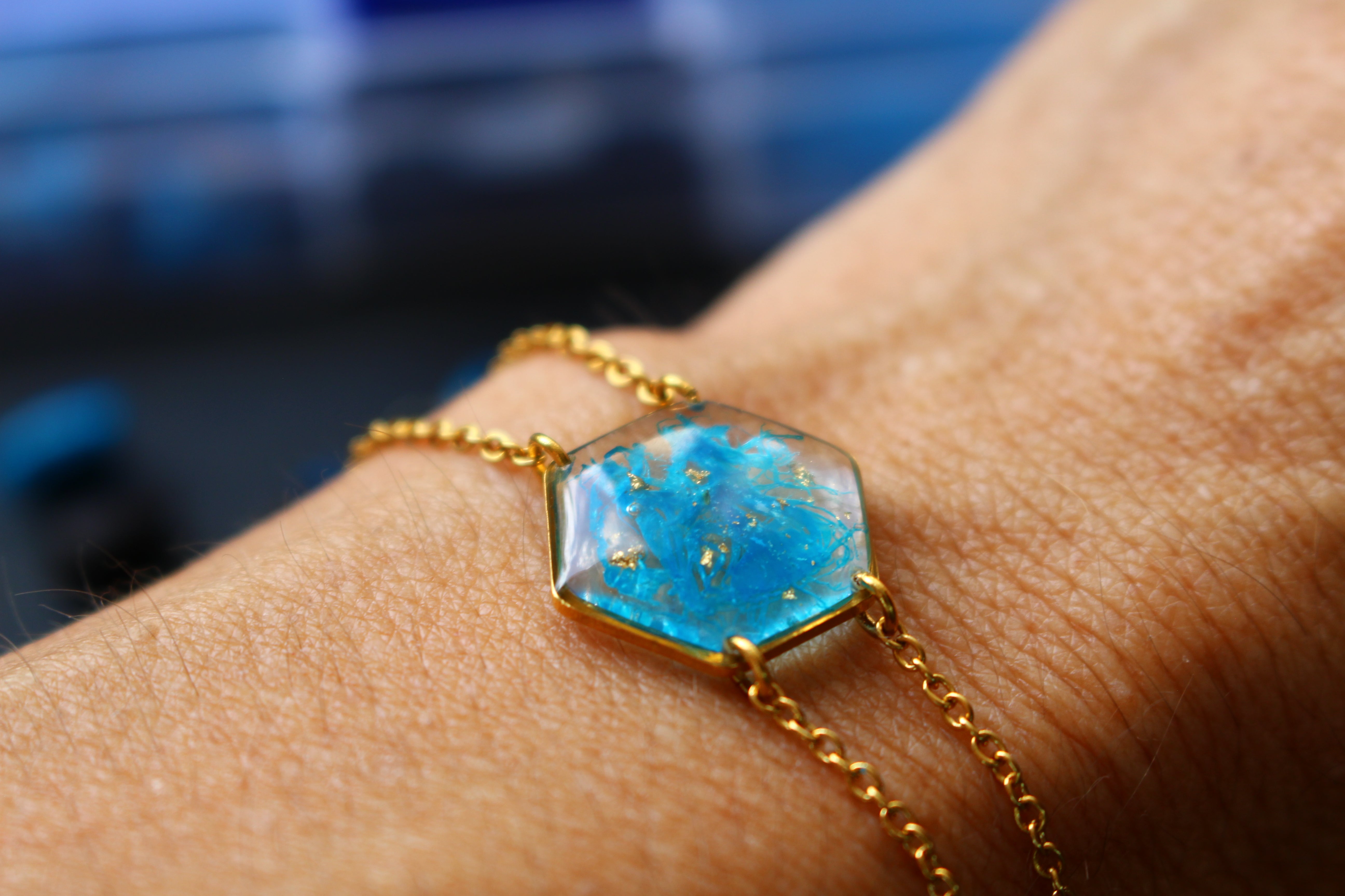 bracelet composé d'un médaillon hexagonal rempli de résine dans laquelle j'ai incrusté des morceaux d'"arille" (la pellicule bleue qui entoure les graines de ravenale pour attirer la faune) et de la feuille d'or