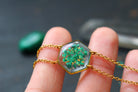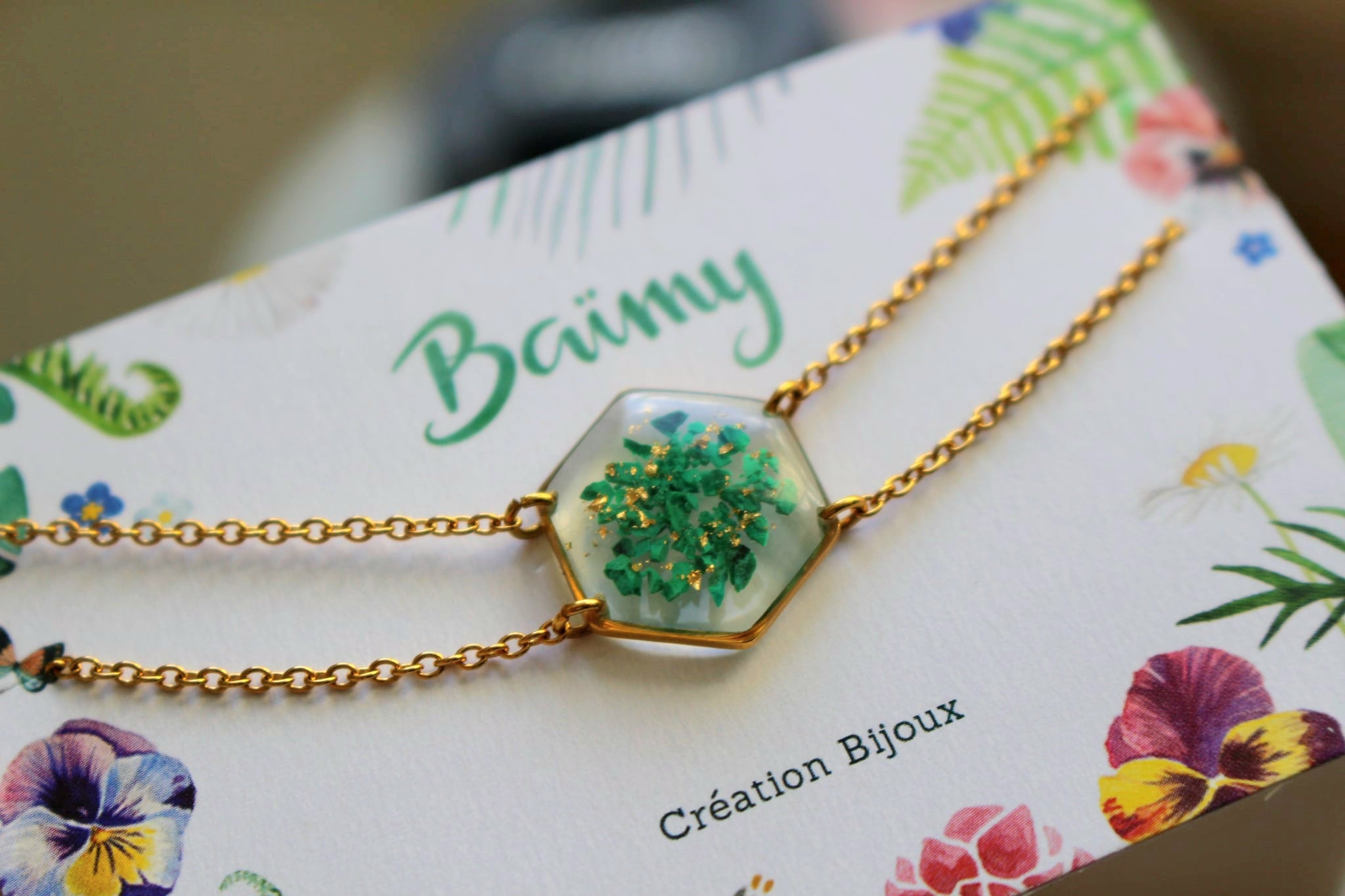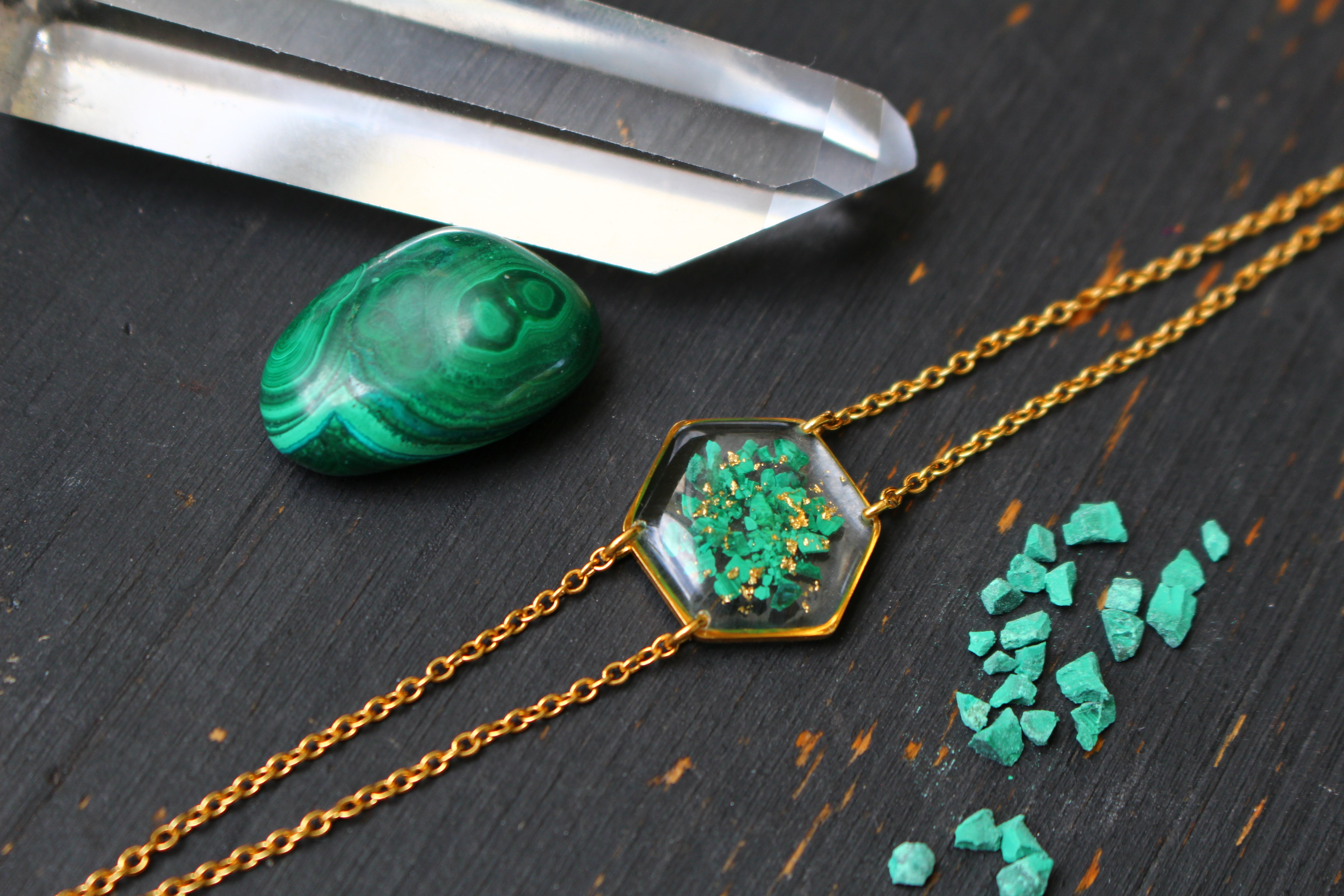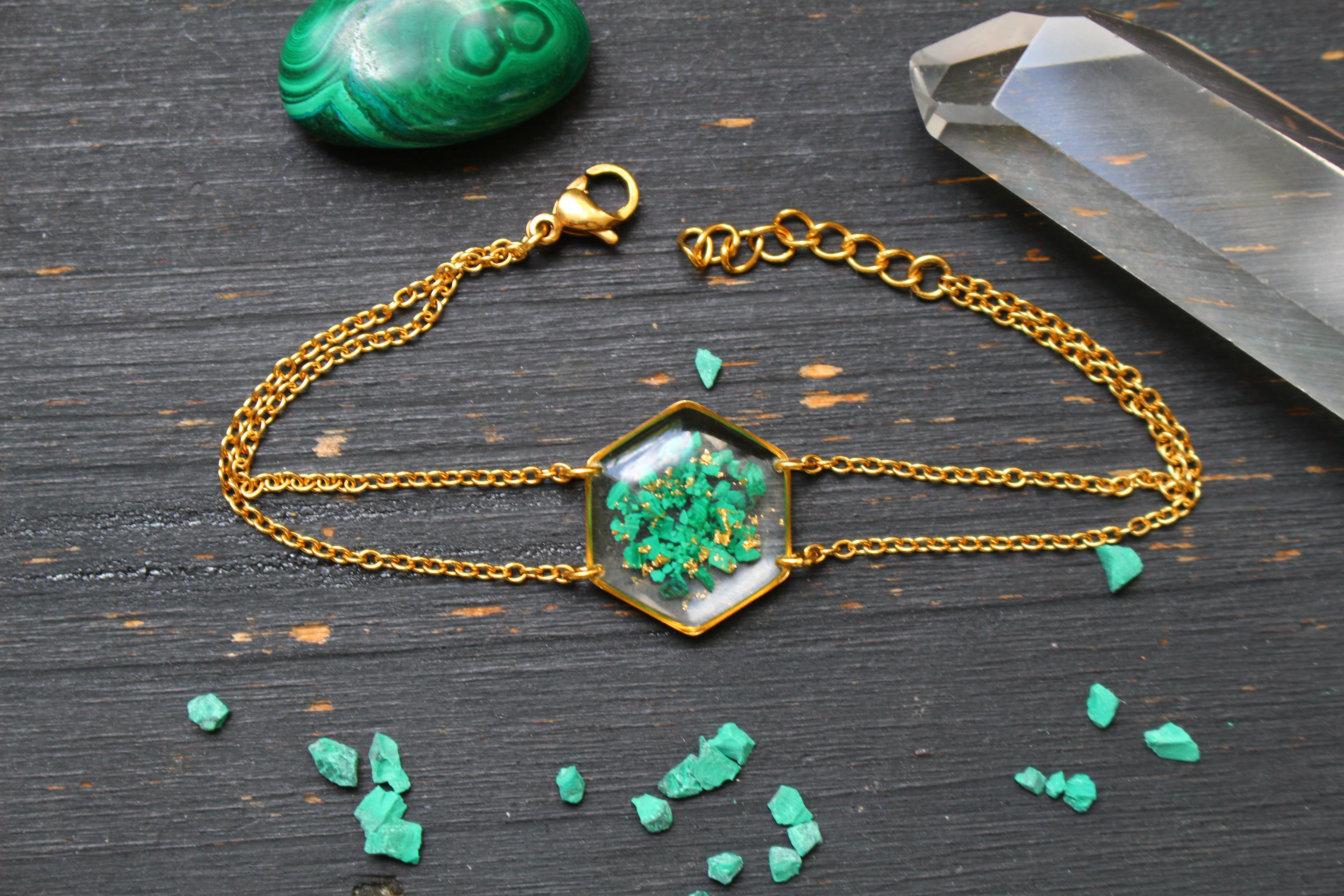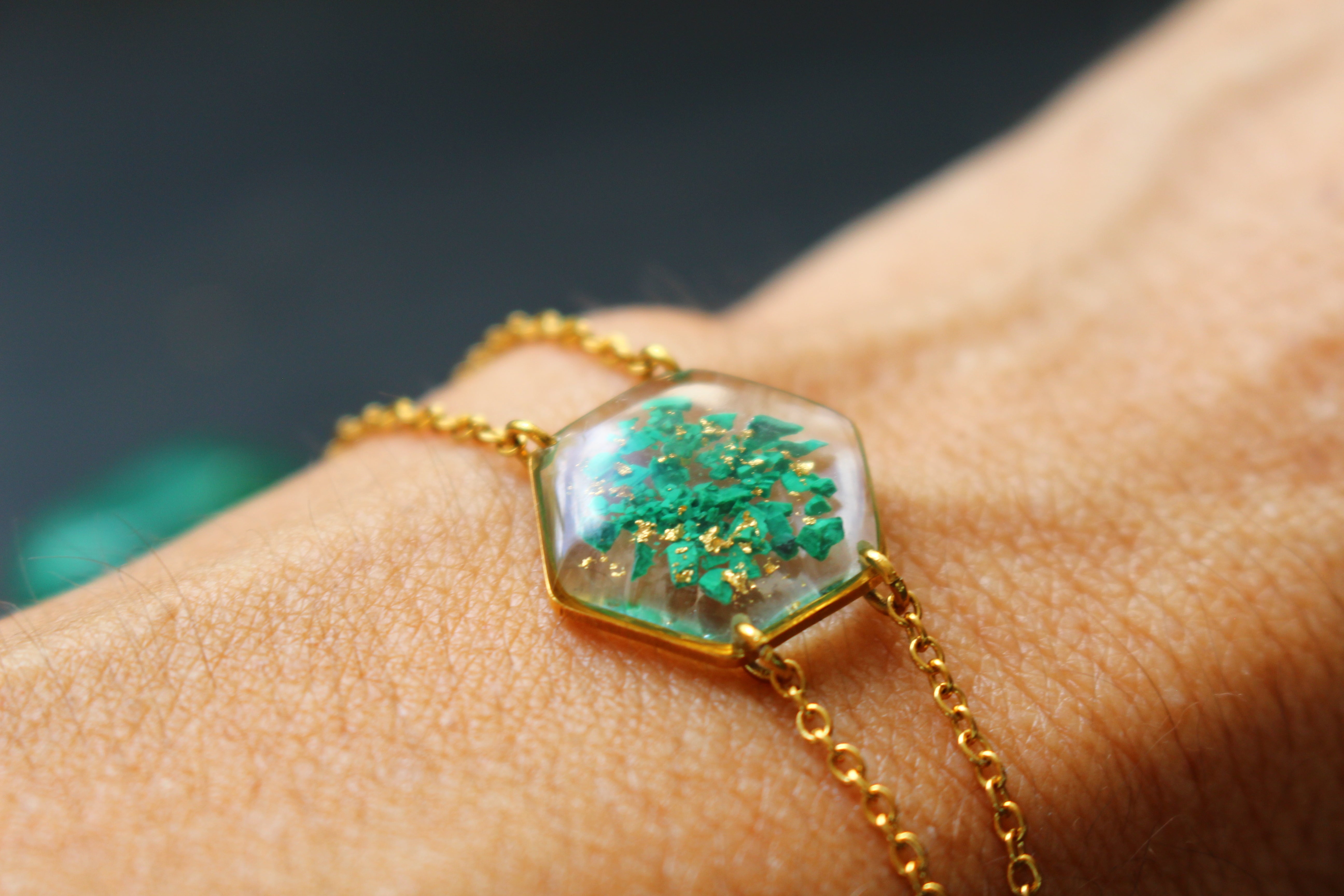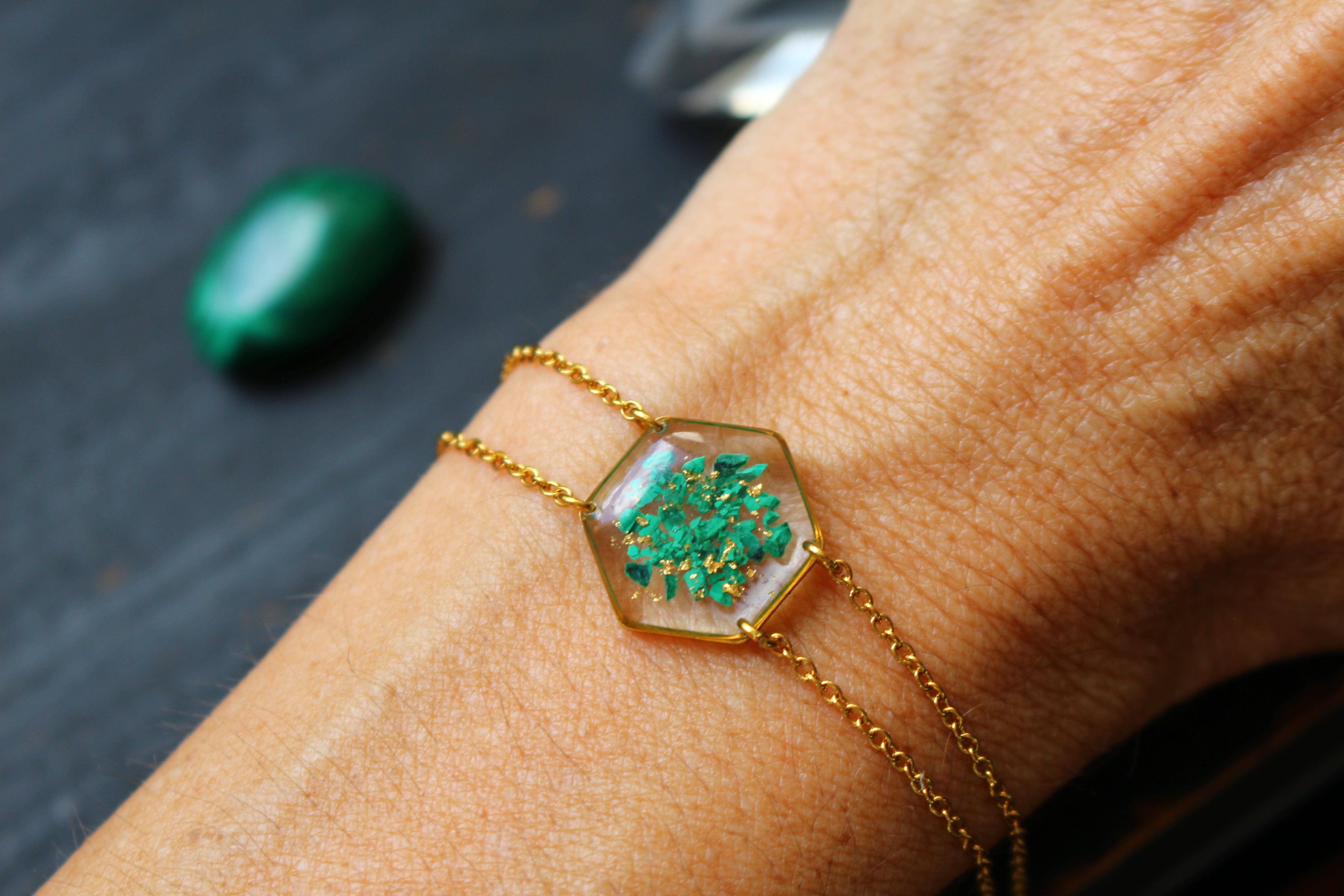 Bracelet composé d'un médaillon hexagonal rempli de résine dans laquelle j'ai incrusté de petites pierres de Malachite et des morceaux de feuilles d'or.