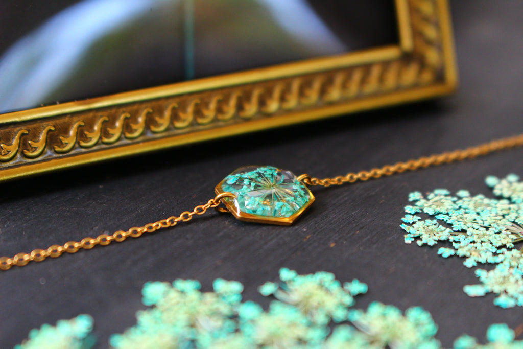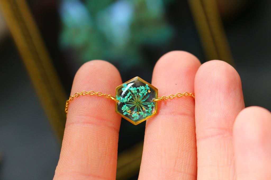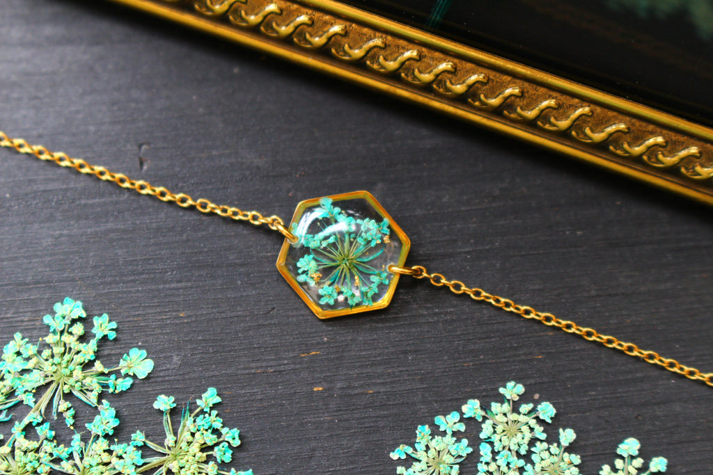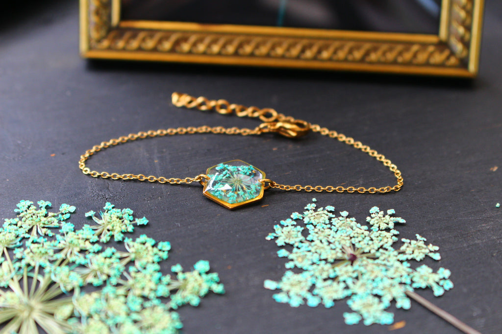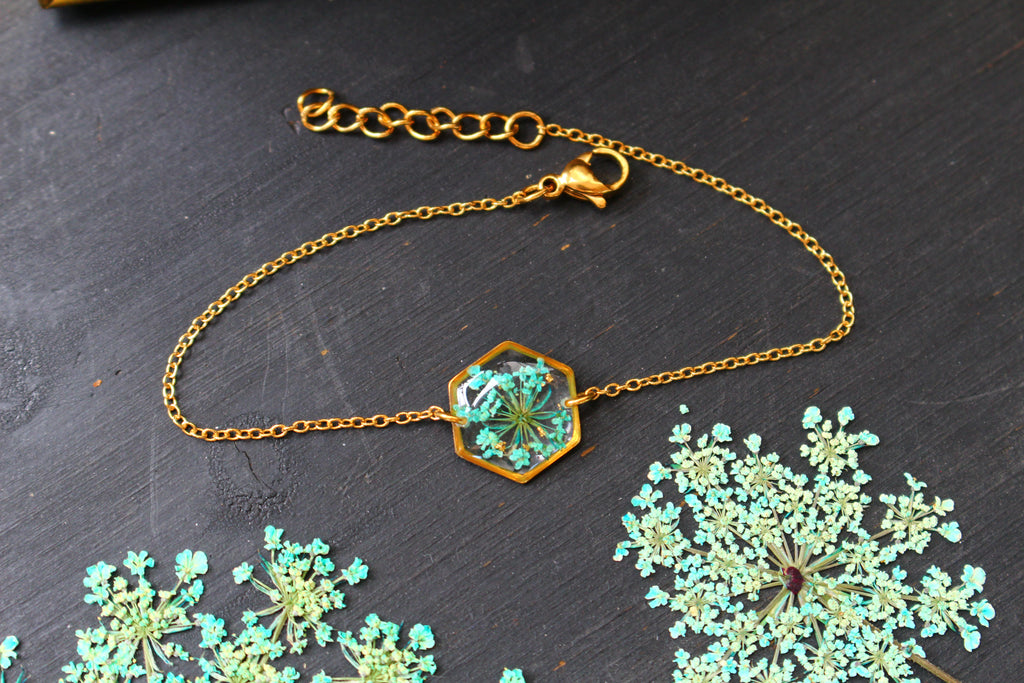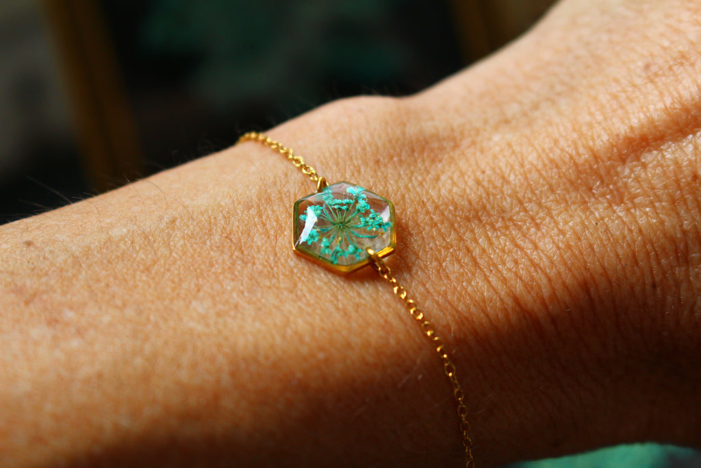 Bracelet composé d'un médaillon hexagonal rempli de résine dans laquelle j'ai incrusté de petites fleurs de reines d'Anne et des particules de feuilles d'or