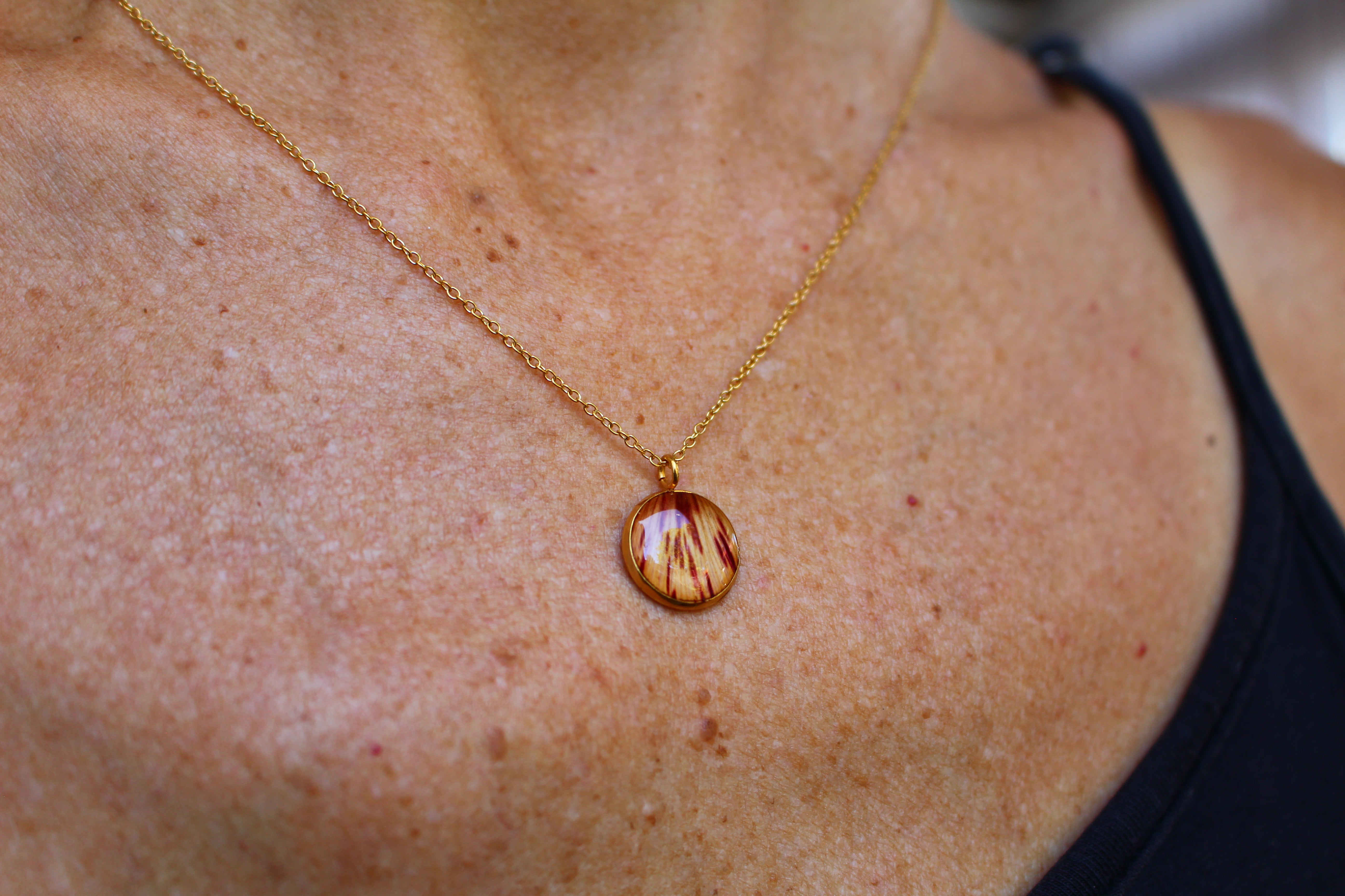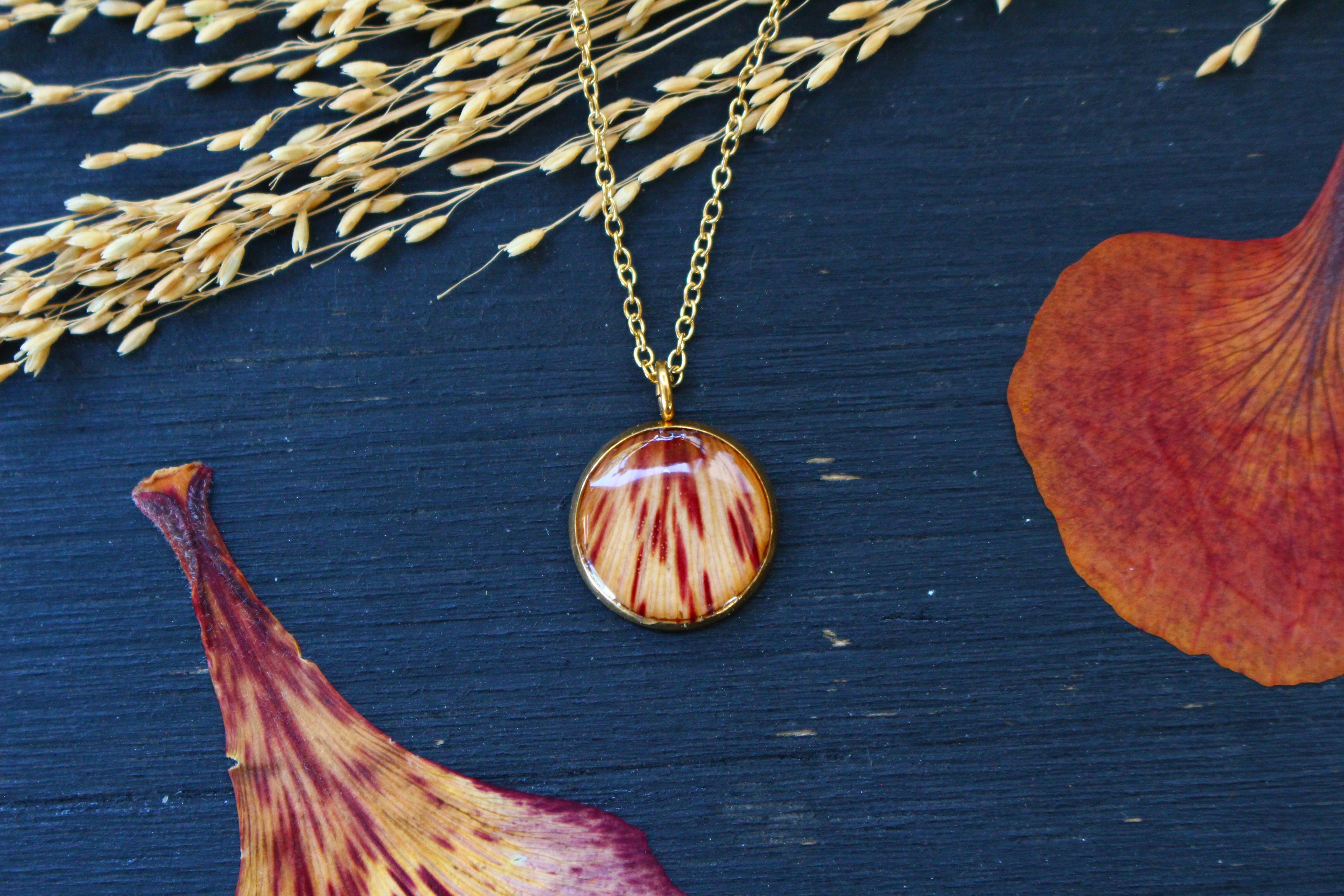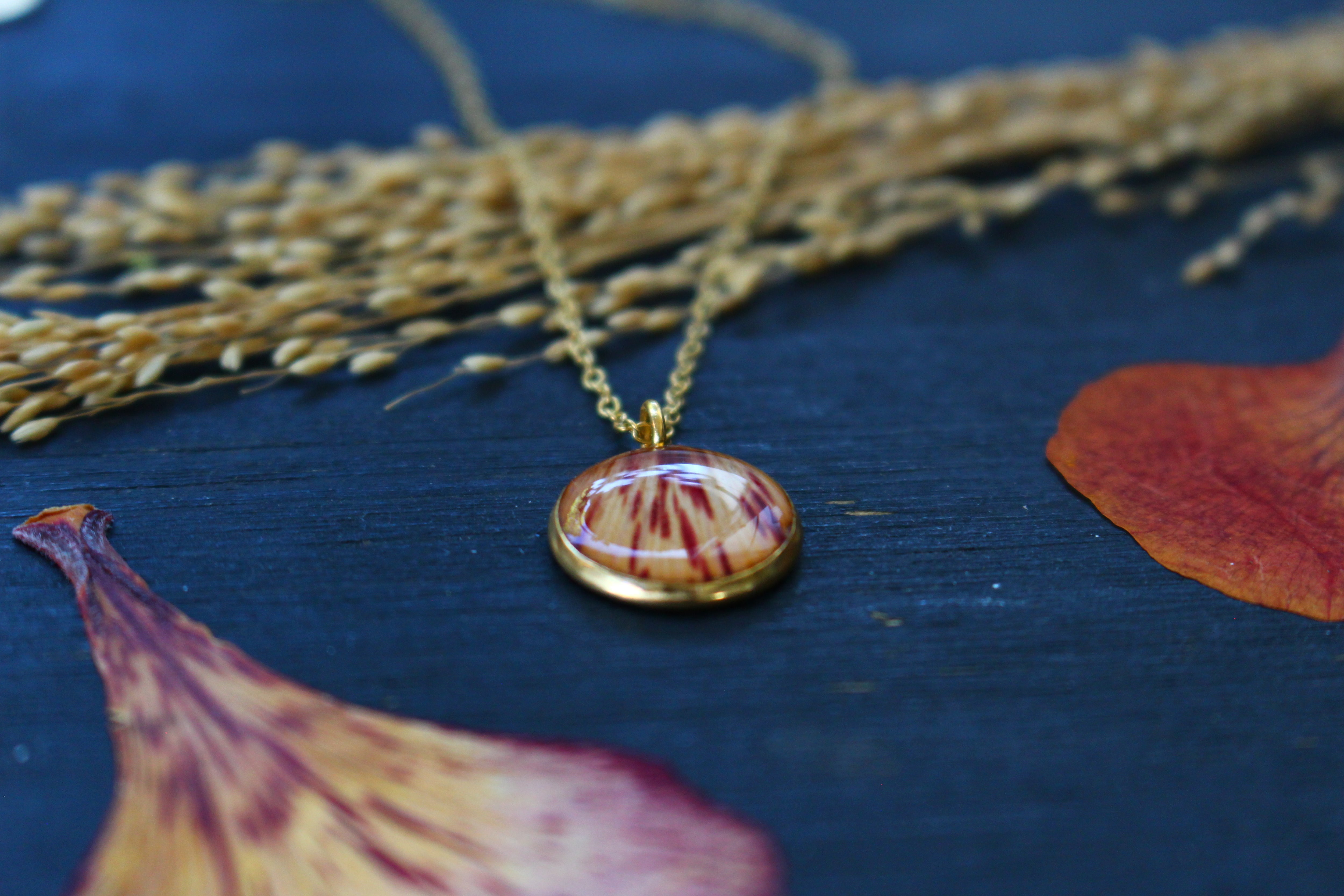 Collier composé d'un médaillon plein de 12mm de diamètre rempli de résine dans laquelle j'ai incrusté une partie d'un pétale de flamboyant et quelques paillettes de feuilles d'or