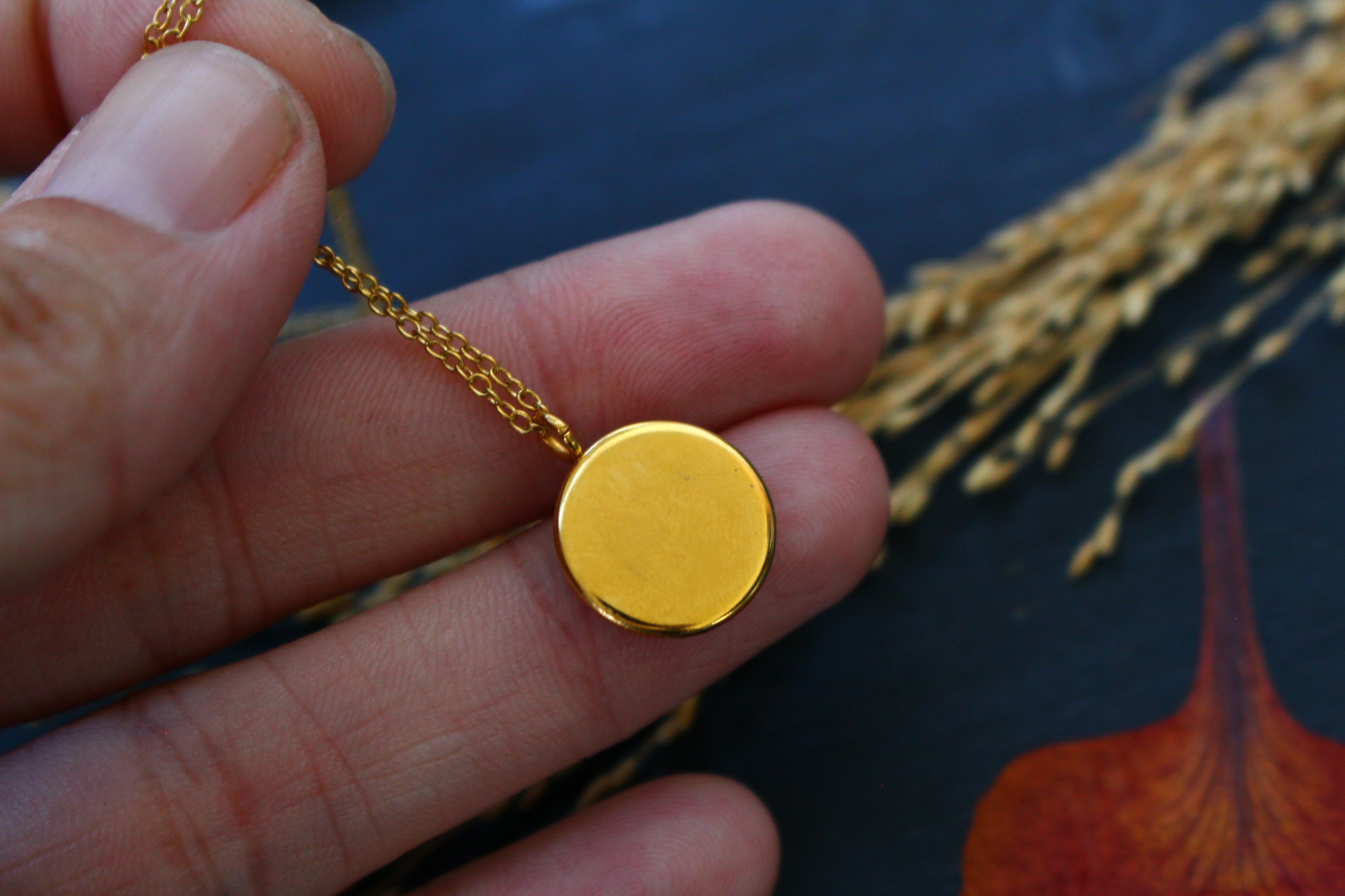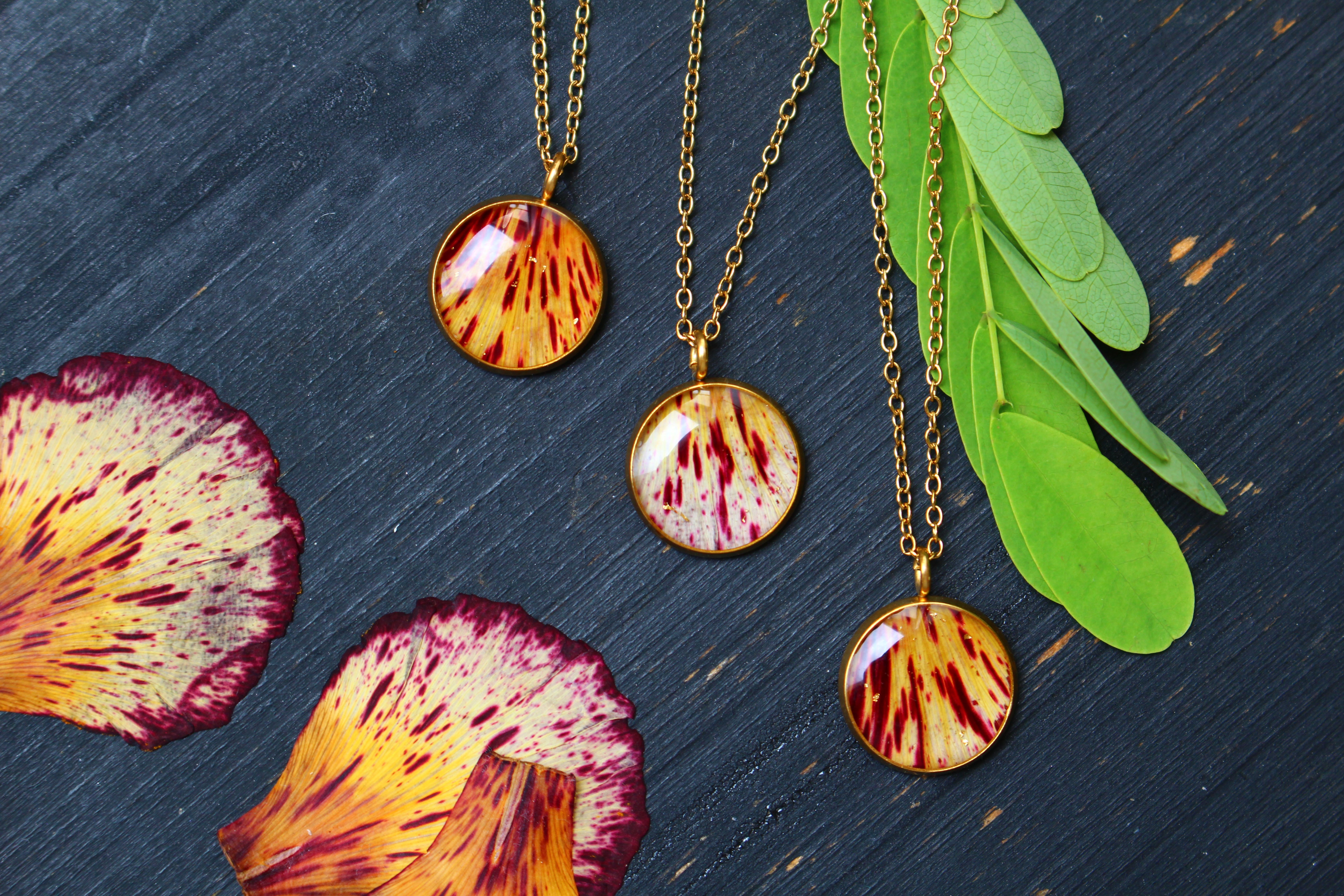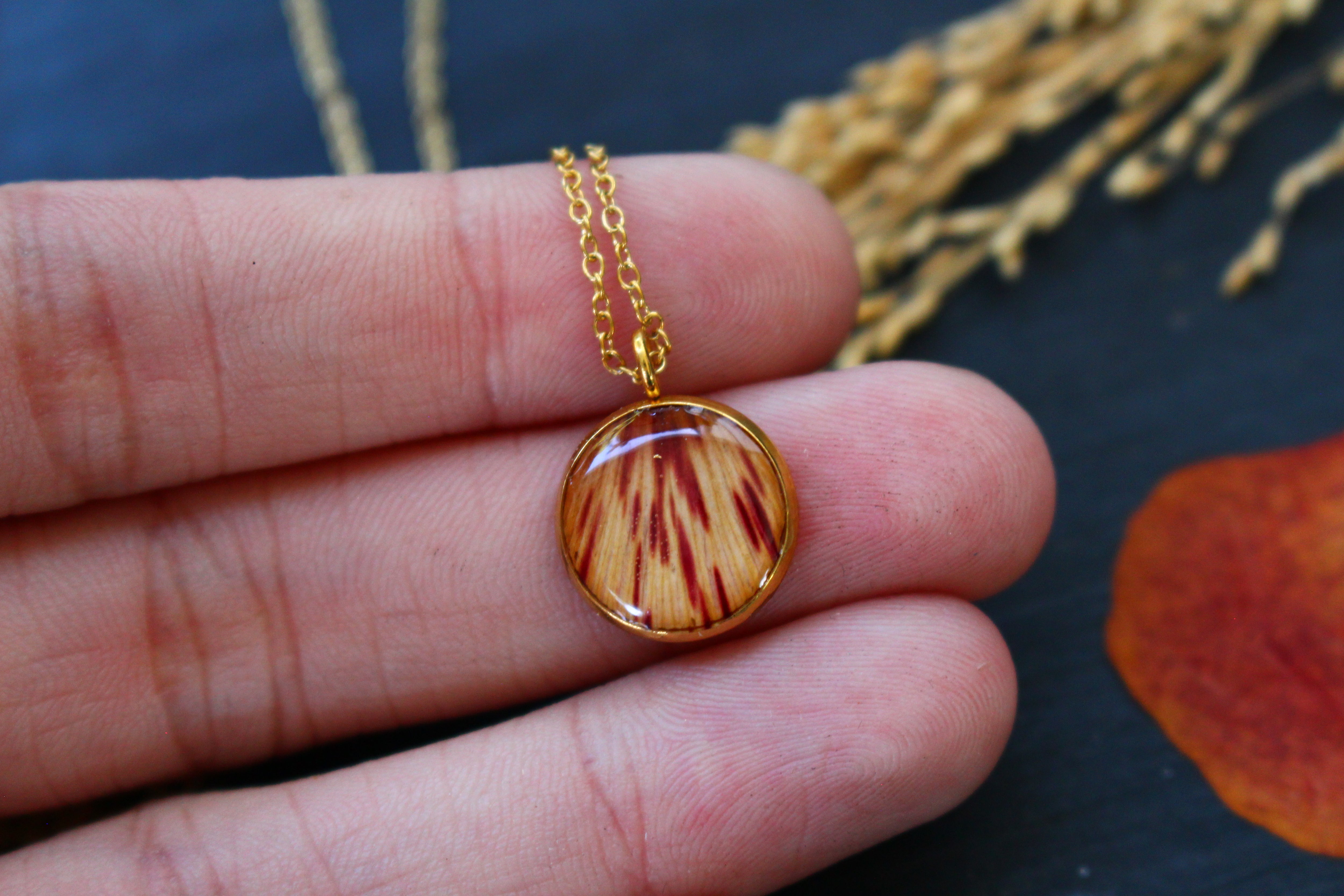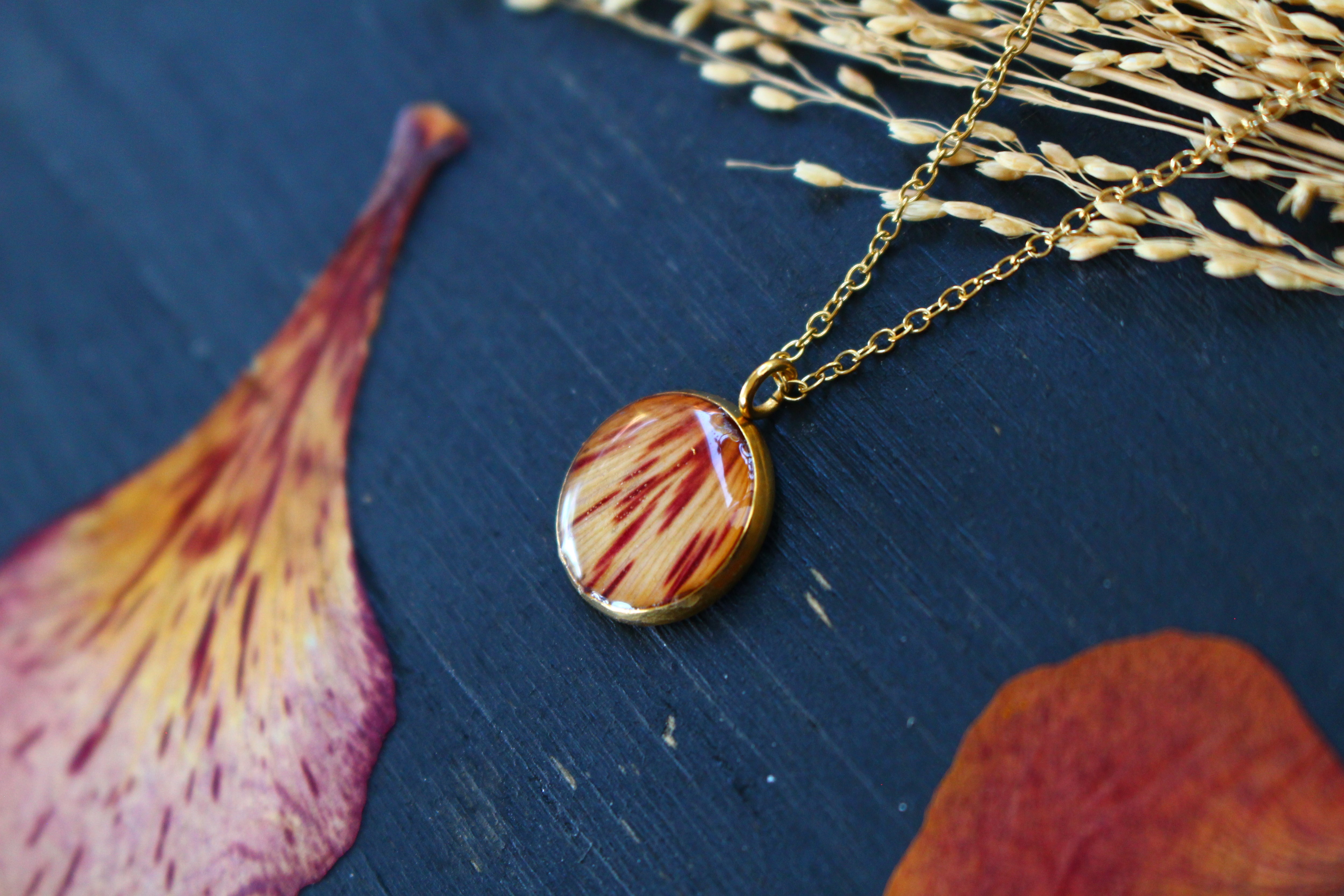 Collier composé d'un médaillon plein de 12mm de diamètre rempli de résine dans laquelle j'ai incrusté une partie d'un pétale de flamboyant et quelques paillettes de feuilles d'or