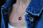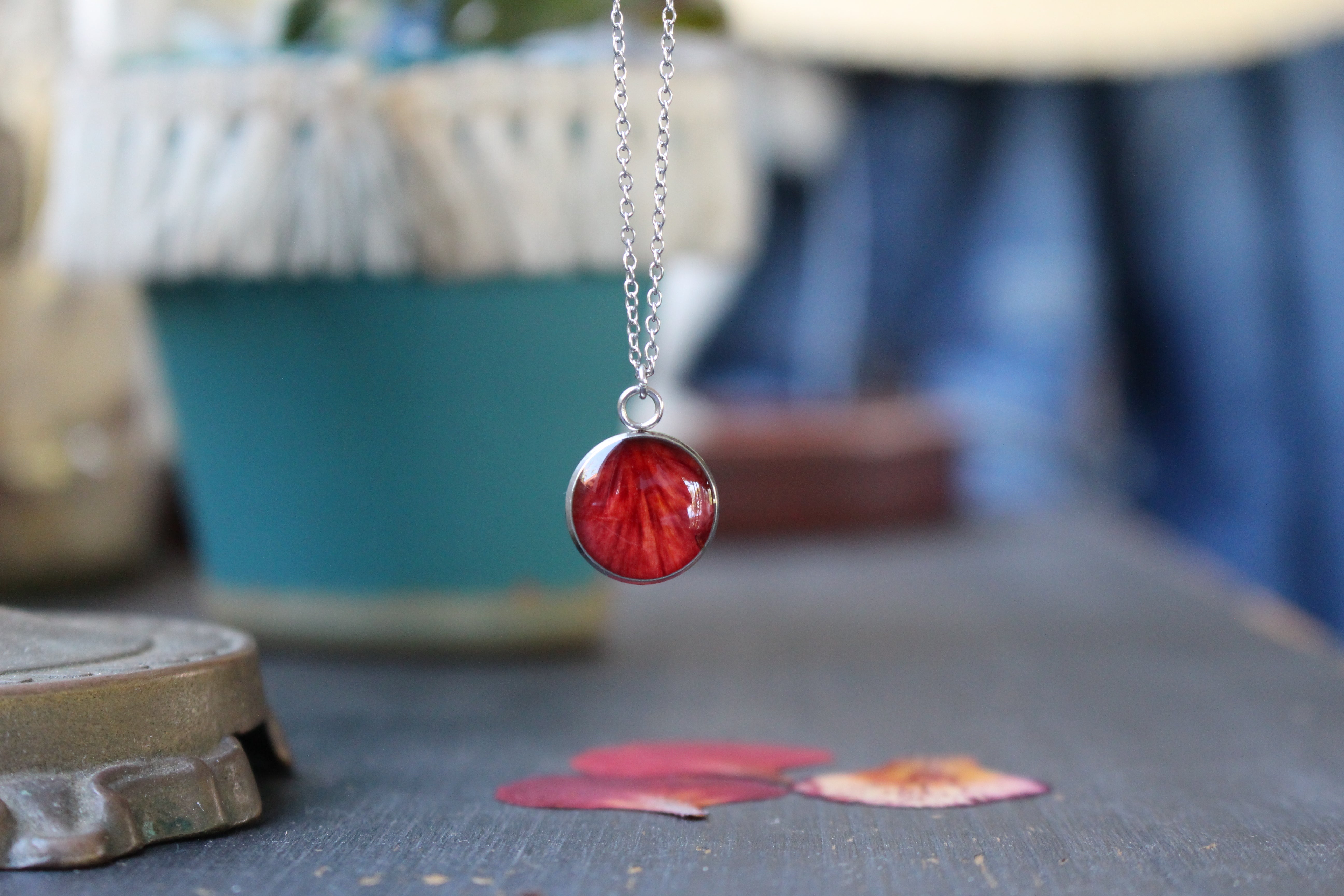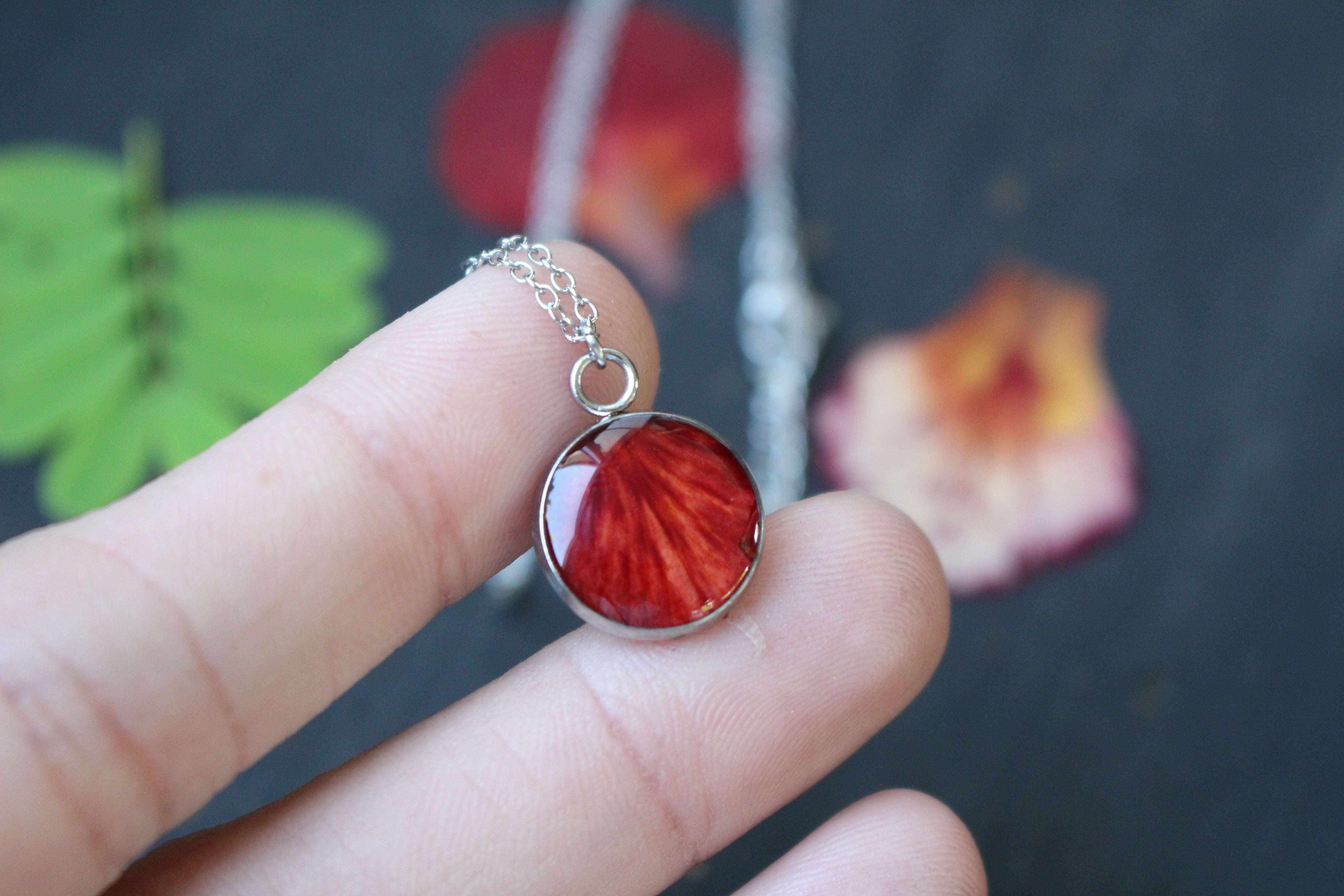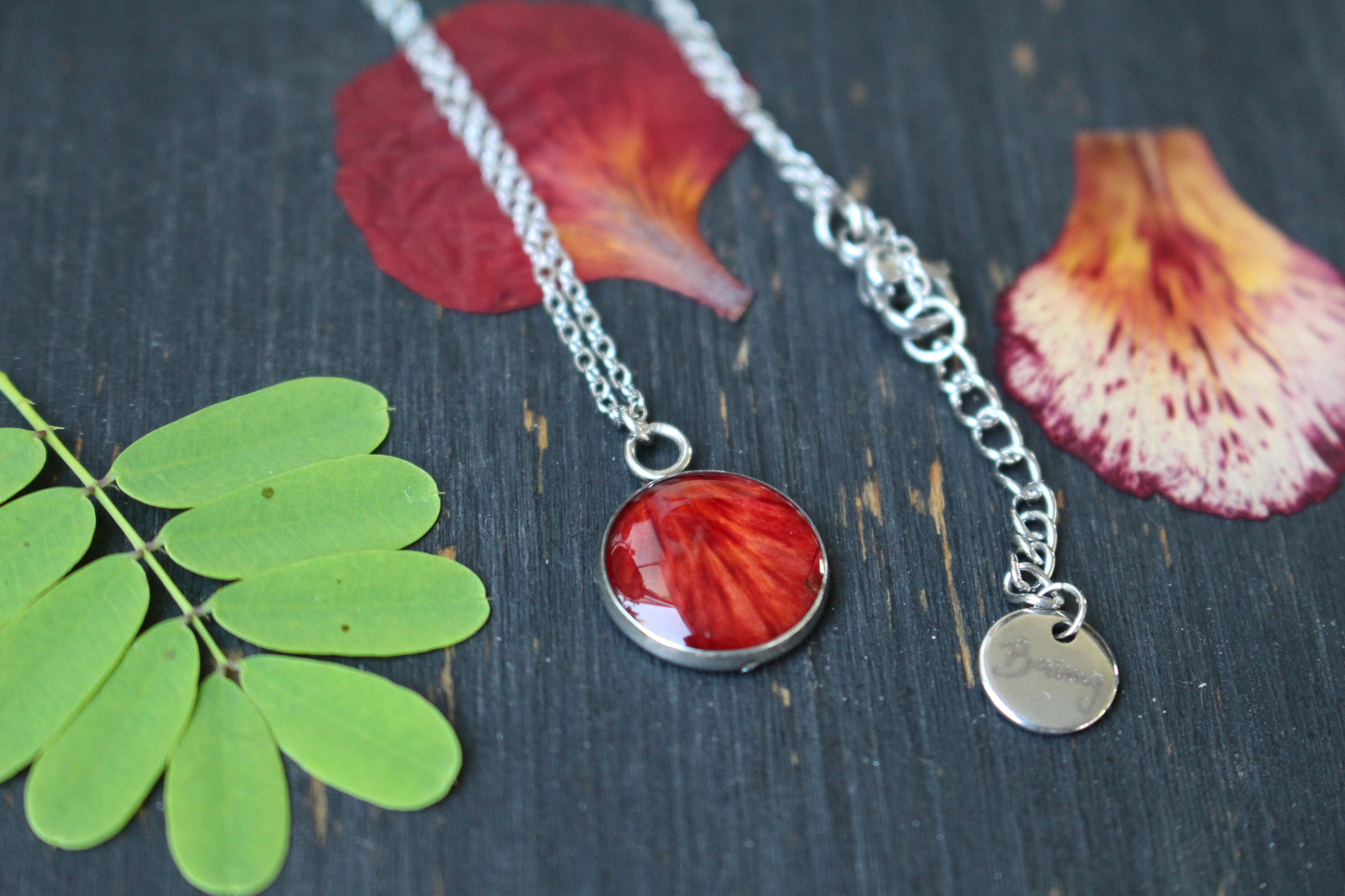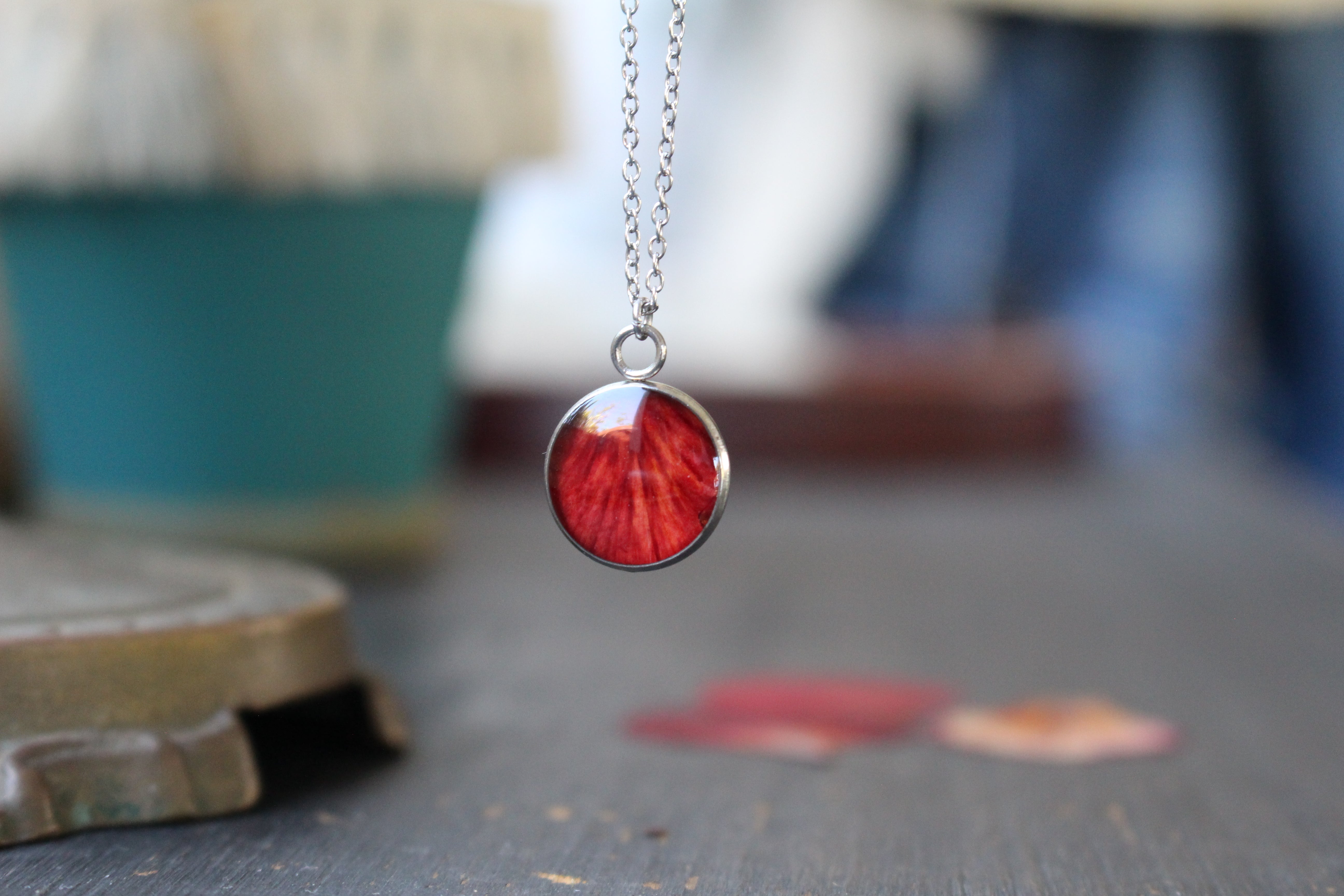 Collier composé d'un médaillon plein de 12 mm de diamètre rempli de résine dans laquelle j'ai incrusté une partie d'un pétale de flamboyant