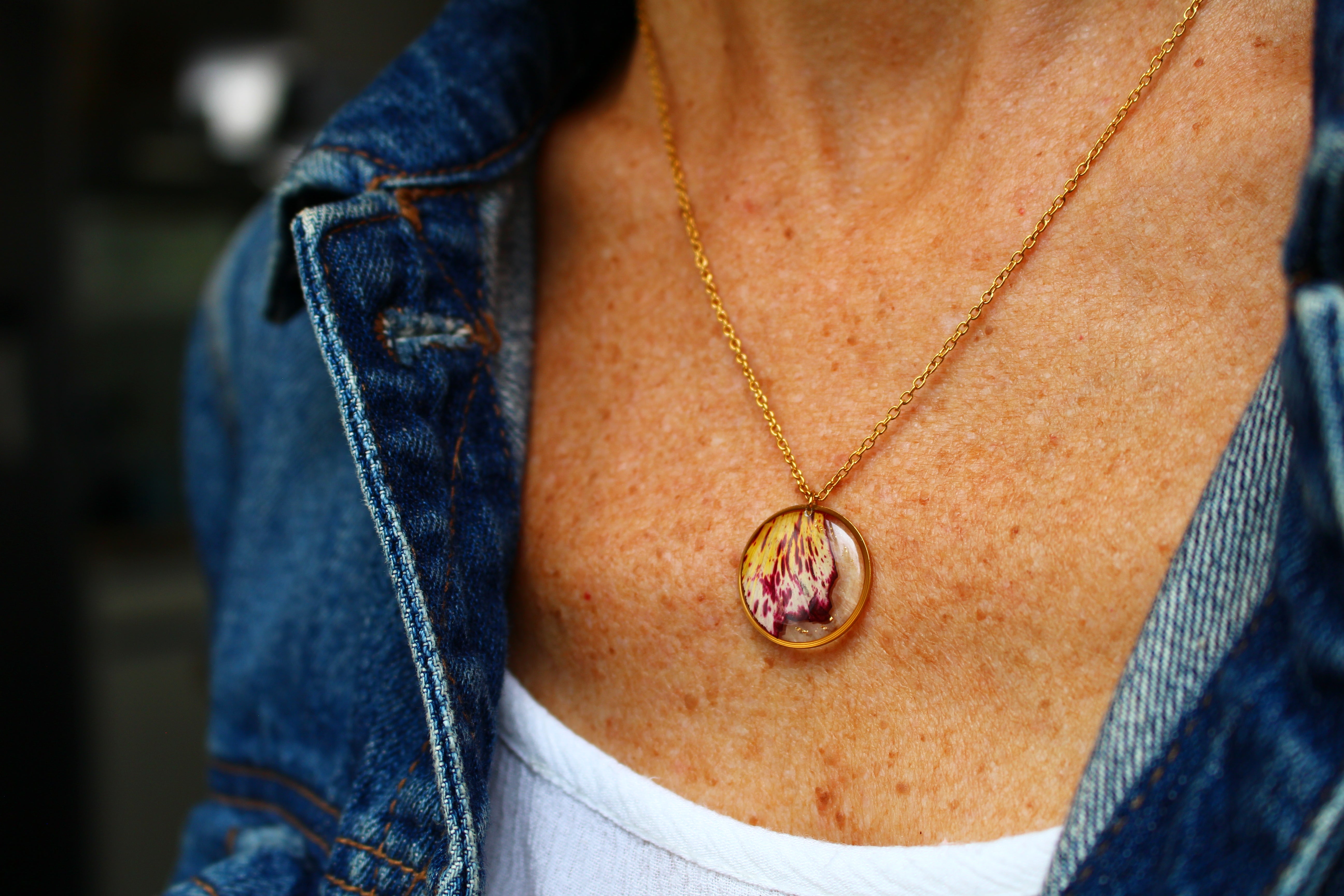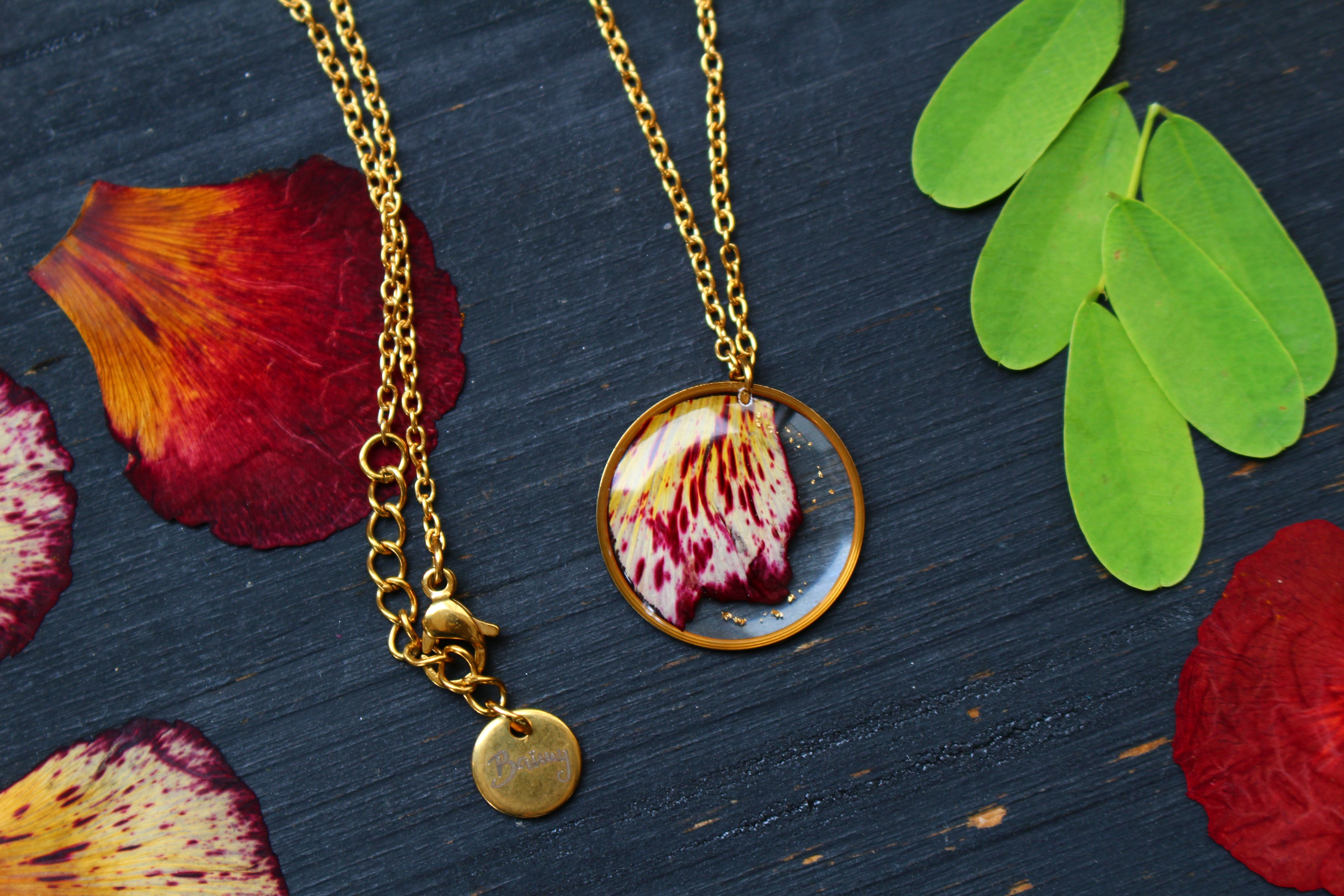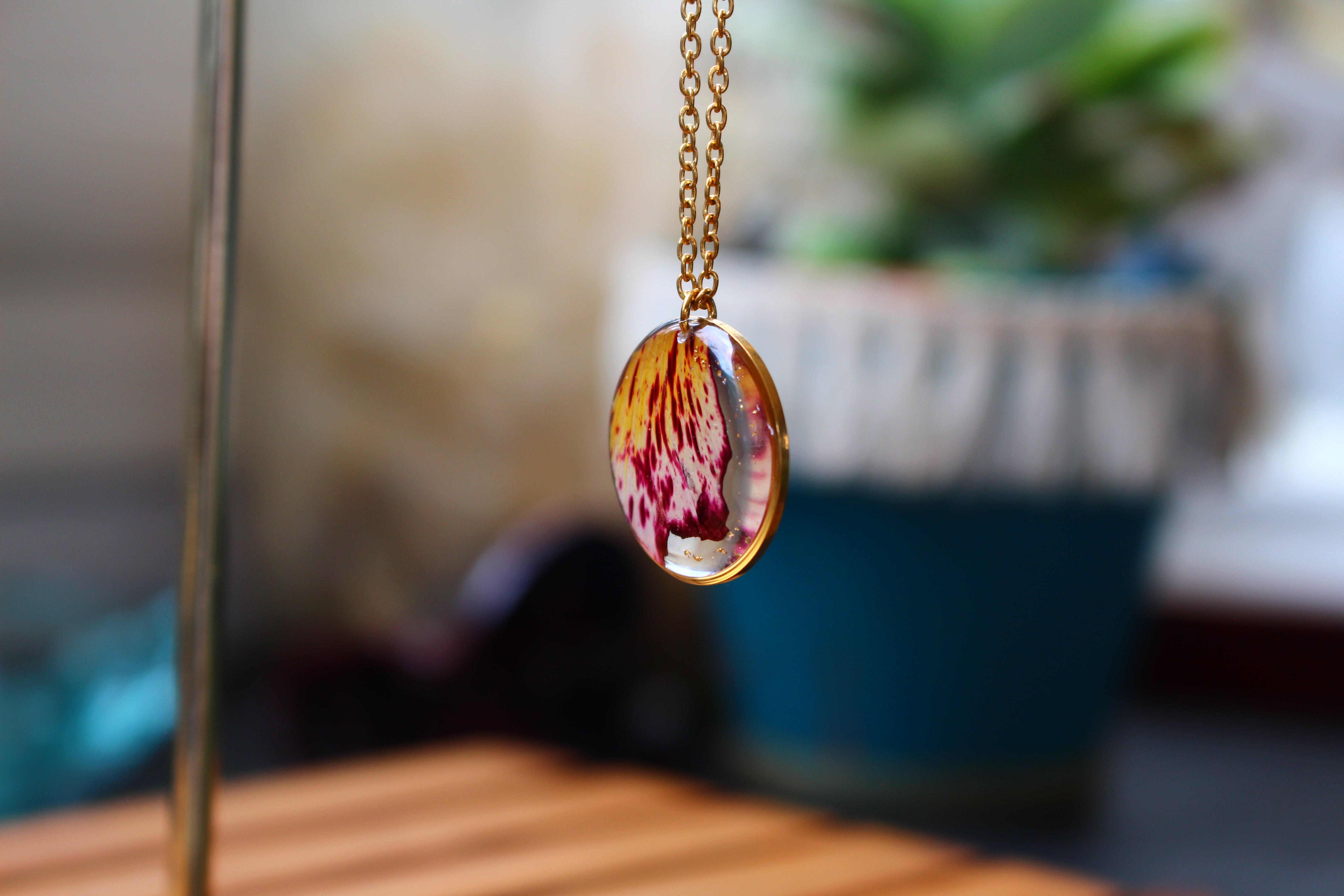 Collier composé d'un médaillon de 19mm de diamètre rempli de résine dans laquelle j'ai incrusté une partie d'un pétale de flamboyant et des particules de feuilles d'or. Aussi joli recto que verso :)