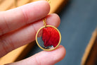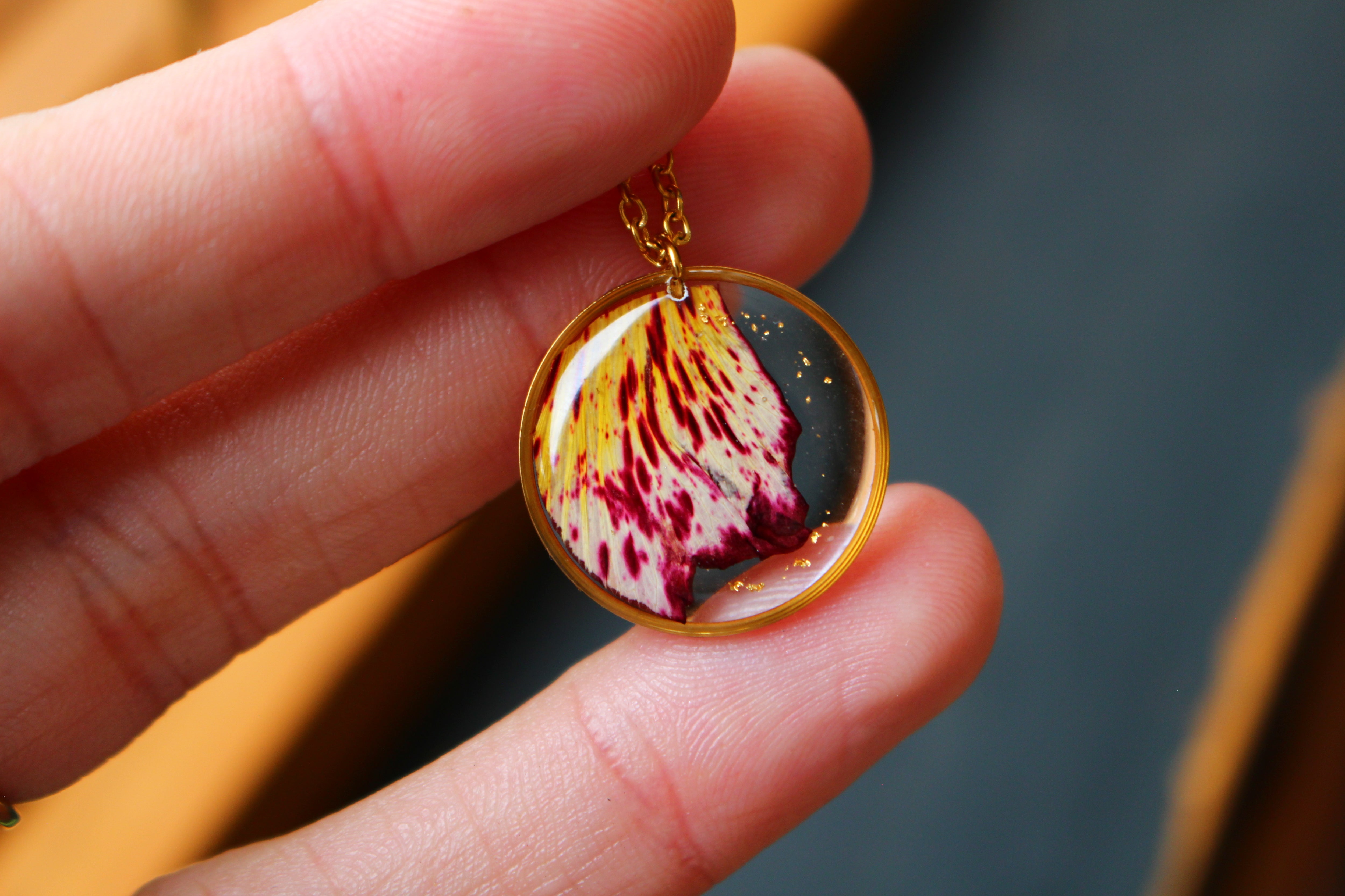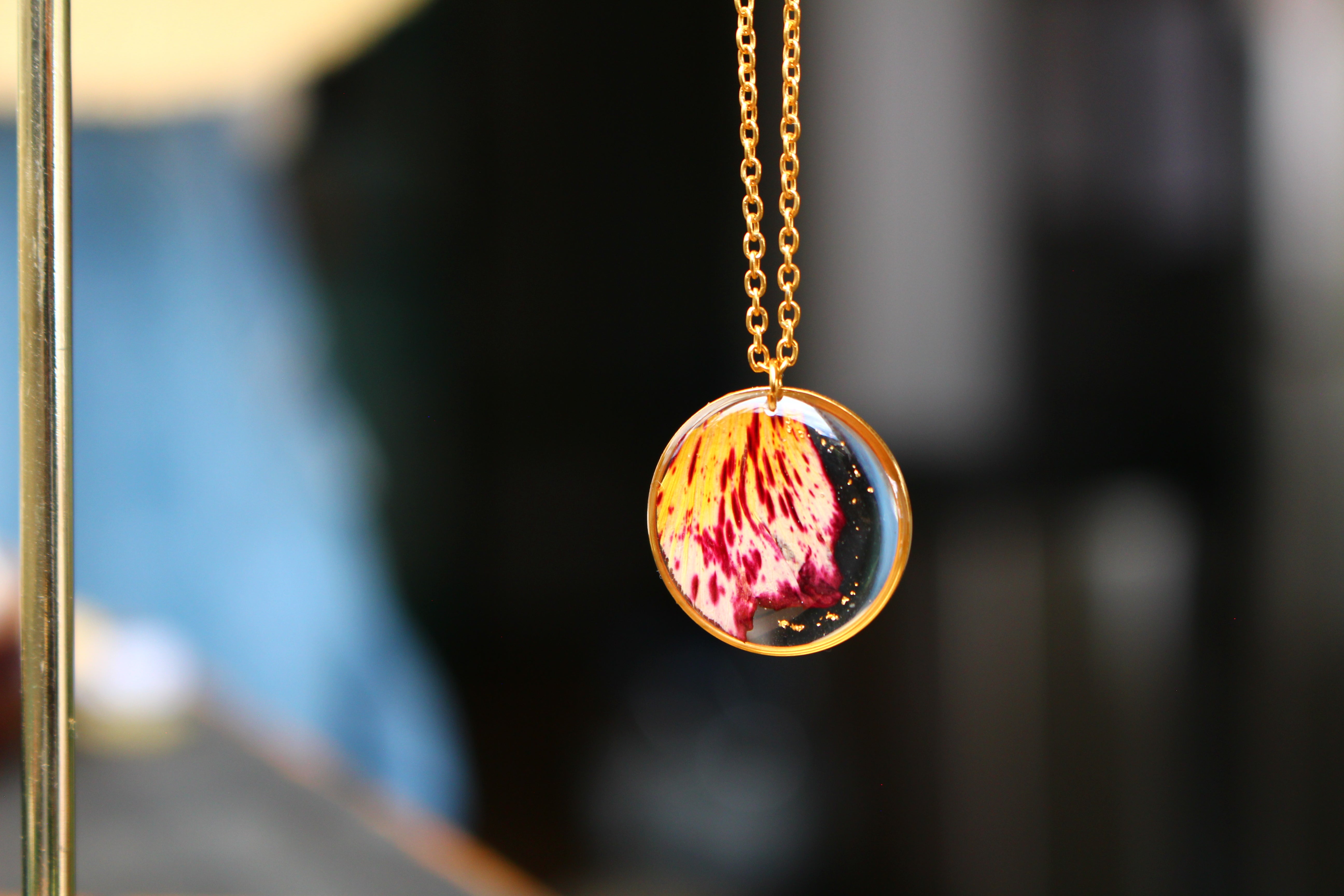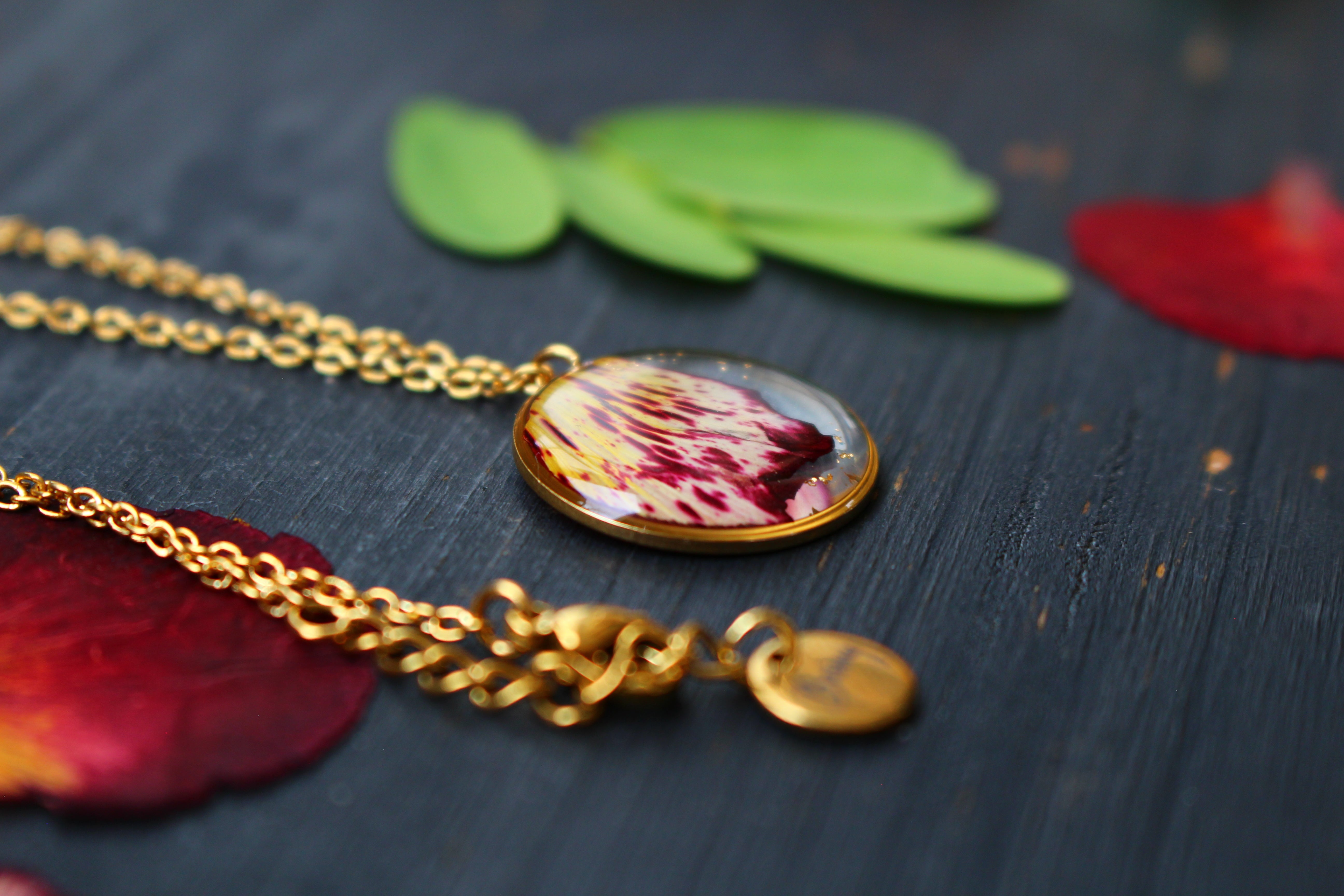Collier composé d'un médaillon de 19mm de diamètre rempli de résine dans laquelle j'ai incrusté une partie d'un pétale de flamboyant et des particules de feuilles d'or. Aussi joli recto que verso :)