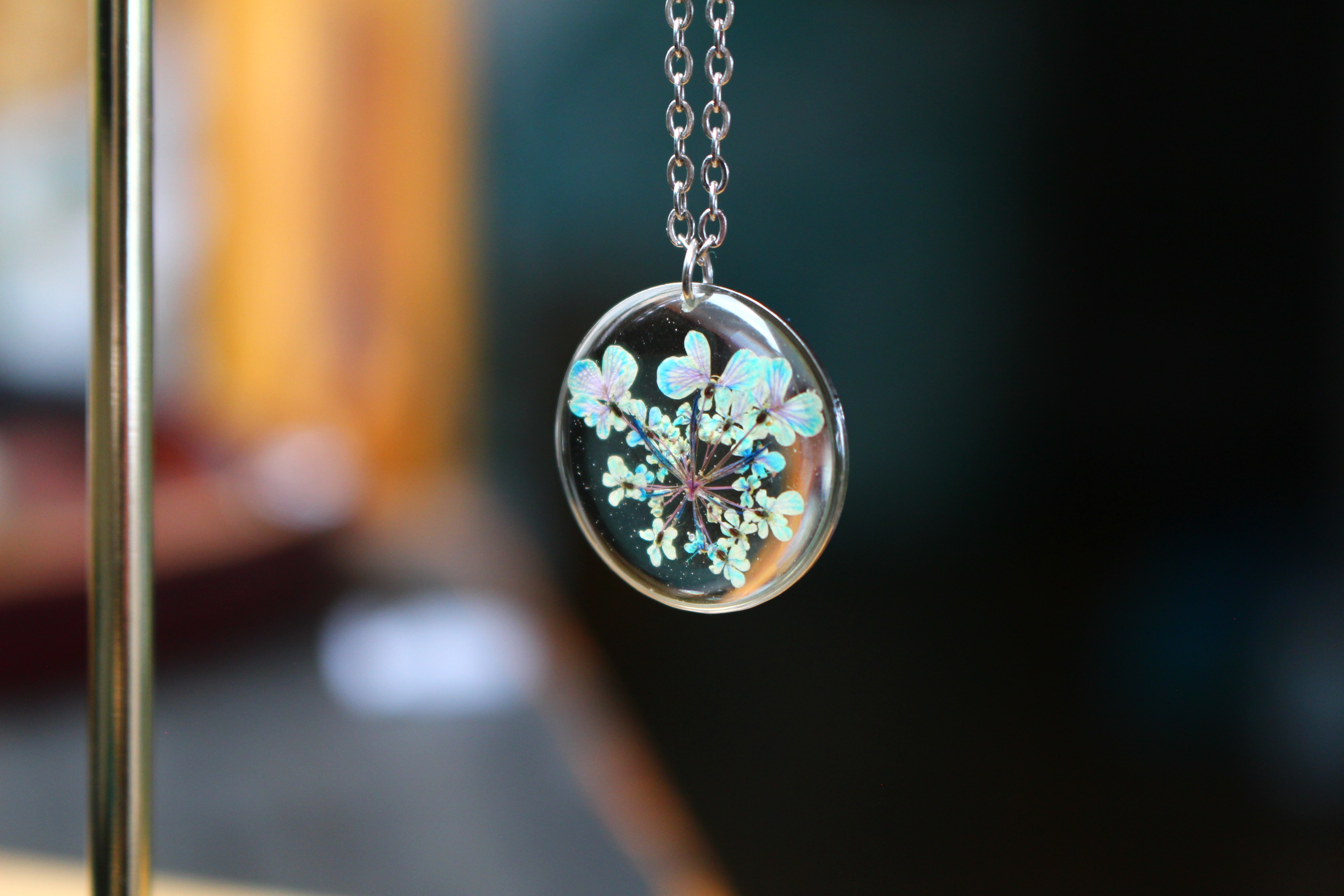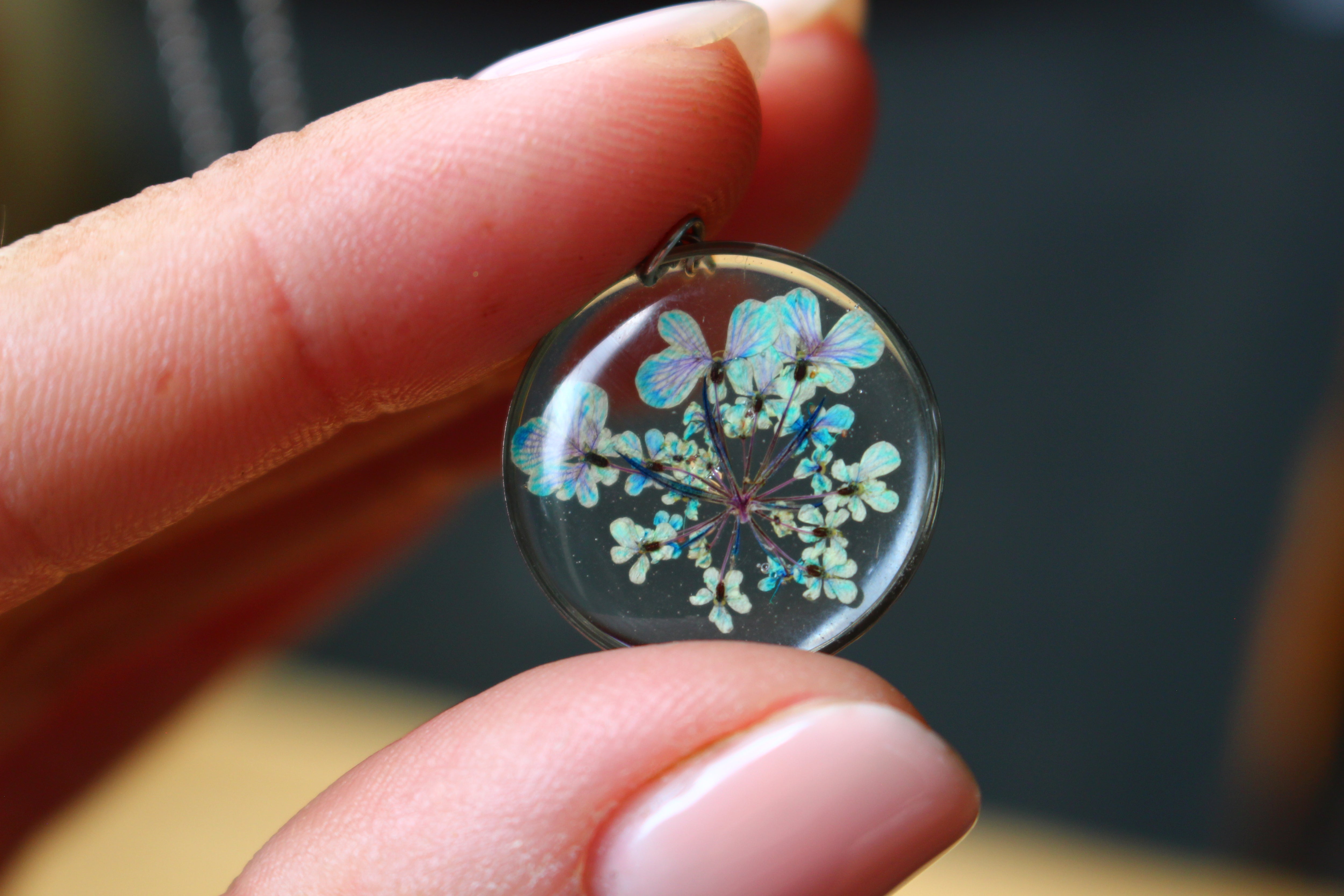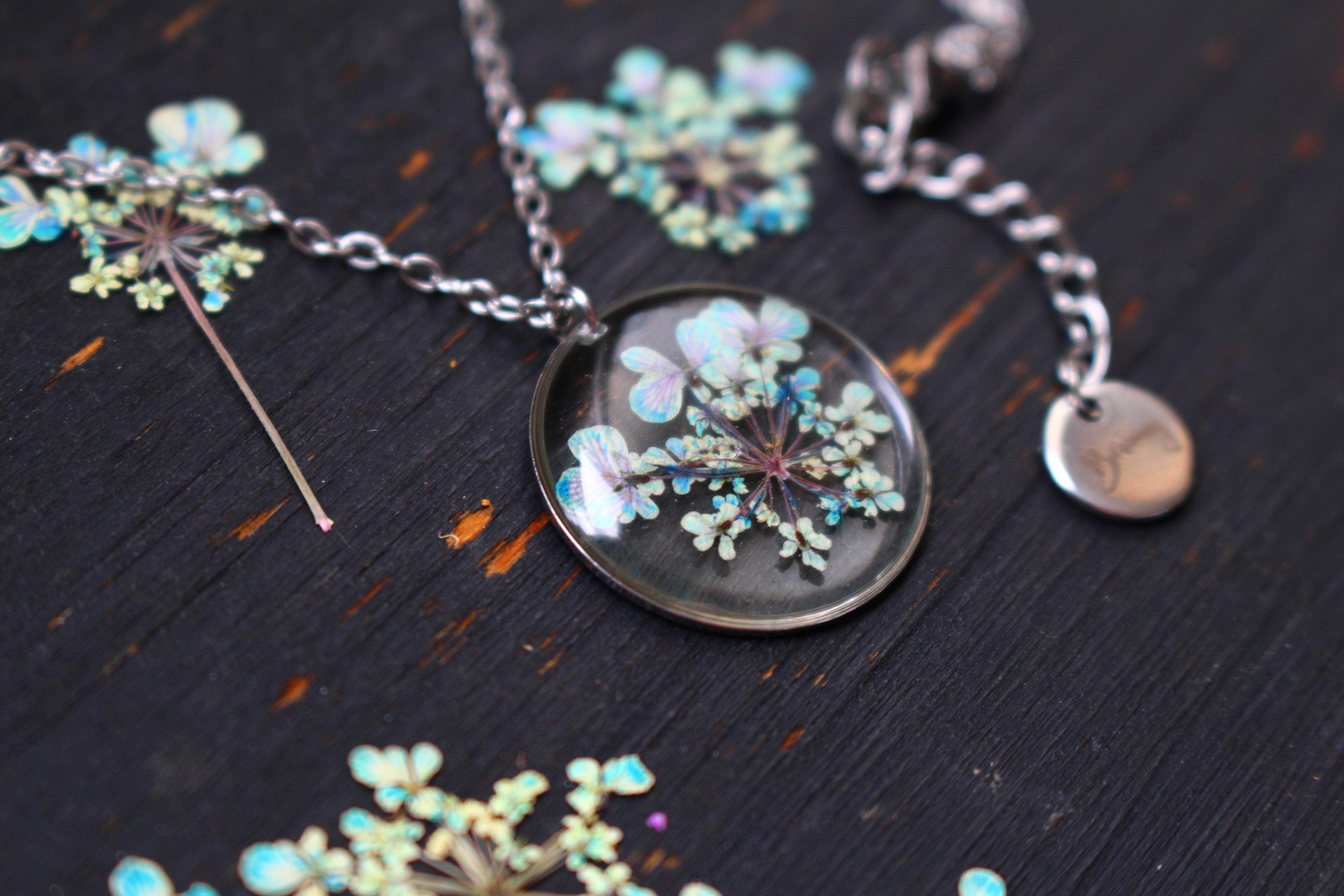 Collier composé d'un médaillon de 19mm de diamètre rempli de résine dans laquelle j'ai incrusté des petites fleurs de reine d'Anne.