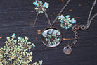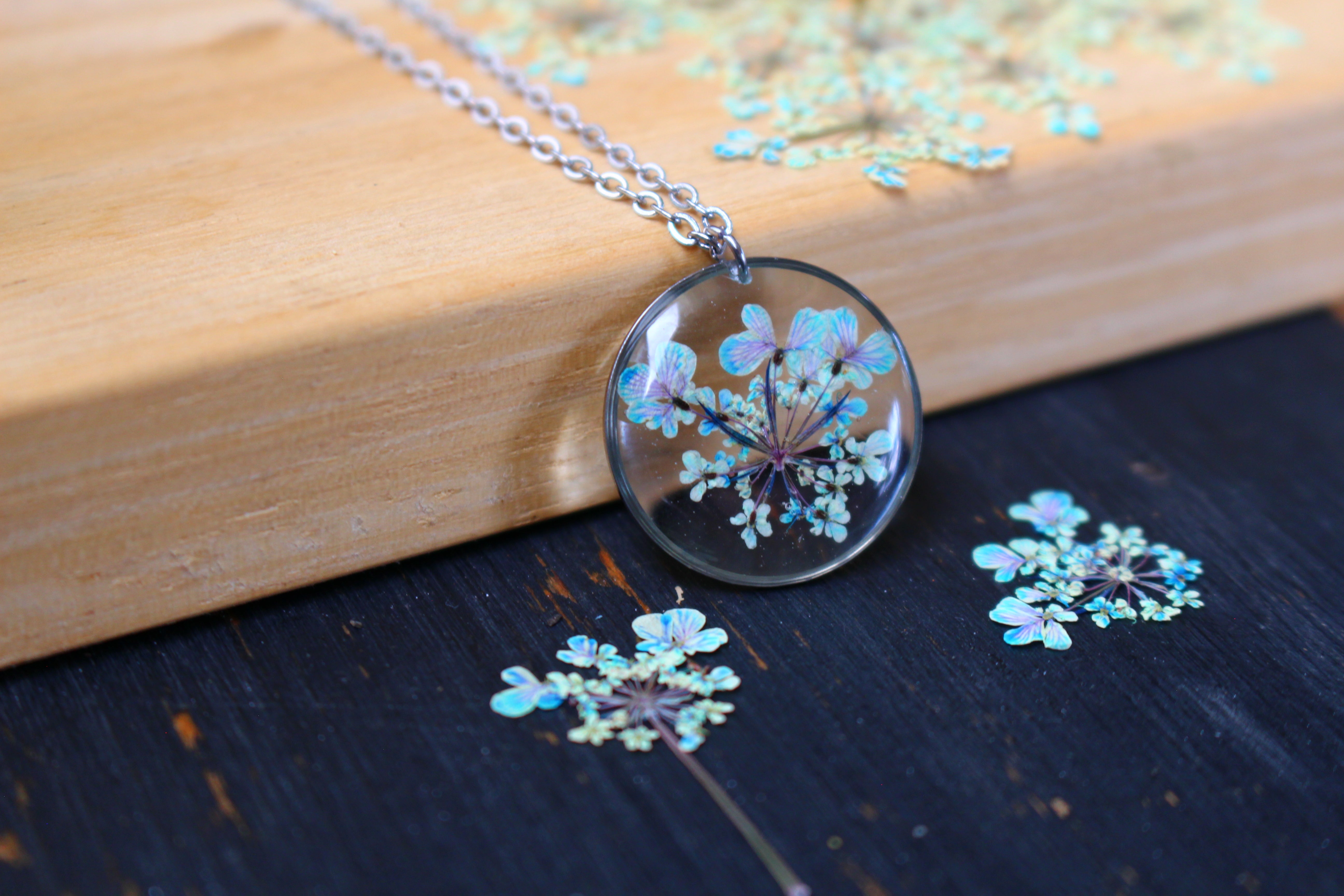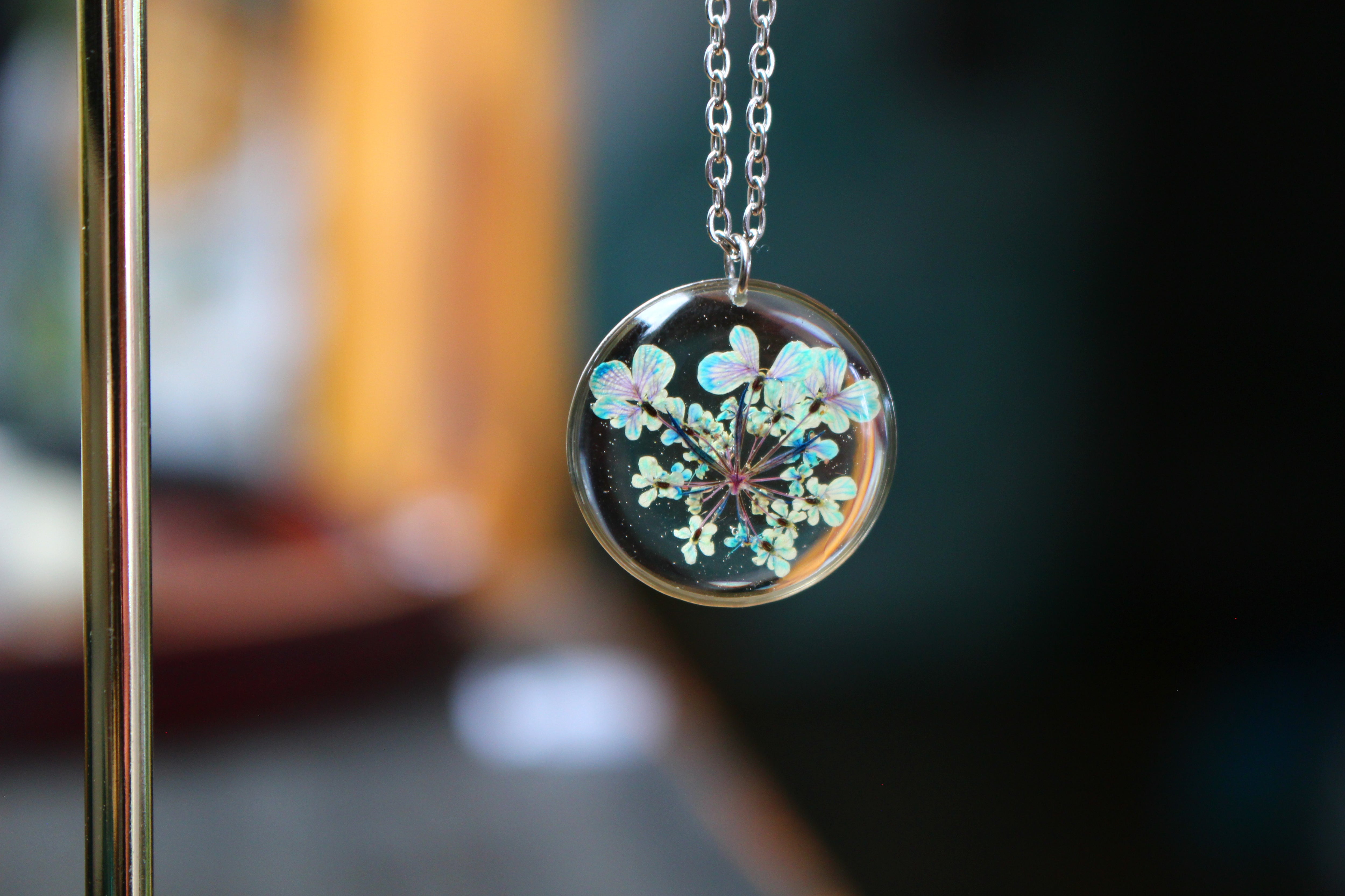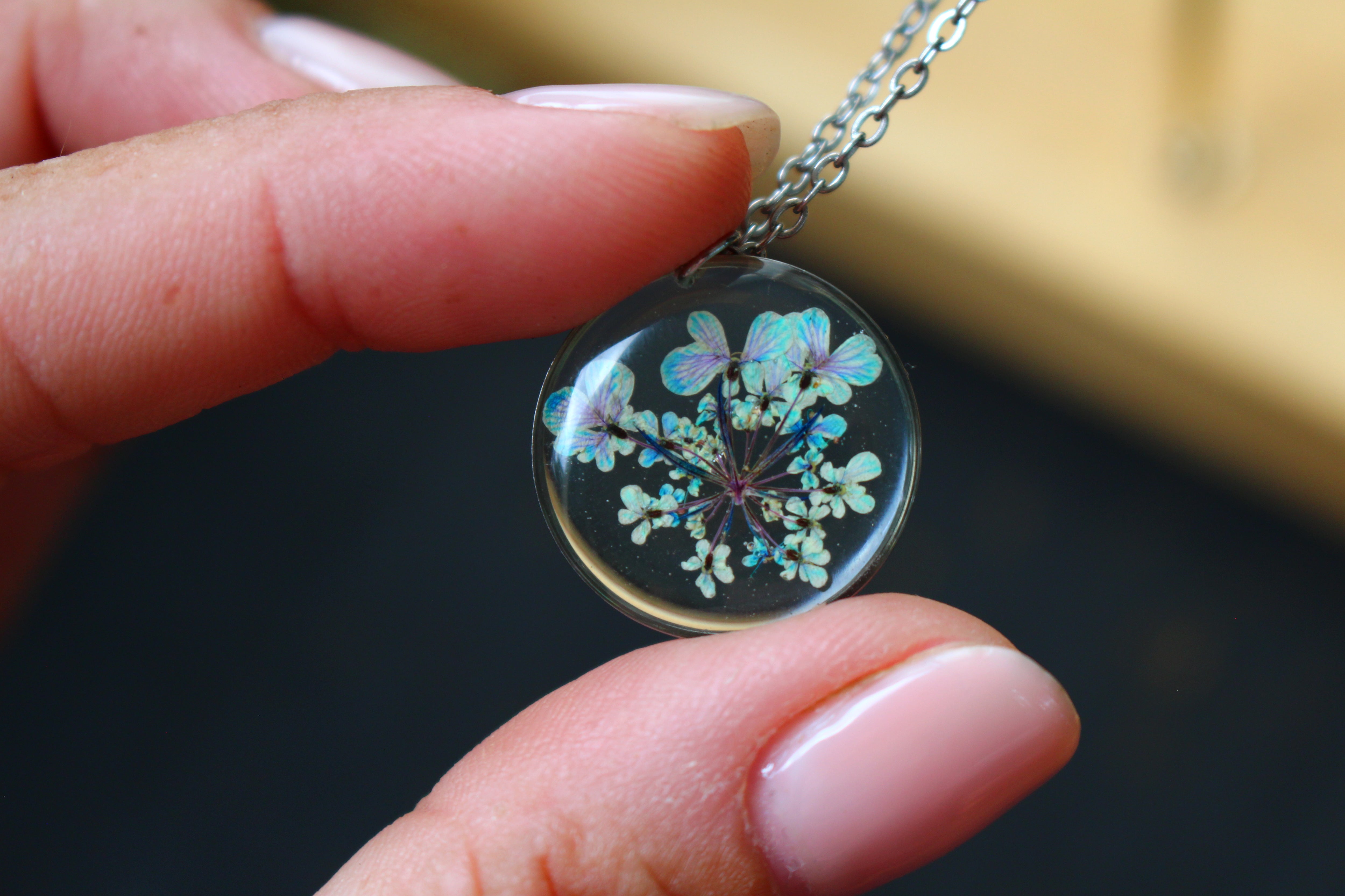 Collier composé d'un médaillon de 19mm de diamètre rempli de résine dans laquelle j'ai incrusté des petites fleurs de reine d'Anne.