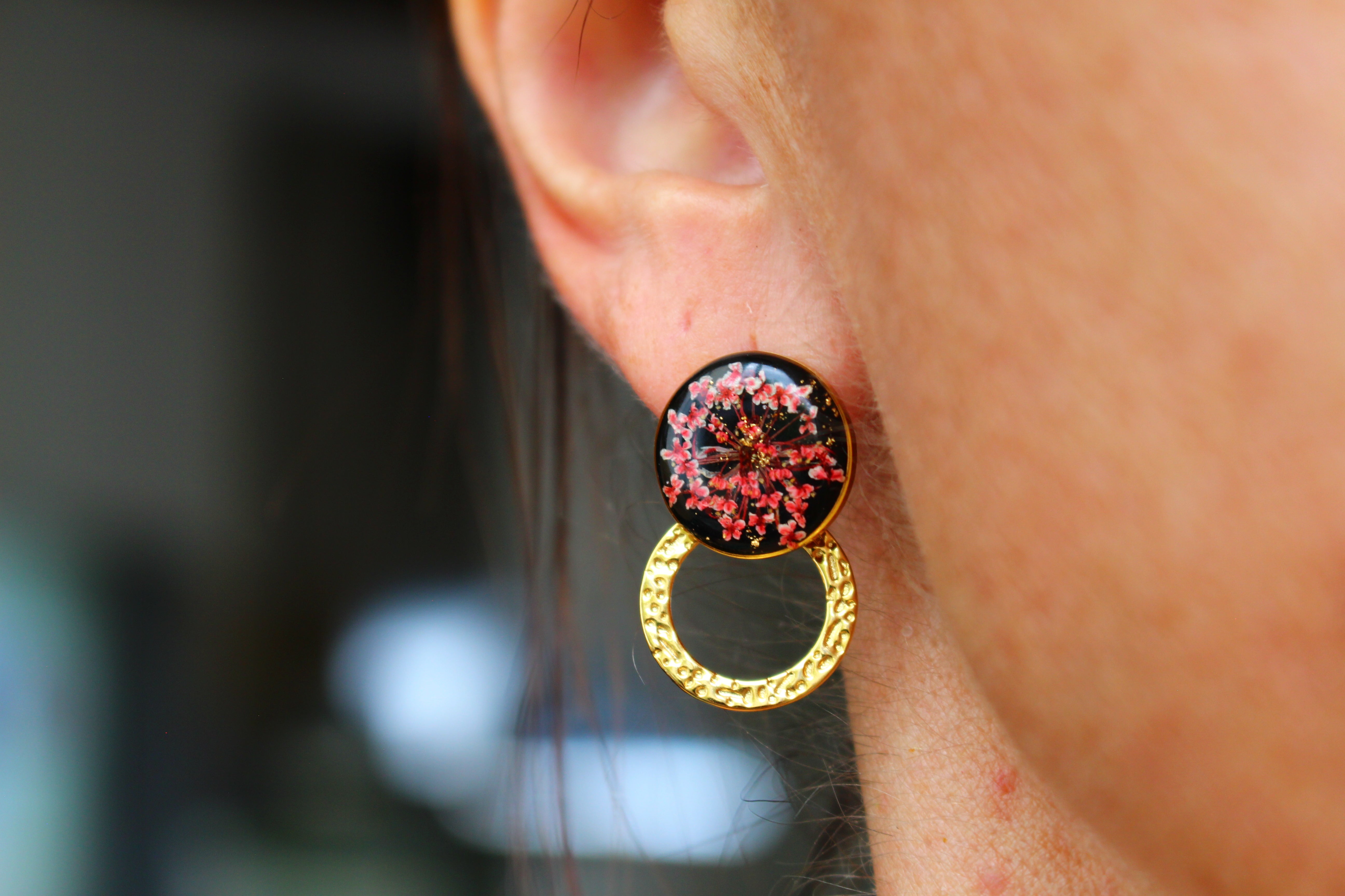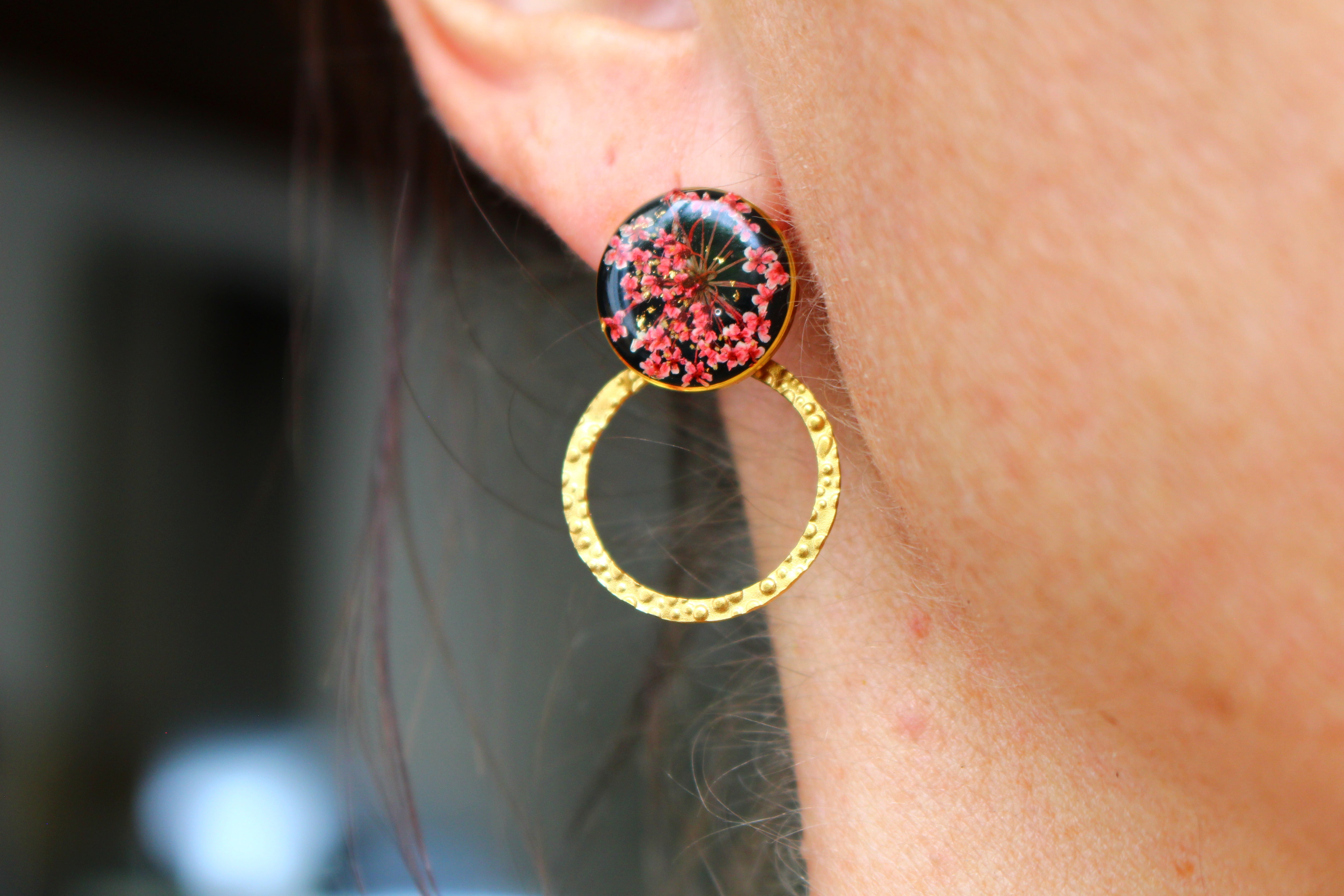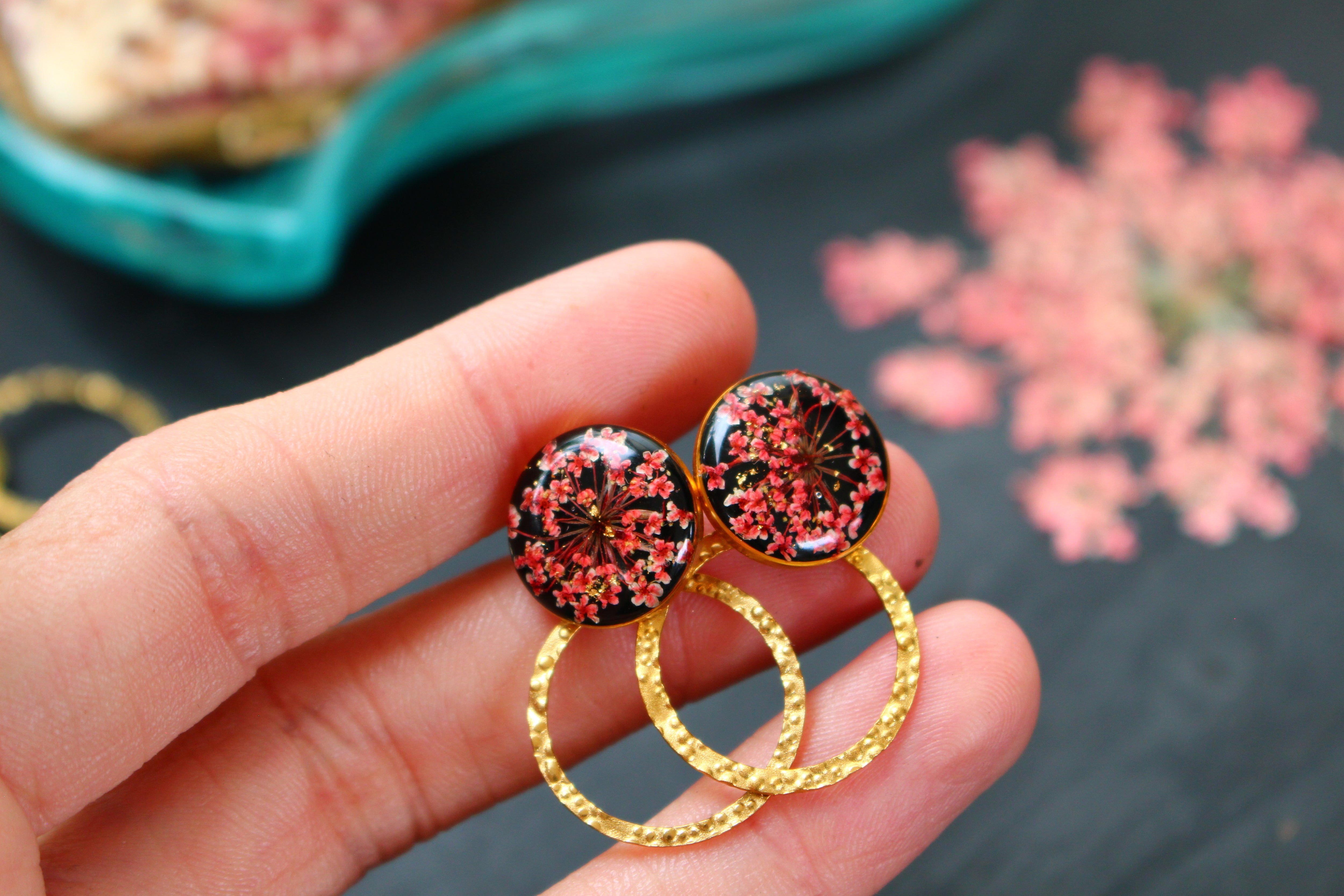 Boucles composées de cabochons de 14mm remplis de résine dans laquelle j'ai incrusté de fleurs de dentelles de le Reine d'Anne et quelques particules de feuilles d'or sur un fond noir.