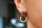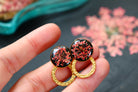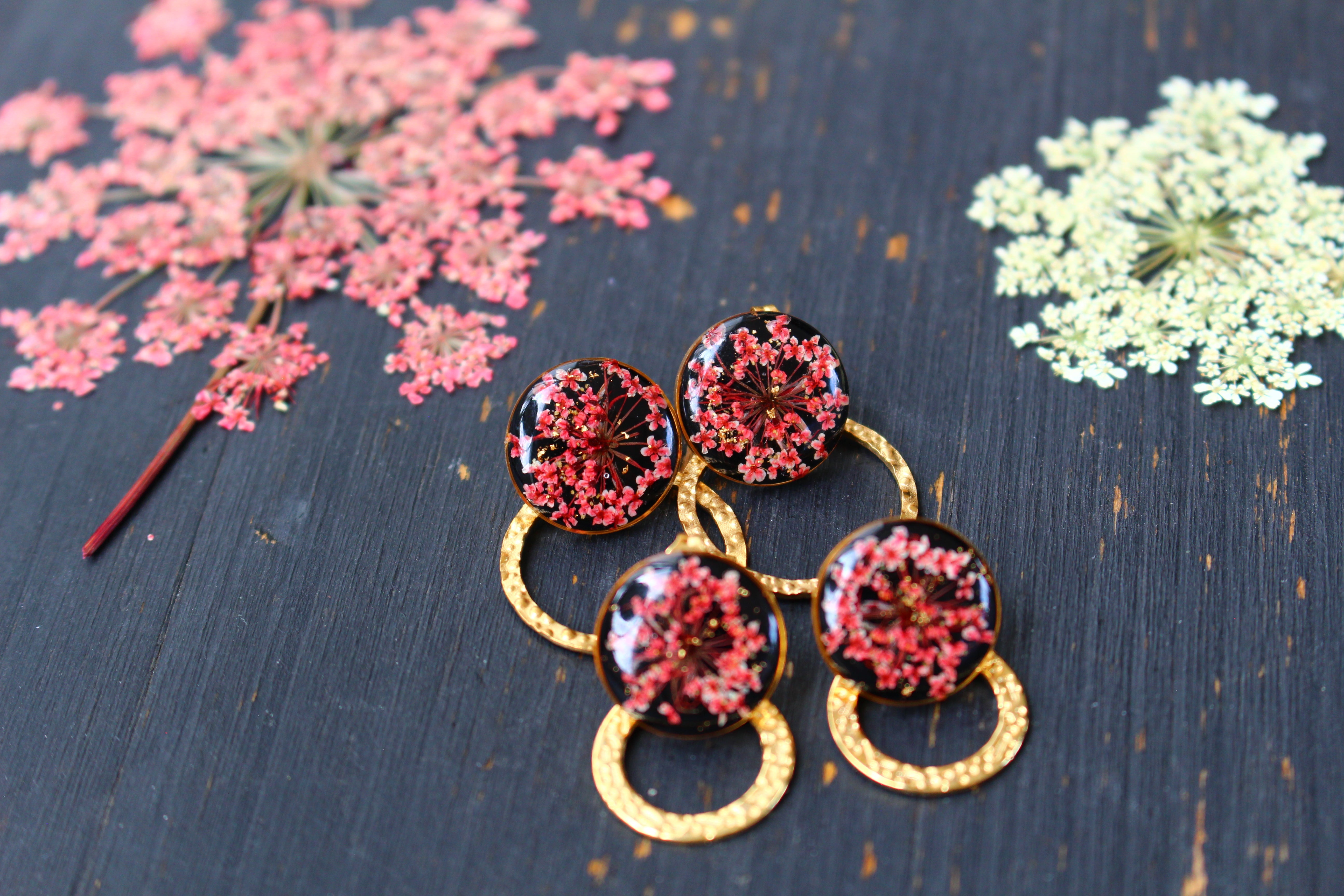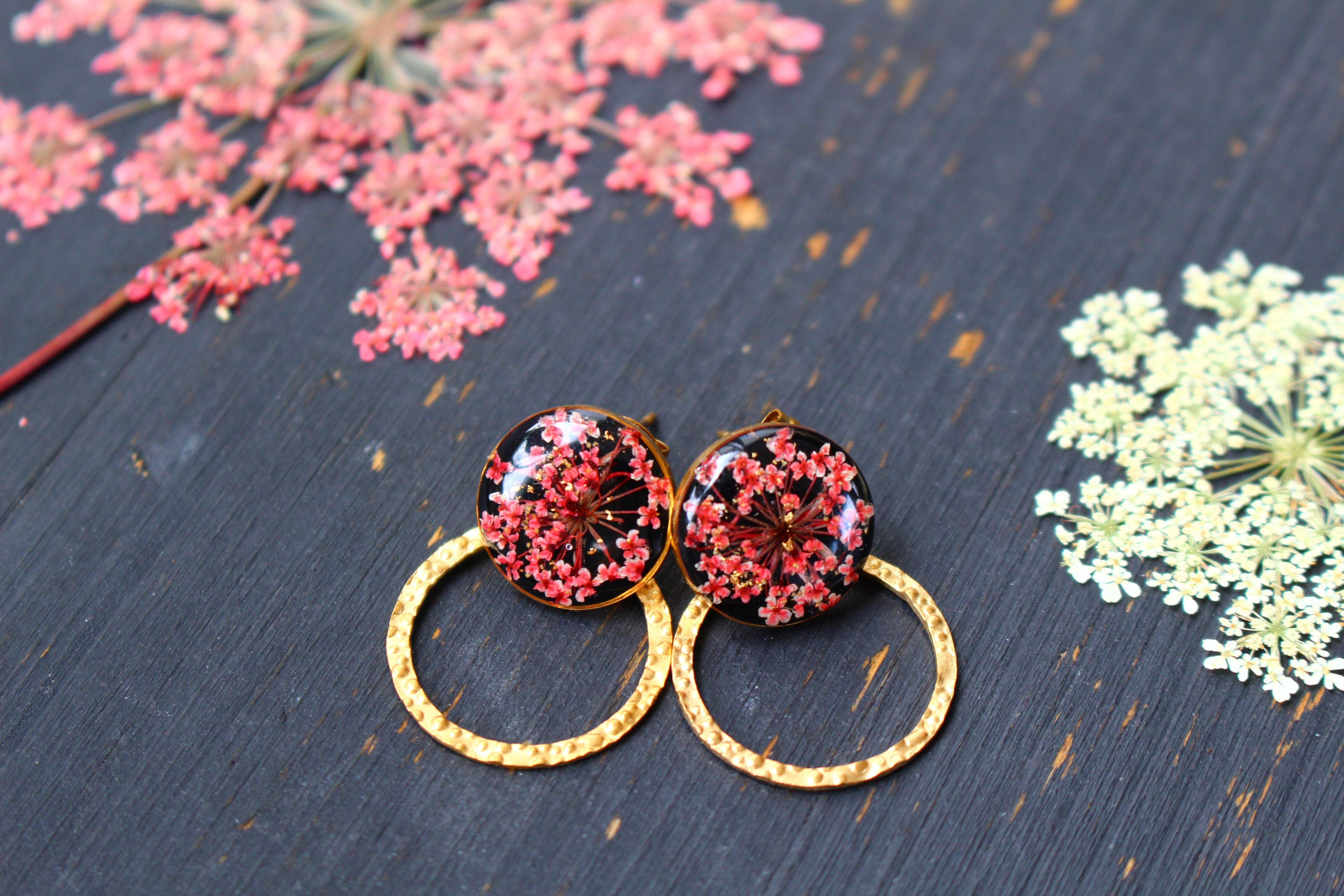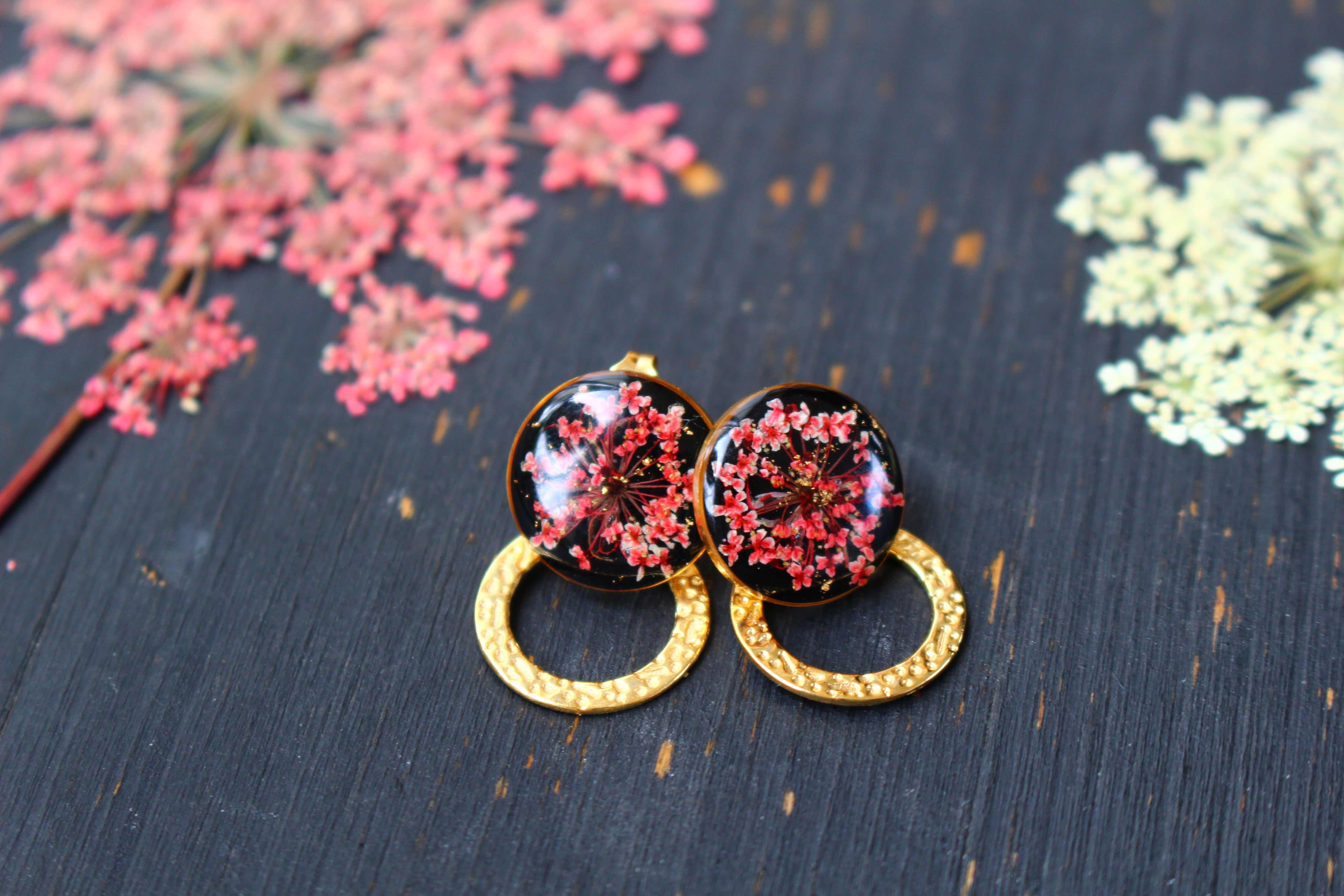 Boucles composées de cabochons de 14mm remplis de résine dans laquelle j'ai incrusté de fleurs de dentelles de le Reine d'Anne et quelques particules de feuilles d'or sur un fond noir.