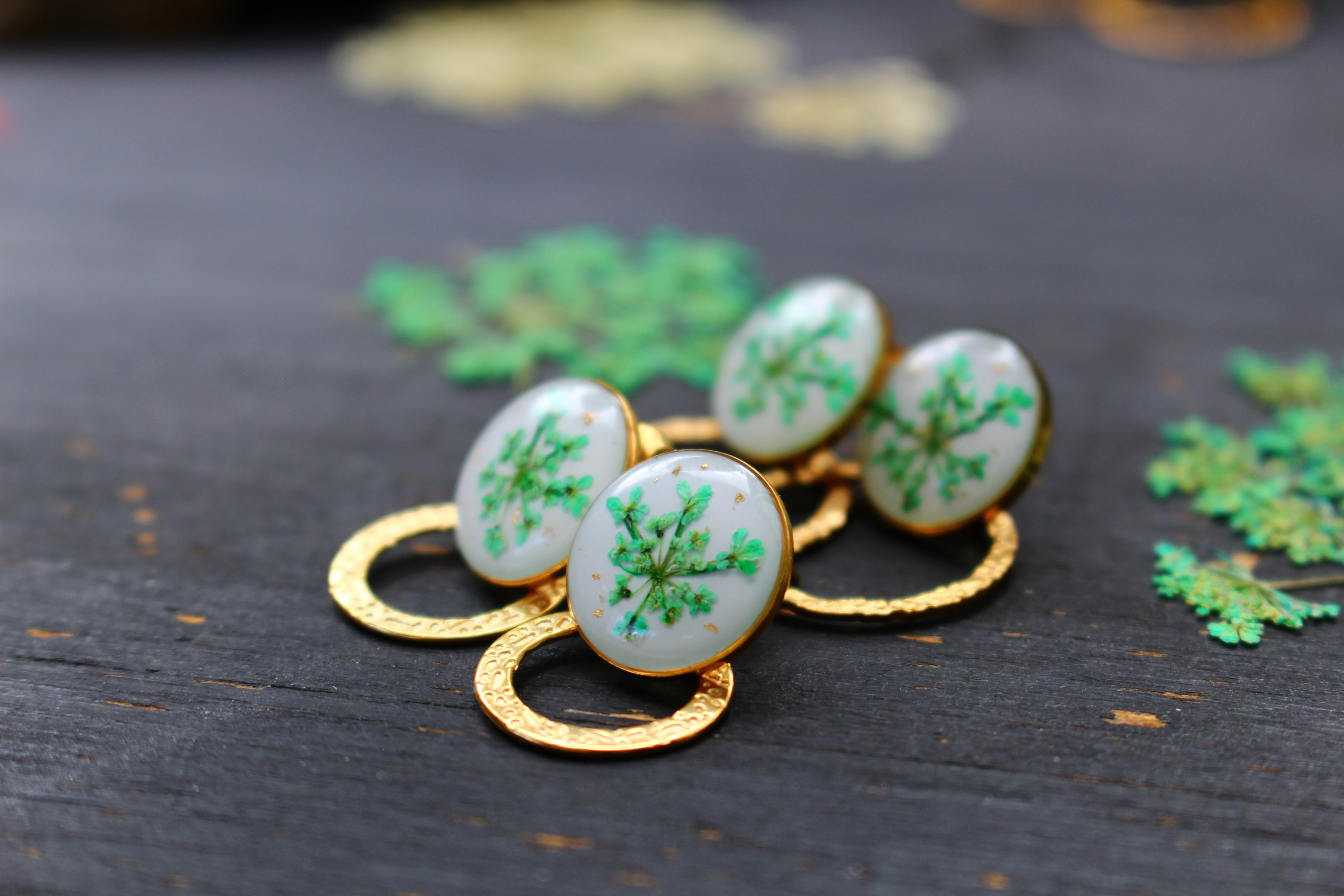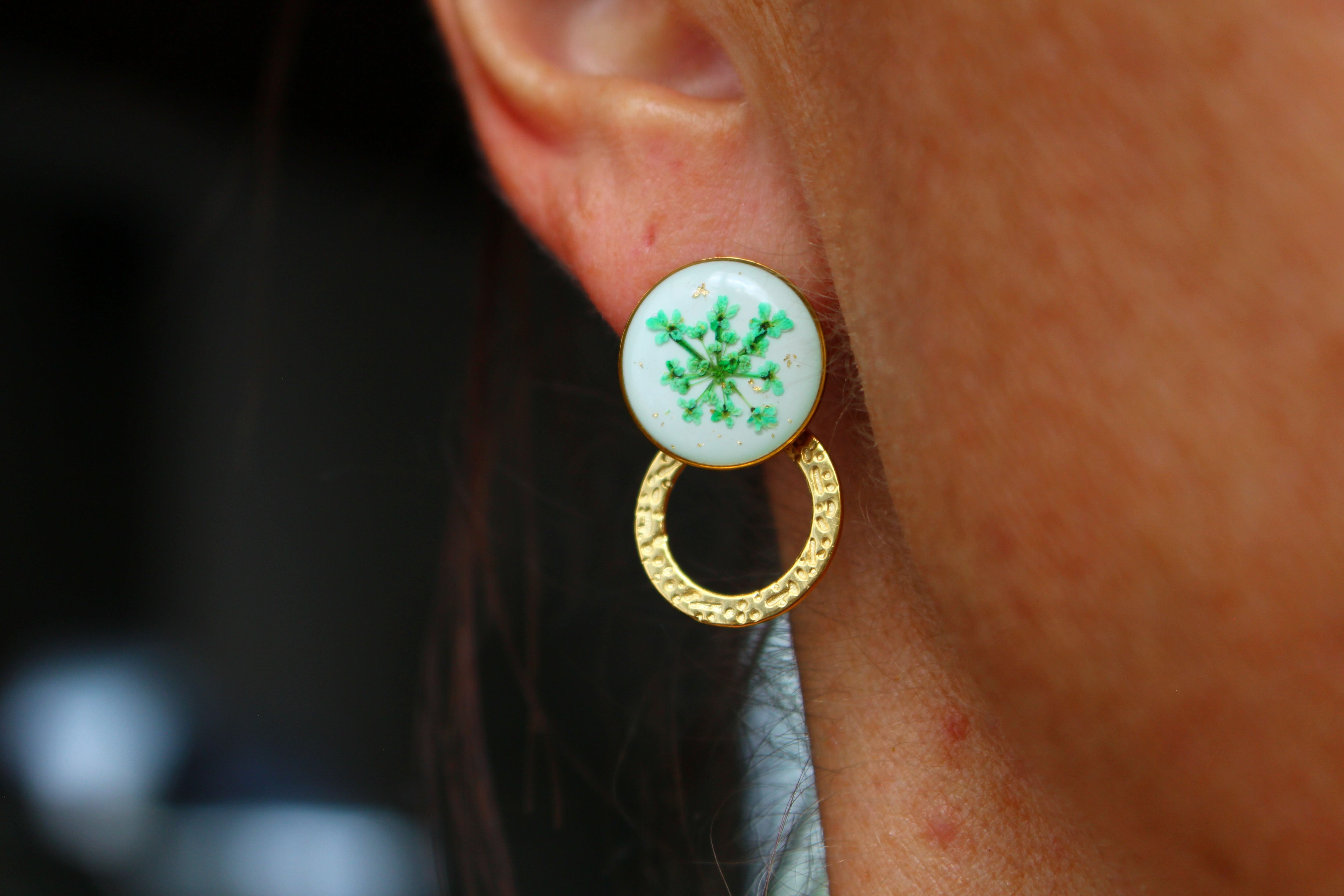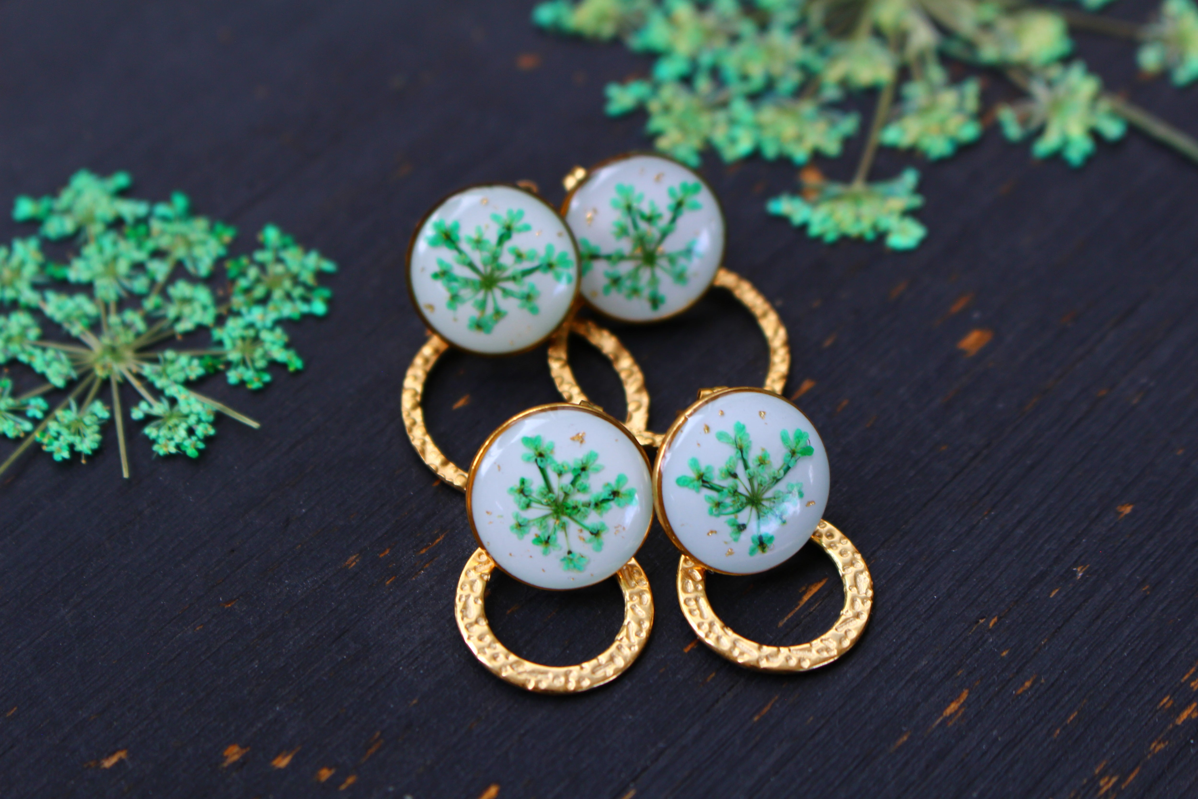 Boucles composées de cabochons de 14mm remplis de résine dans laquelle j'ai incrusté de fleurs de dentelles de le Reine d'Anne et quelques particules de feuilles d'or sur un fond blanc.