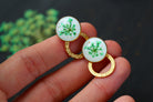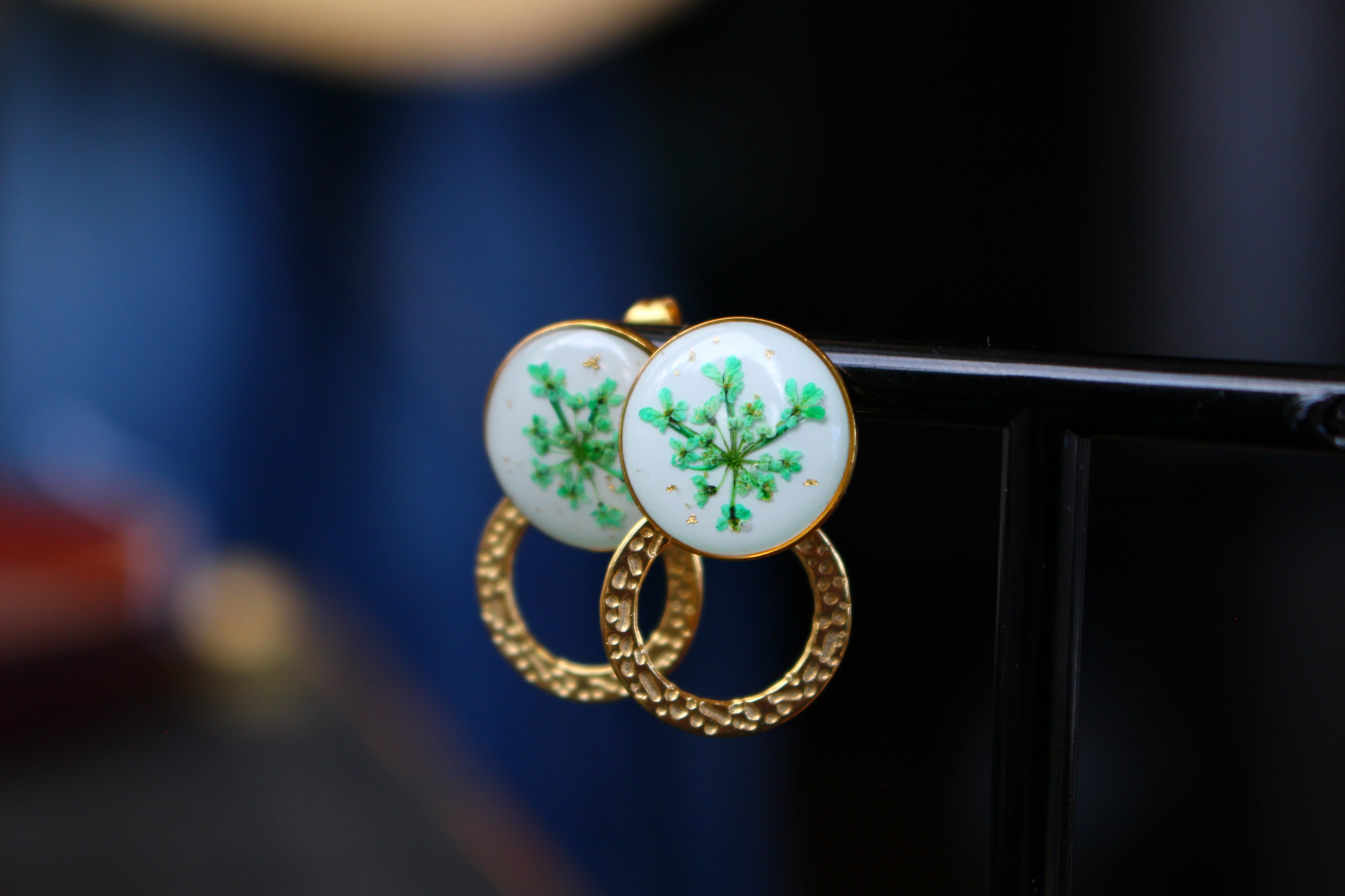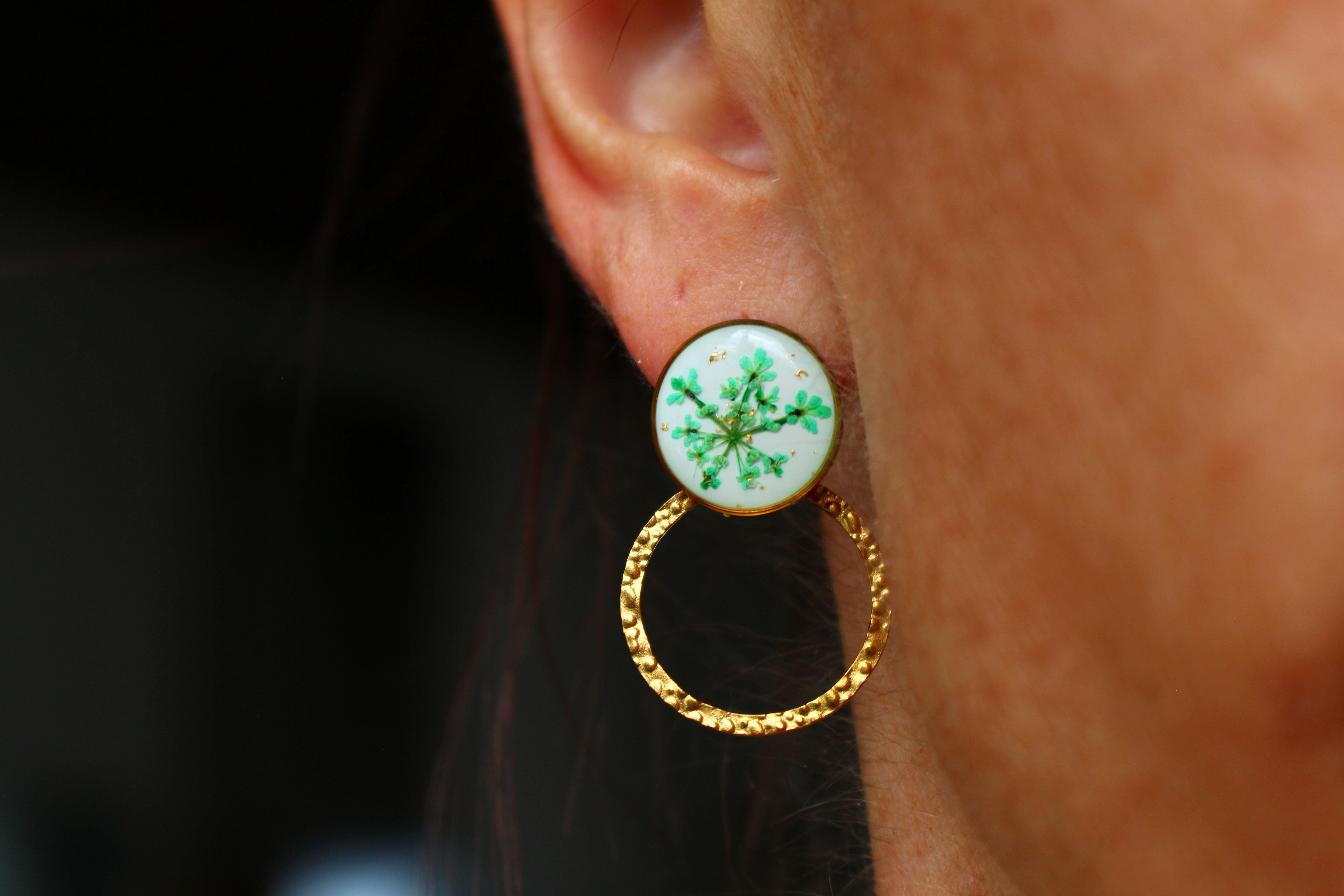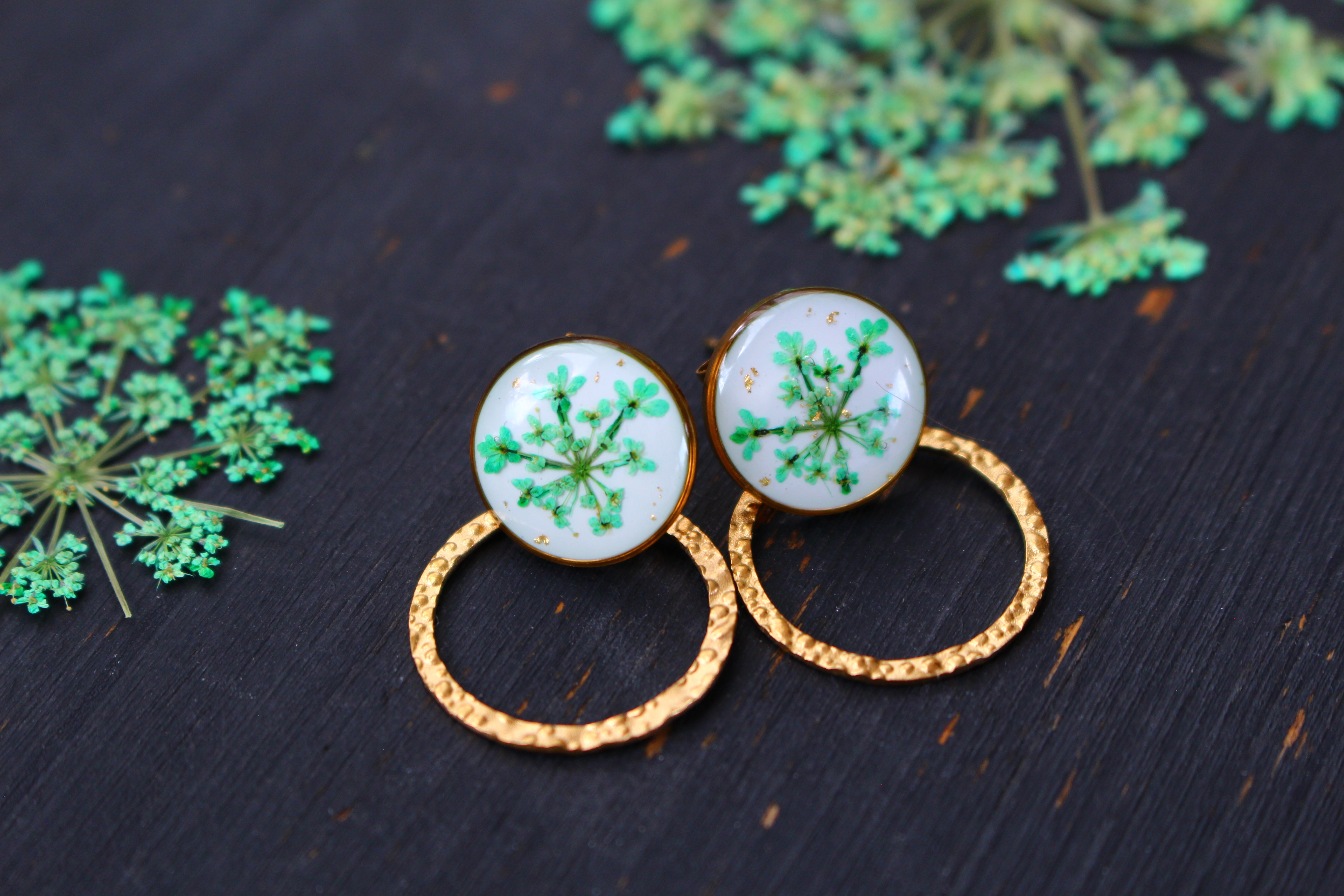 Boucles composées de cabochons de 14mm remplis de résine dans laquelle j'ai incrusté de fleurs de dentelles de le Reine d'Anne et quelques particules de feuilles d'or sur un fond blanc.