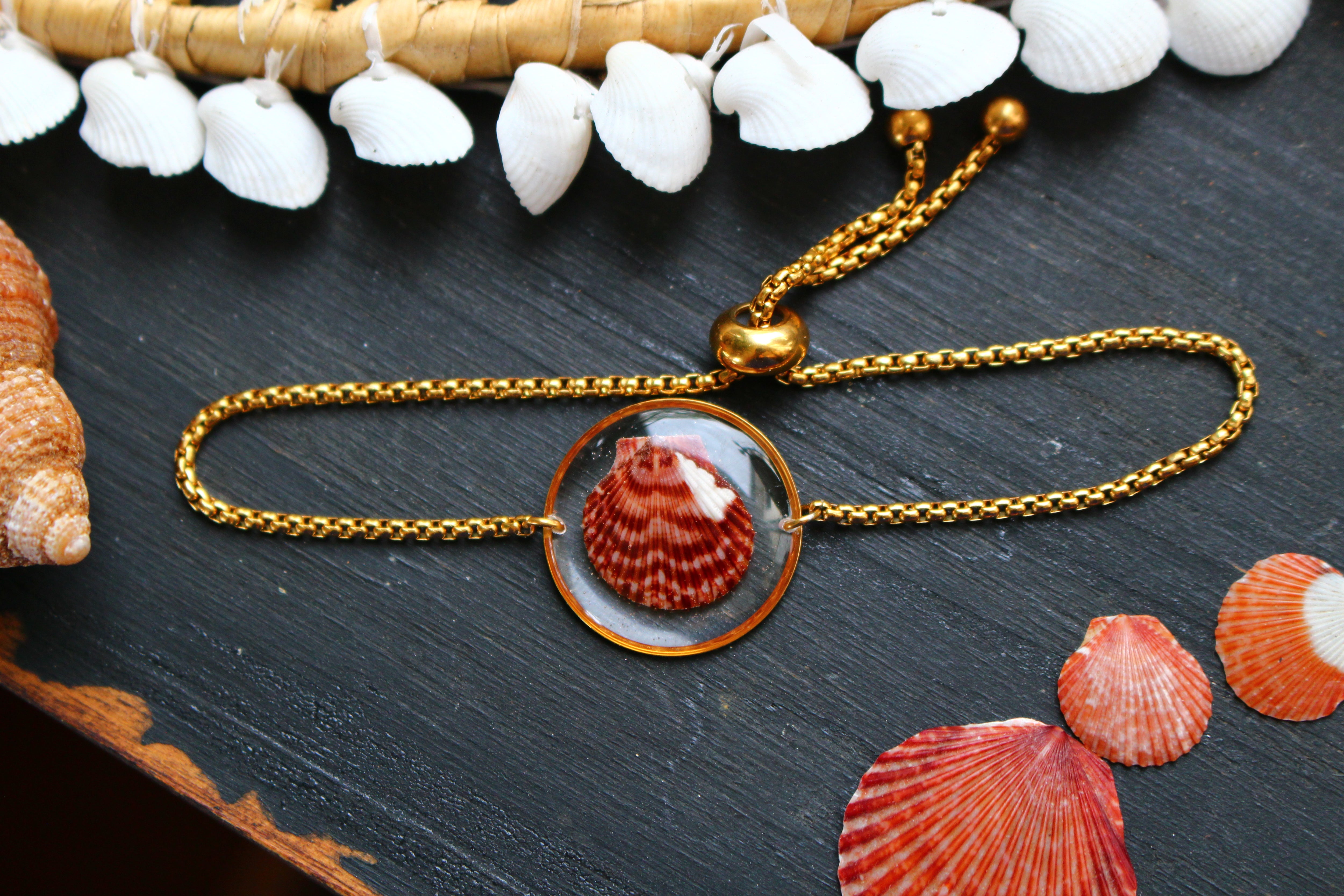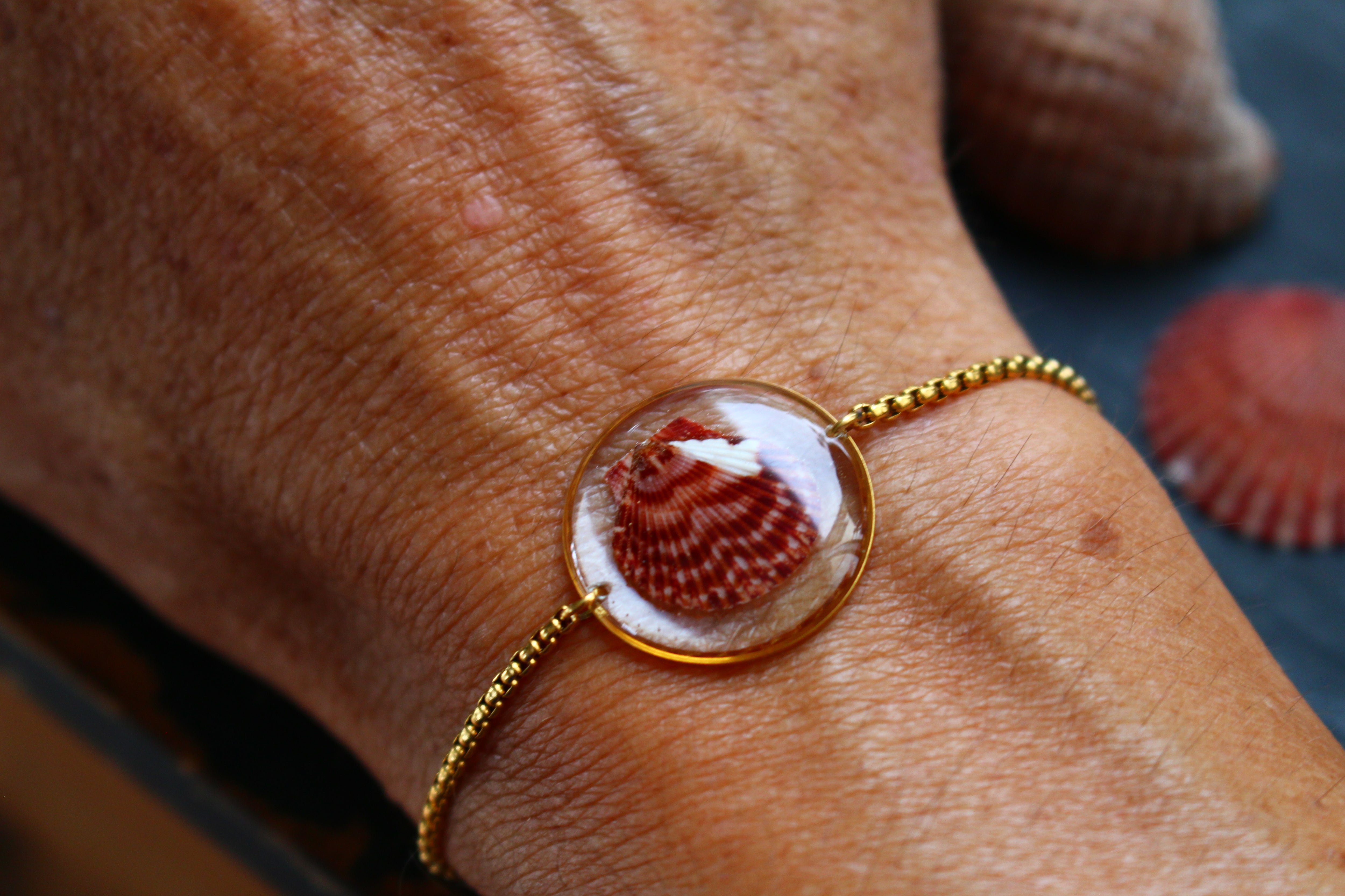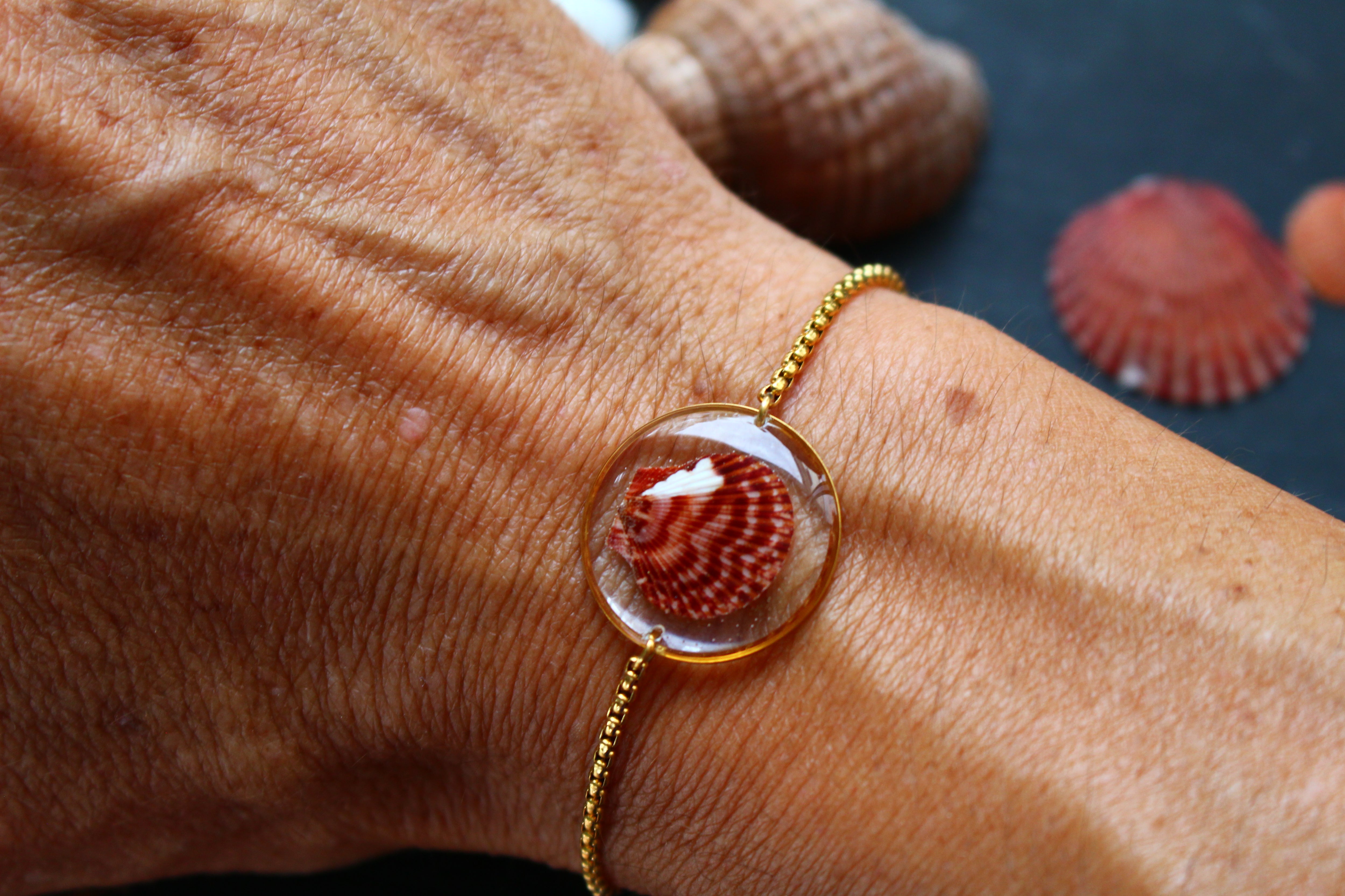 Bracelet composé d'un médaillon de 19mm de diamètre rempli de résine dans laquelle j'ai incrusté un joli coquillage provenant de la plage de Saint Paul sur l'île de la Réunion.