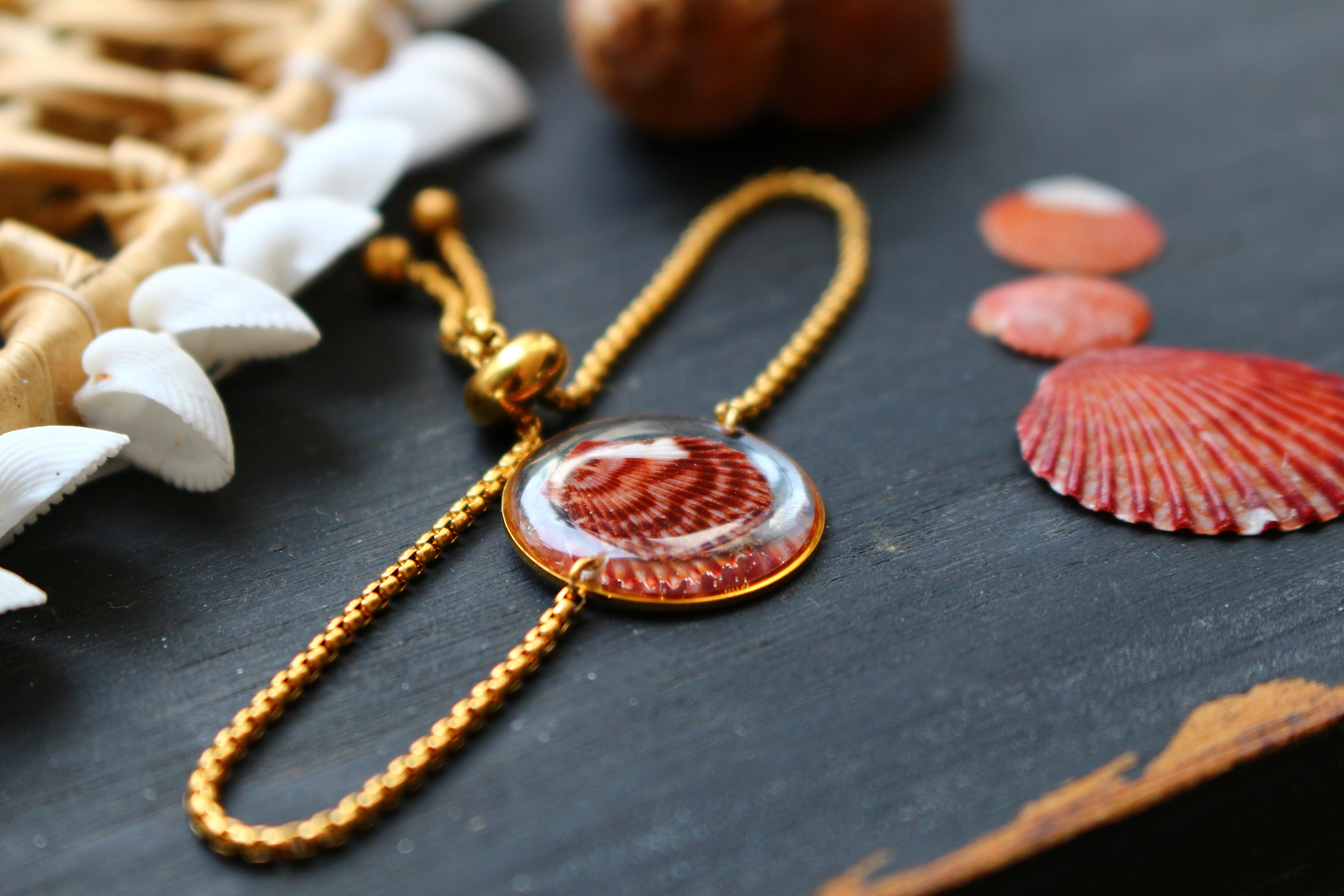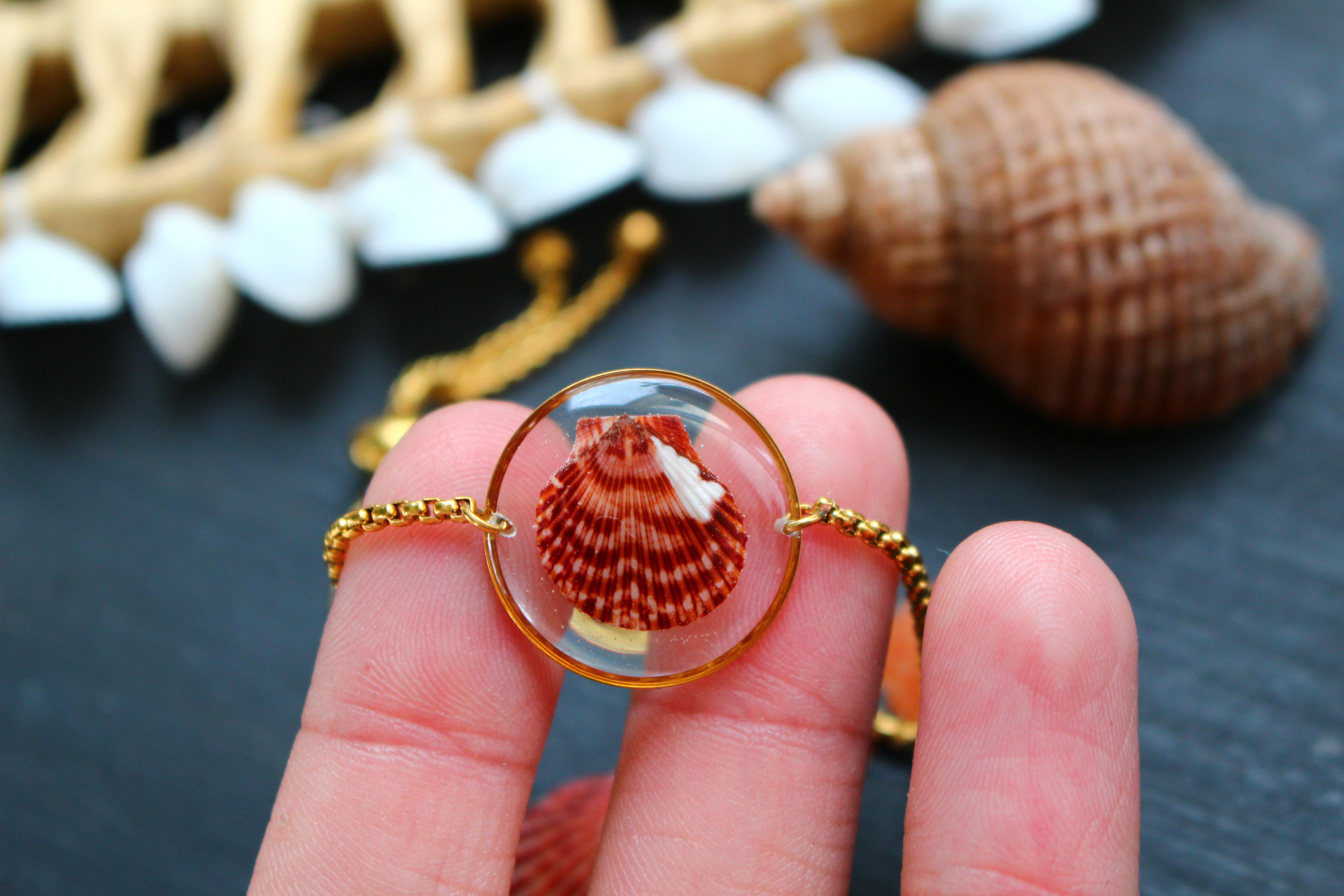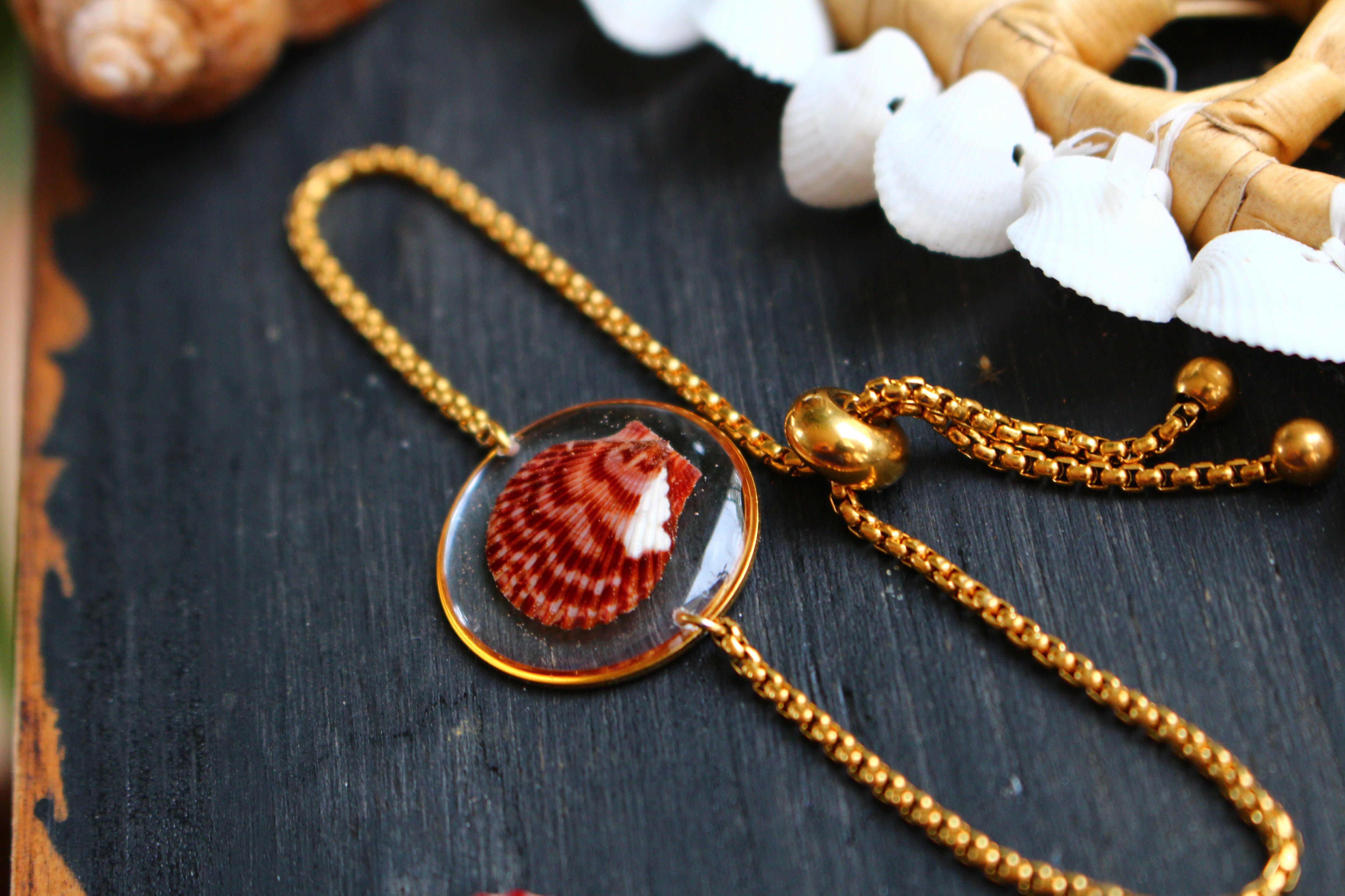 Bracelet composé d'un médaillon de 19mm de diamètre rempli de résine dans laquelle j'ai incrusté un joli coquillage provenant de la plage de Saint Paul sur l'île de la Réunion.