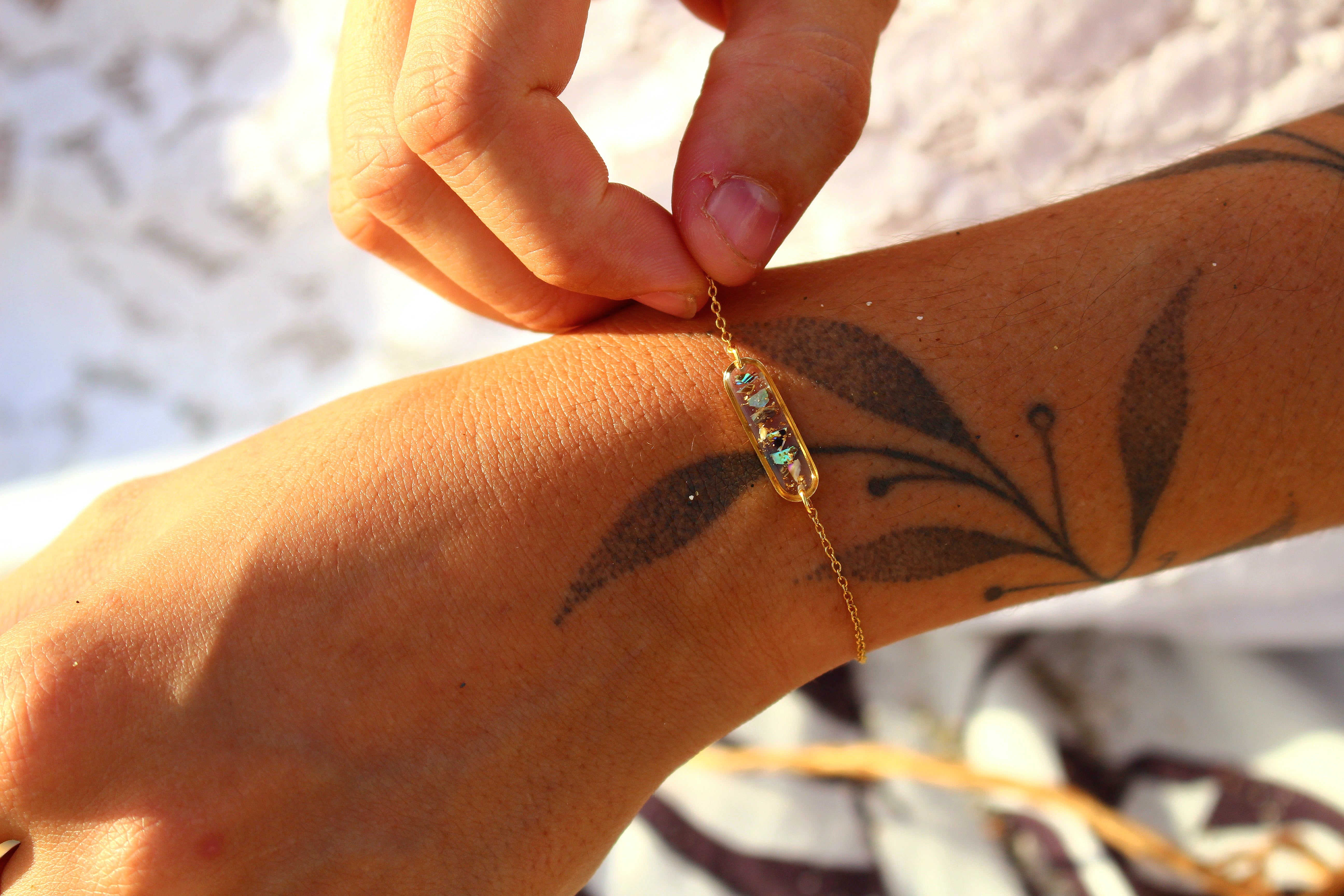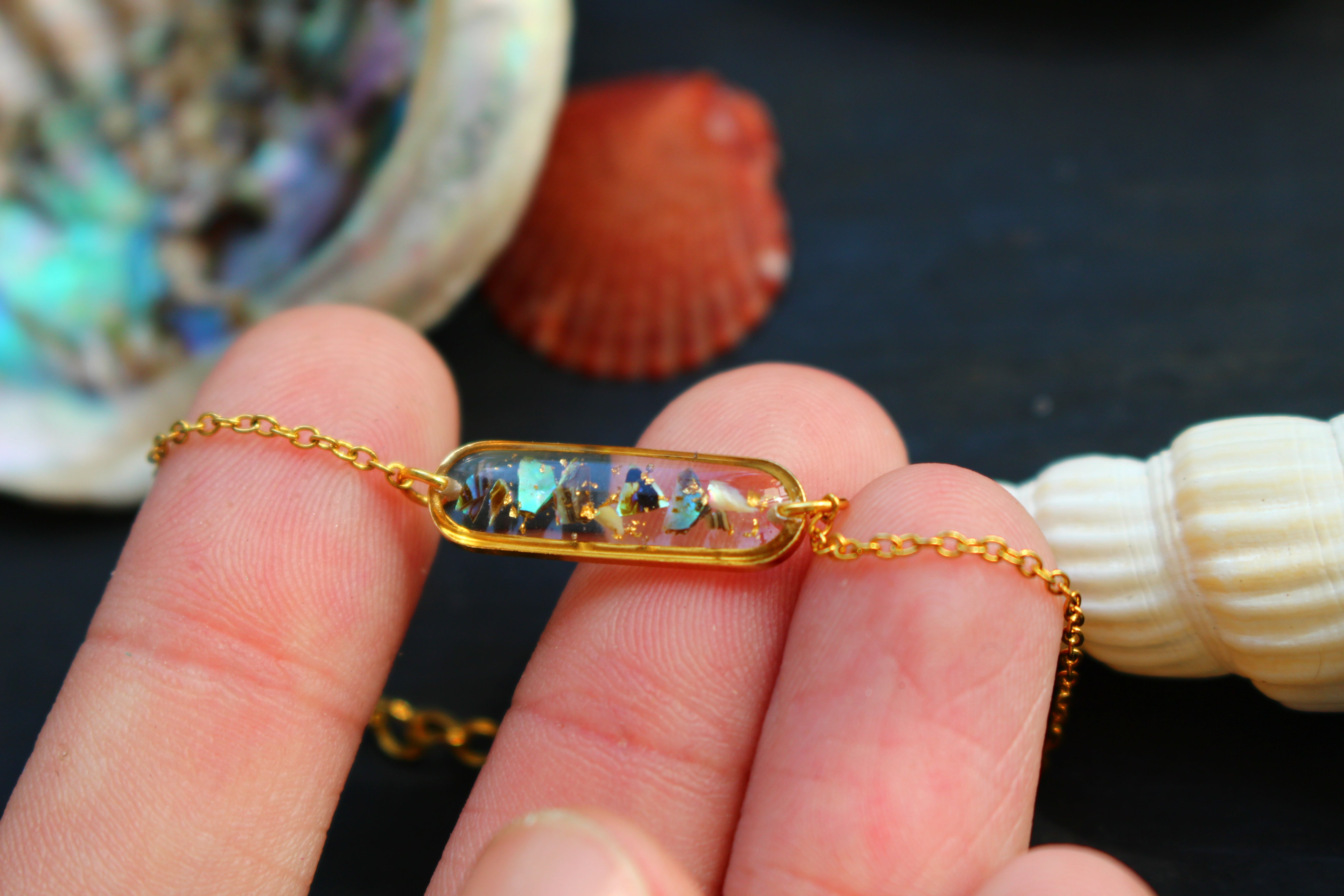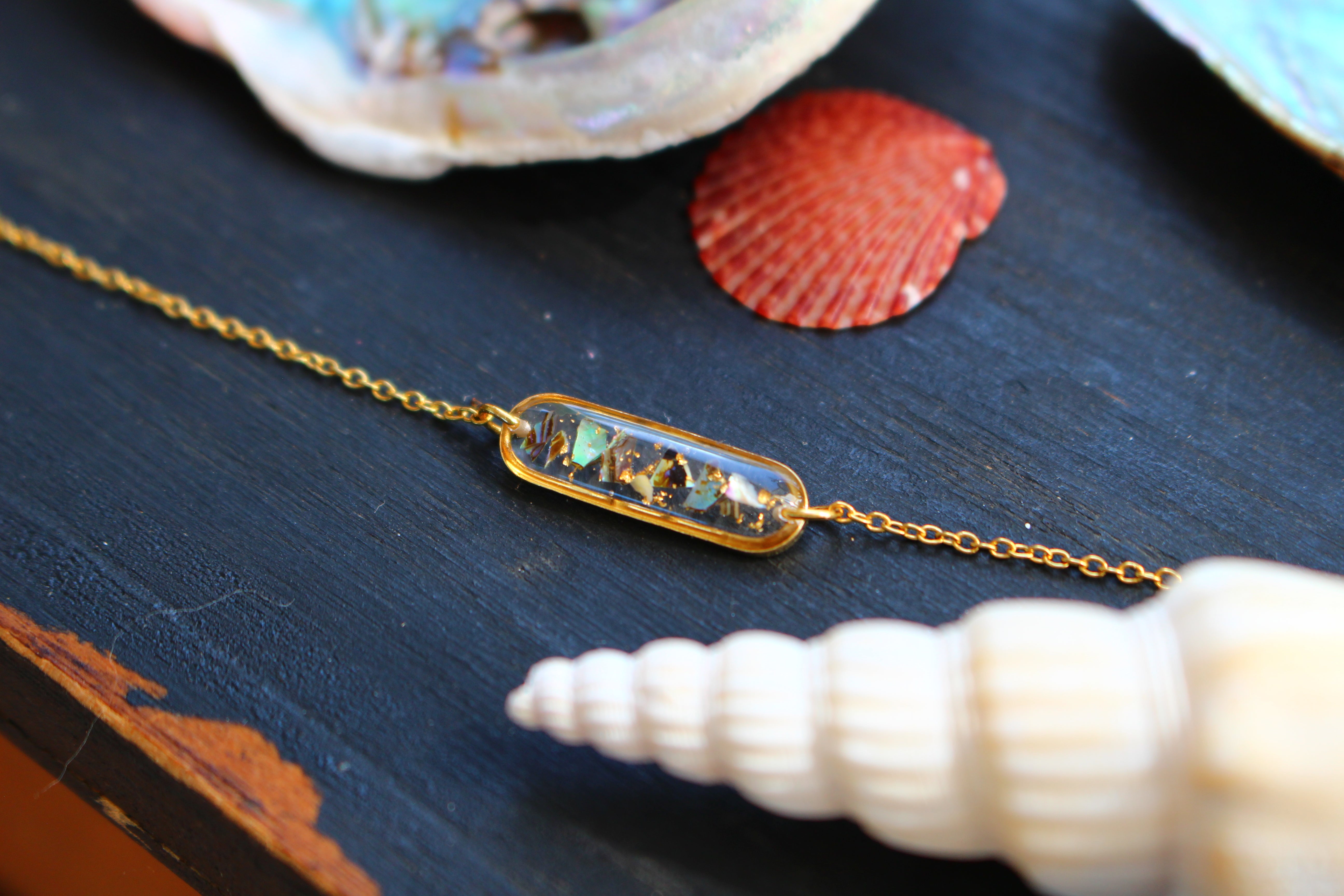 Bracelet composé d'un médaillon allongé rempli de résine dans laquelle j'ai incrusté des morceaux de nacre "abalone" et quelques morceaux de feuilles d'or.