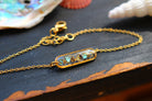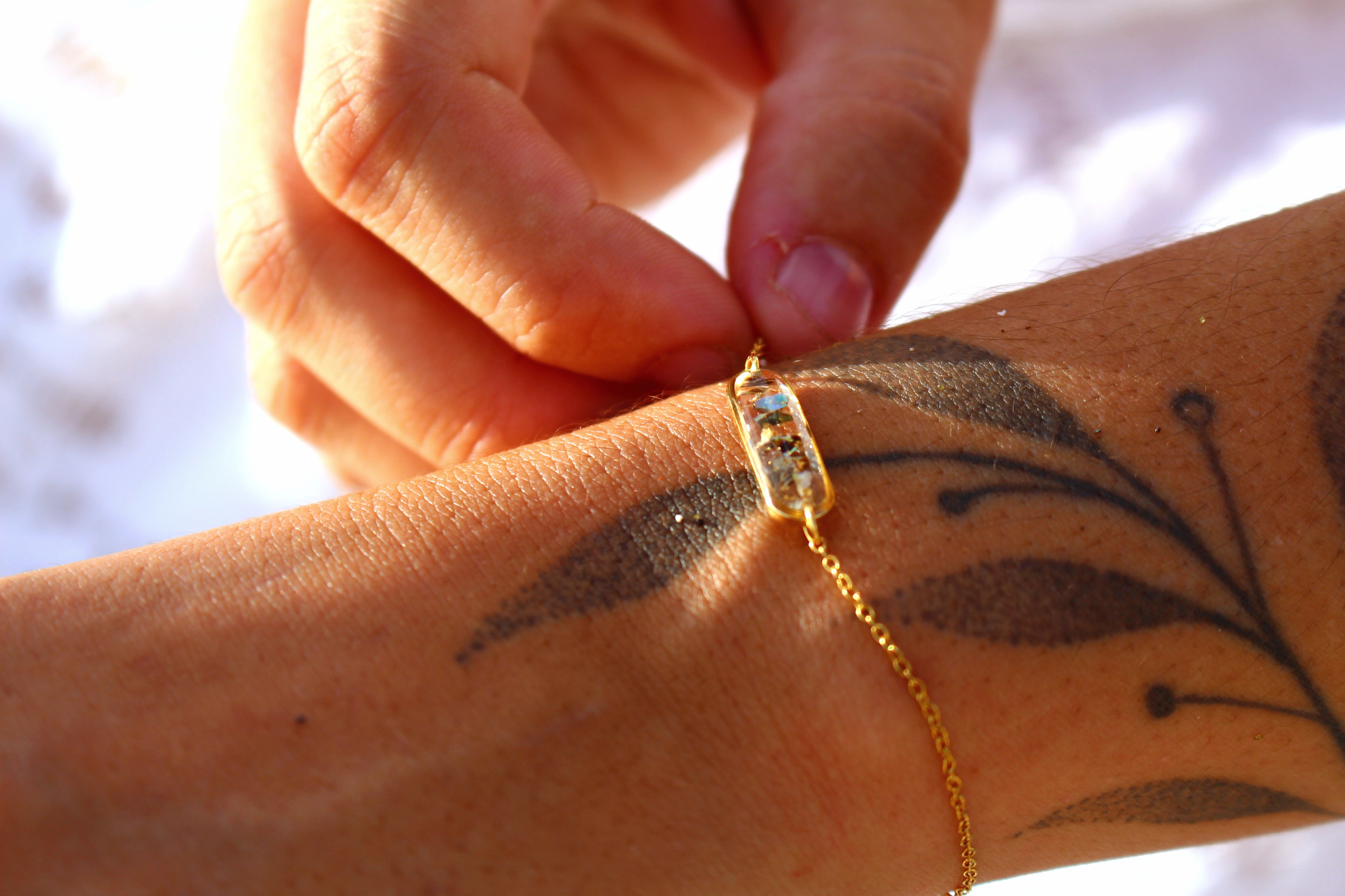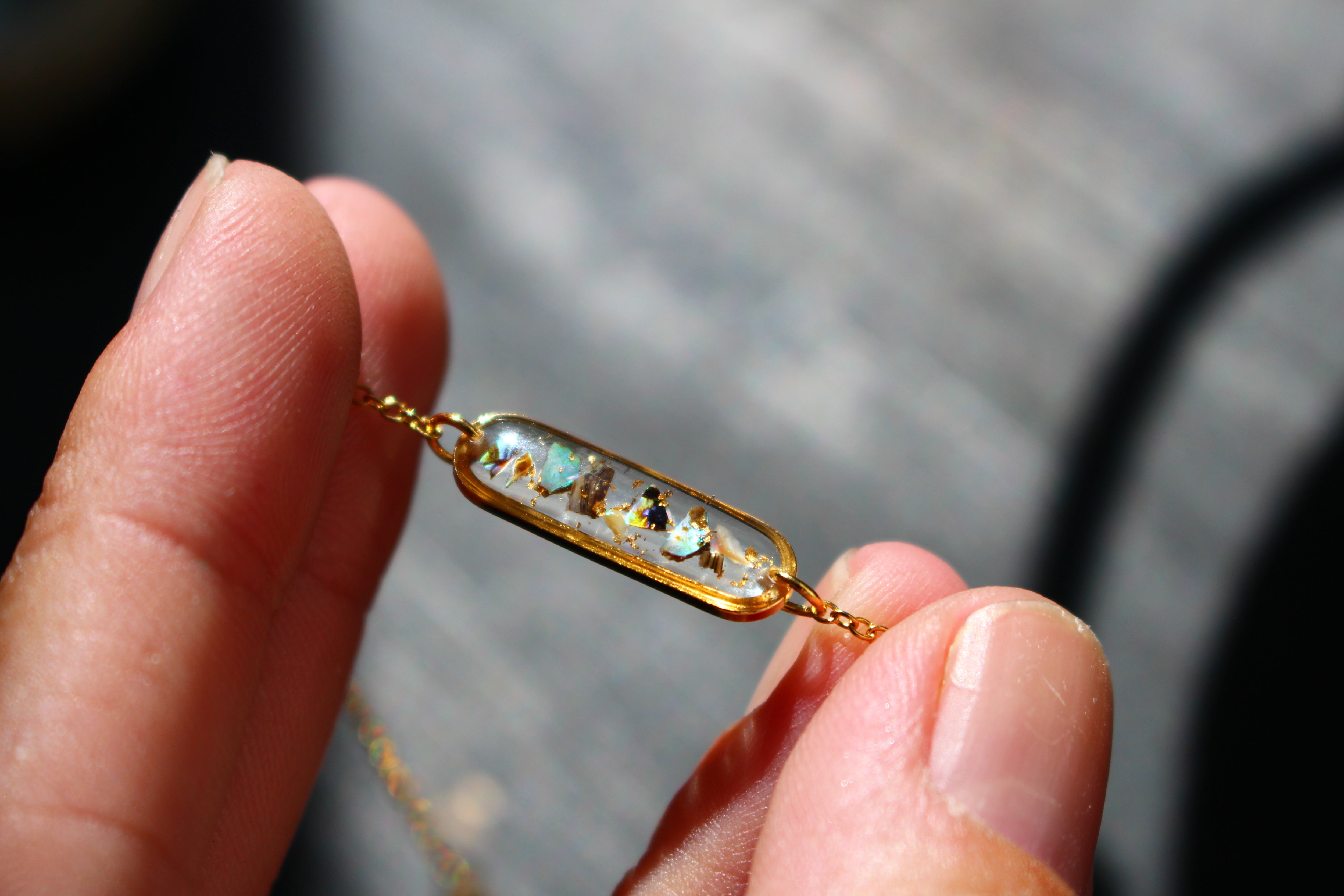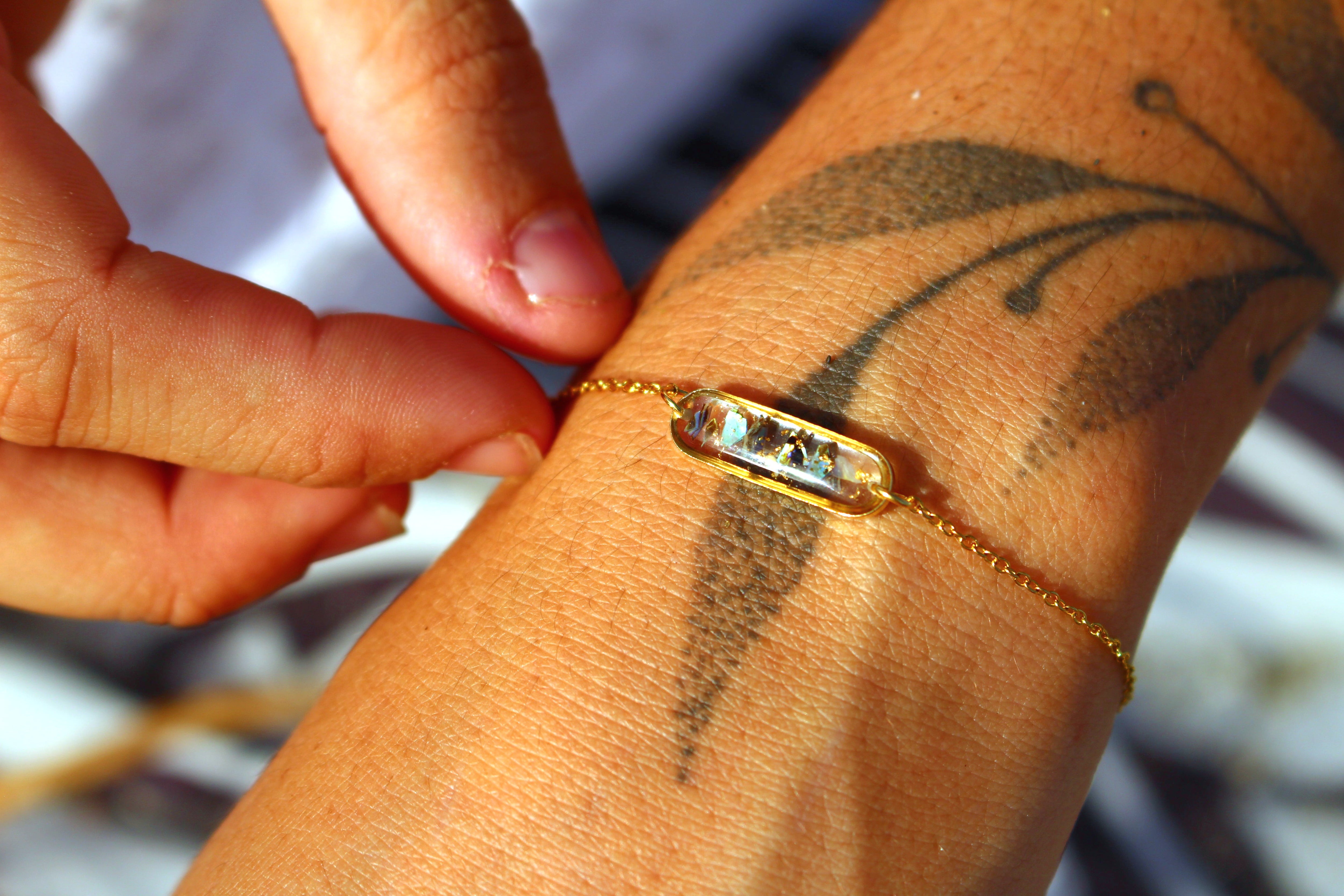 Bracelet composé d'un médaillon allongé rempli de résine dans laquelle j'ai incrusté des morceaux de nacre "abalone" et quelques morceaux de feuilles d'or.