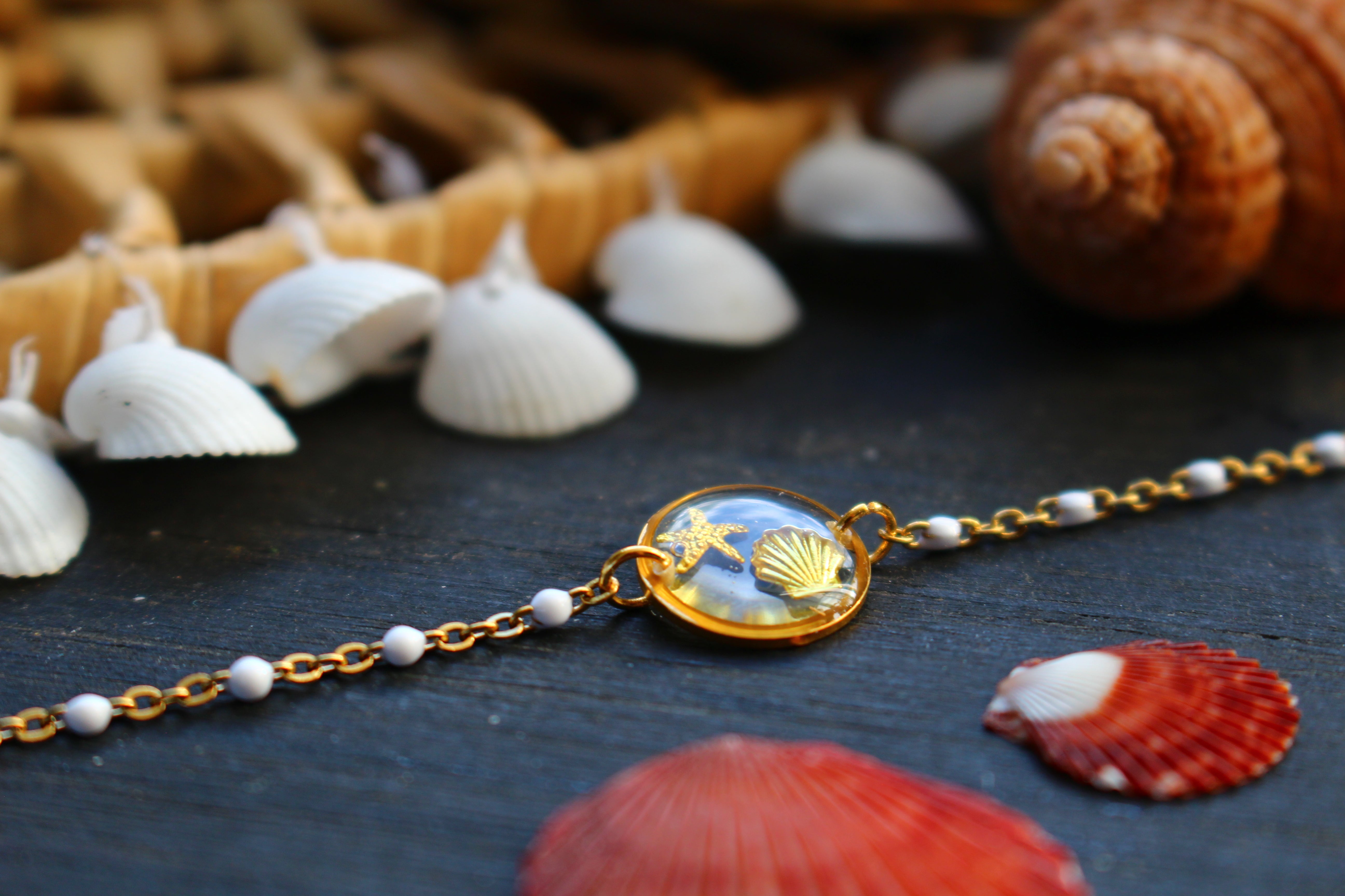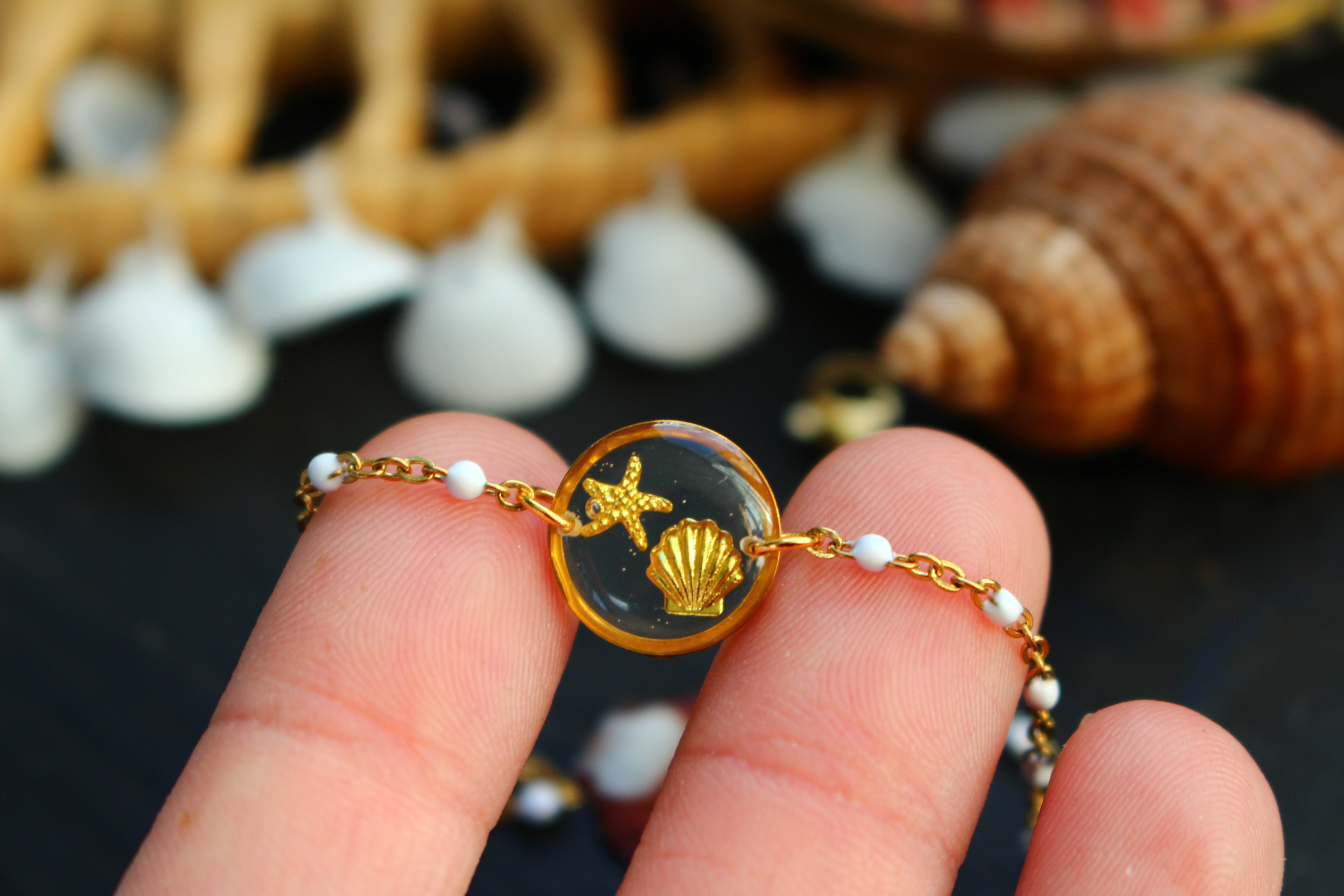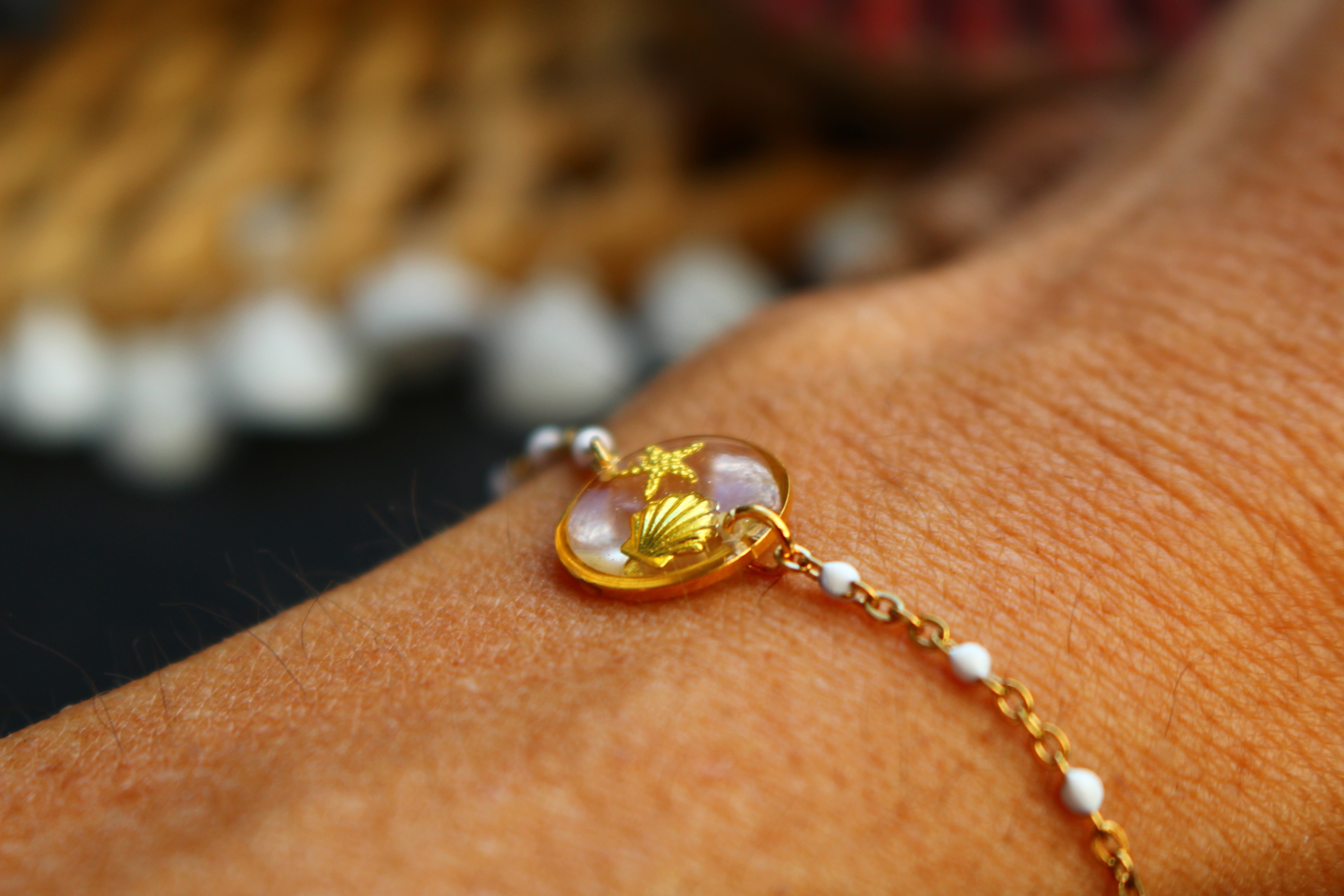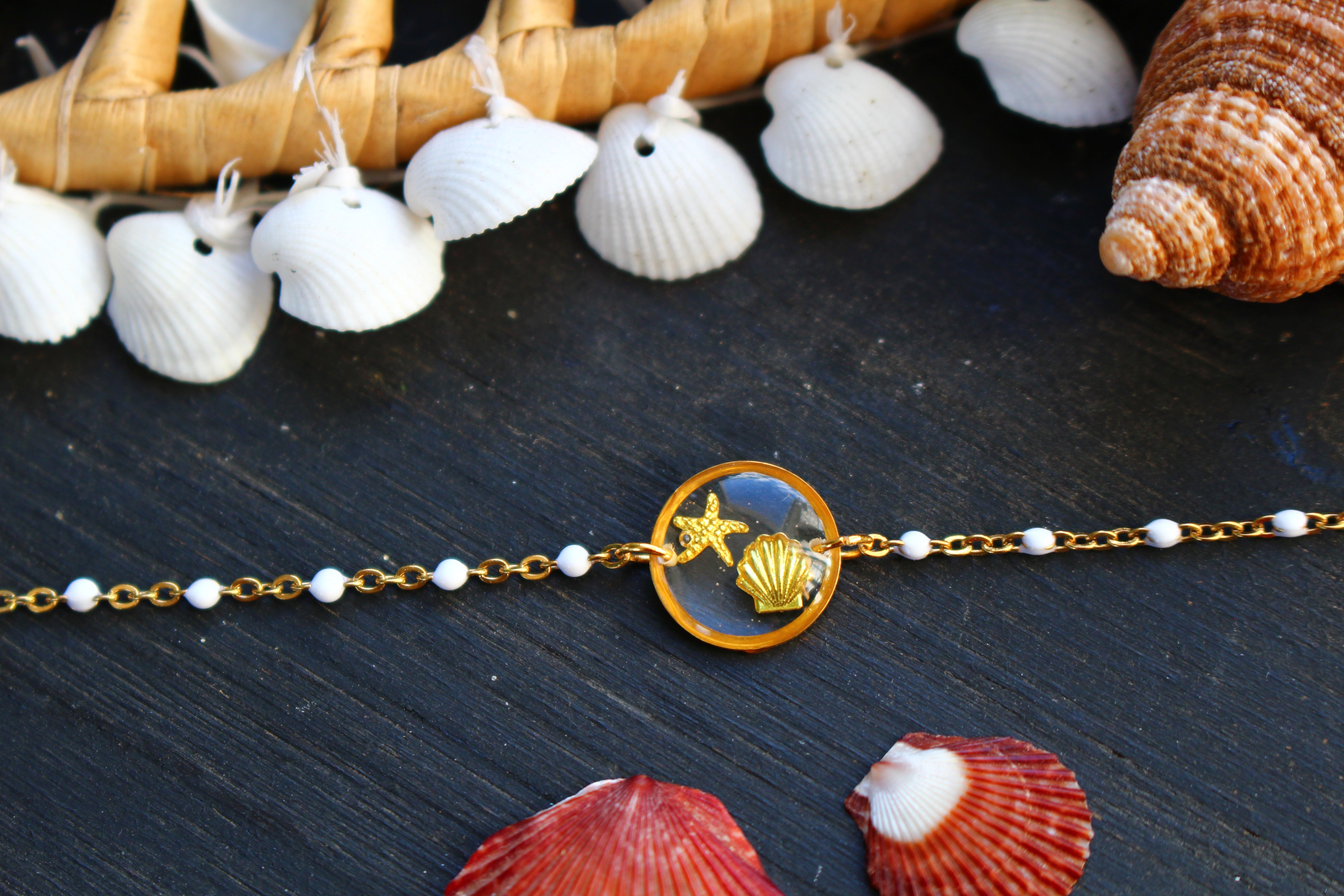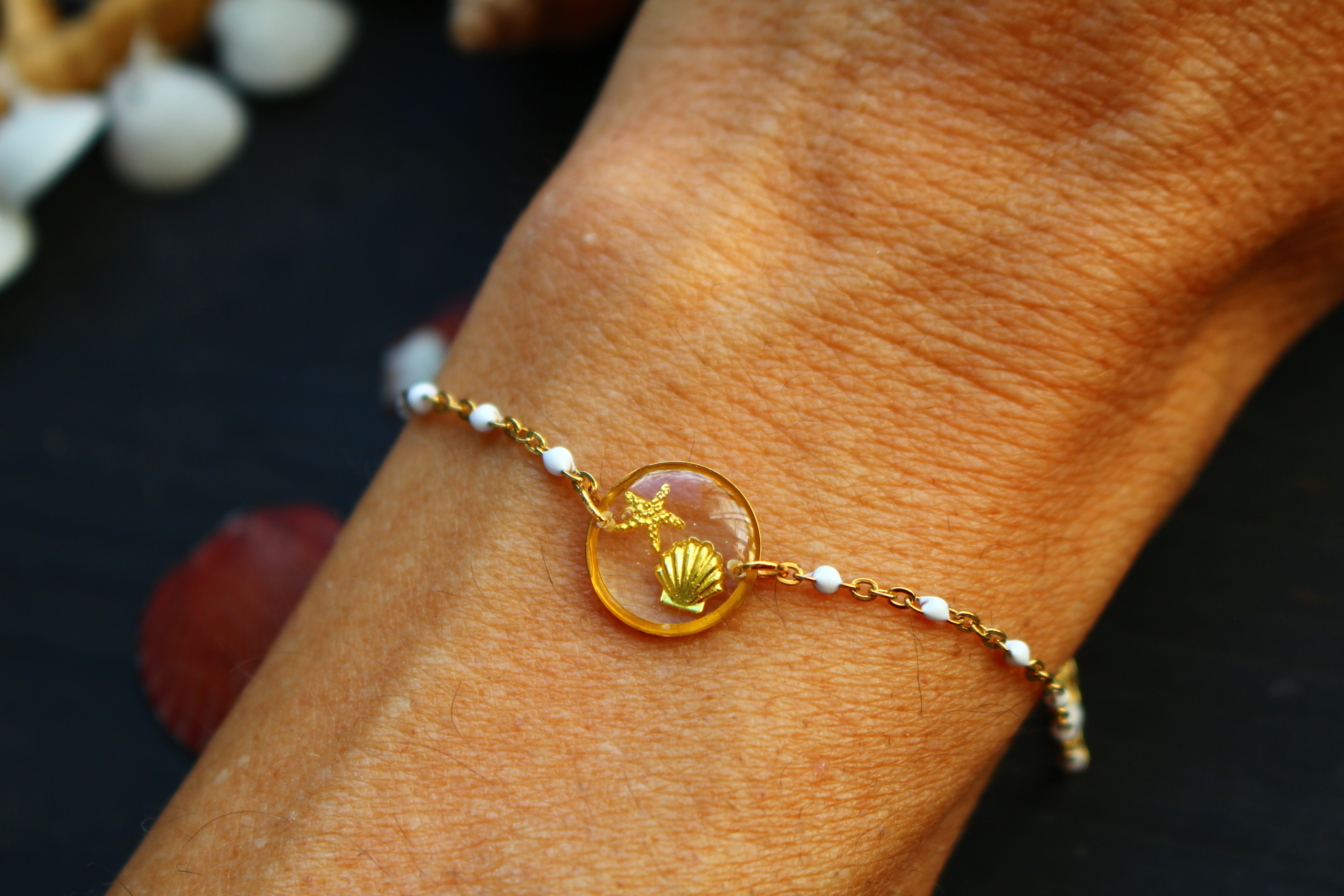 Bracelet composé d'un médaillon de 12mm de diamètre rempli de résine dans laquelle j'ai incrusté un coquillage et une étoile de mer dorés. Monté sur une chaine à petites perles blanches émaillées pour apporter une touche d'élégance.