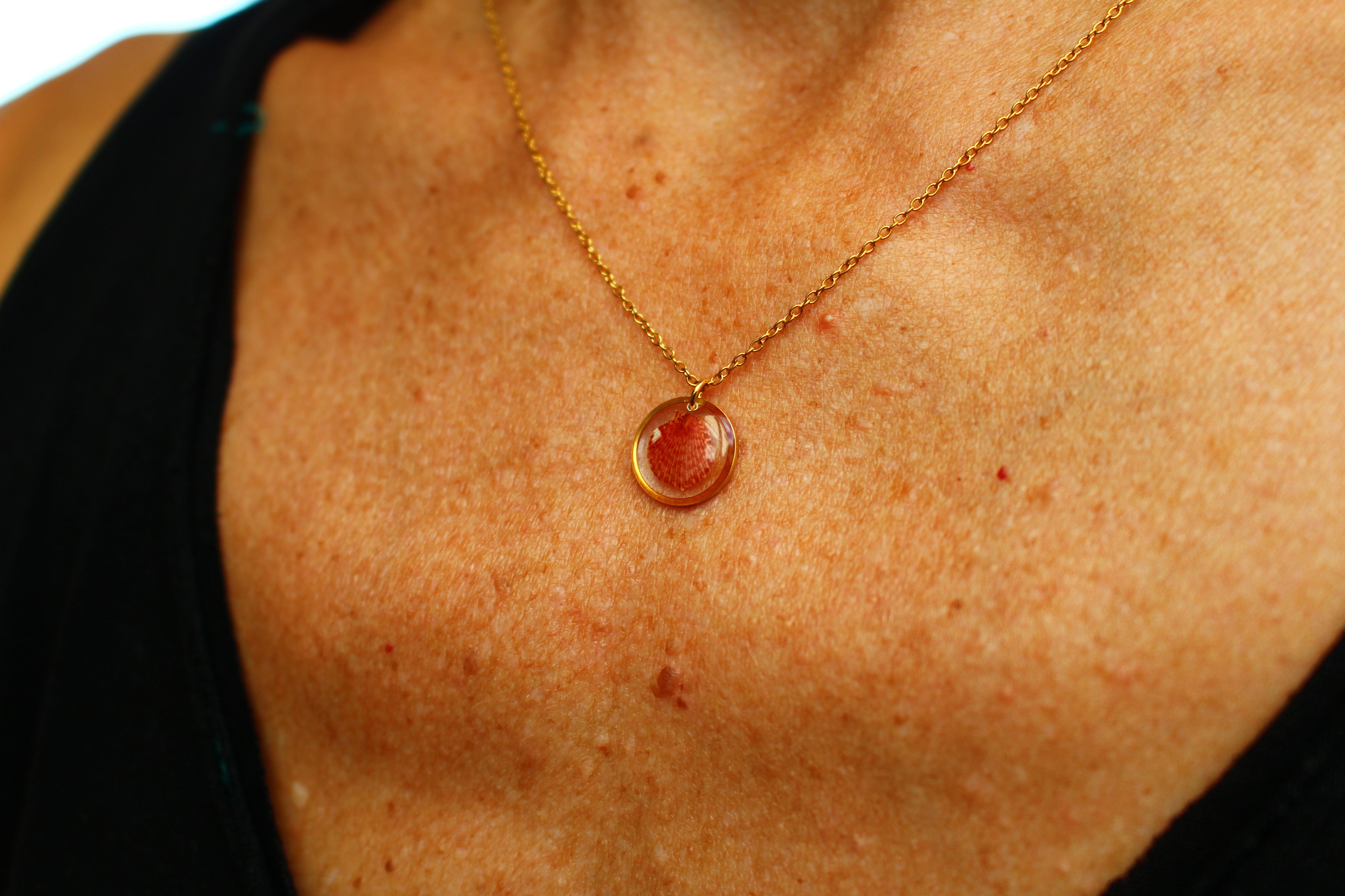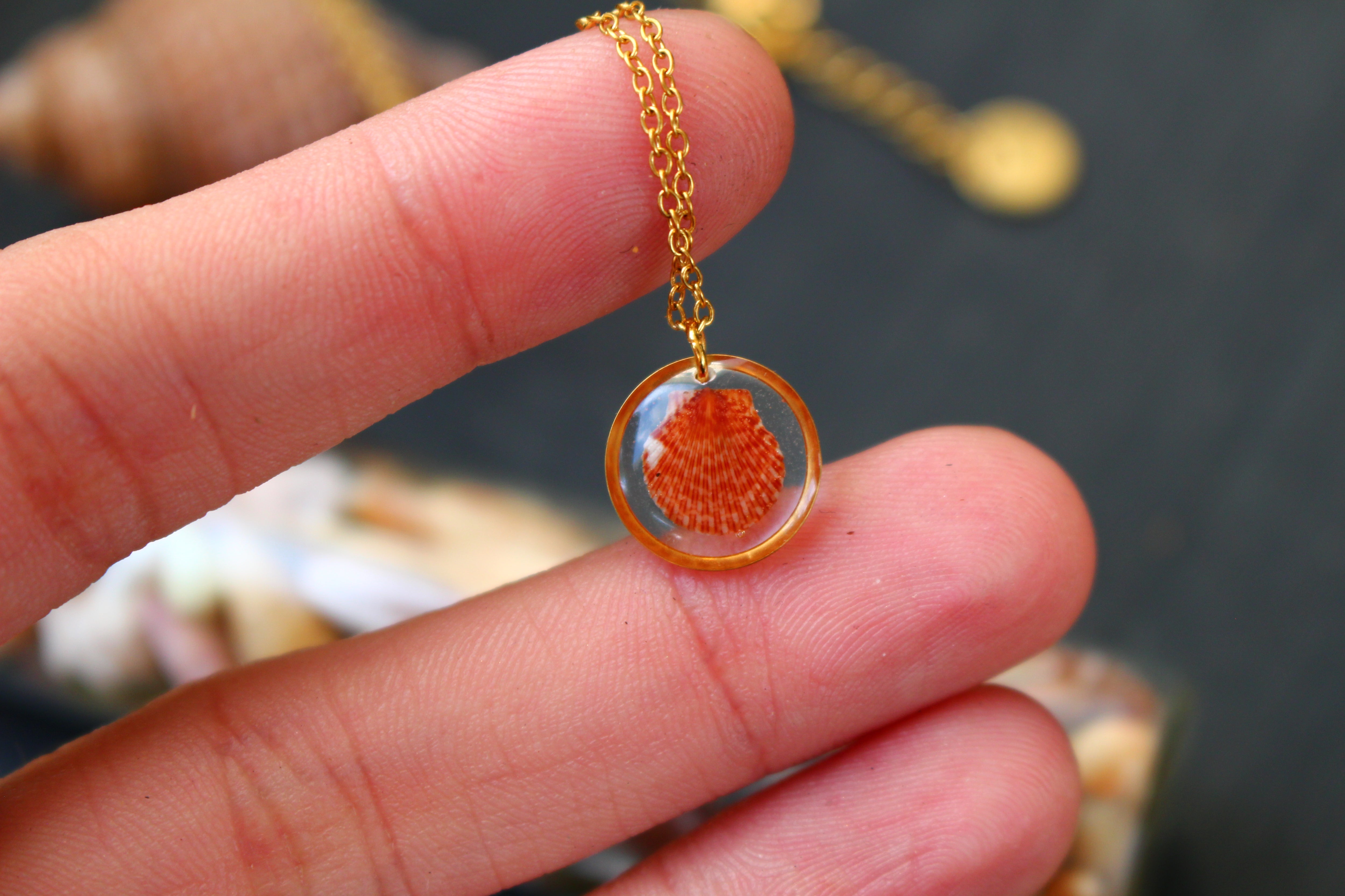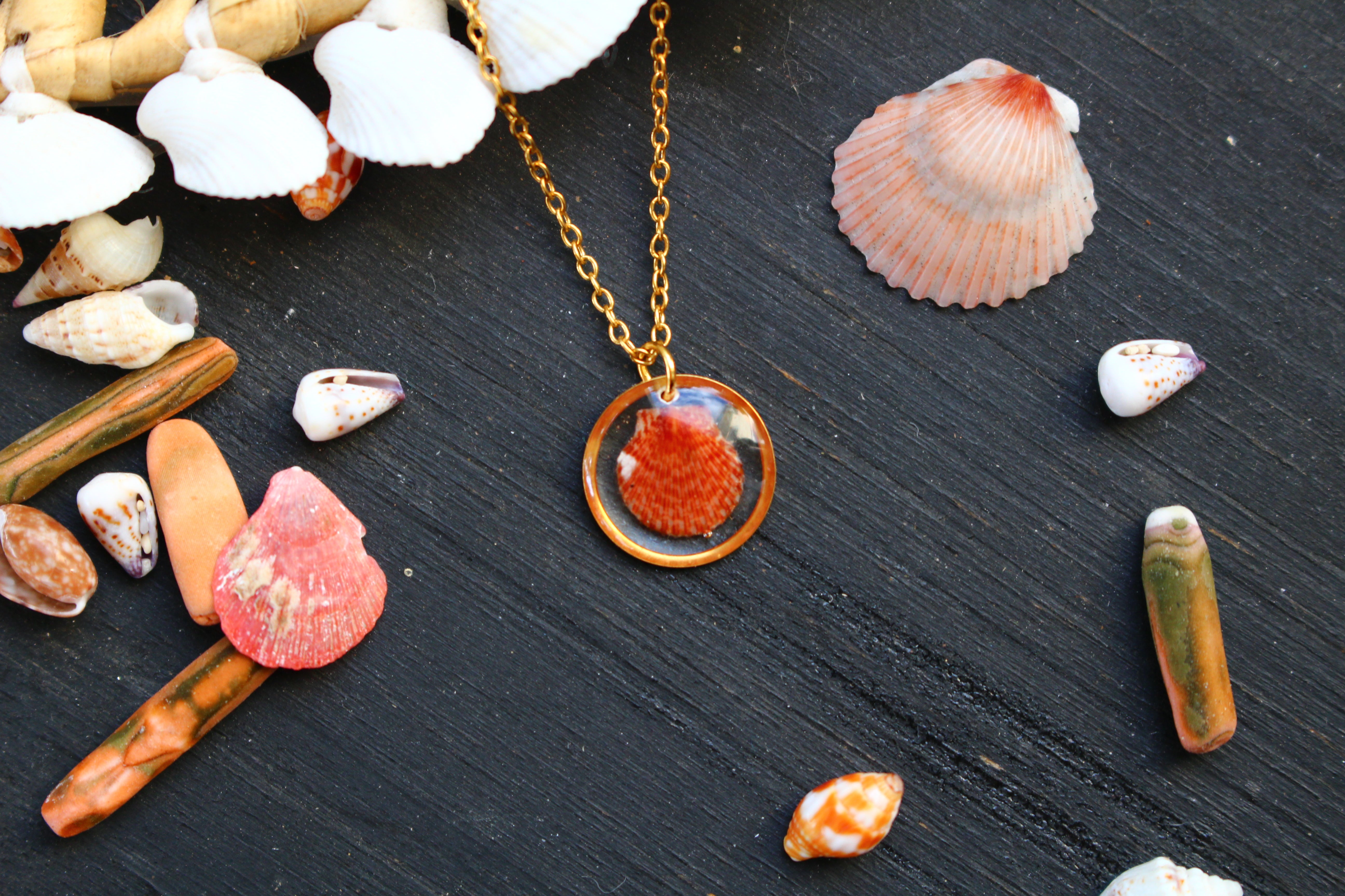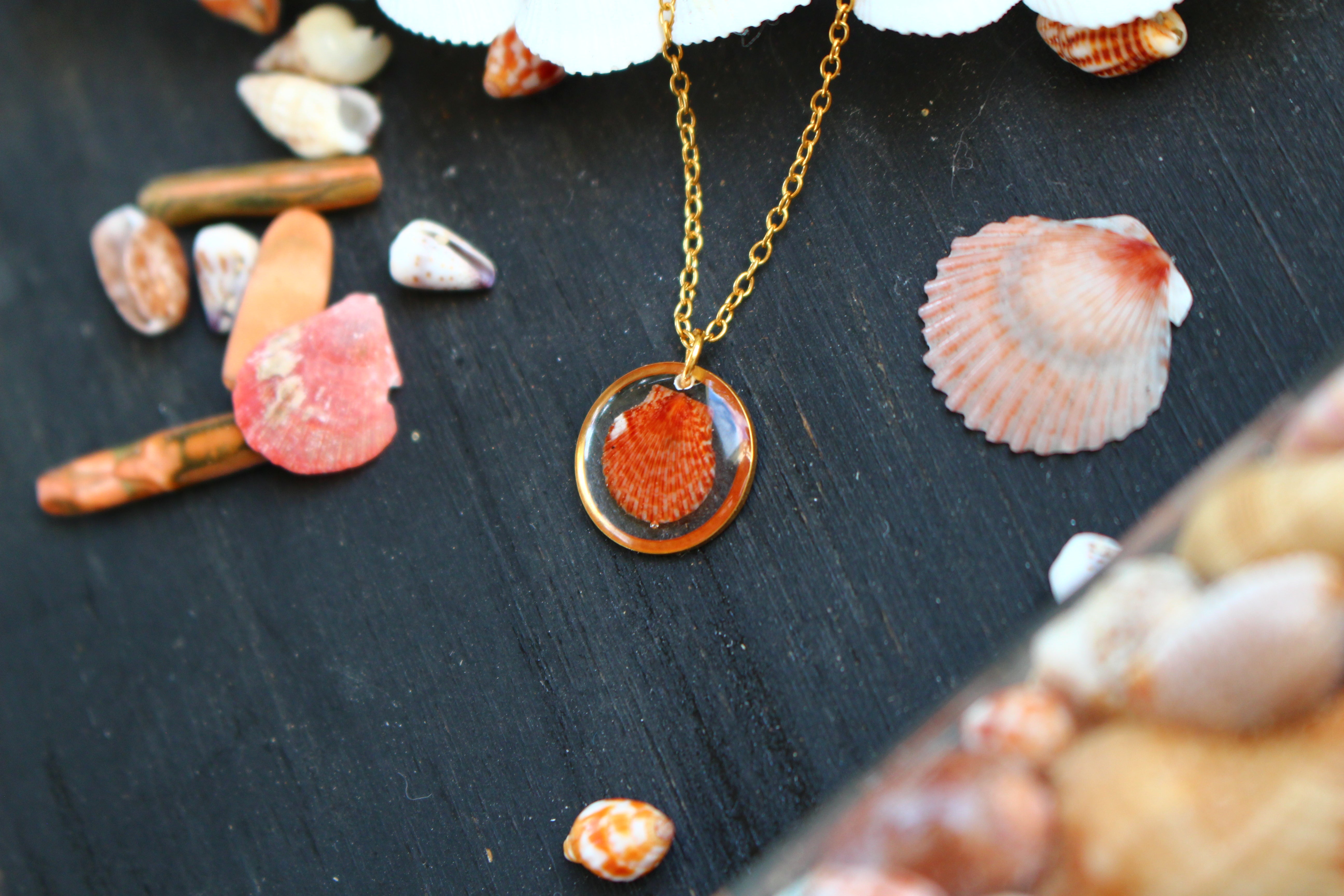 Collier composé d'un médaillon de 12mm de diamètre rempli de résine dans laquelle j'ai incrusté un joli coquillage, provenant de l'Île de la Réunion