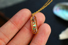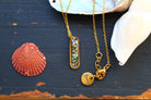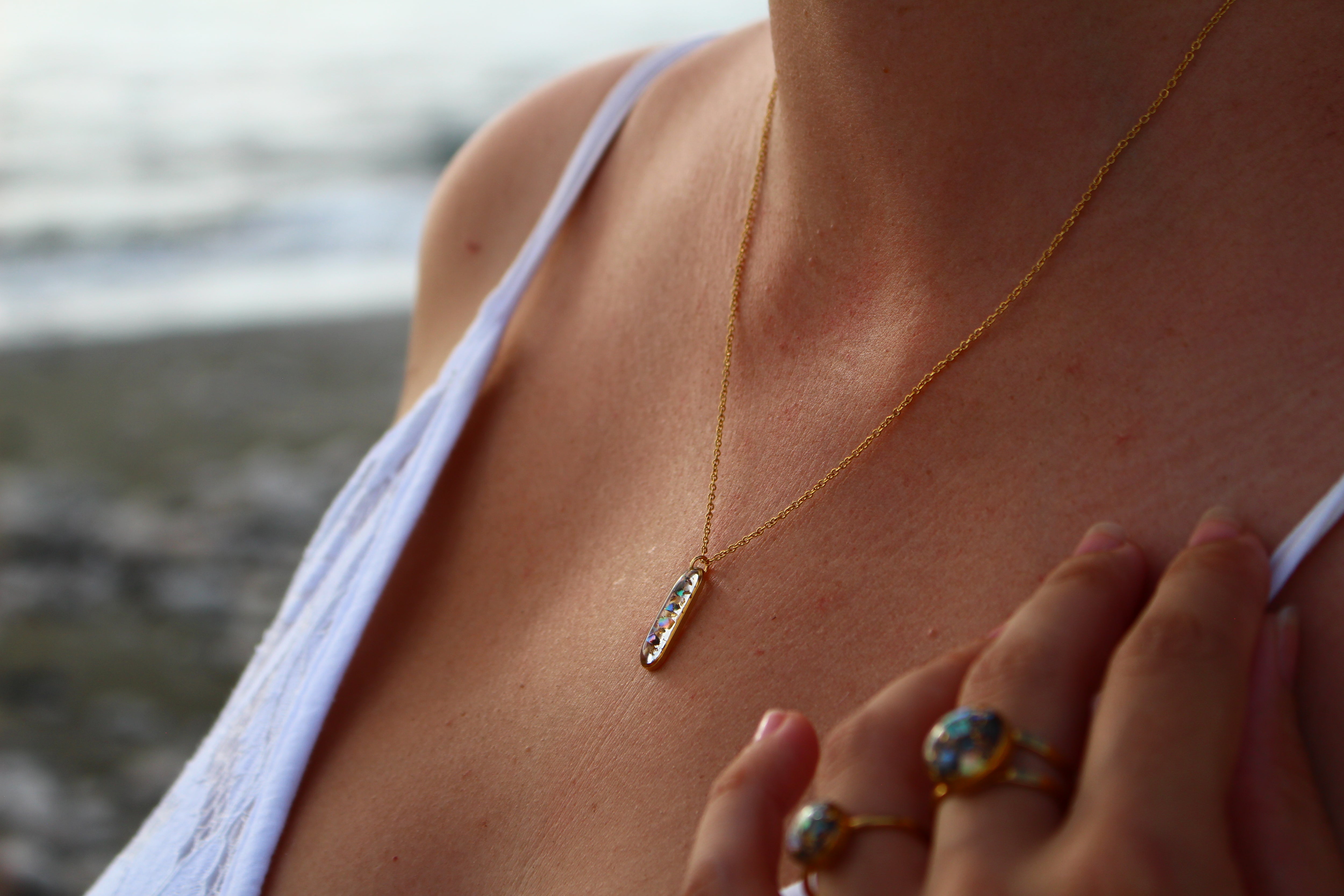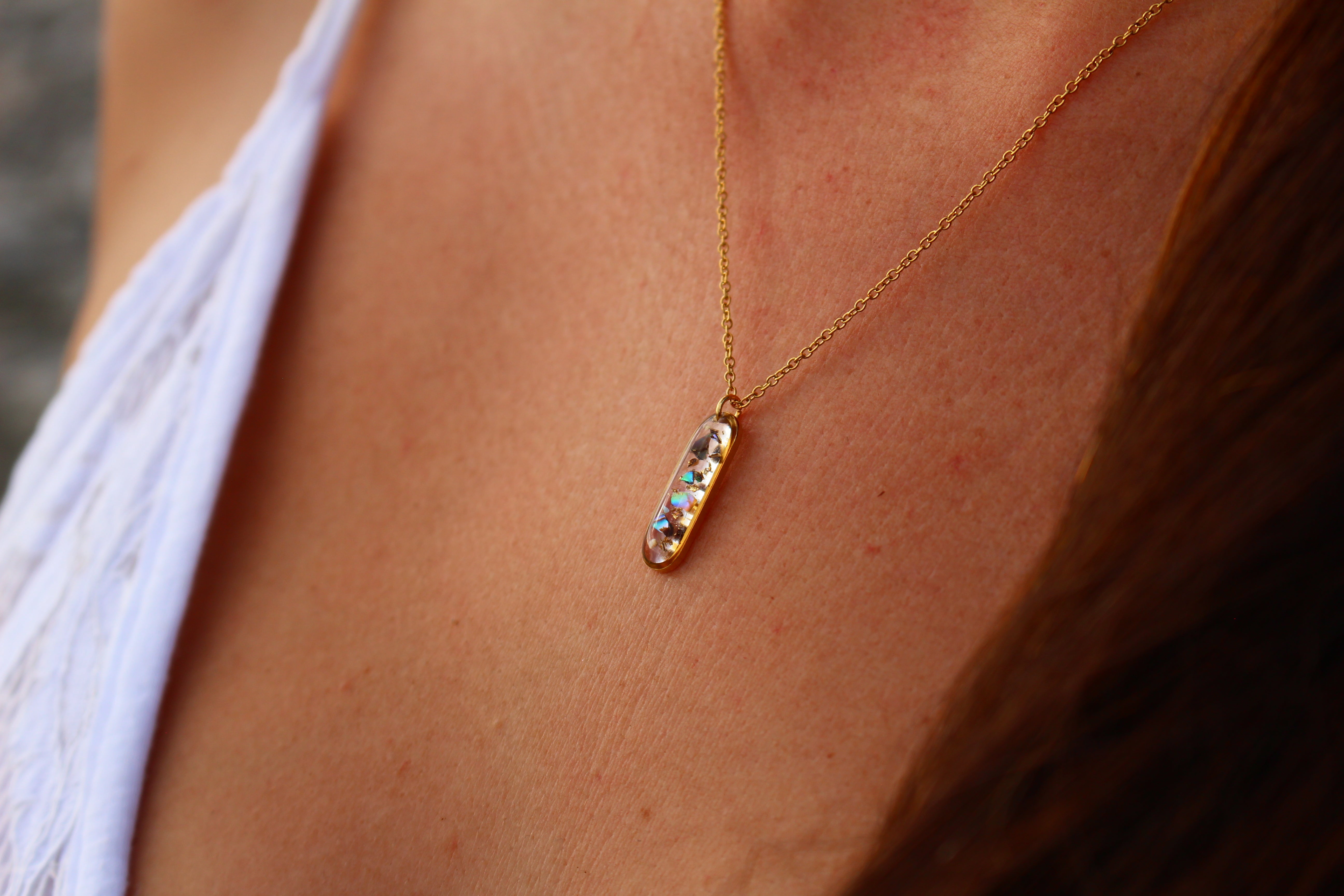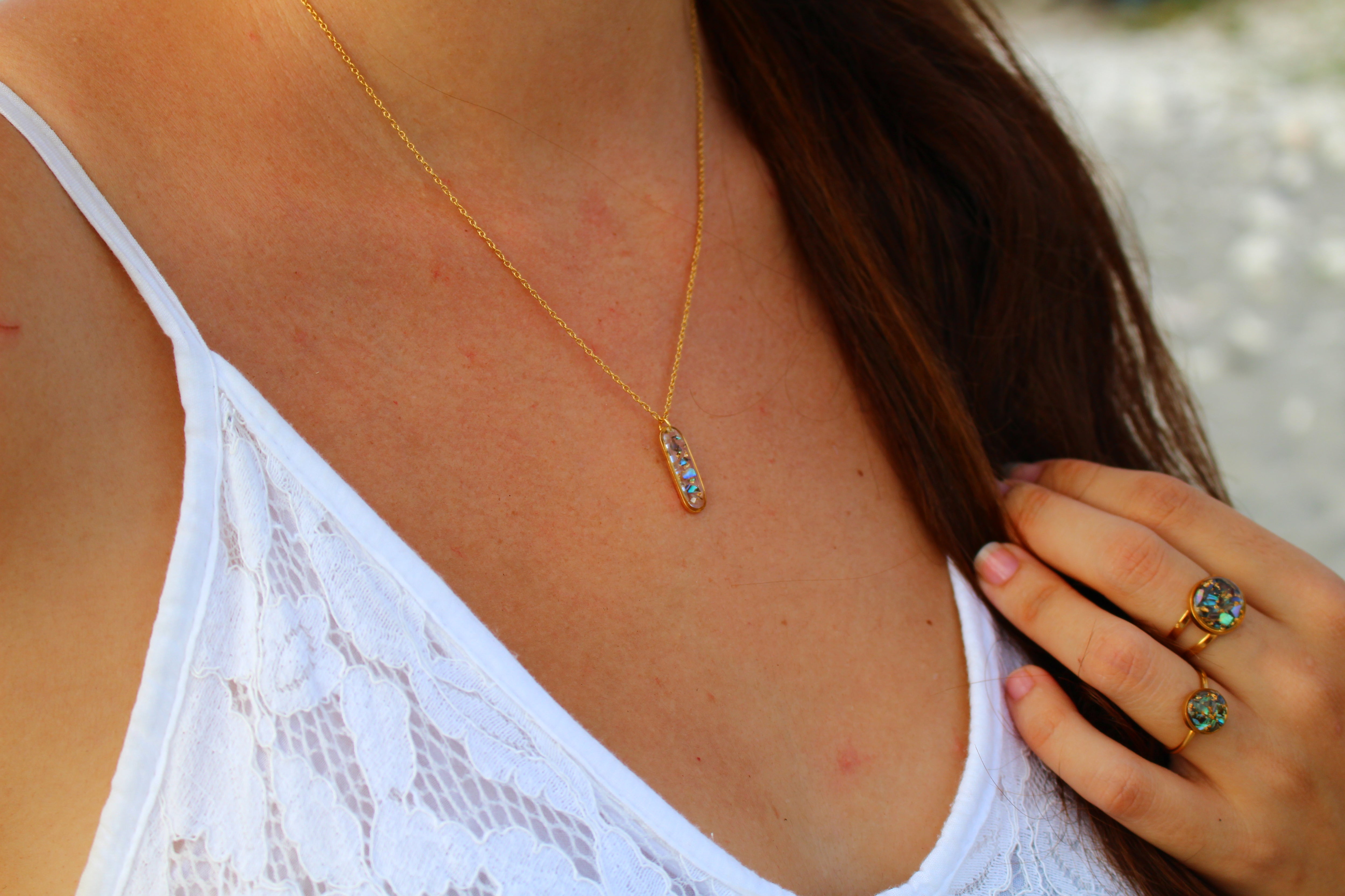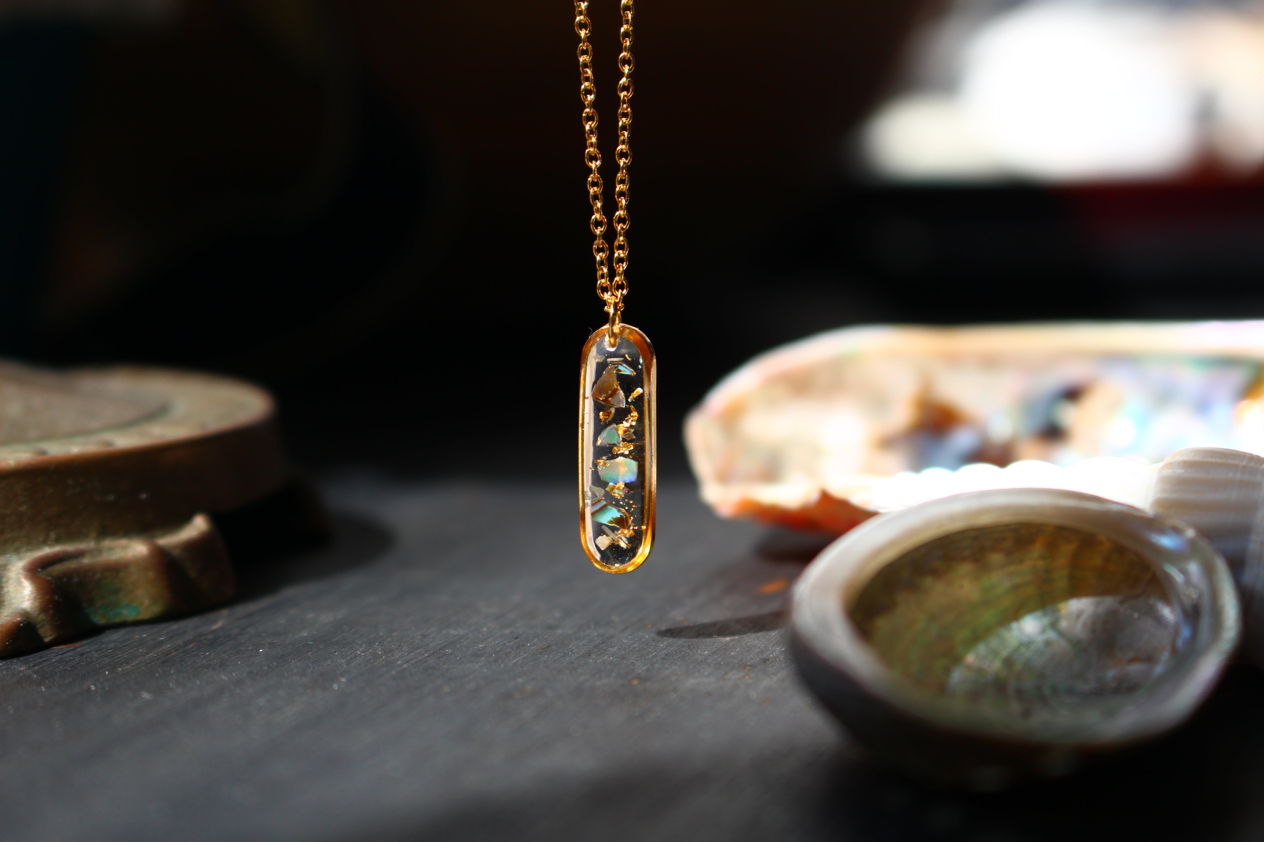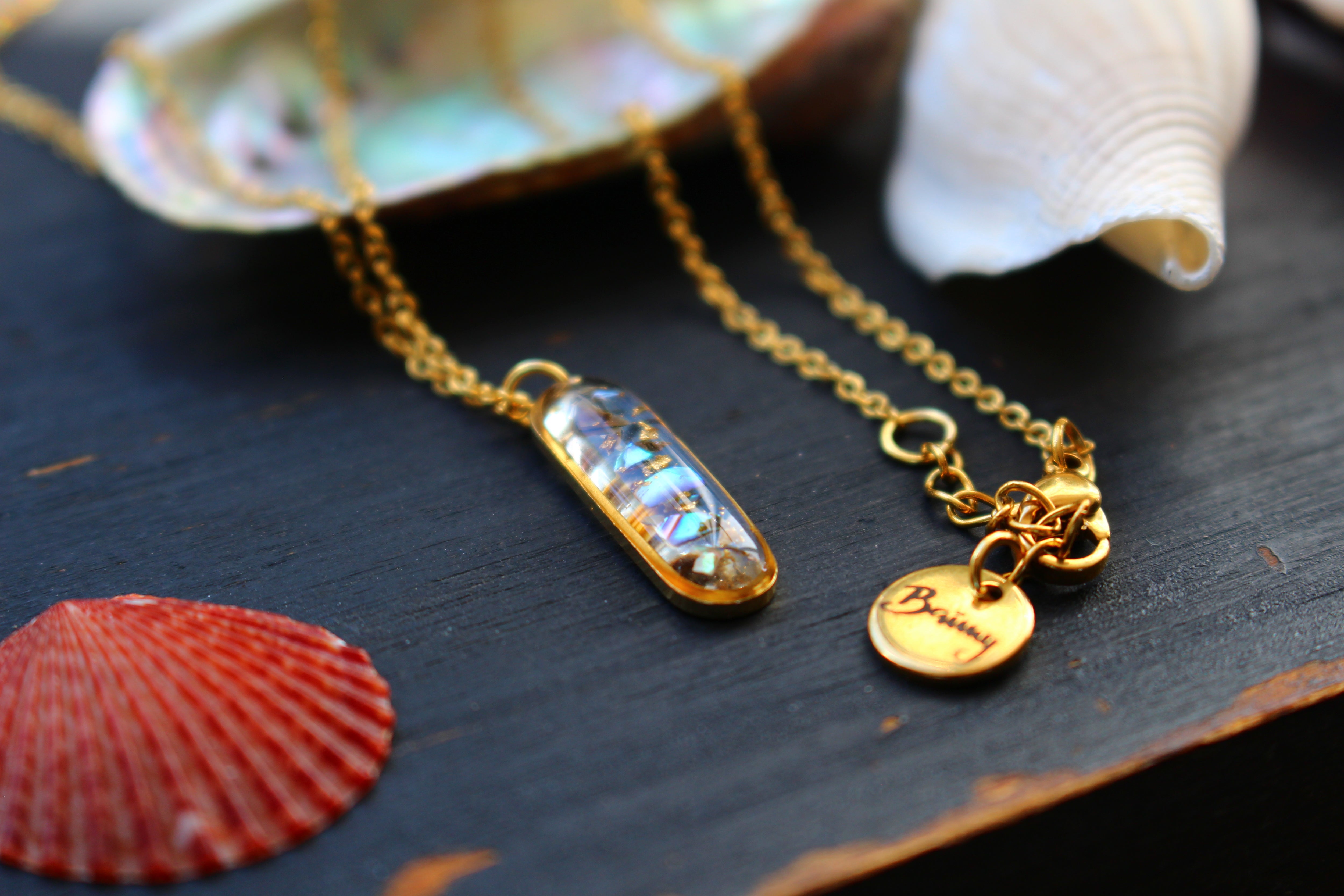 Collier composé d'un médaillon allongé rempli de résine dans laquelle j'ai incrusté des morceaux de nacre "abalone" et quelques morceaux de feuilles d'or.