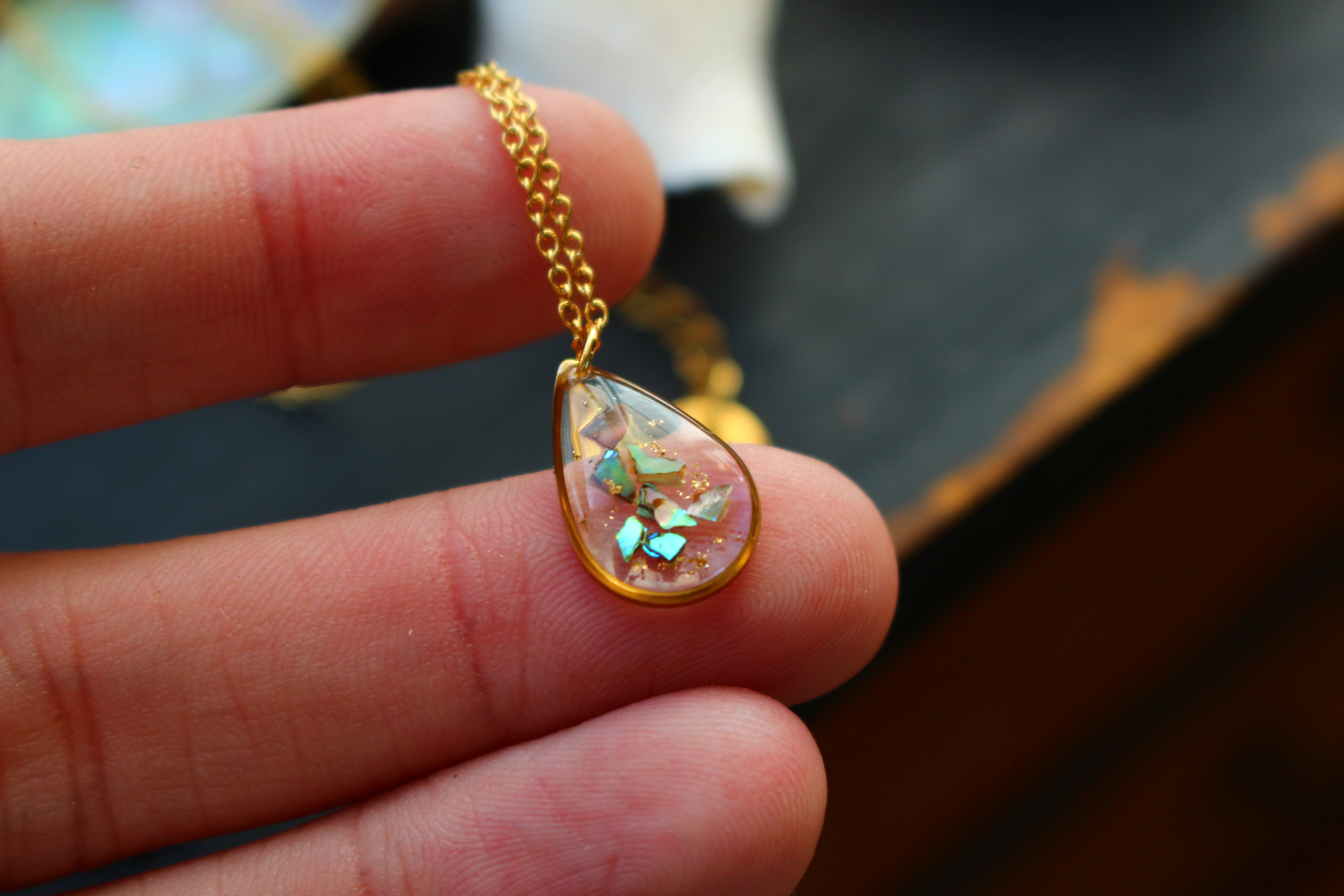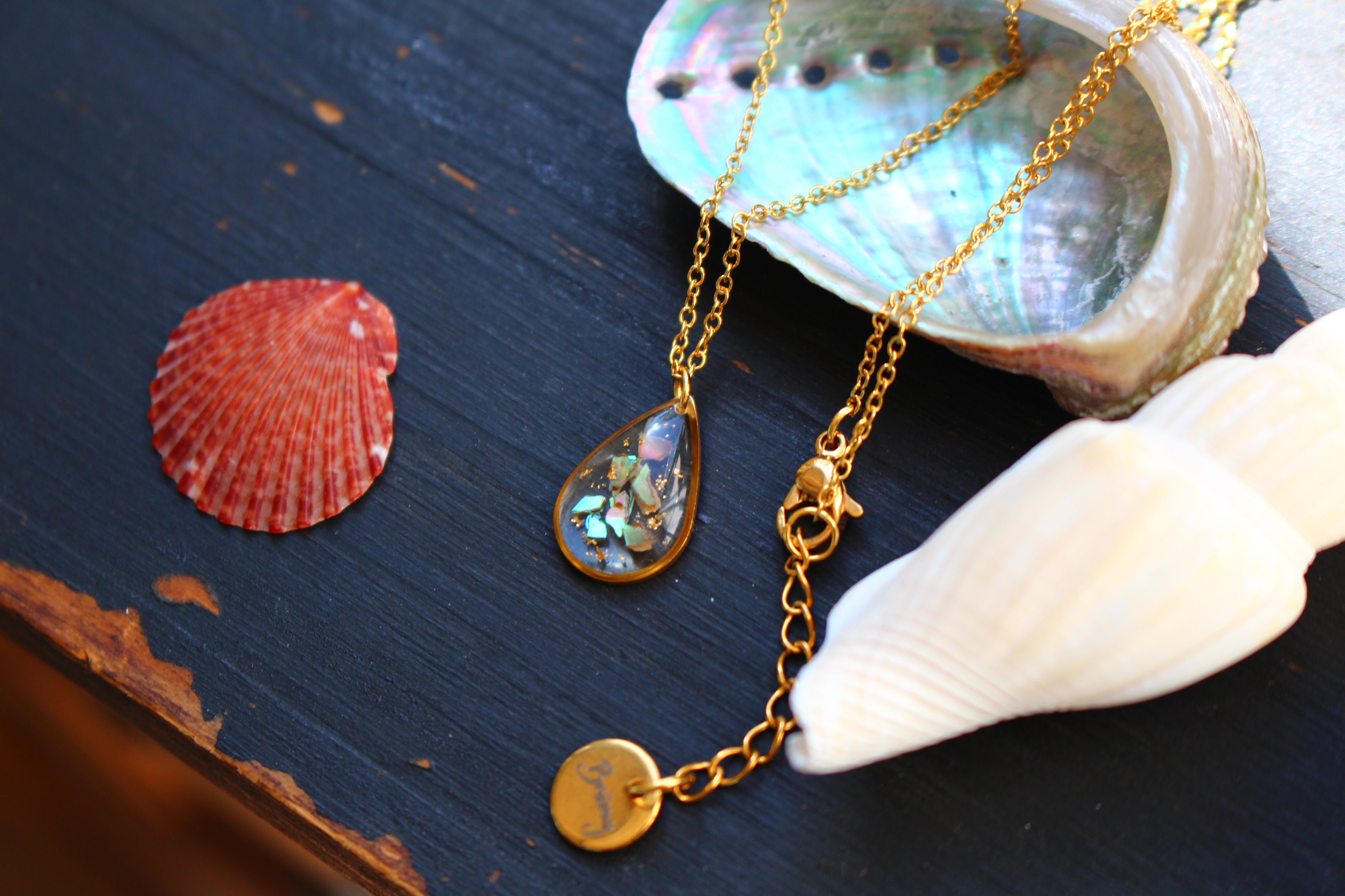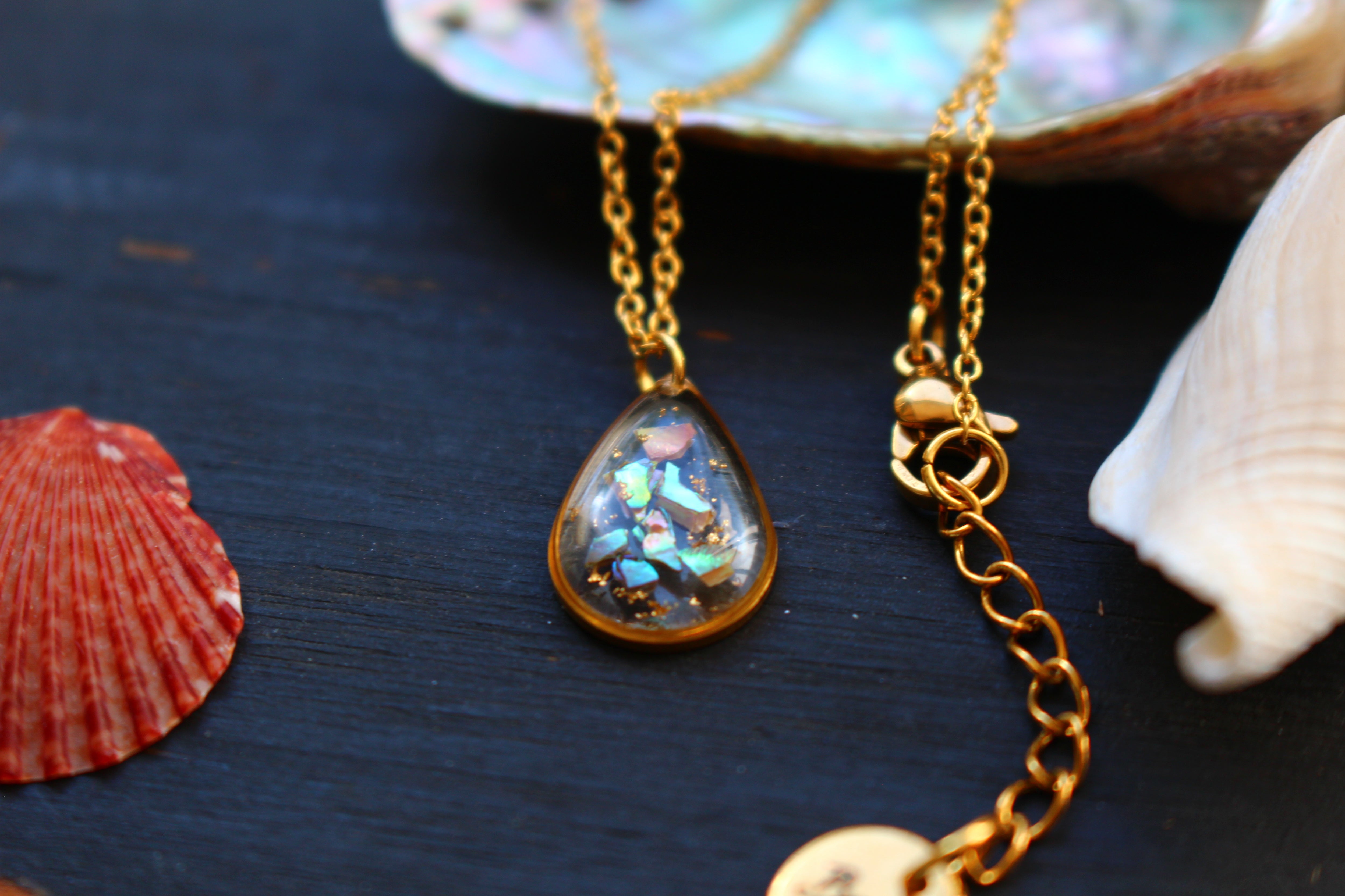 Collier composé d'un médaillon en forme de goutte rempli de résine dans laquelle j'ai incrusté des morceaux de nacre "abalone" et quelques morceaux de feuilles d'or.