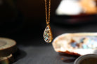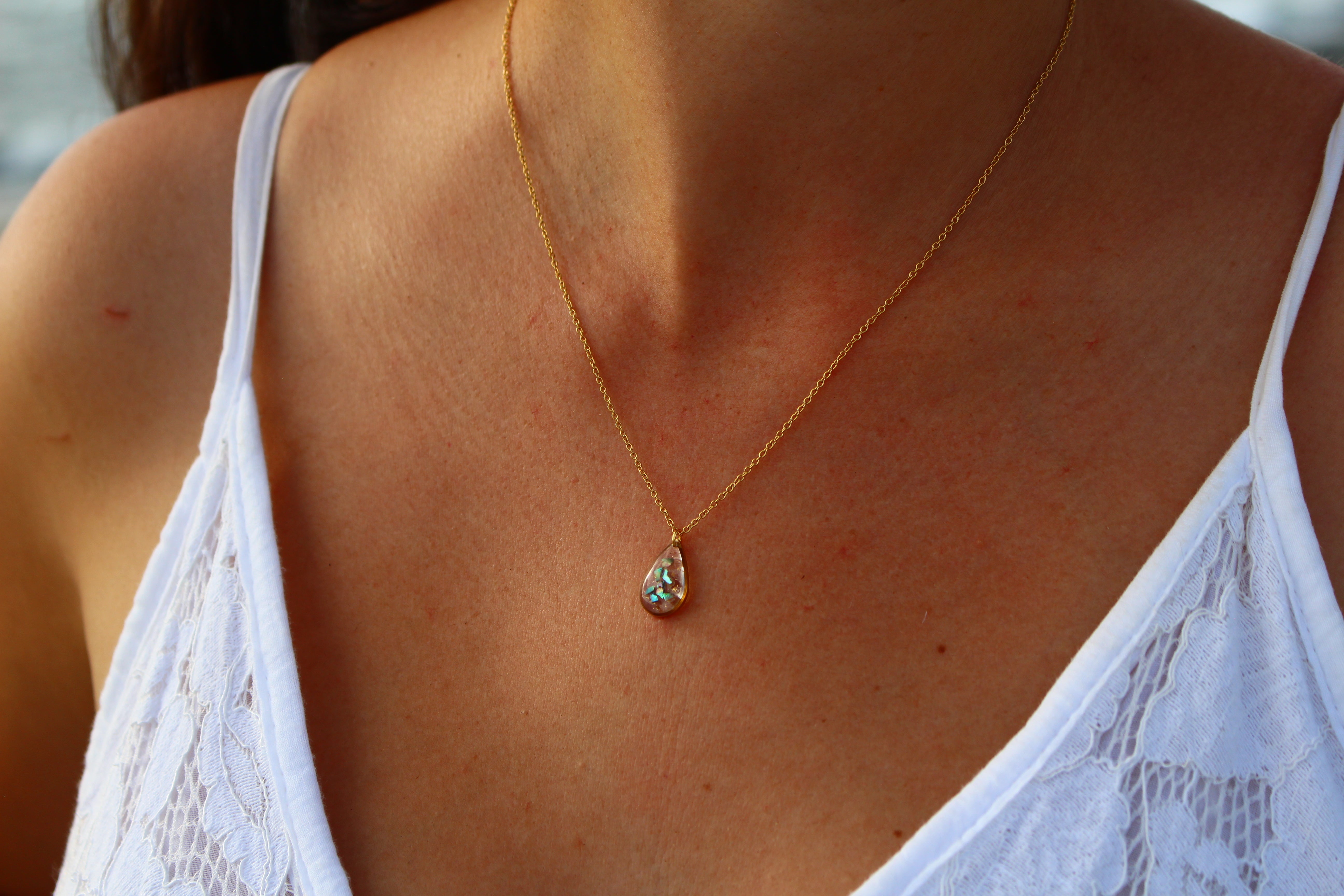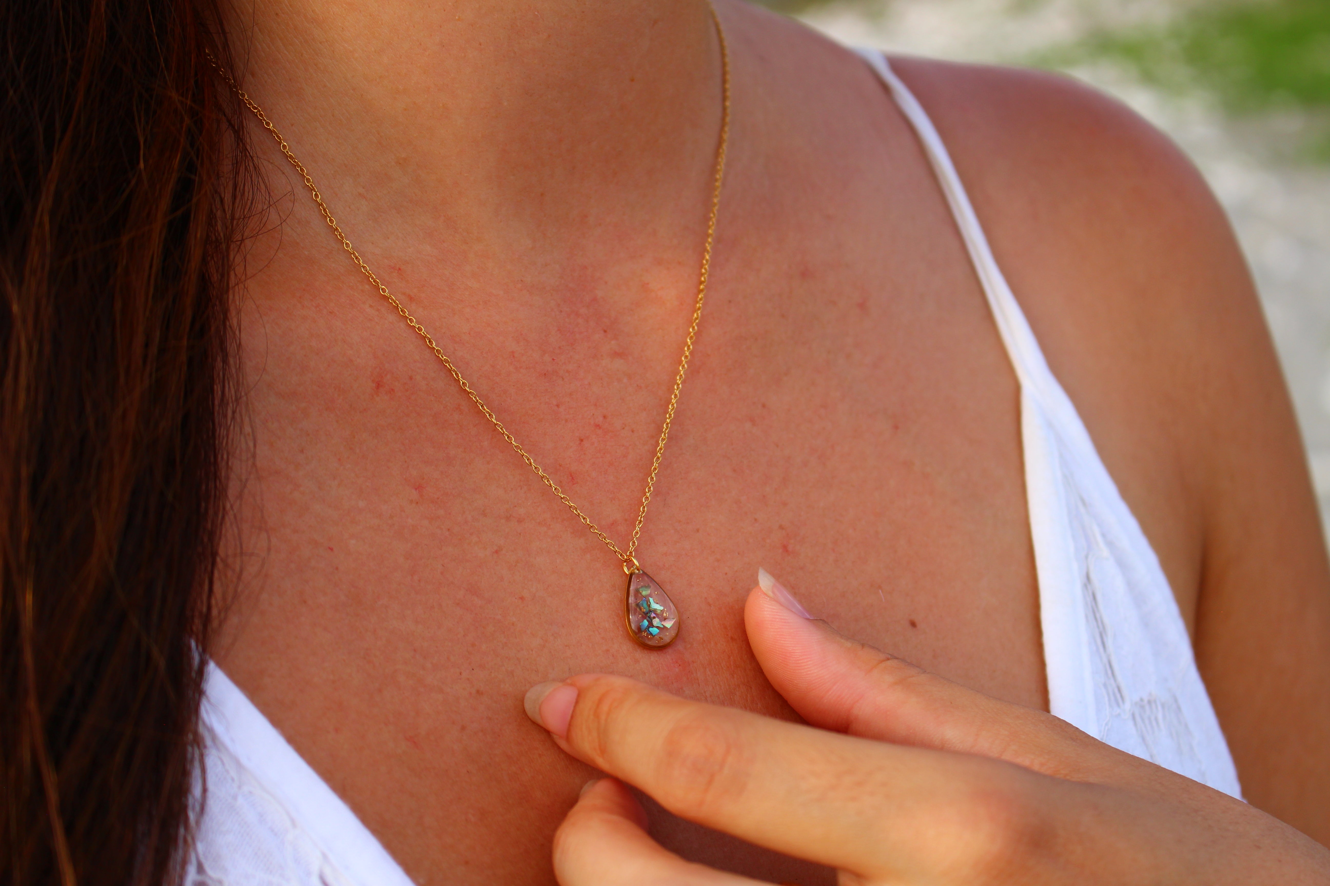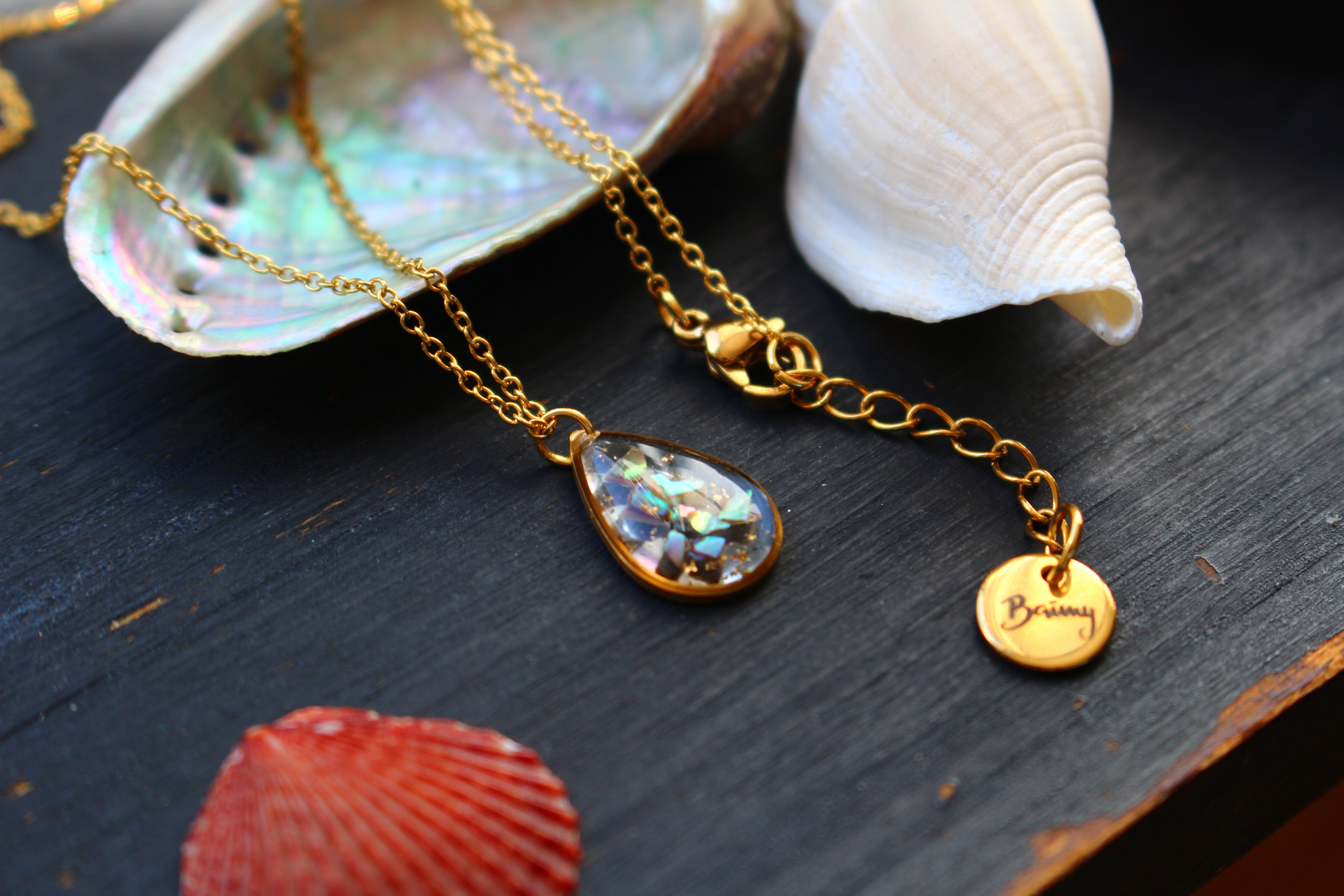 Collier composé d'un médaillon en forme de goutte rempli de résine dans laquelle j'ai incrusté des morceaux de nacre "abalone" et quelques morceaux de feuilles d'or.