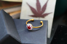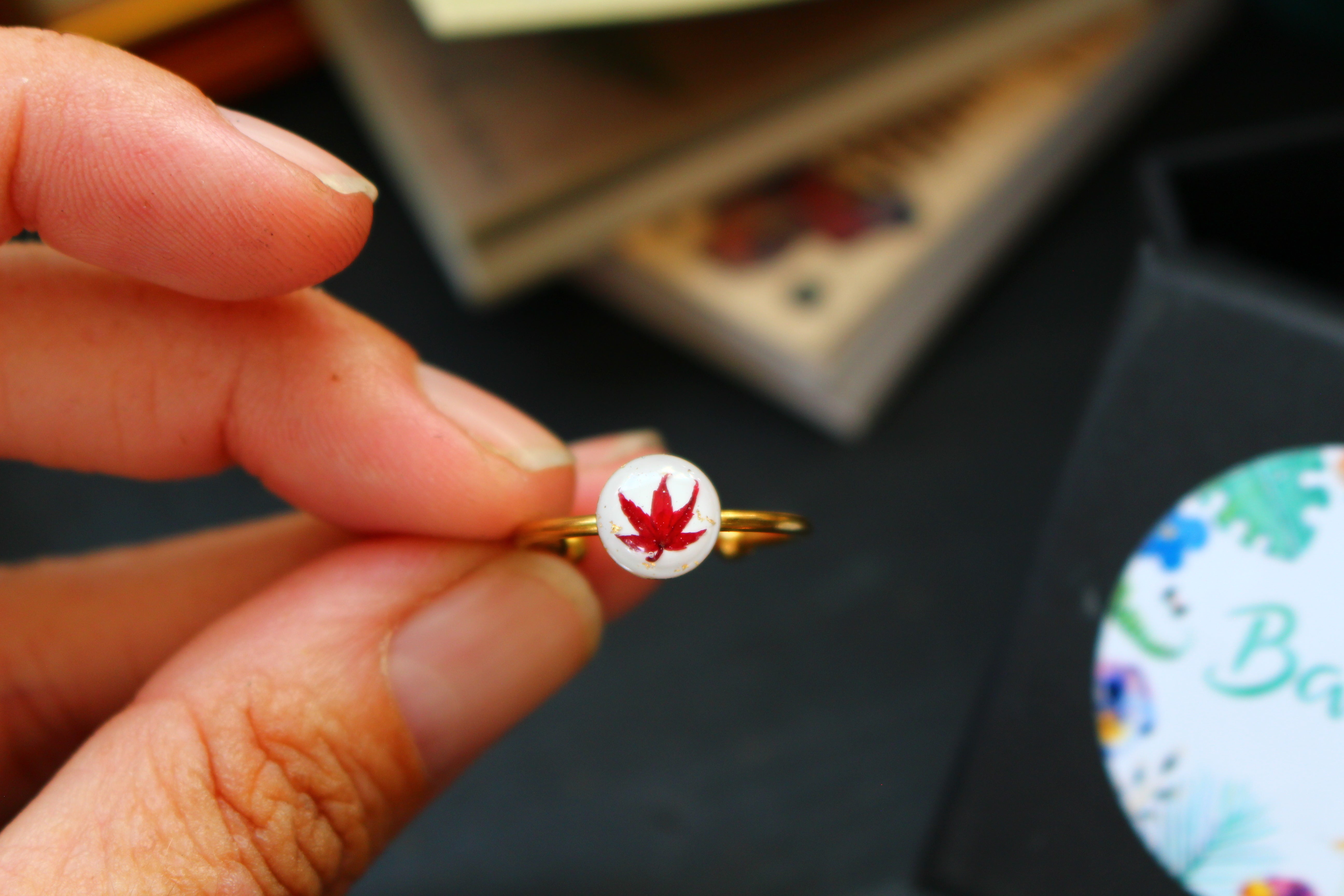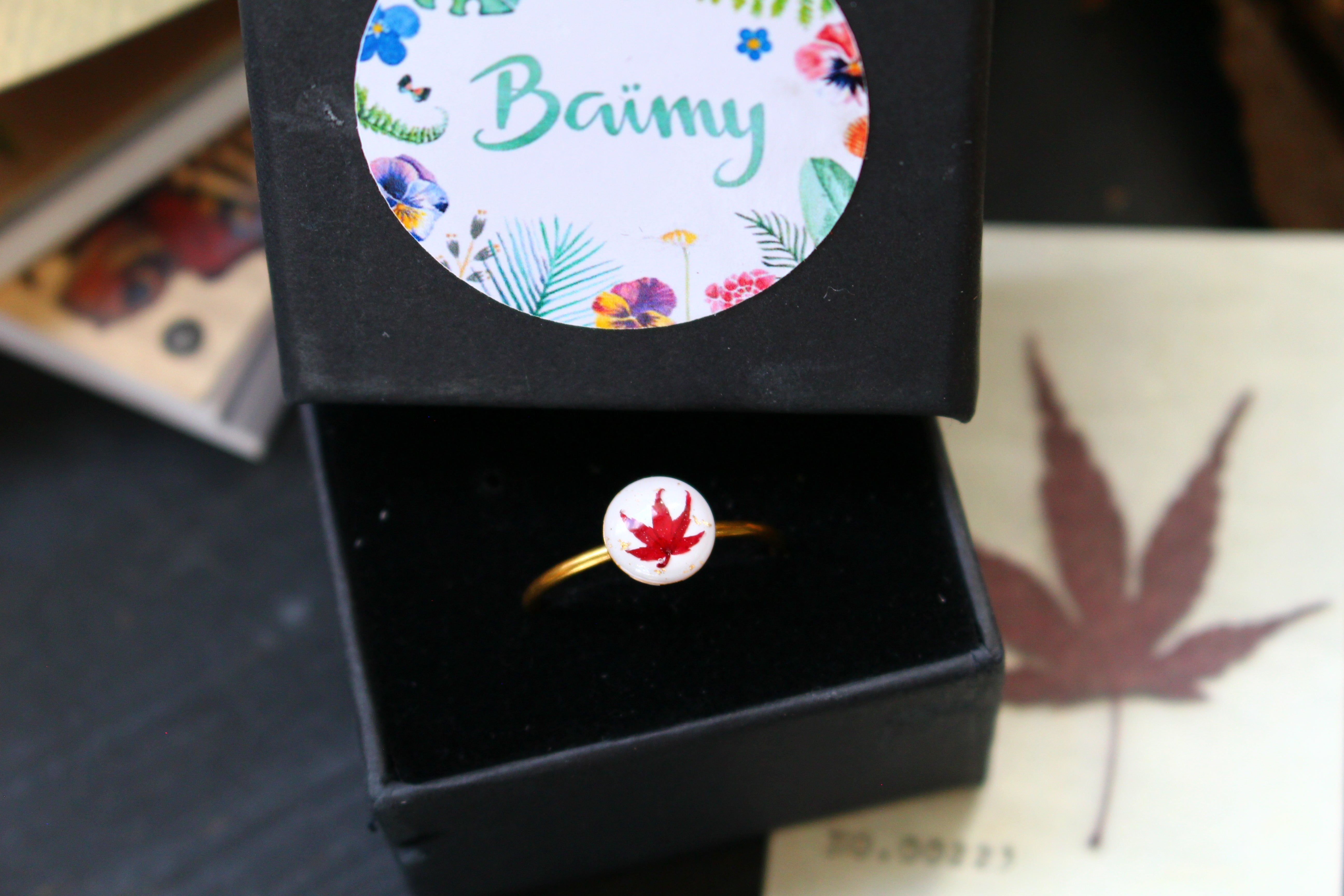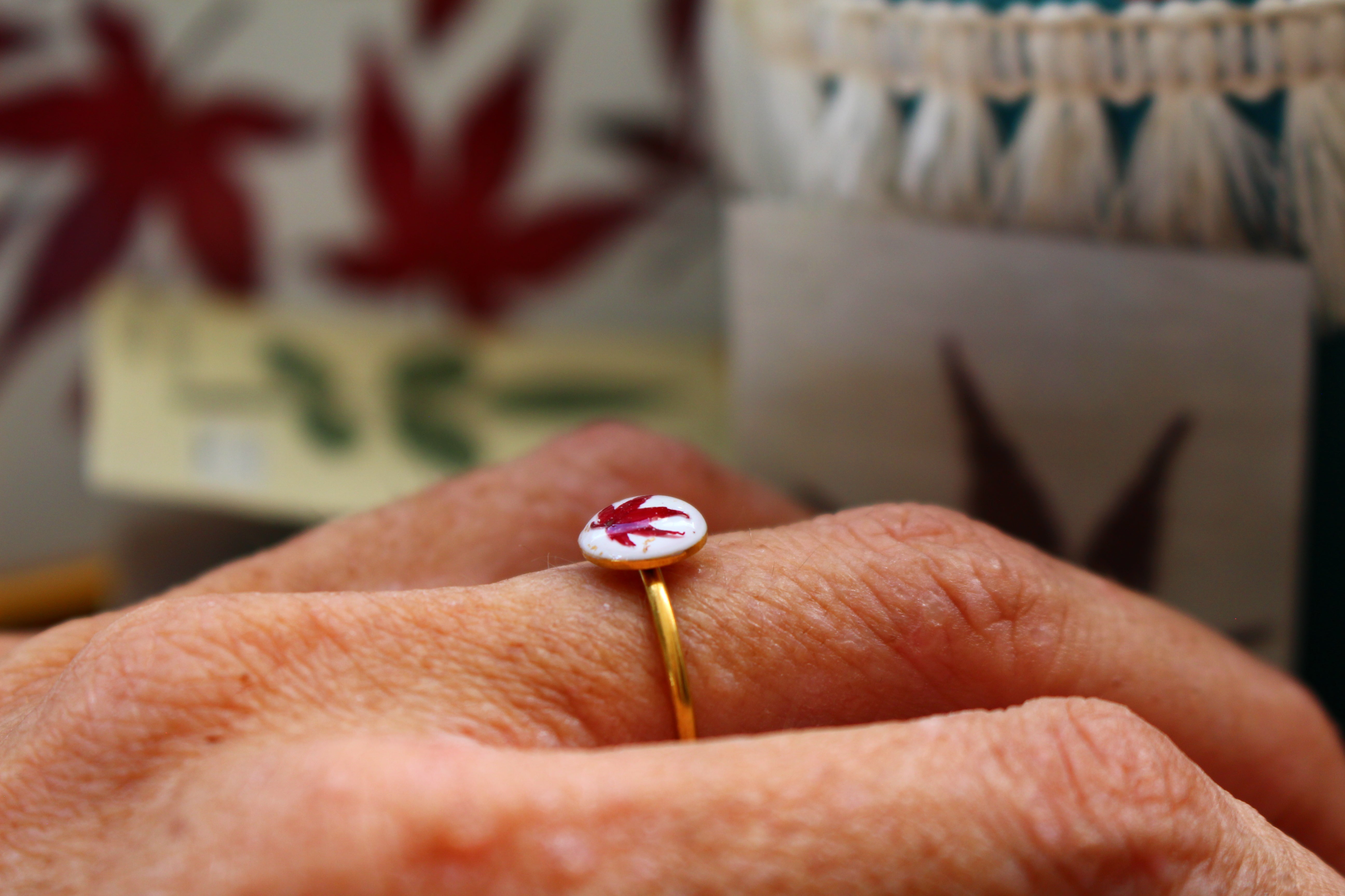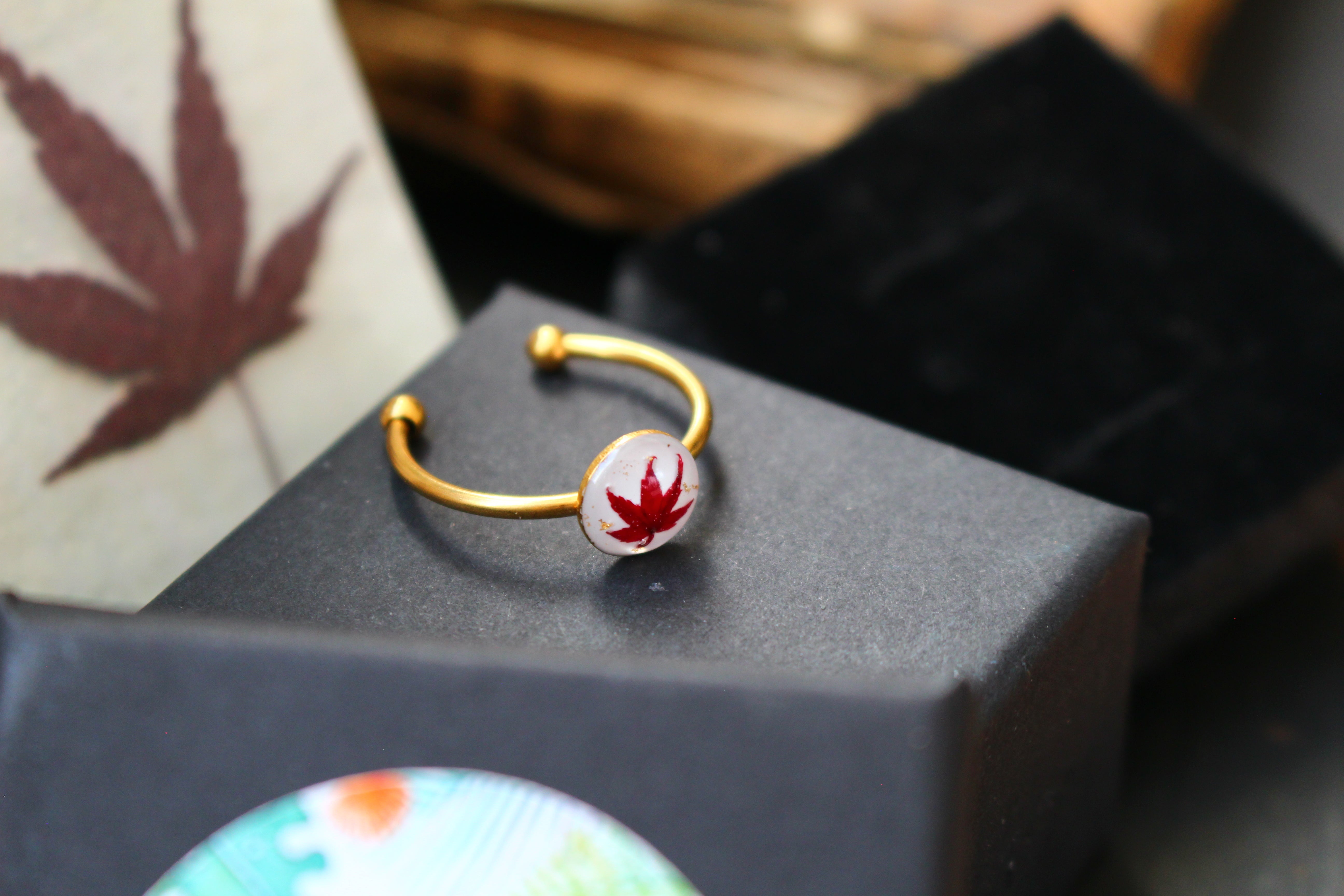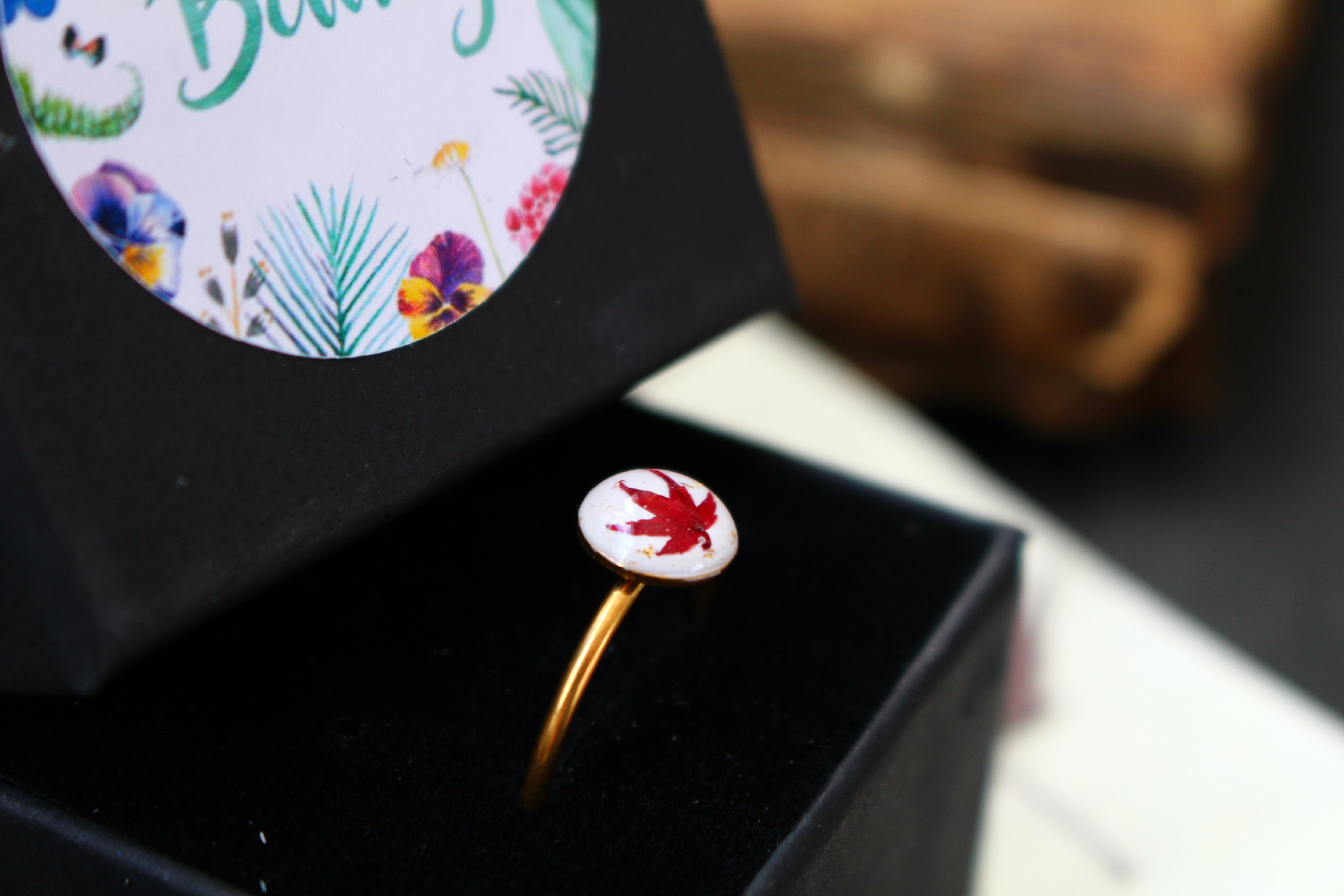 Bague composée d'un cabochon de 6mm de diamètre rempli de résine dans laquelle j'ai incrusté une mini feuille d'érable et quelques paillettes de feuilles d'or sur un fond blanc.