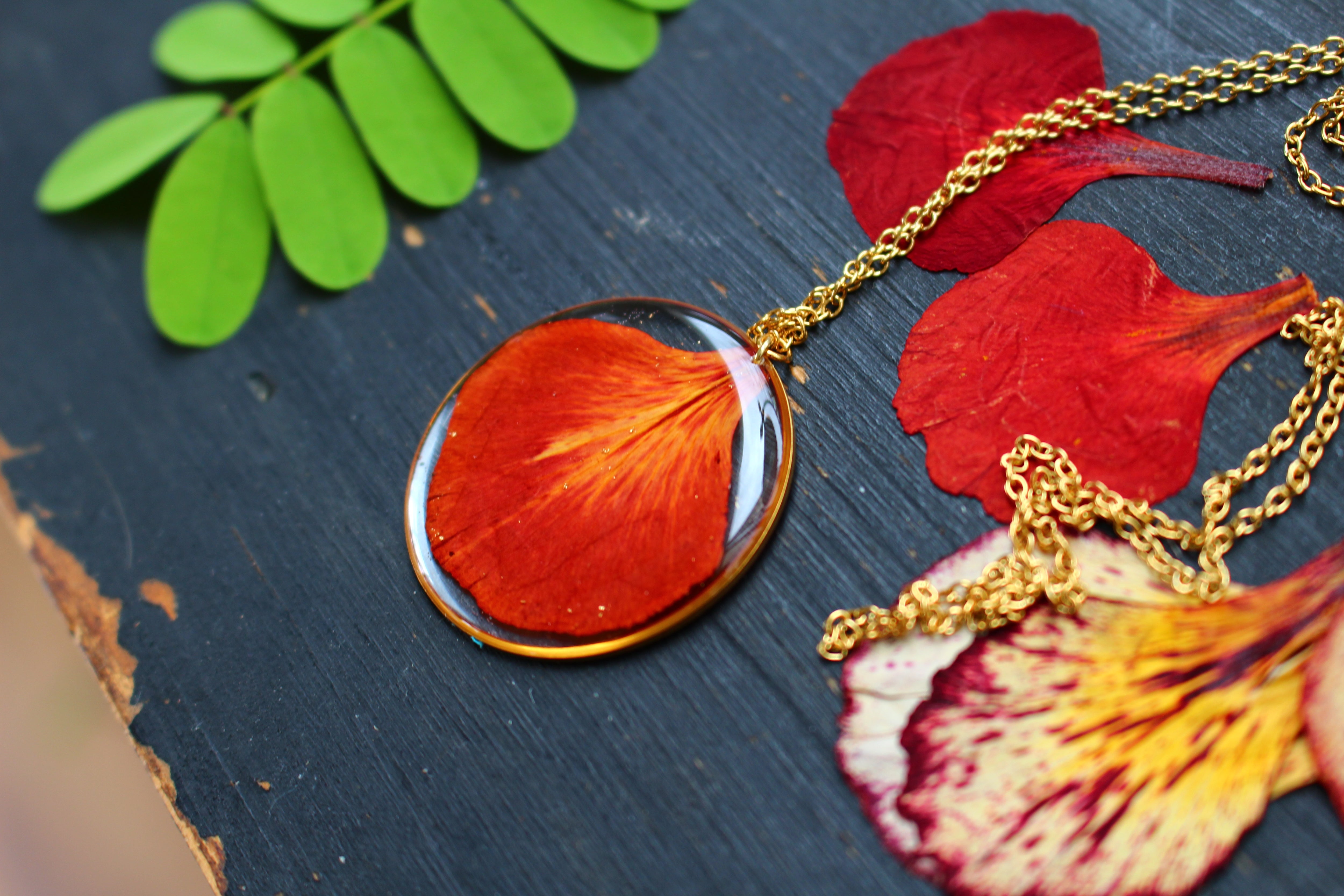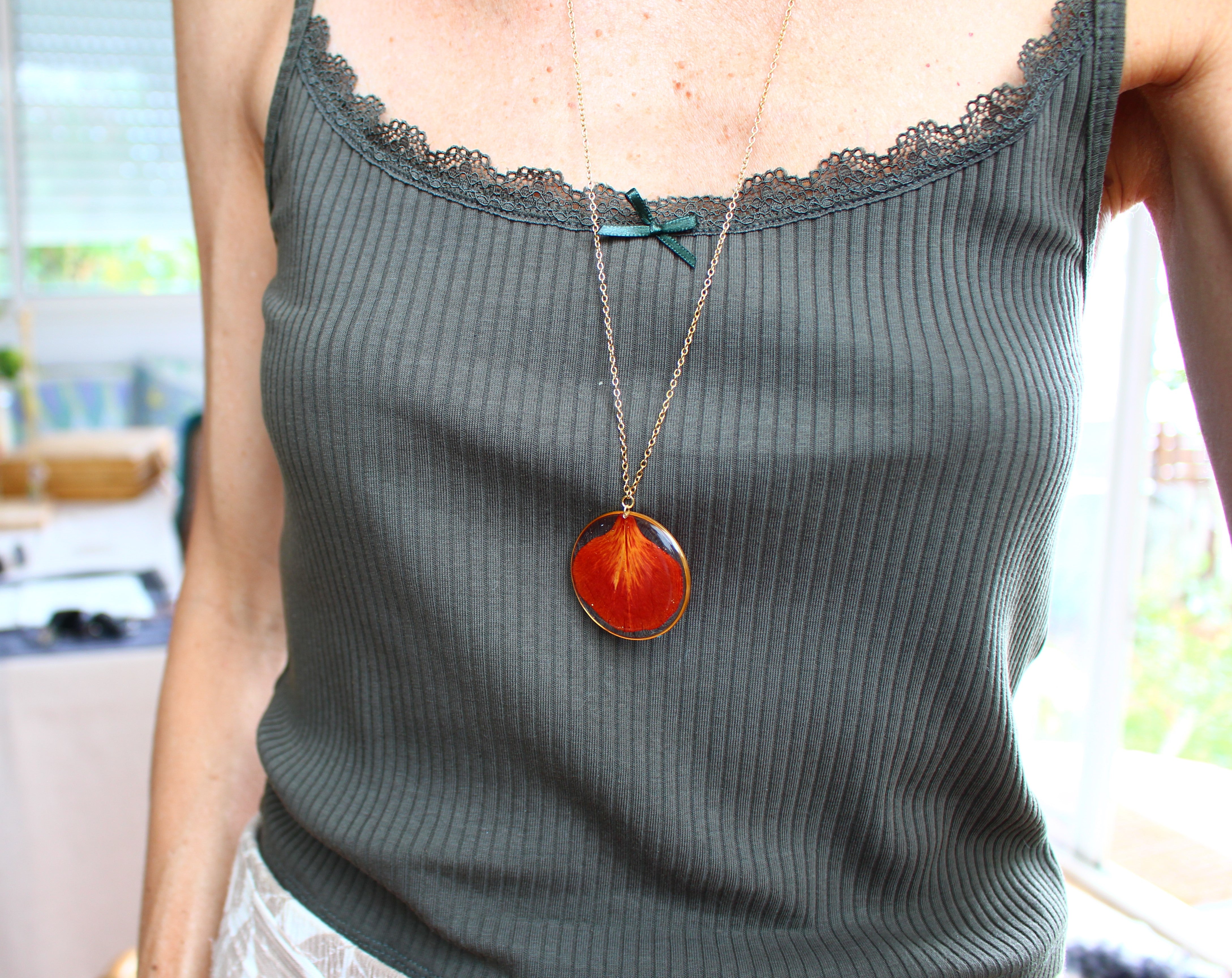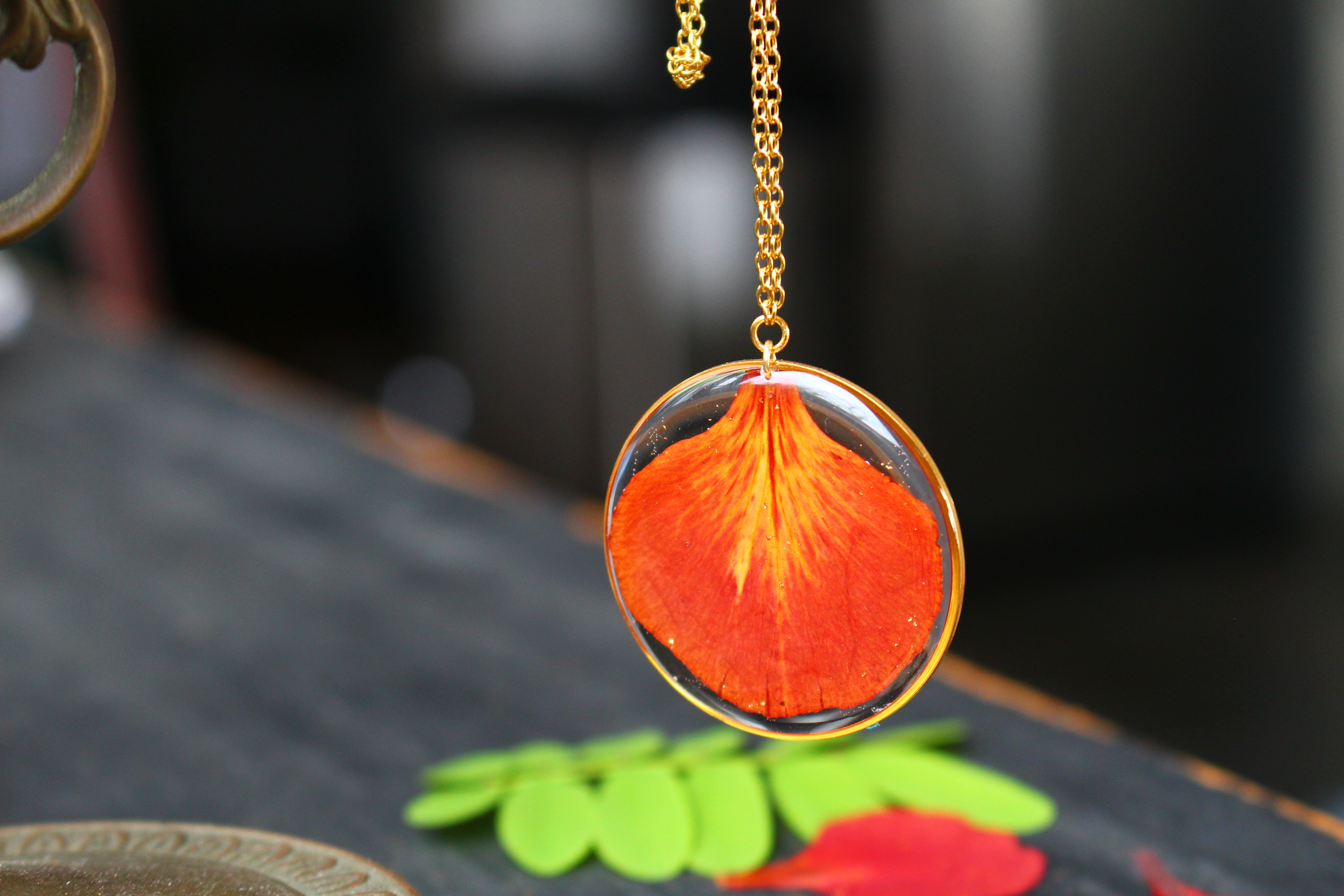 Sautoir composé d'un médaillon de 35mm de diamètre rempli de résine dans laquelle j'ai incrusté une partie d'un pétale de flamboyant et quelques particules de feuilles d'or.