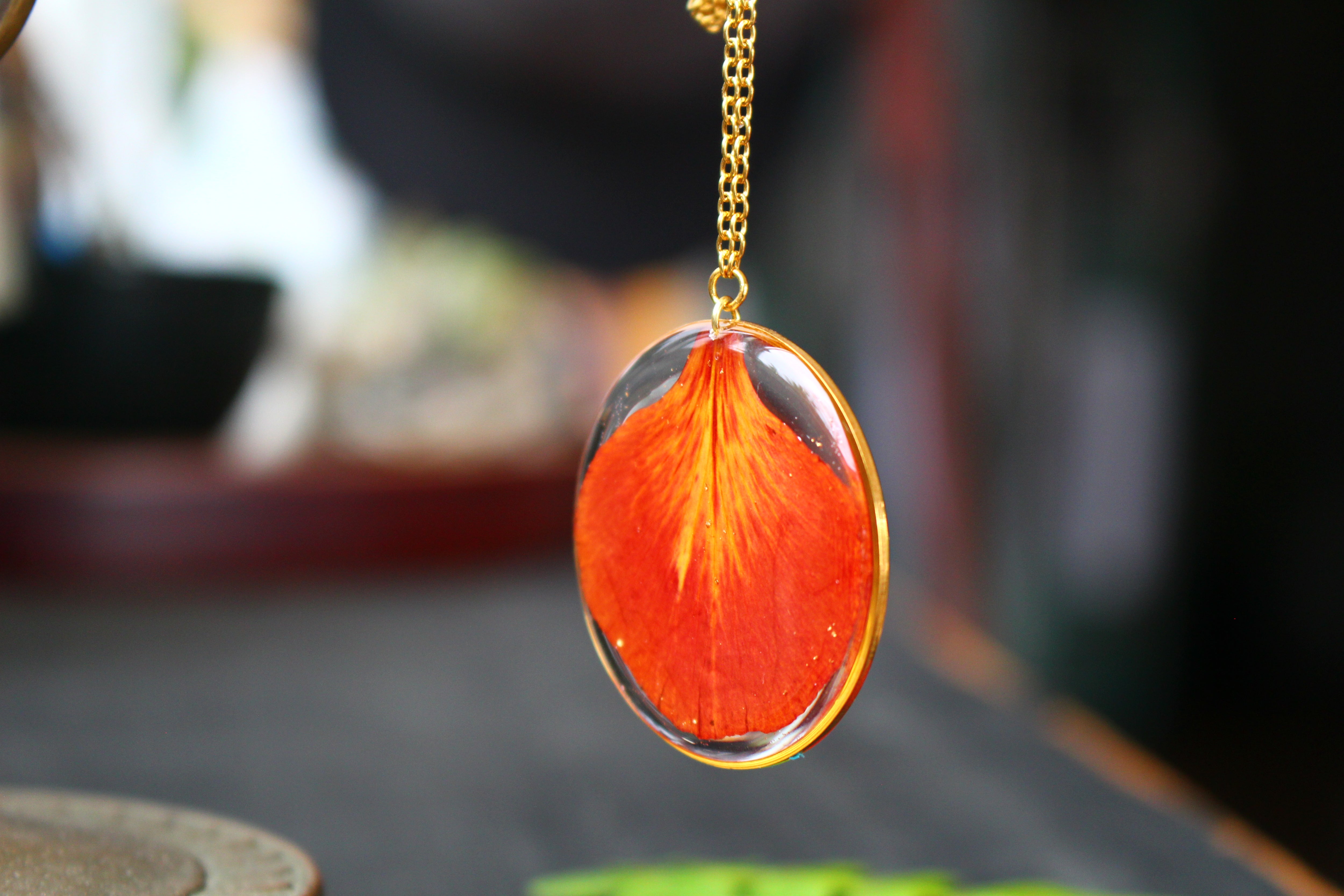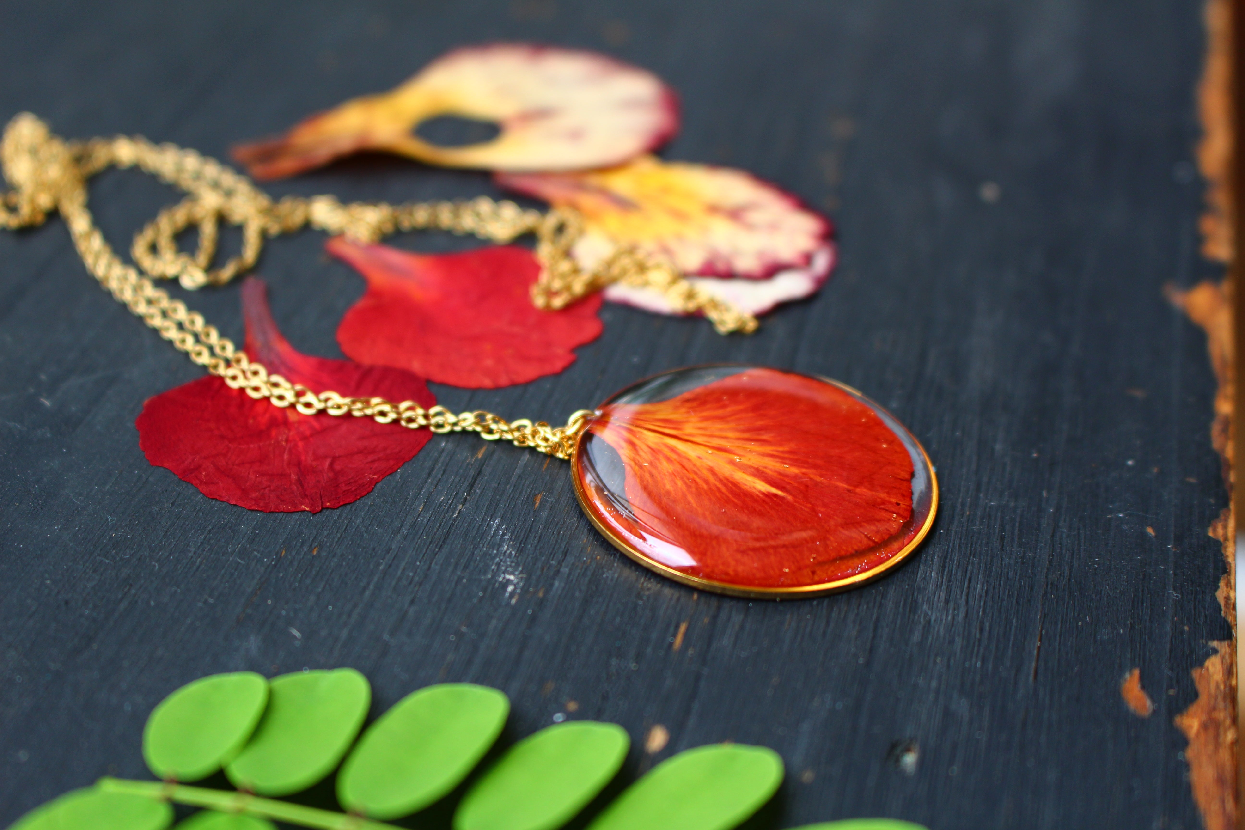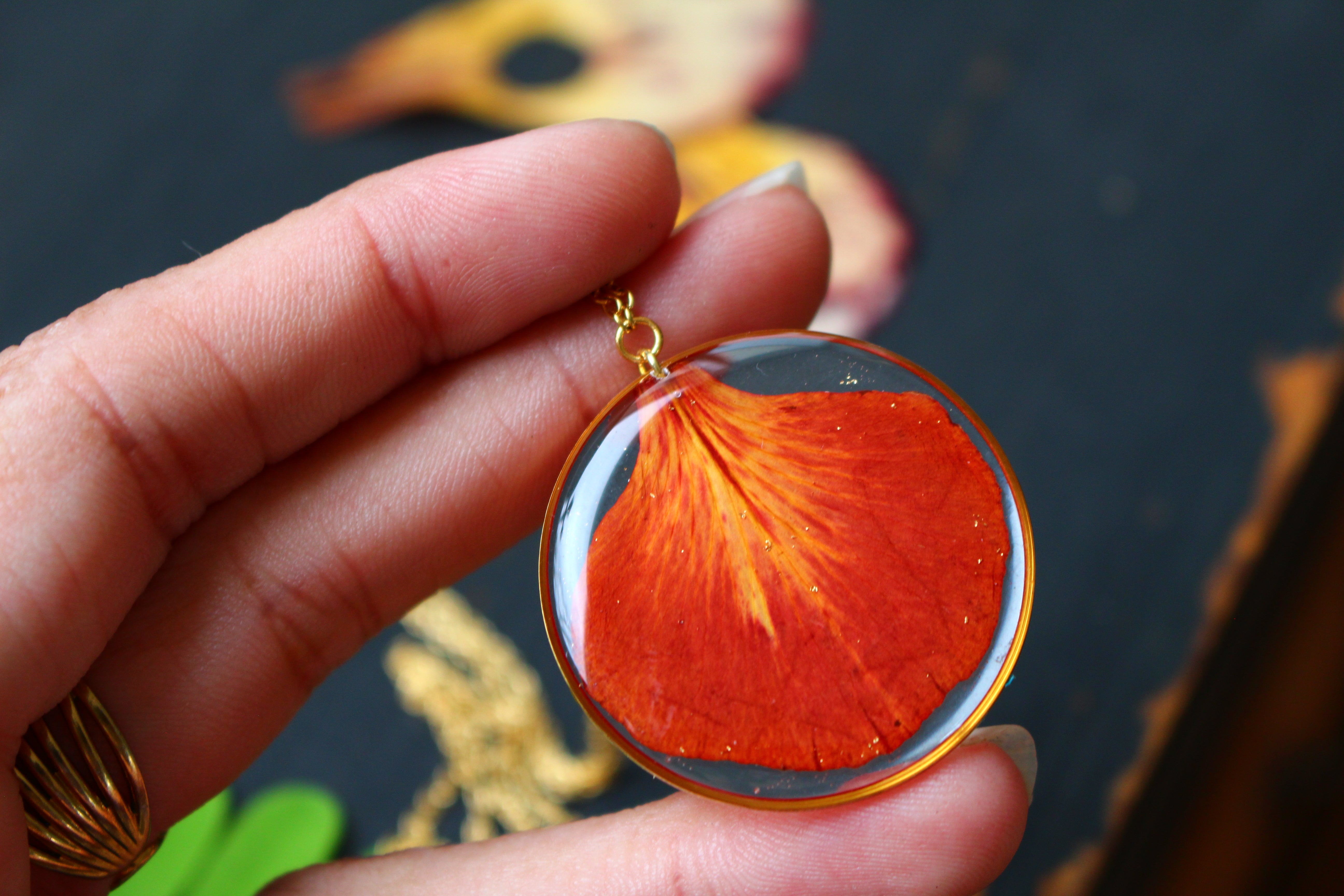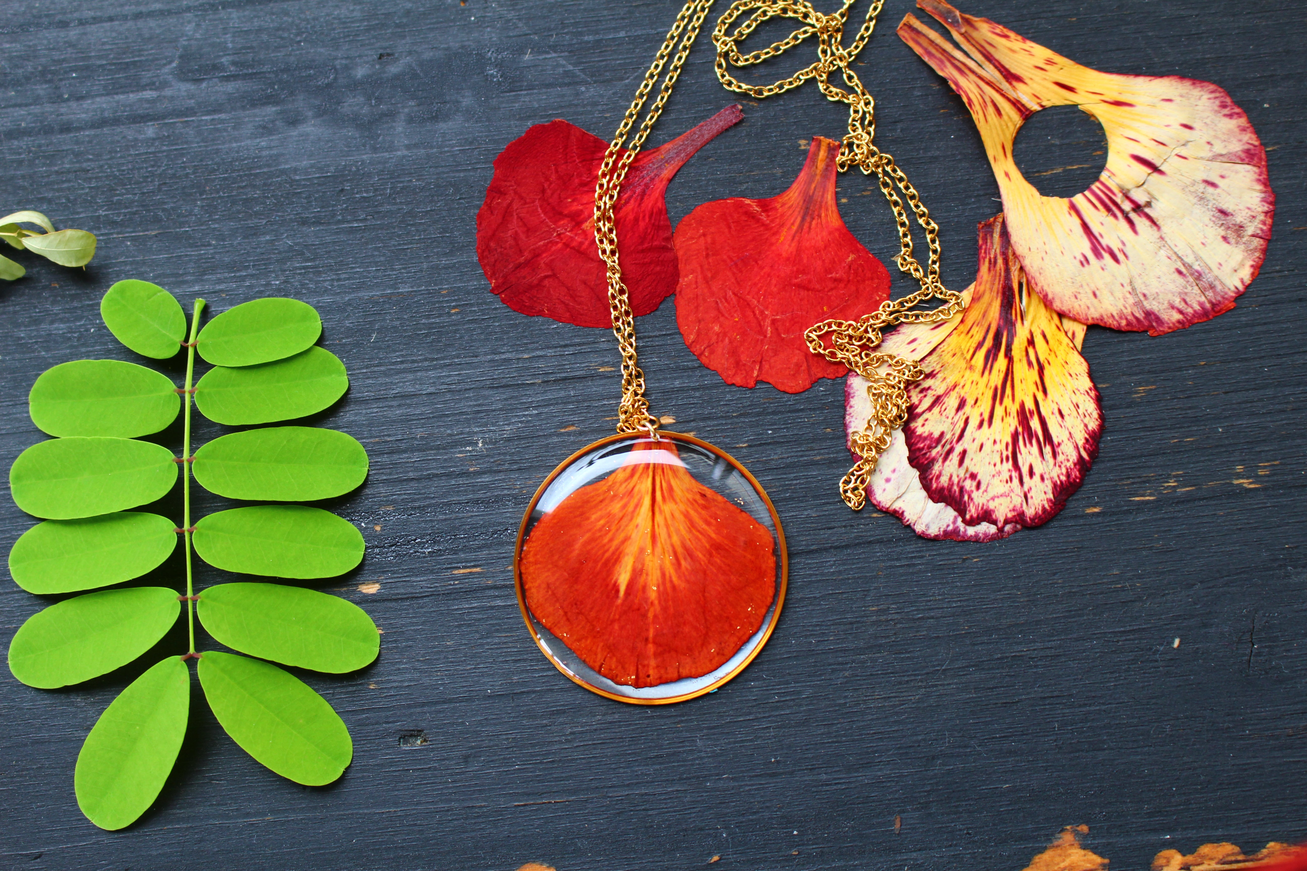 Sautoir composé d'un médaillon de 35mm de diamètre rempli de résine dans laquelle j'ai incrusté une partie d'un pétale de flamboyant et quelques particules de feuilles d'or.