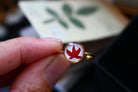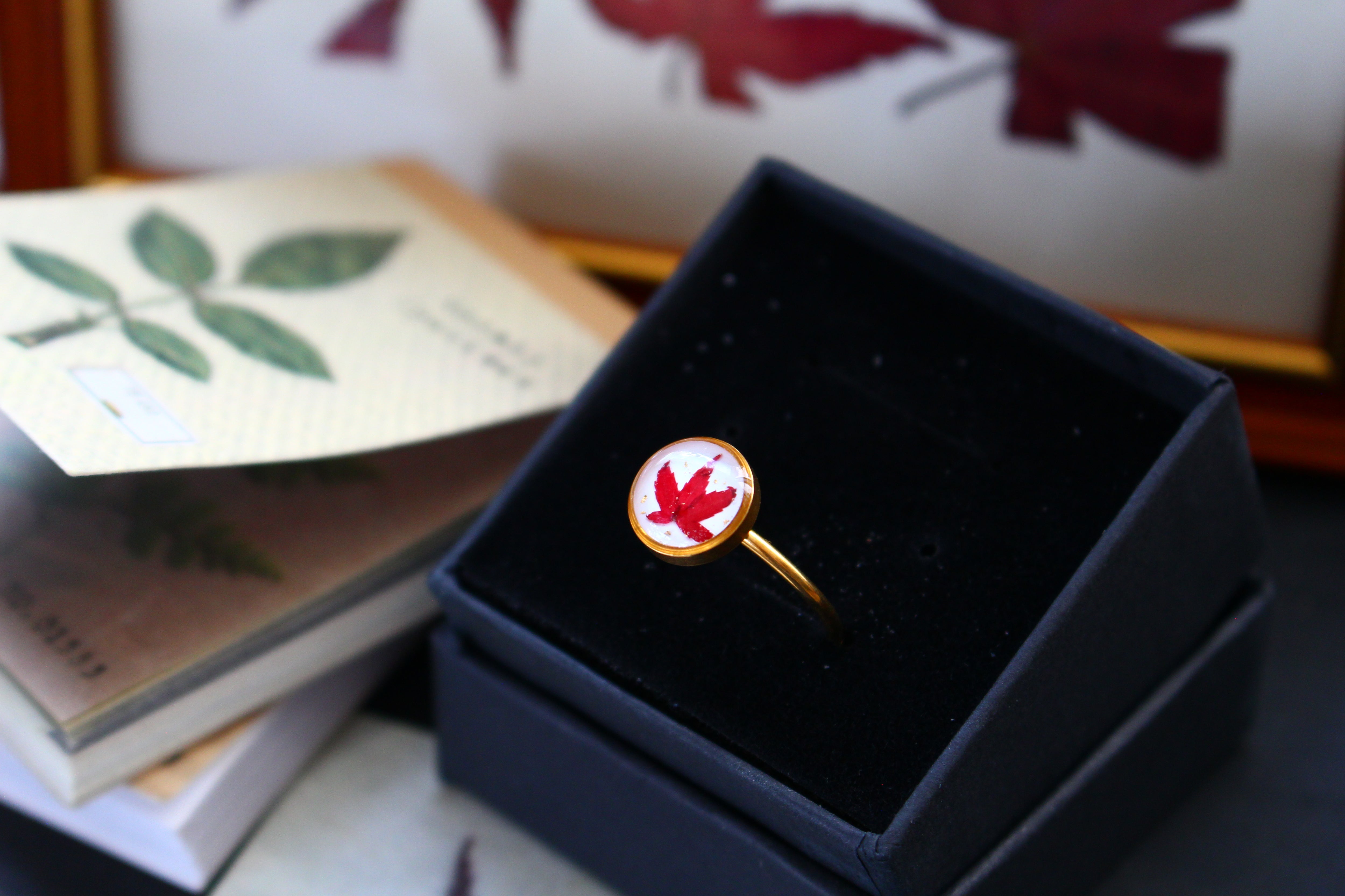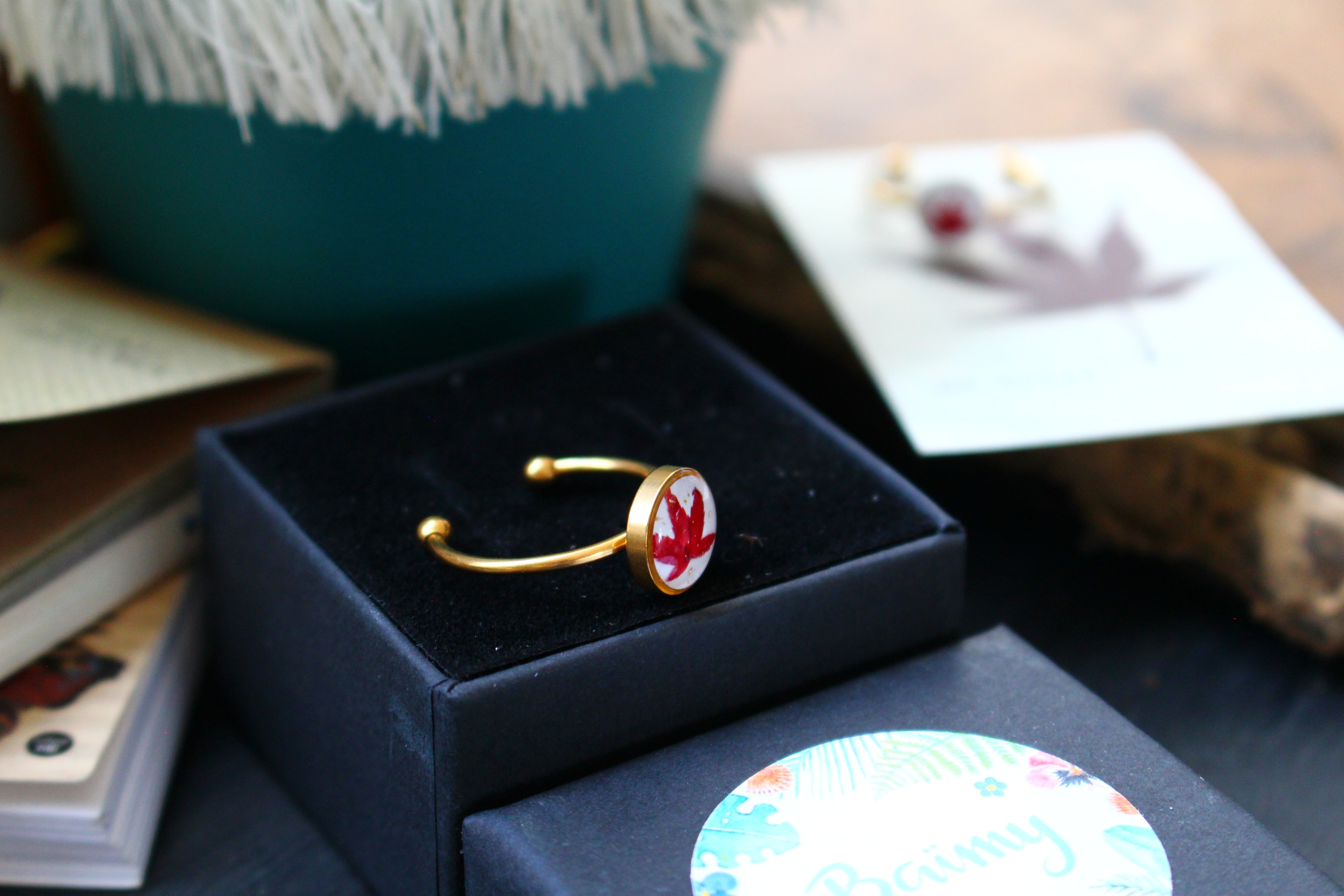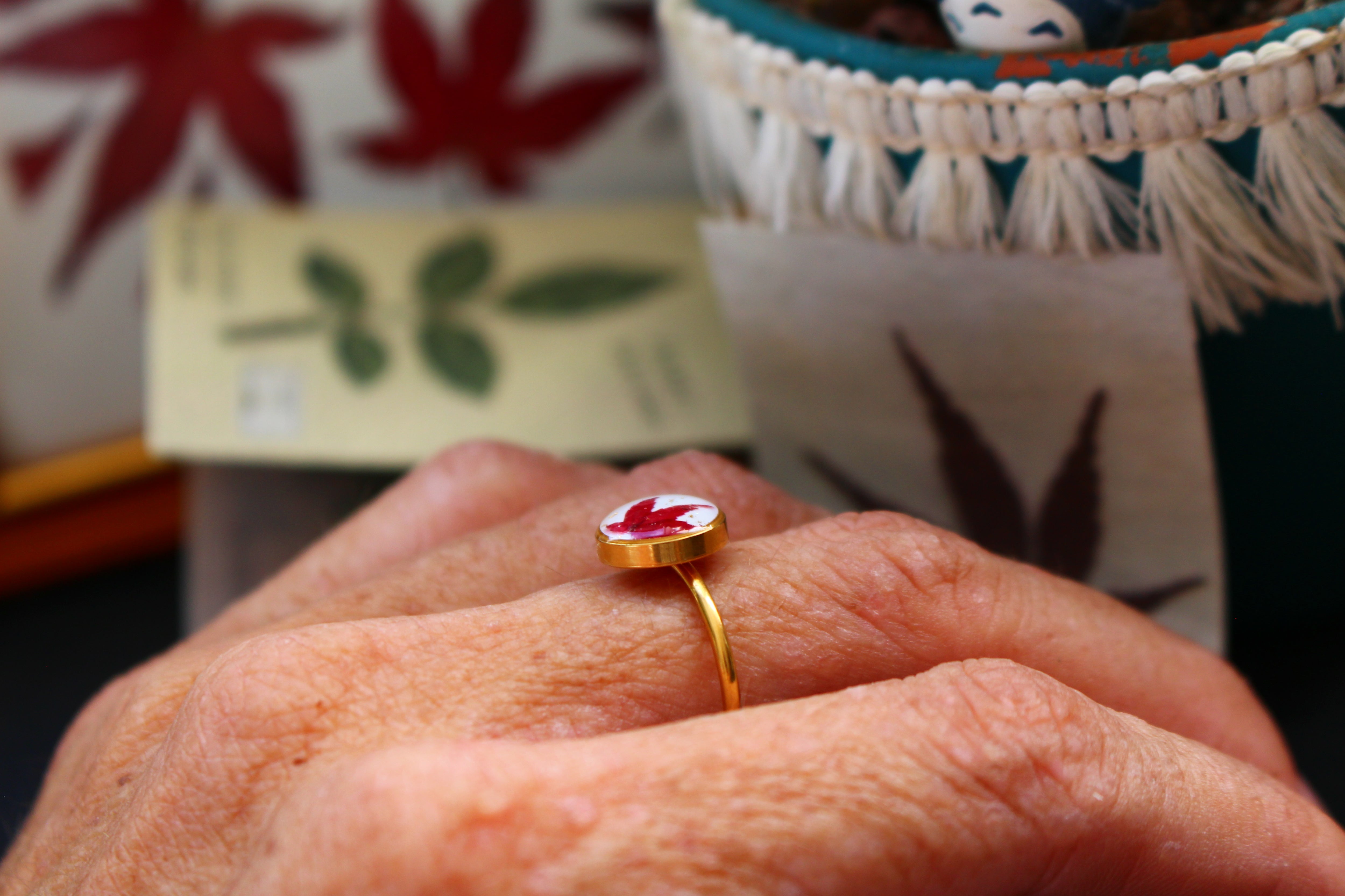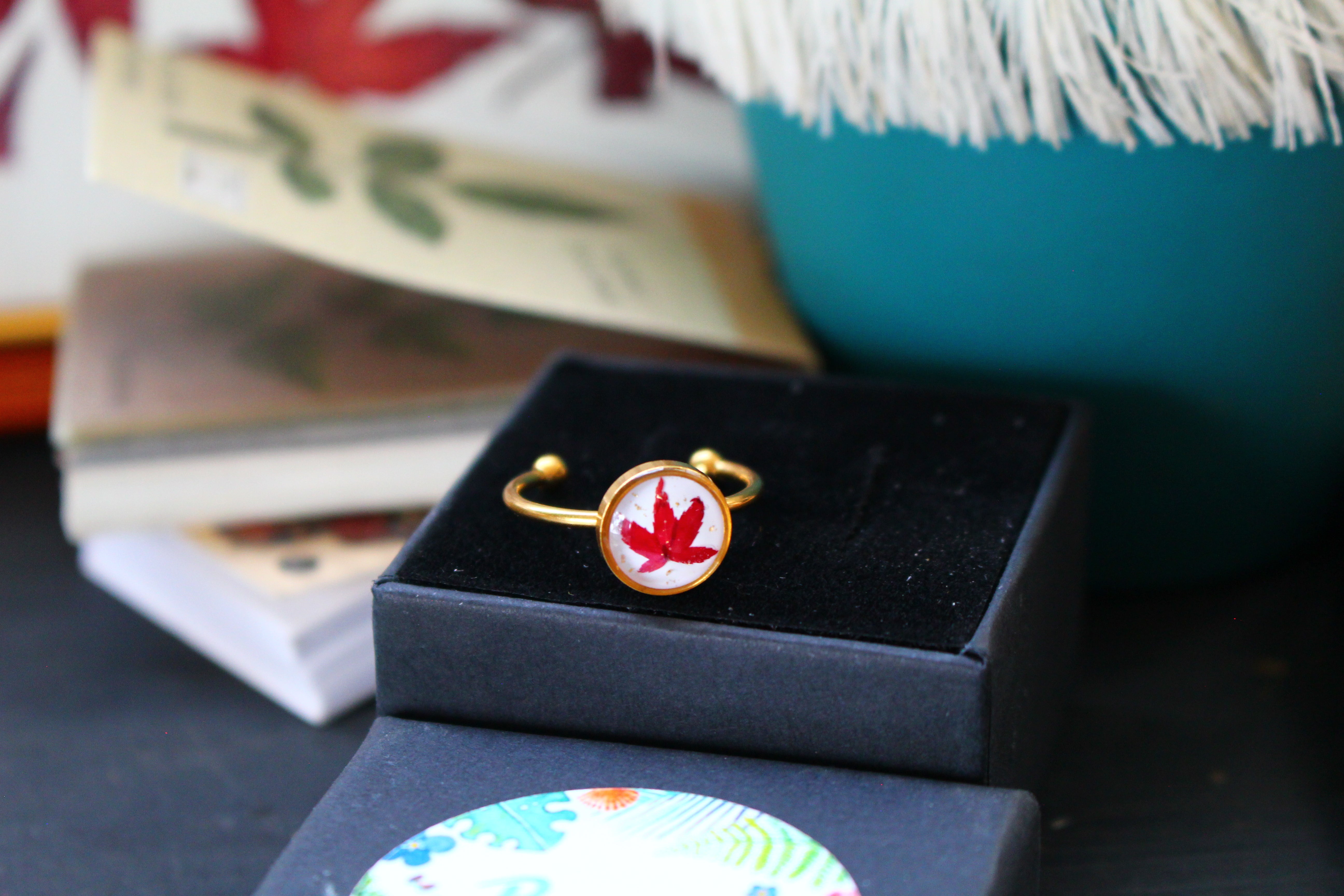 Bague composée d'un cabochon de 8mm de diamètre rempli de résine dans laquelle j'ai incrusté une mini feuille d'érable et quelques paillettes de feuilles d'or sur un fond blanc.