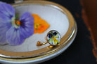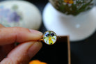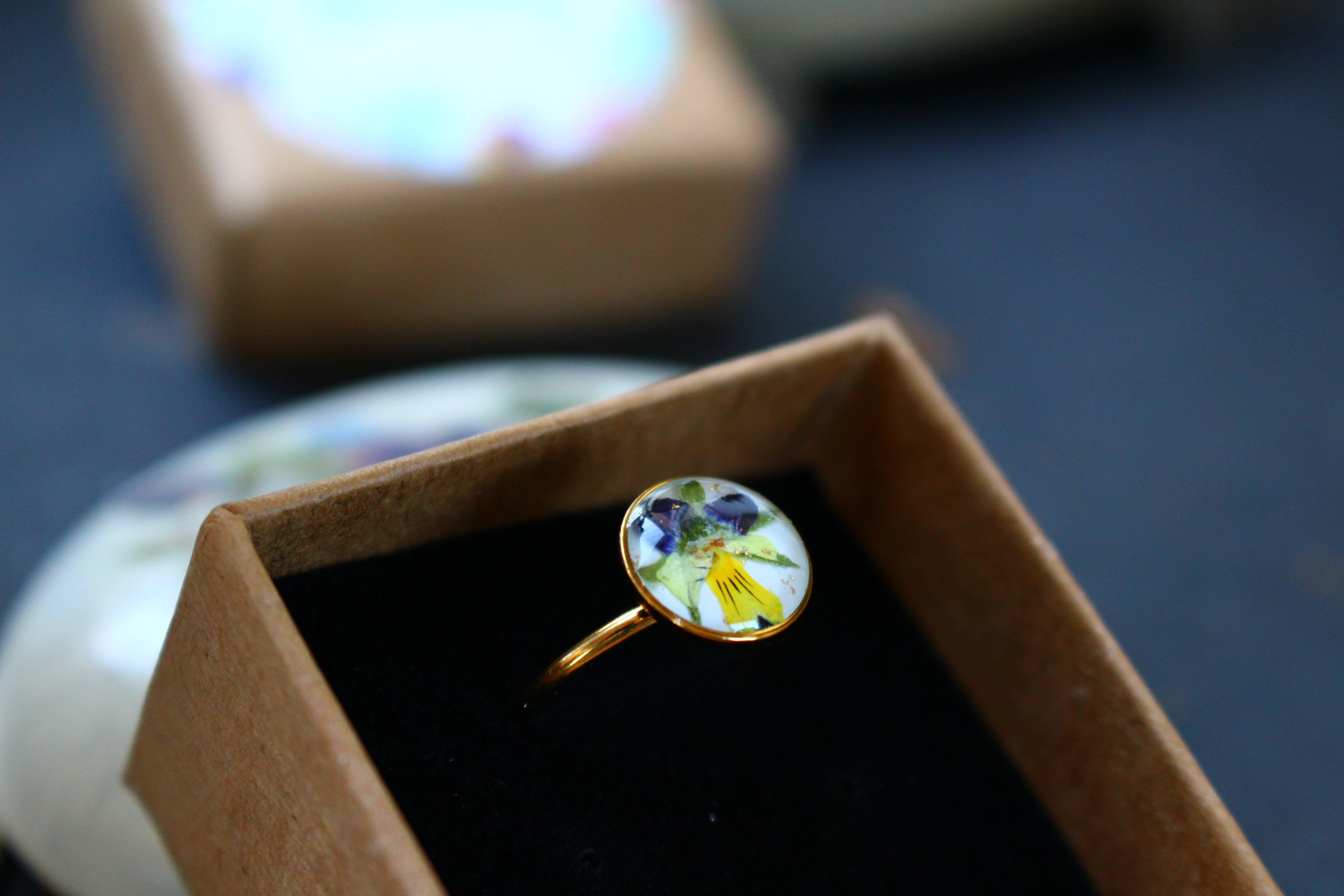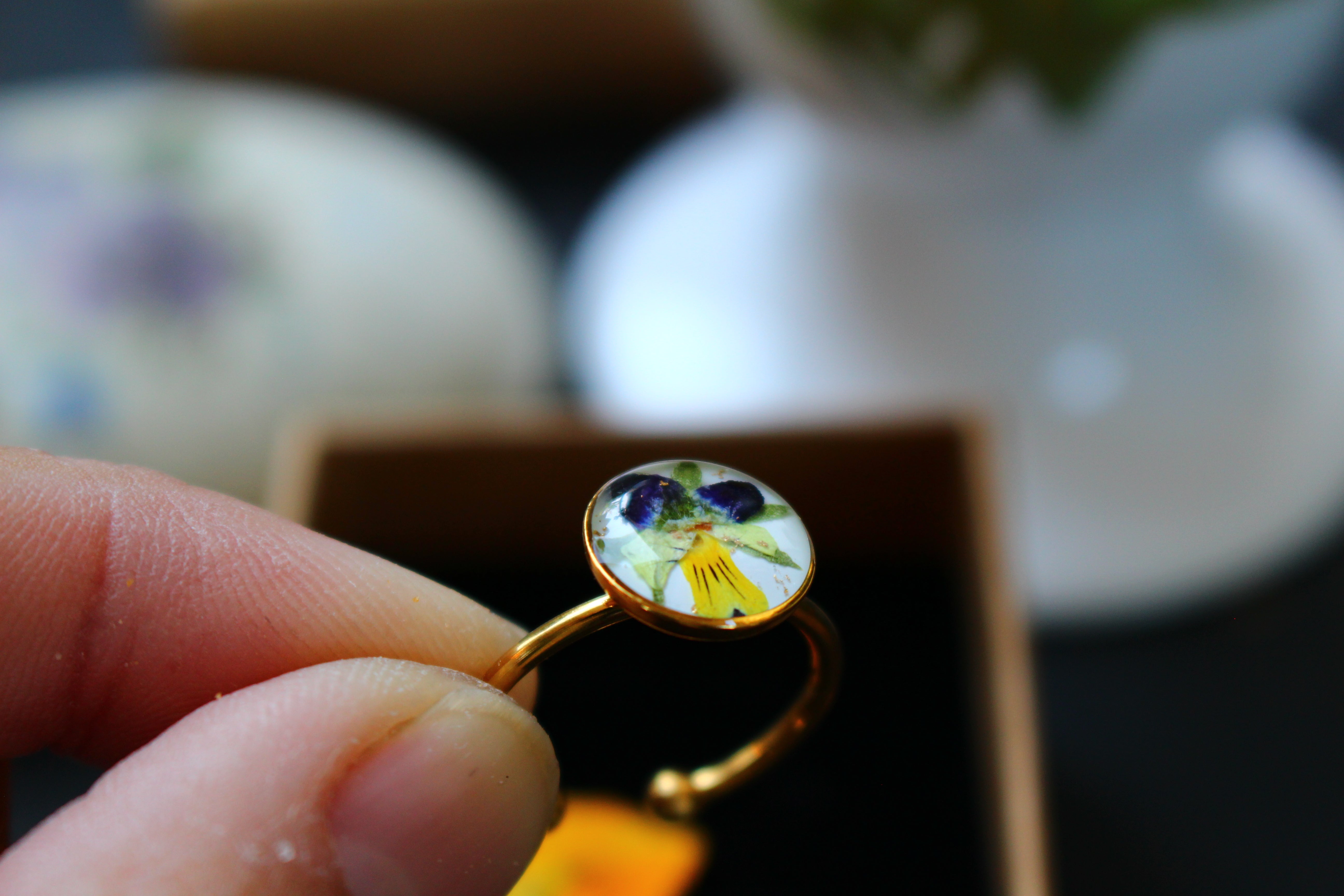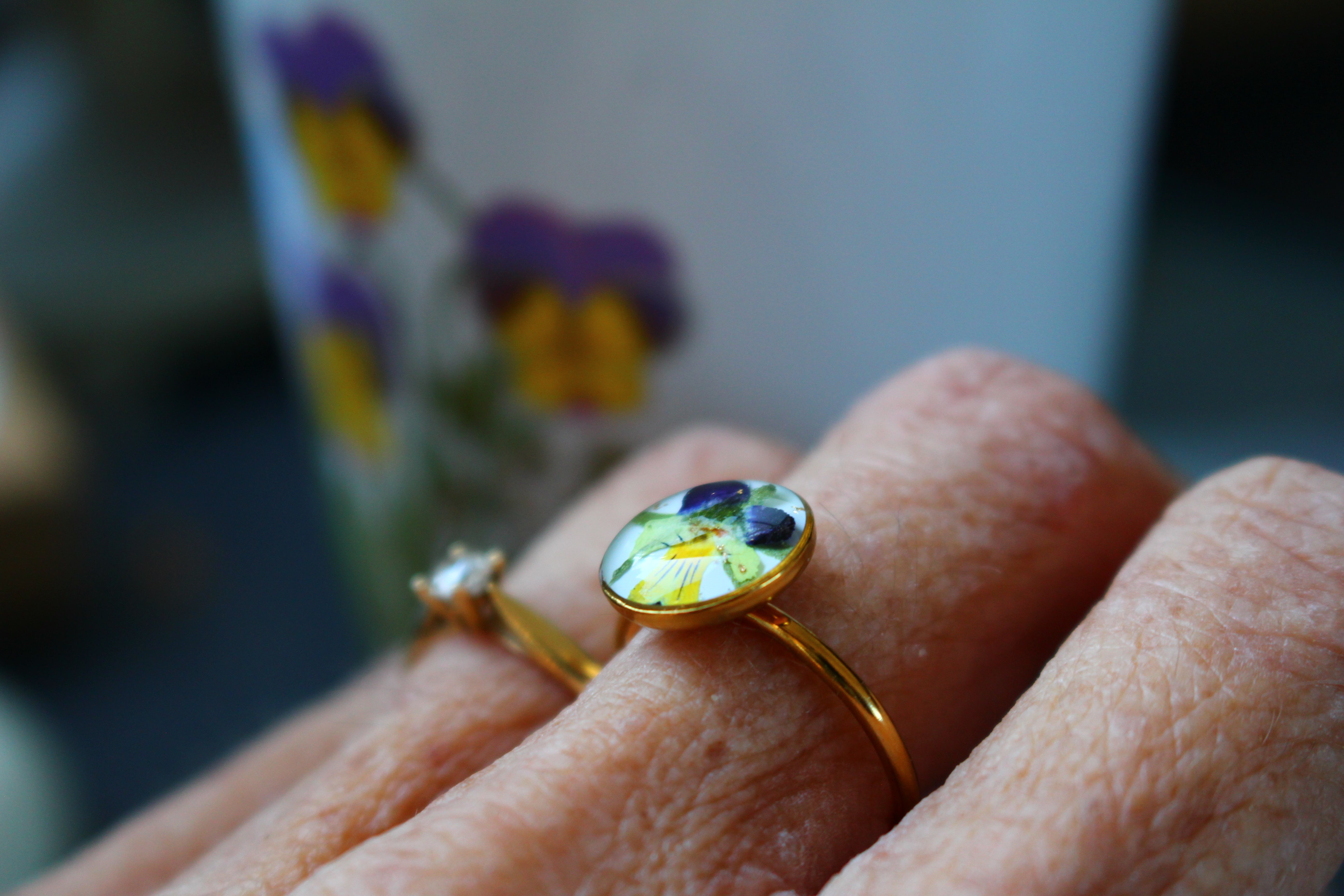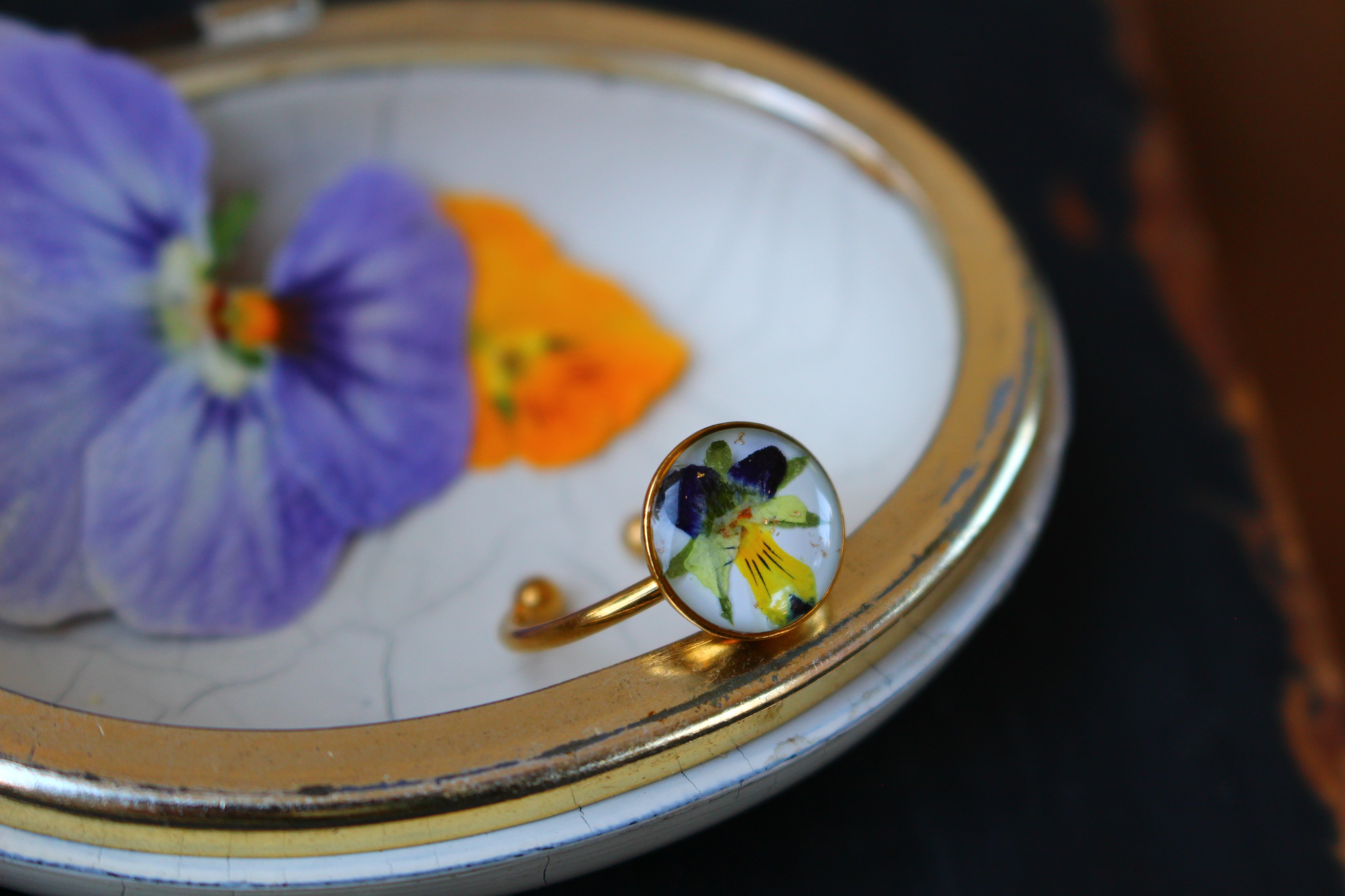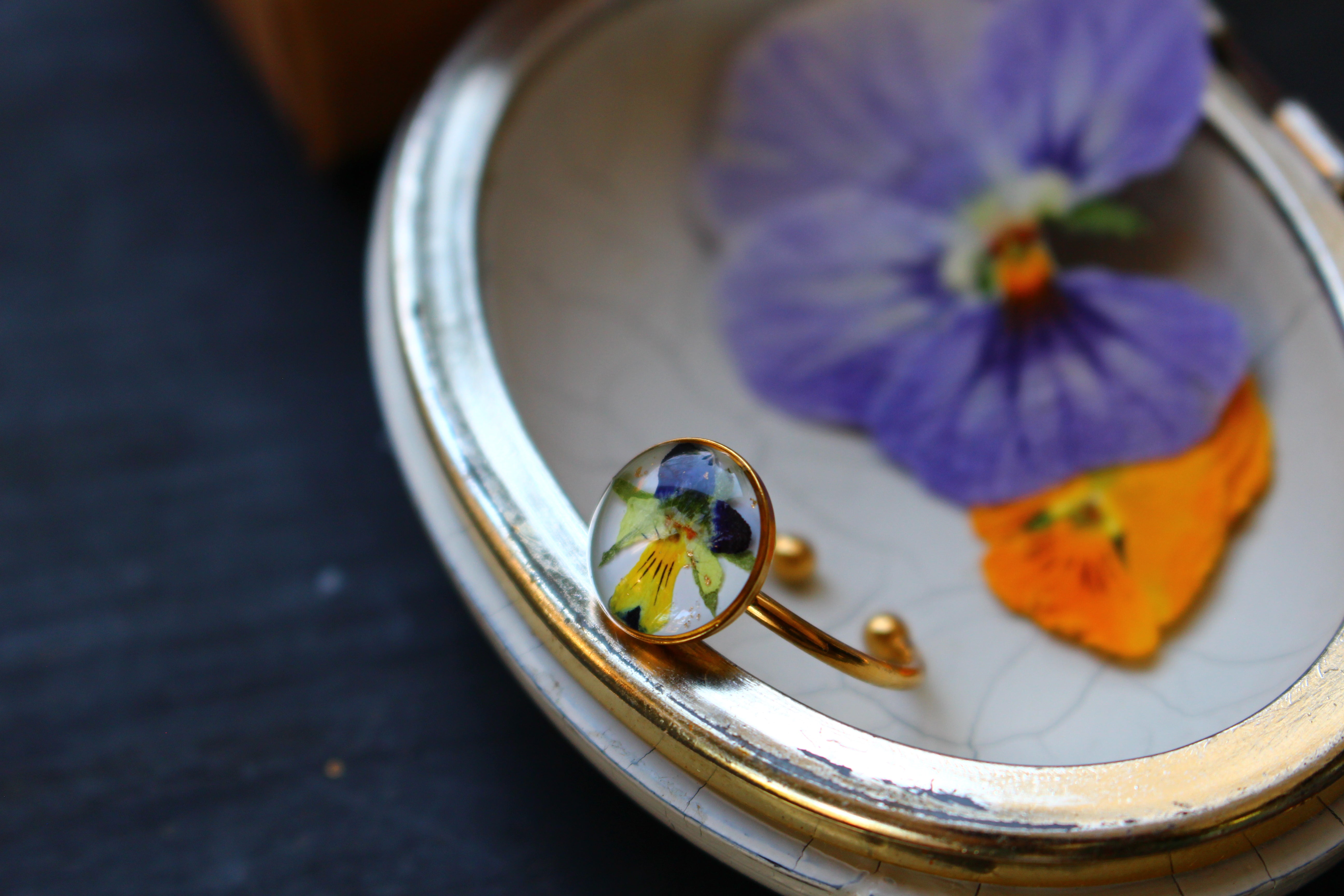 Bague composée d'un cabochon de 10mm rempli de résine dans laquelle j'ai incrusté une fleur de pensée provenant de Saint Leu sur un fond blanc