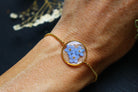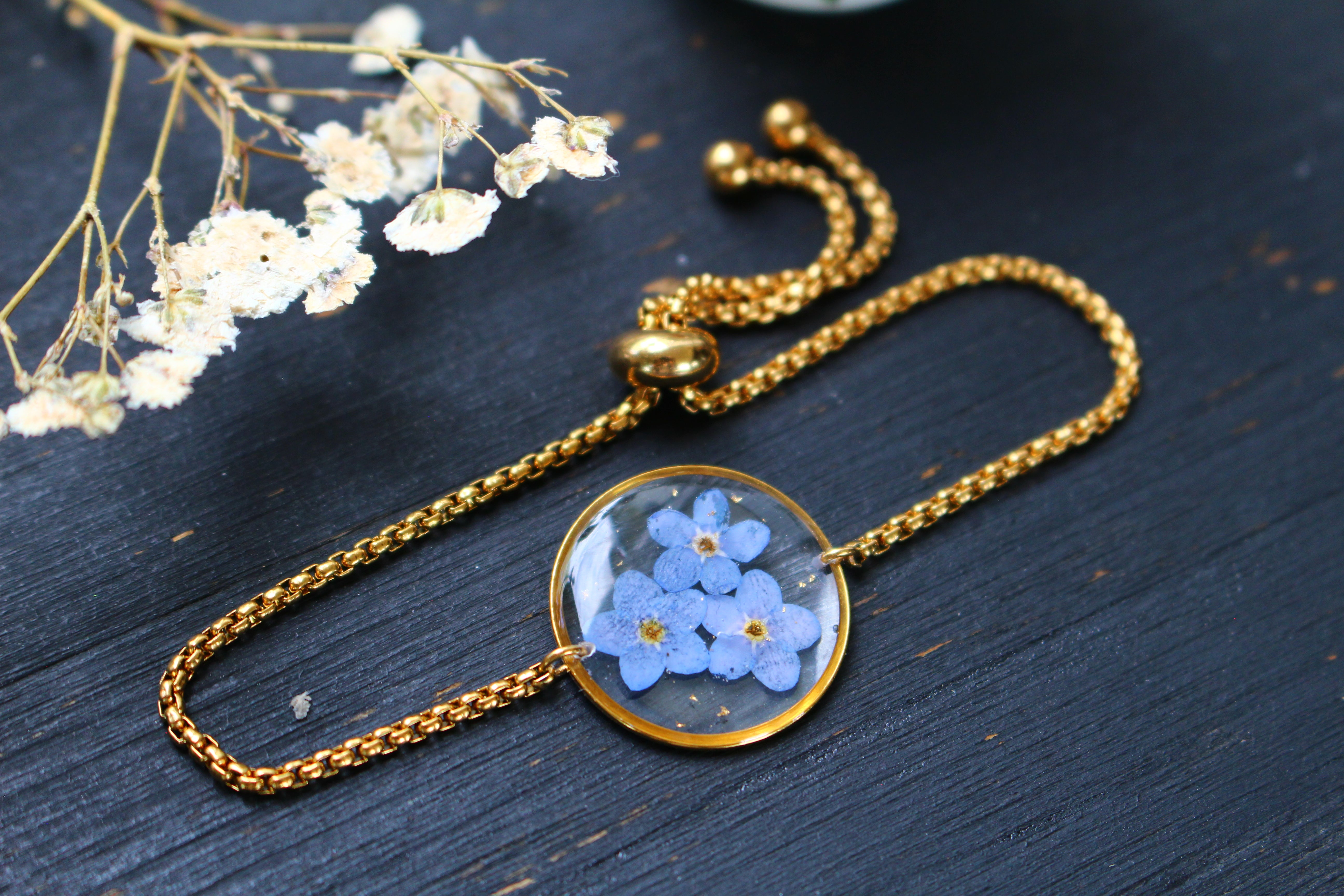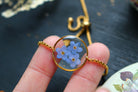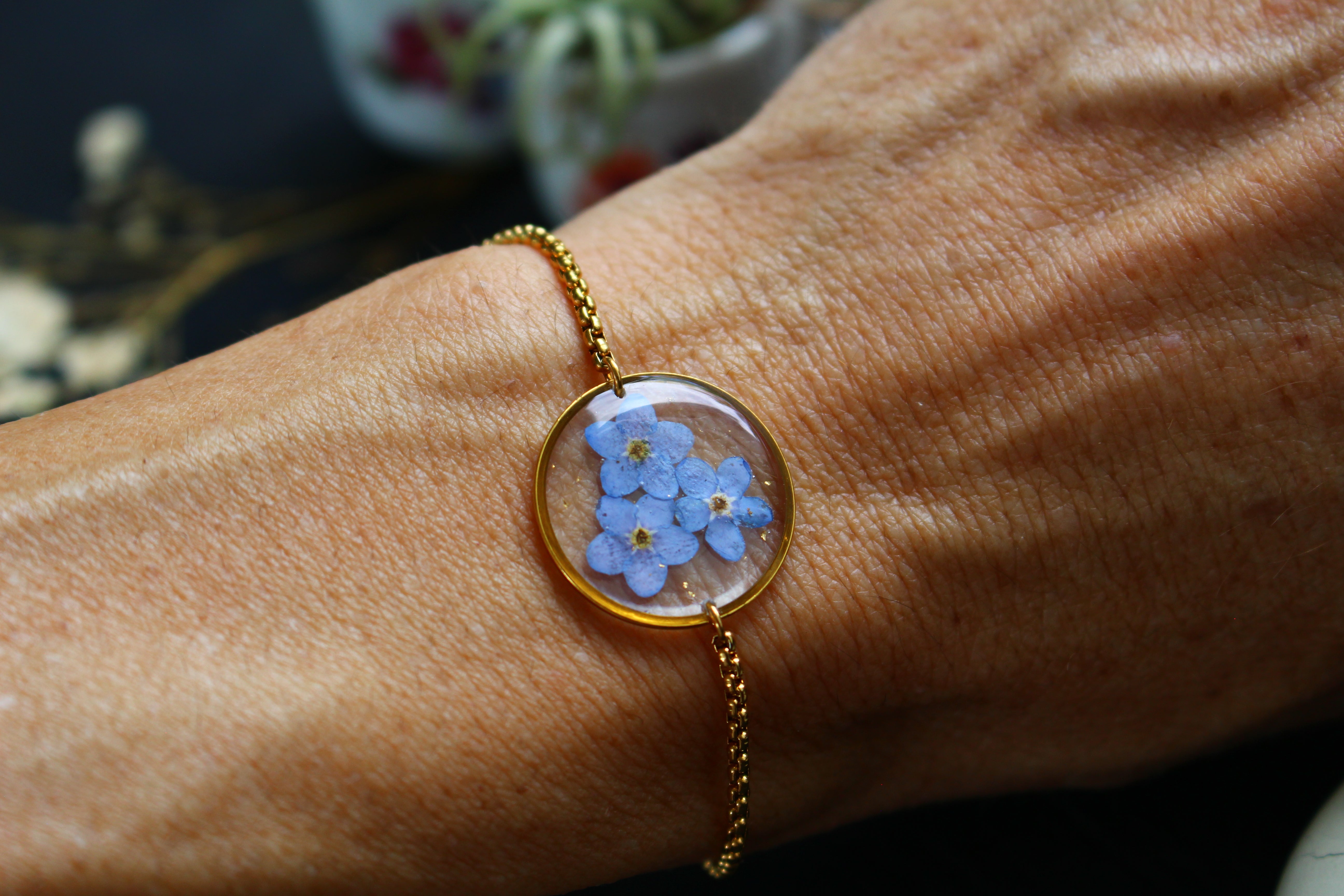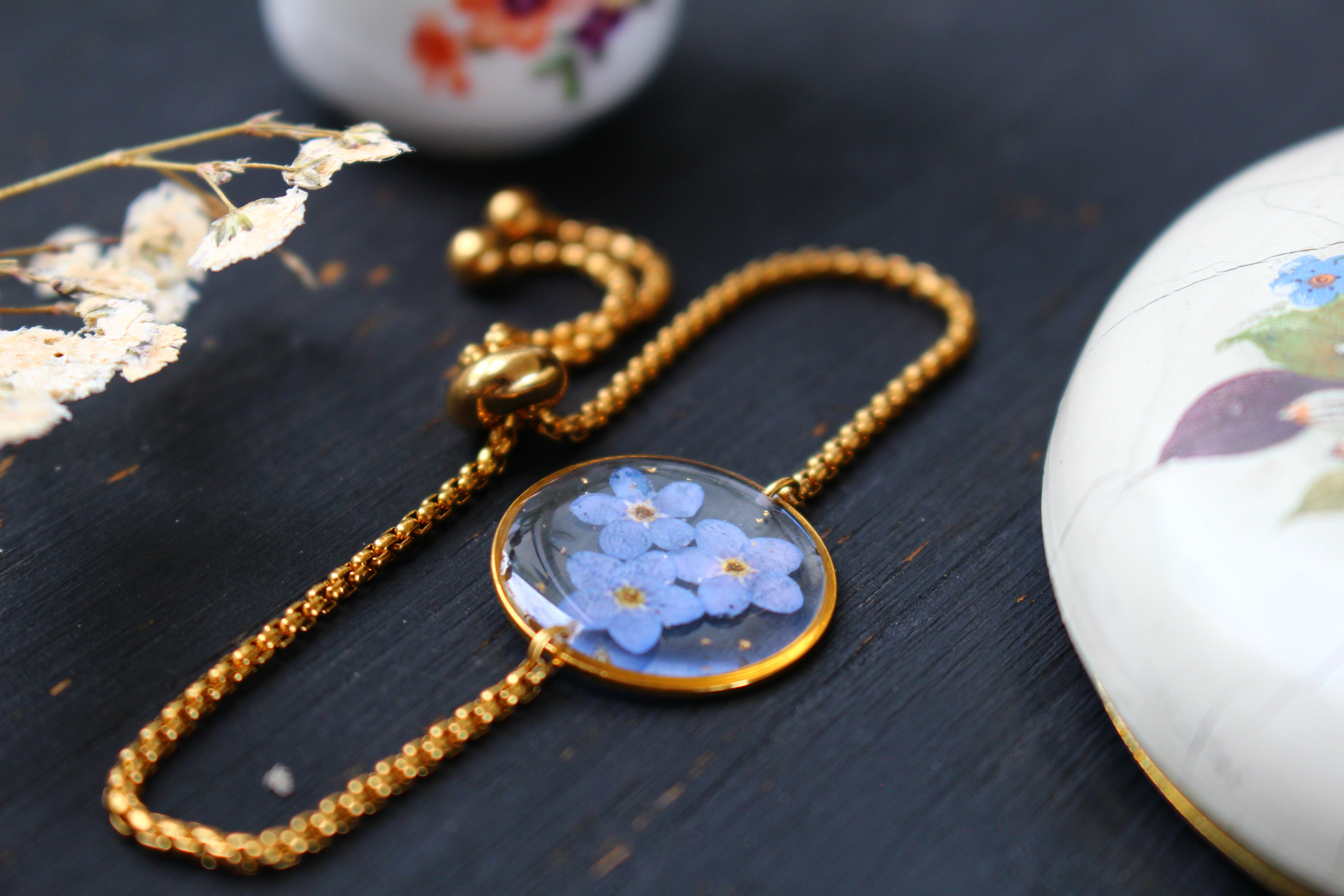 Bracelet composé d'un médaillon de 19mm de diamètre rempli de résine dans laquelle j'ai incrusté de petites fleurs de myosotis et quelques petites feuilles d'or.
