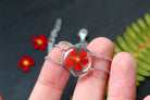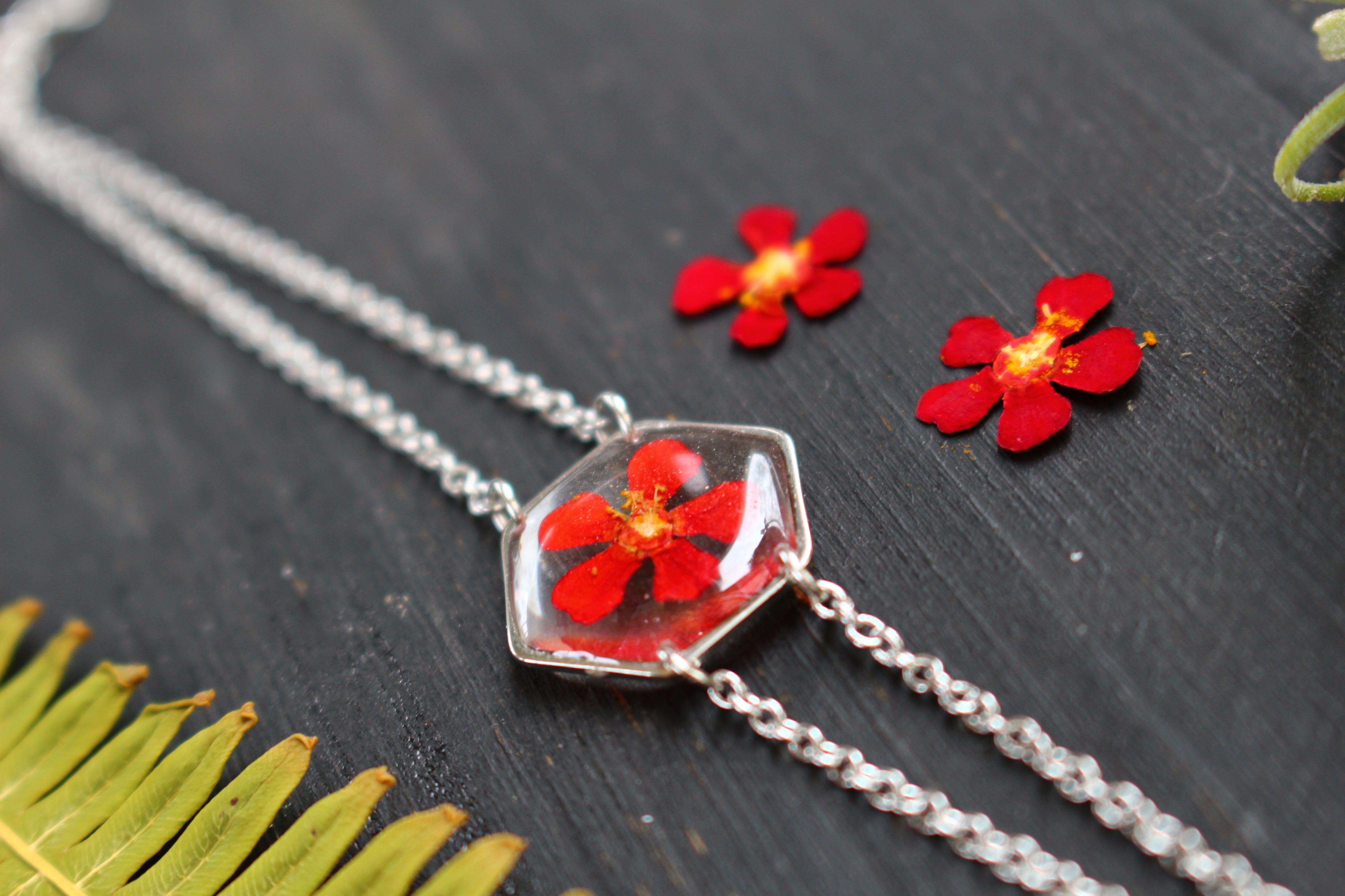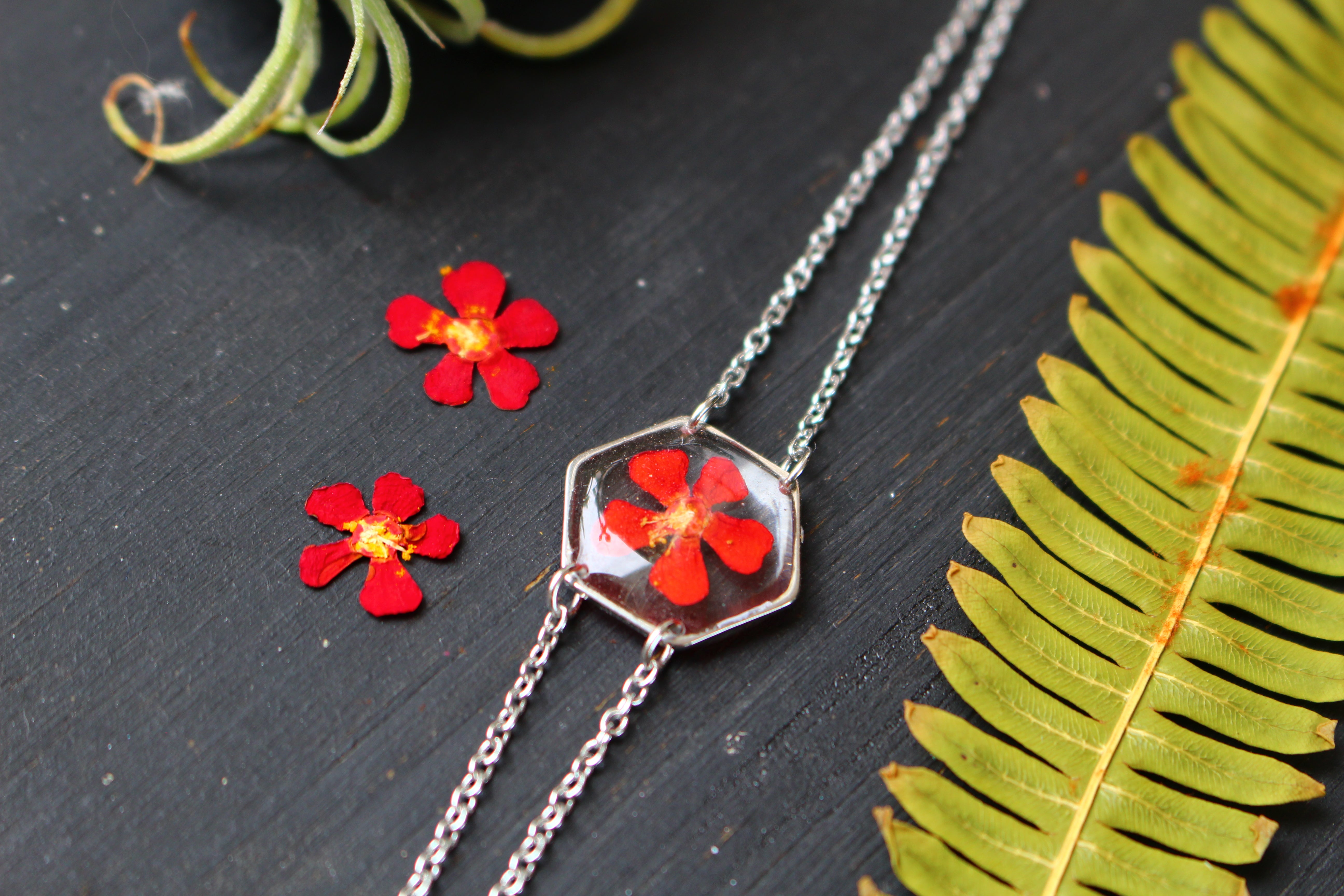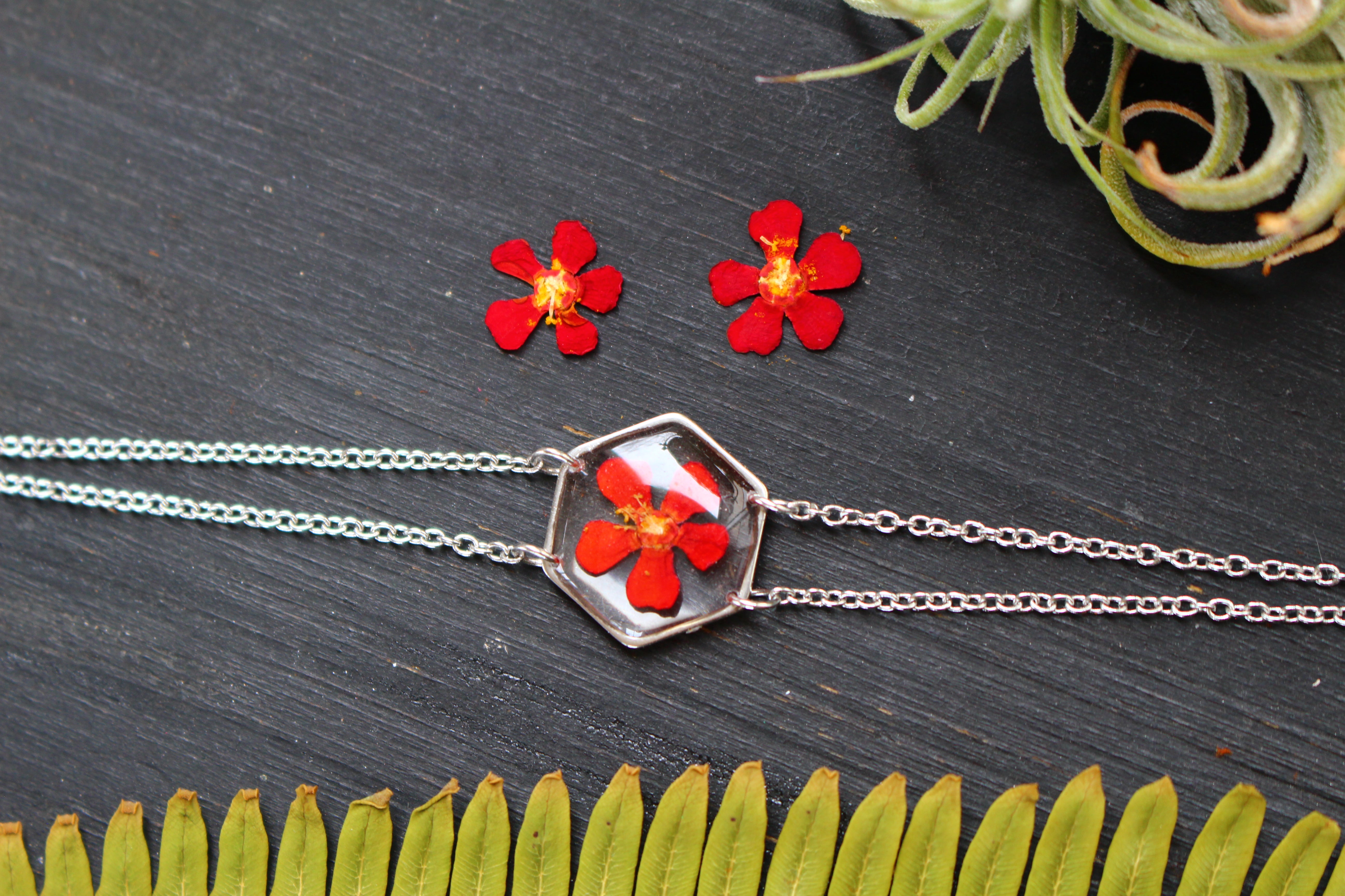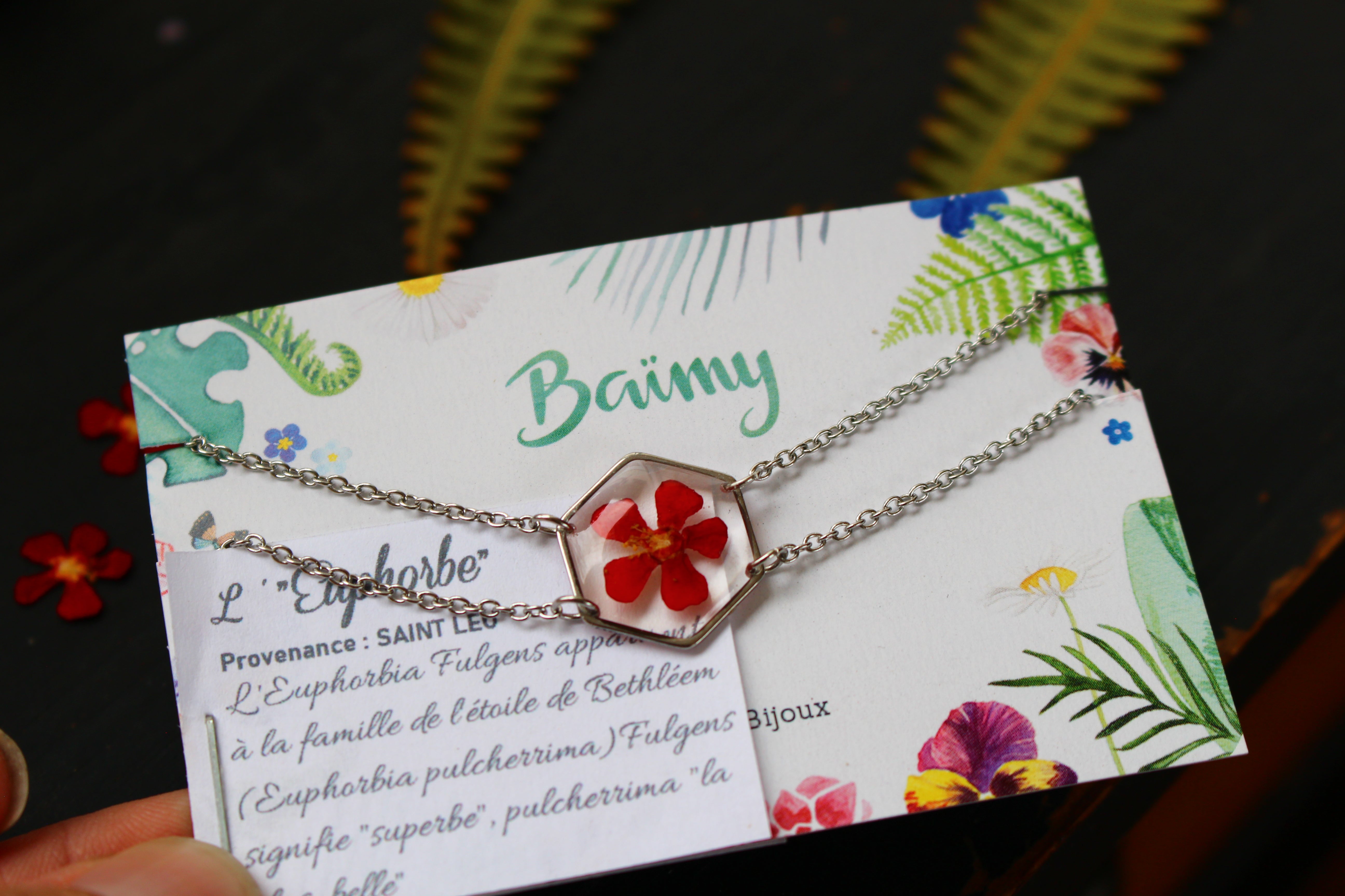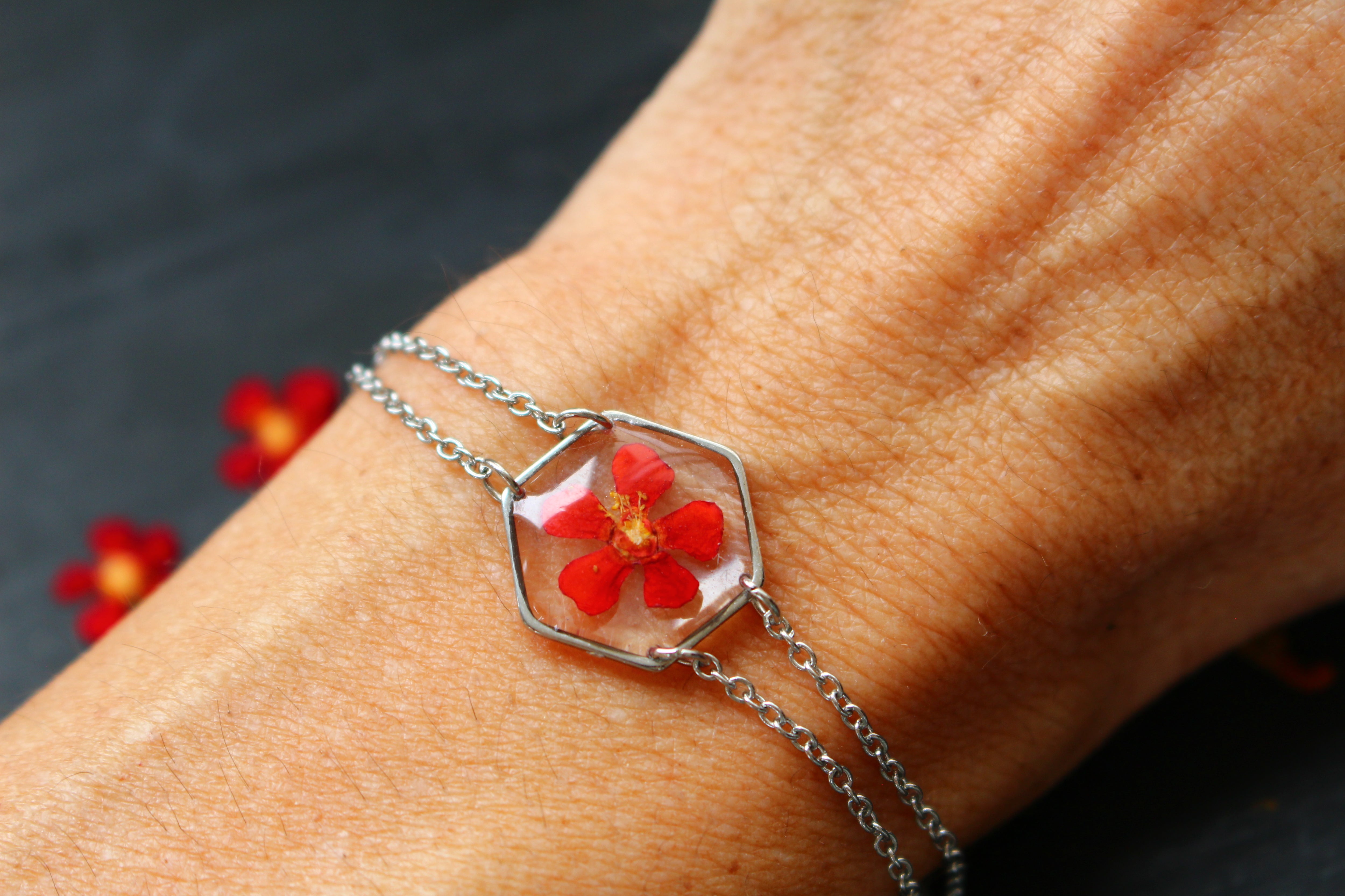 Bracelet composé d'un médaillon hexagonal rempli de résine dans laquelle j'ai incrusté une fleur d'Euphorbe provenant de Saint Leu.