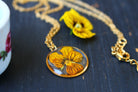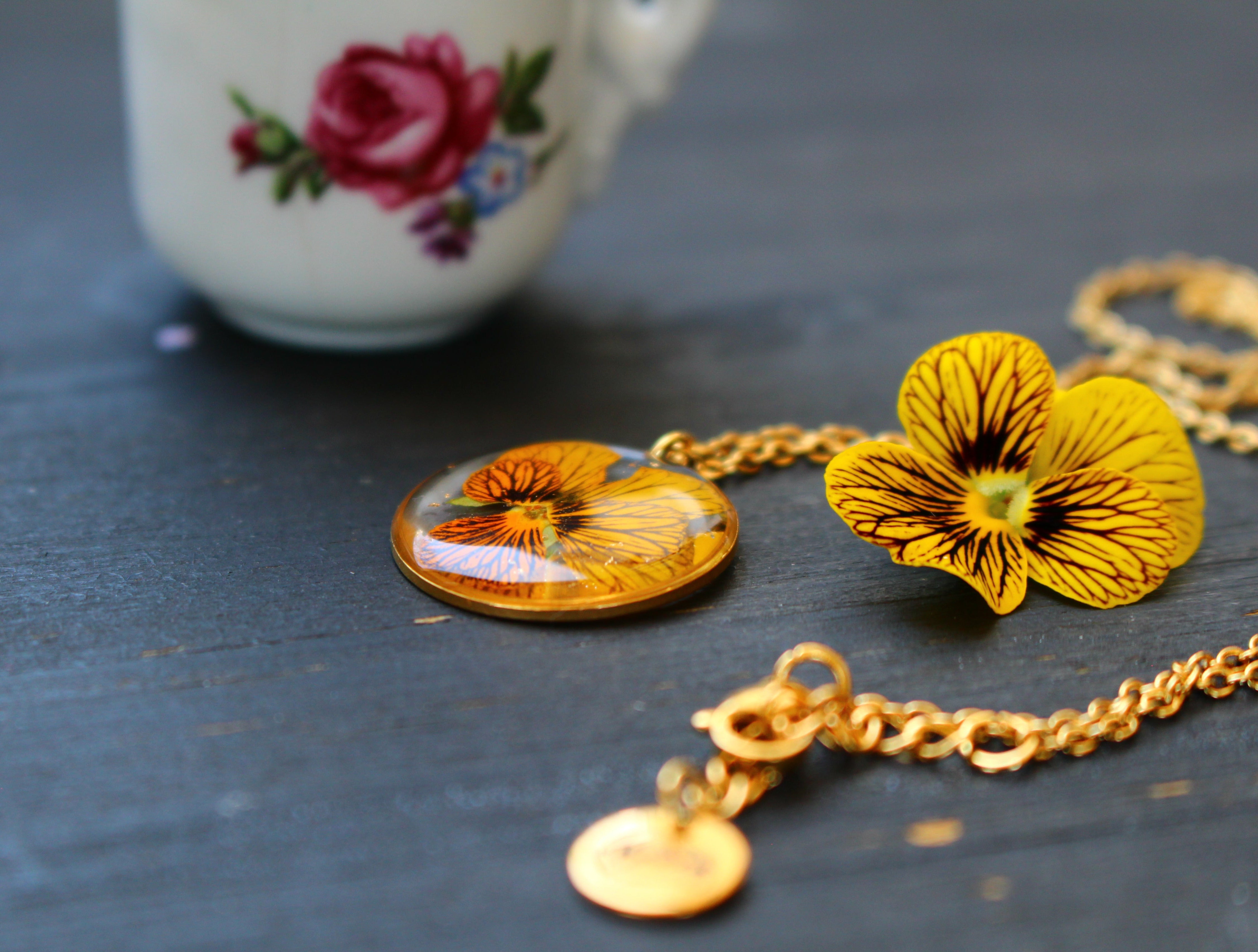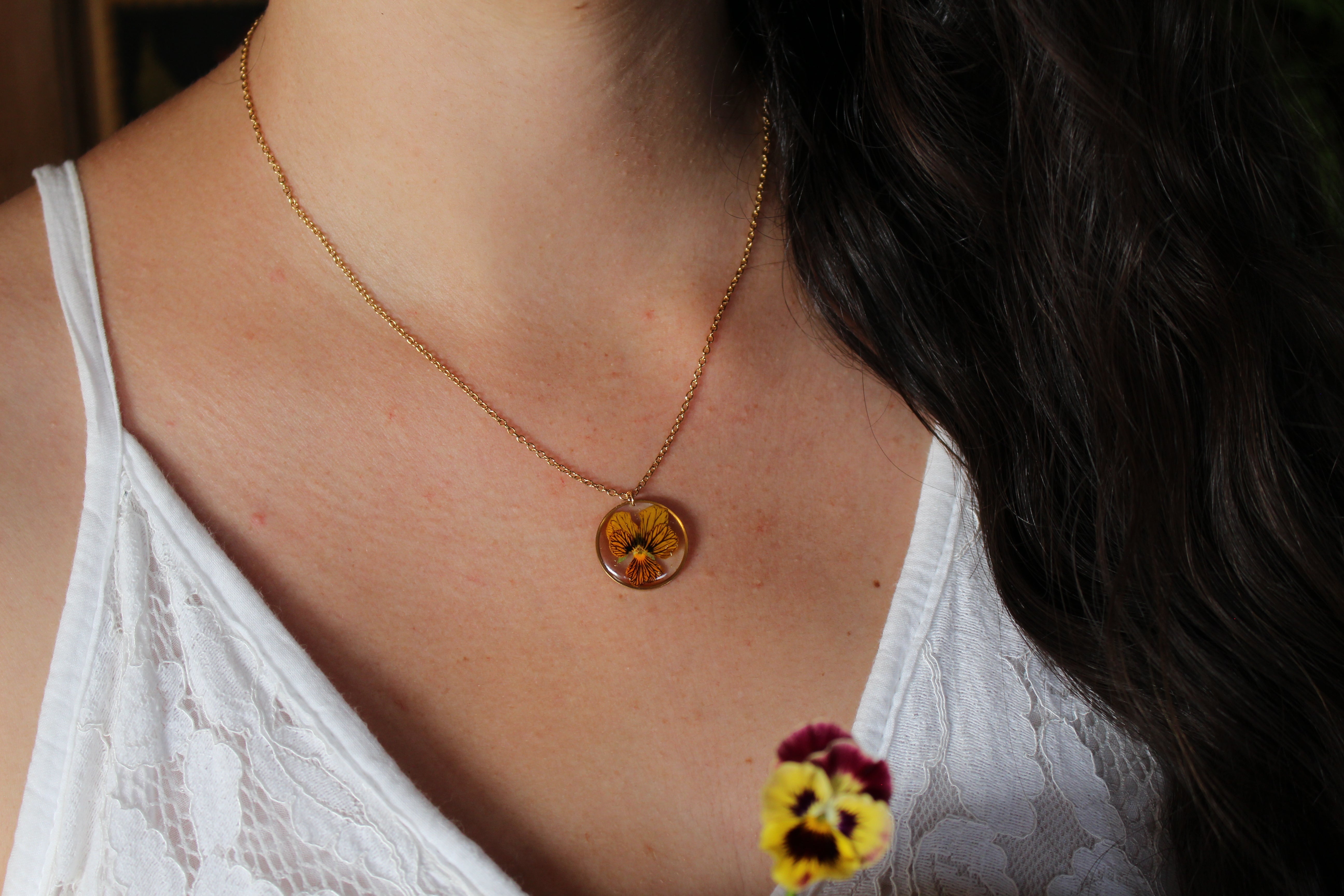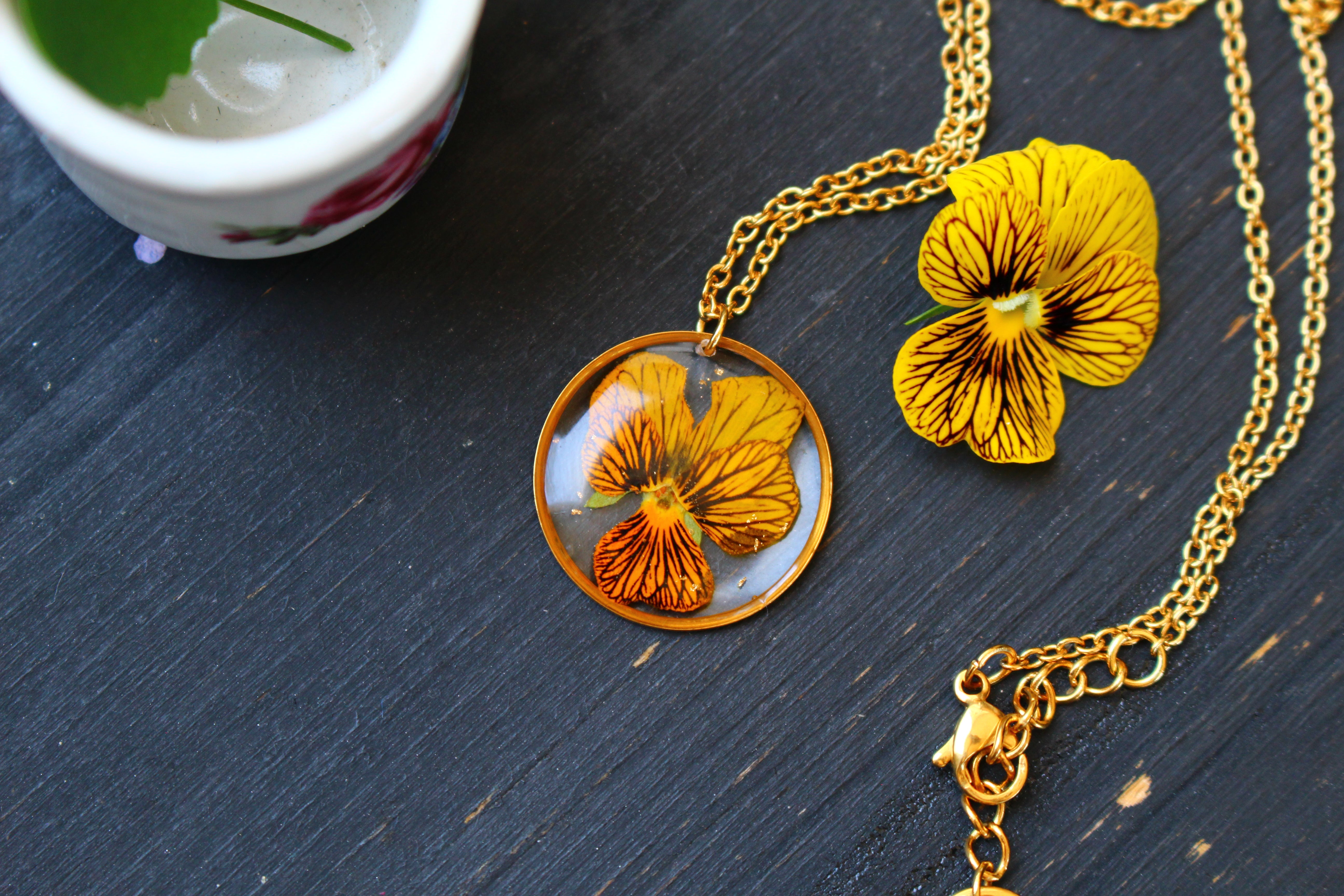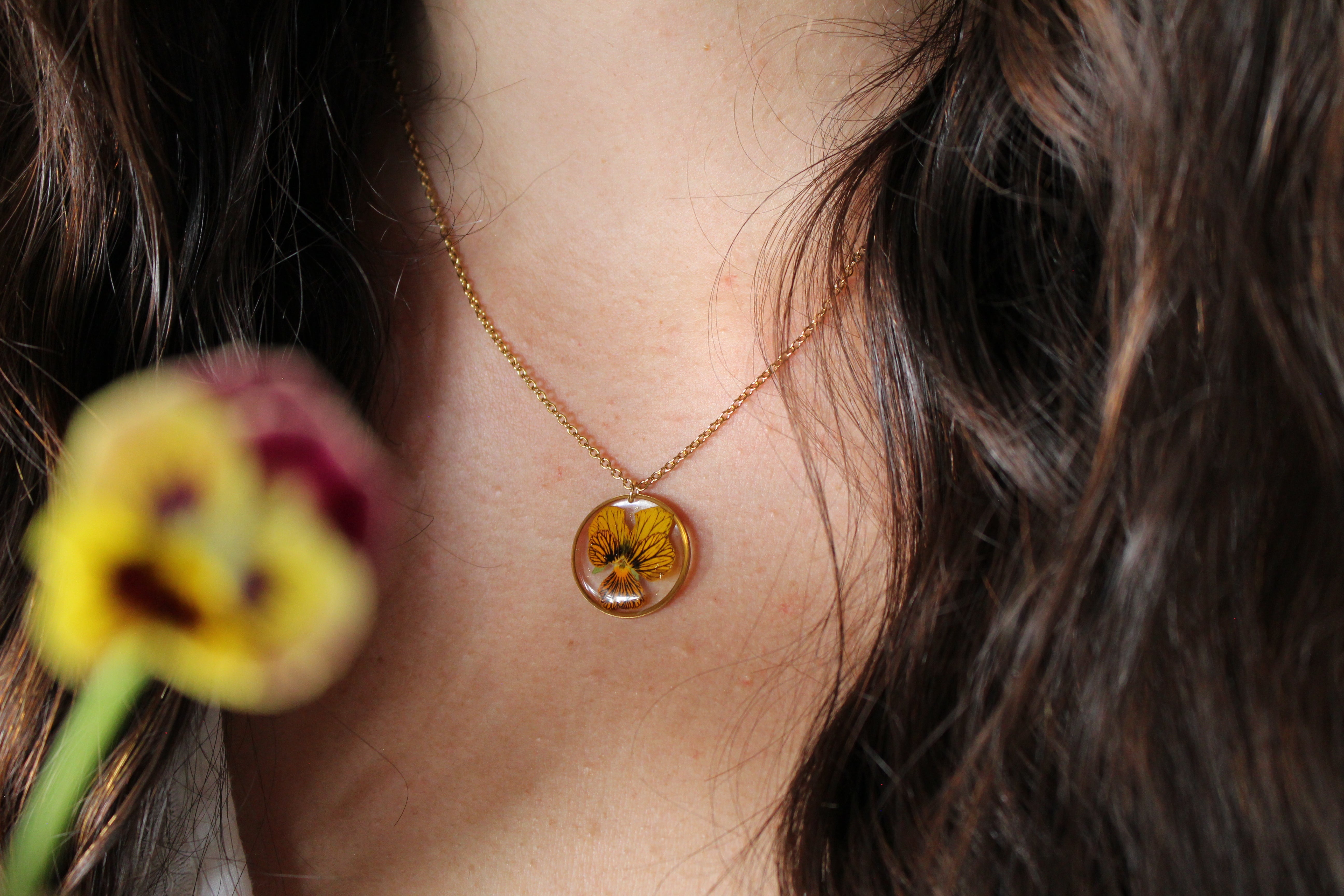 Collier composé d'un médaillon de 19mm de diamètre rempli de résine dans laquelle j'ai incrusté une fleur de pensée provenant de Saint Leu et quelques particules de feuilles d'or.