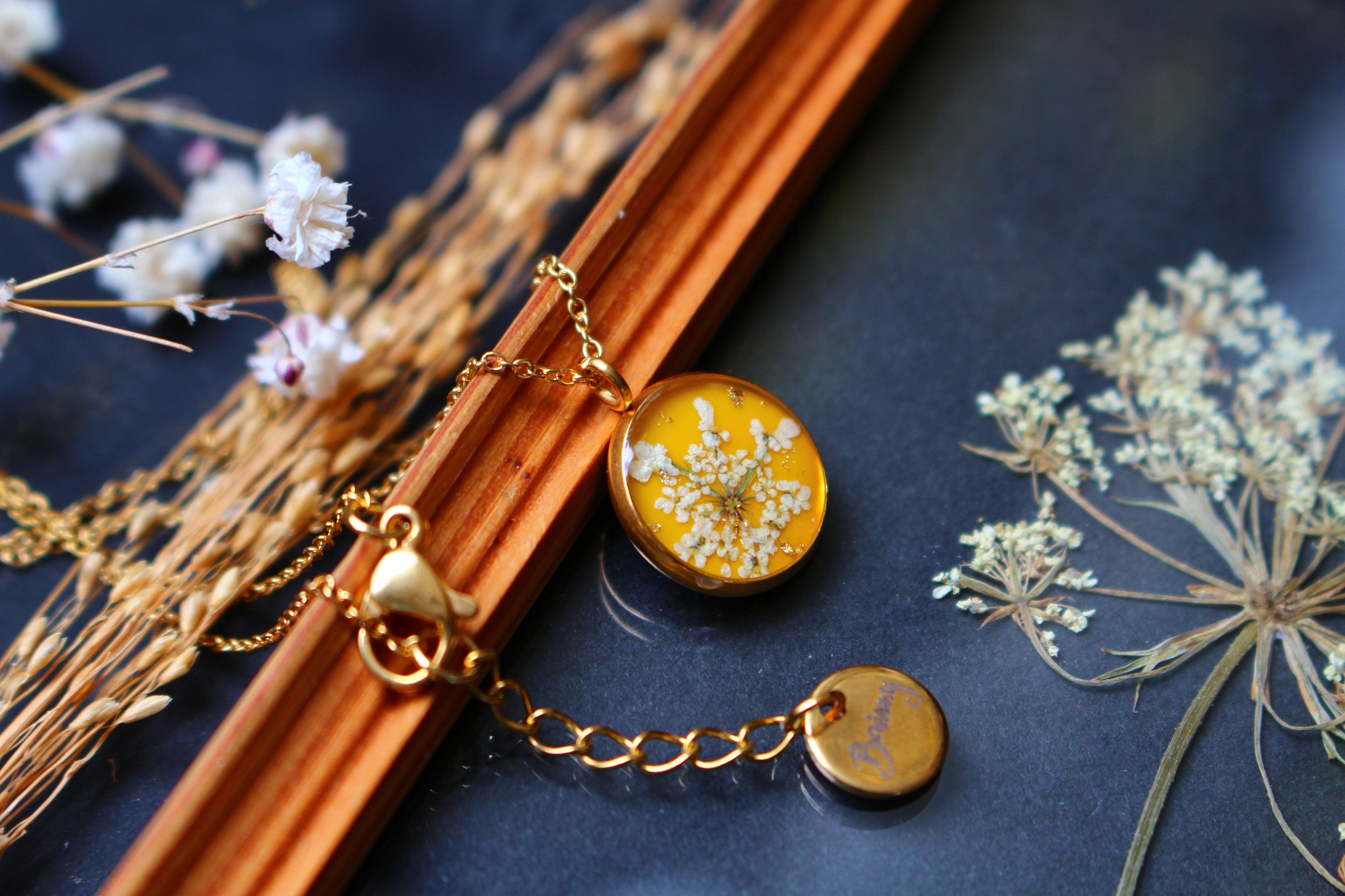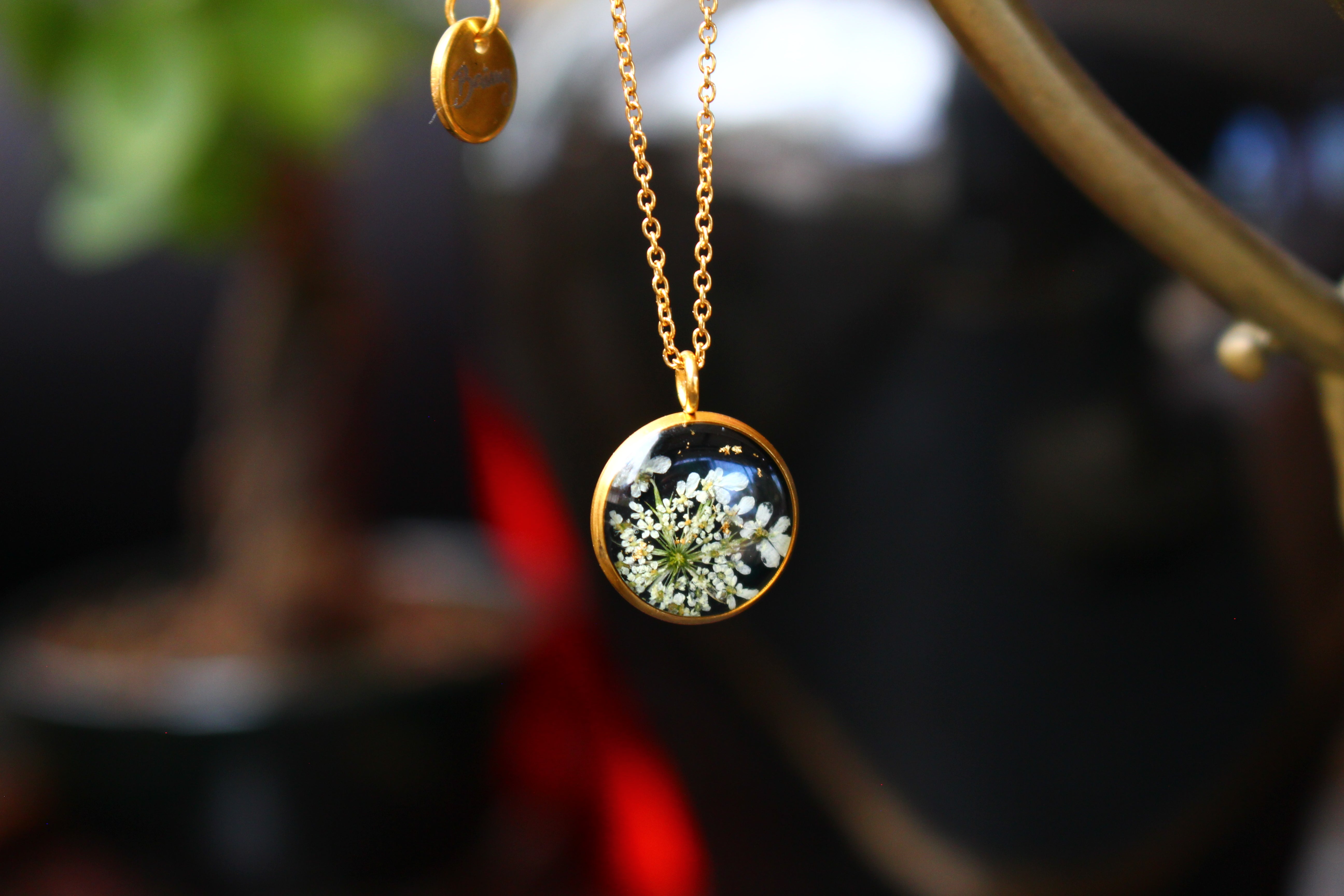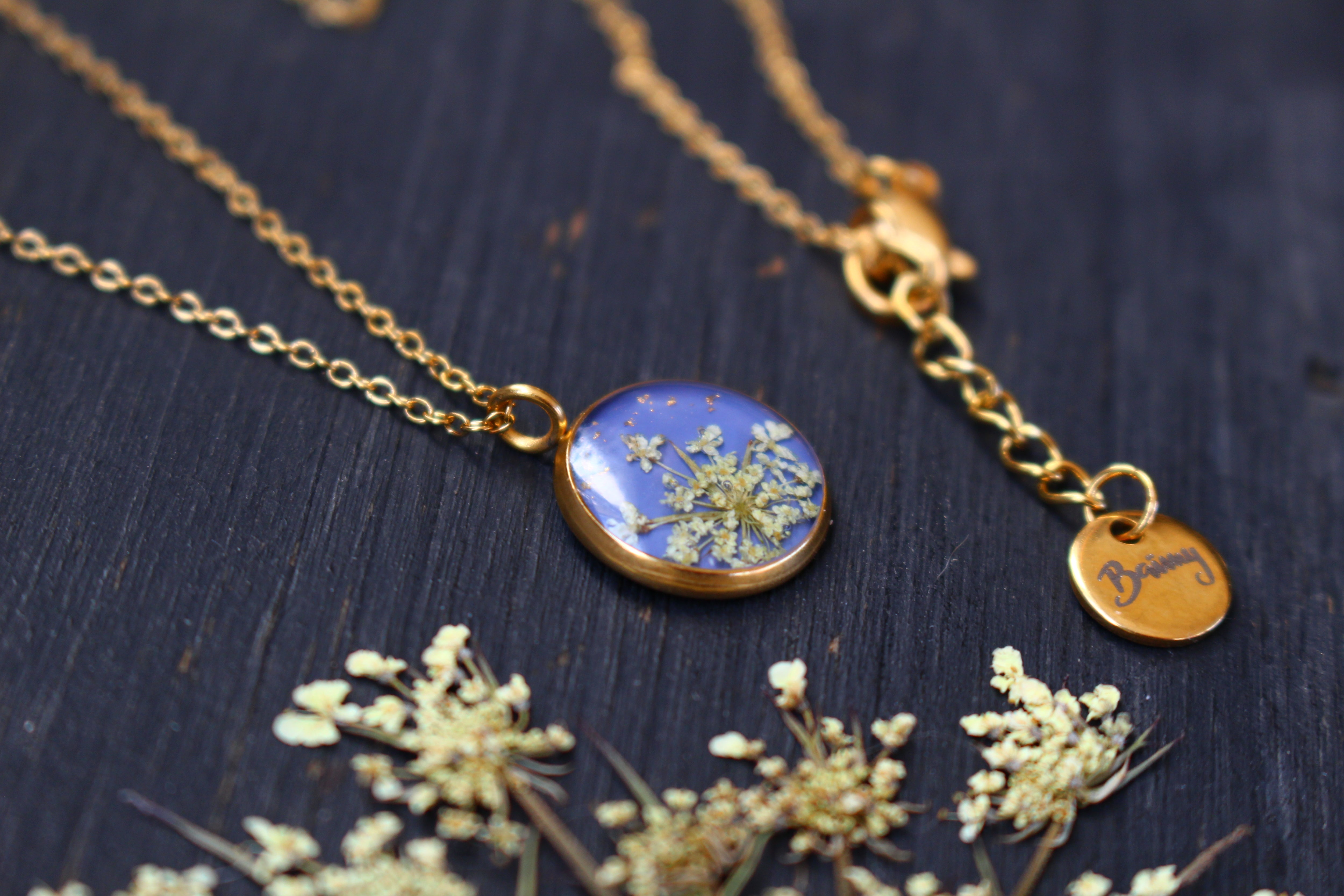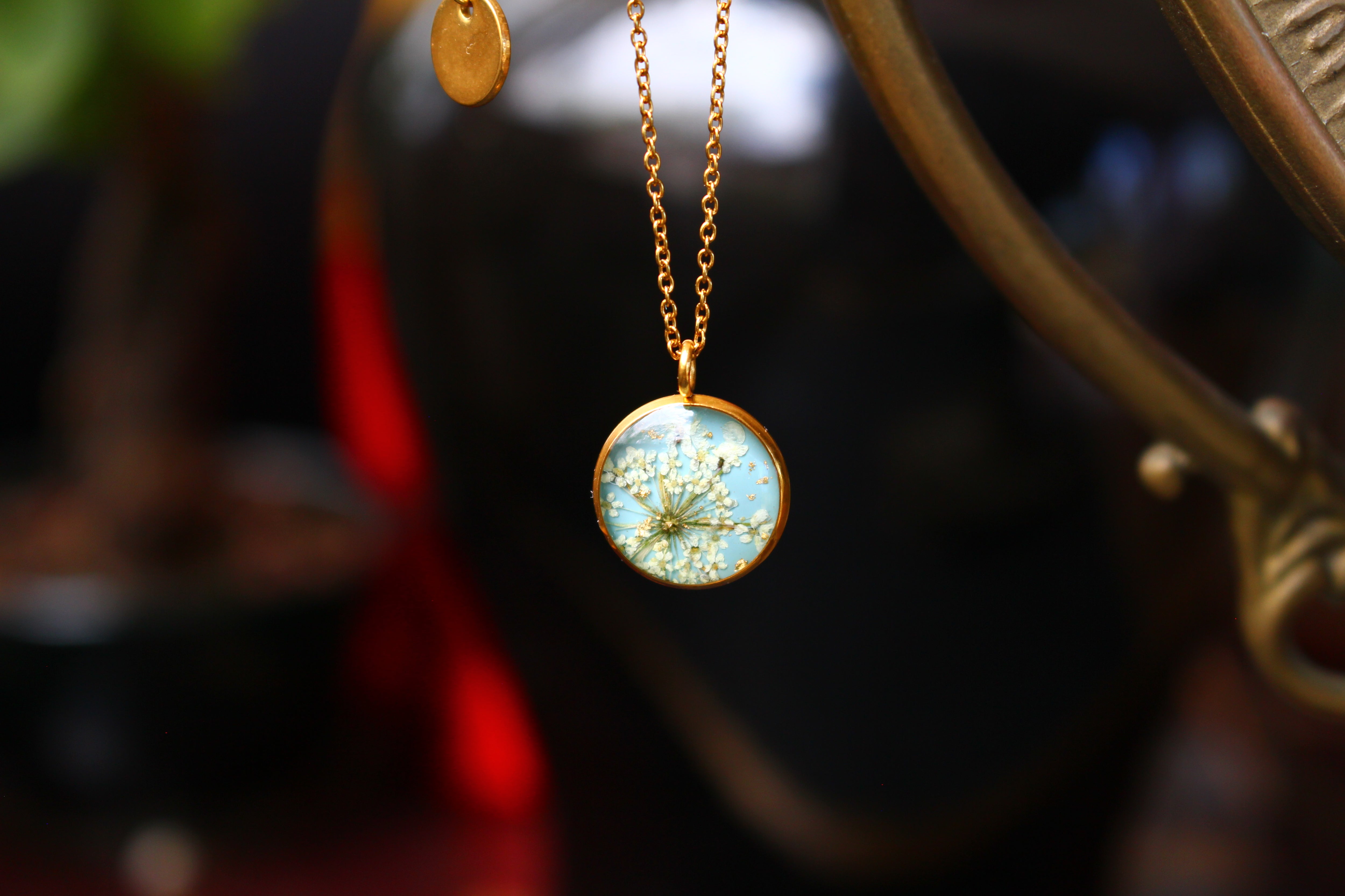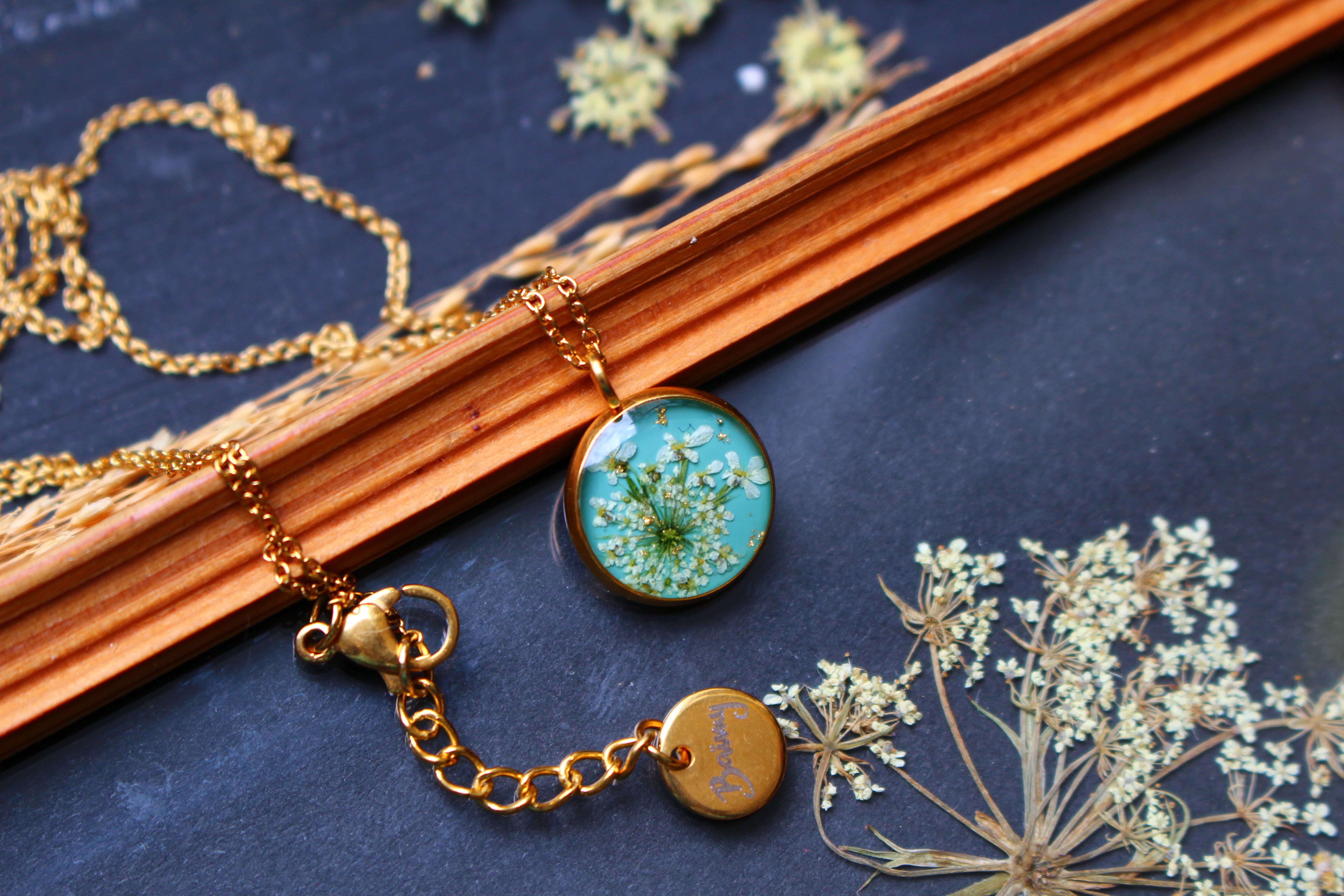 Collier composé d'un médaillon de 12mm de diamètre dans lequel j'ai incrusté dans de la résine, des petites fleurs séchées appelées dentelle de la Reine d'Anne et quelques feuilles d'or