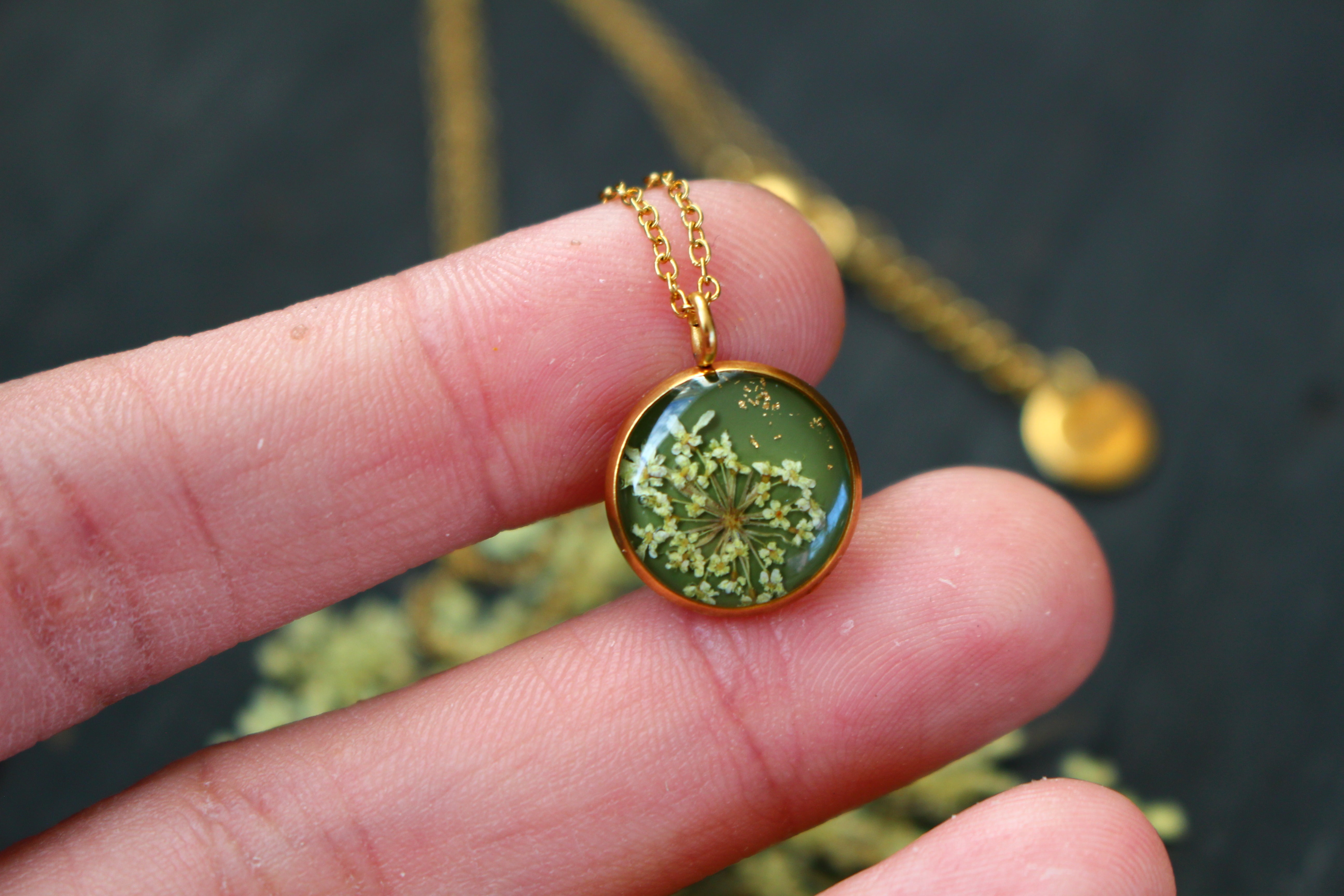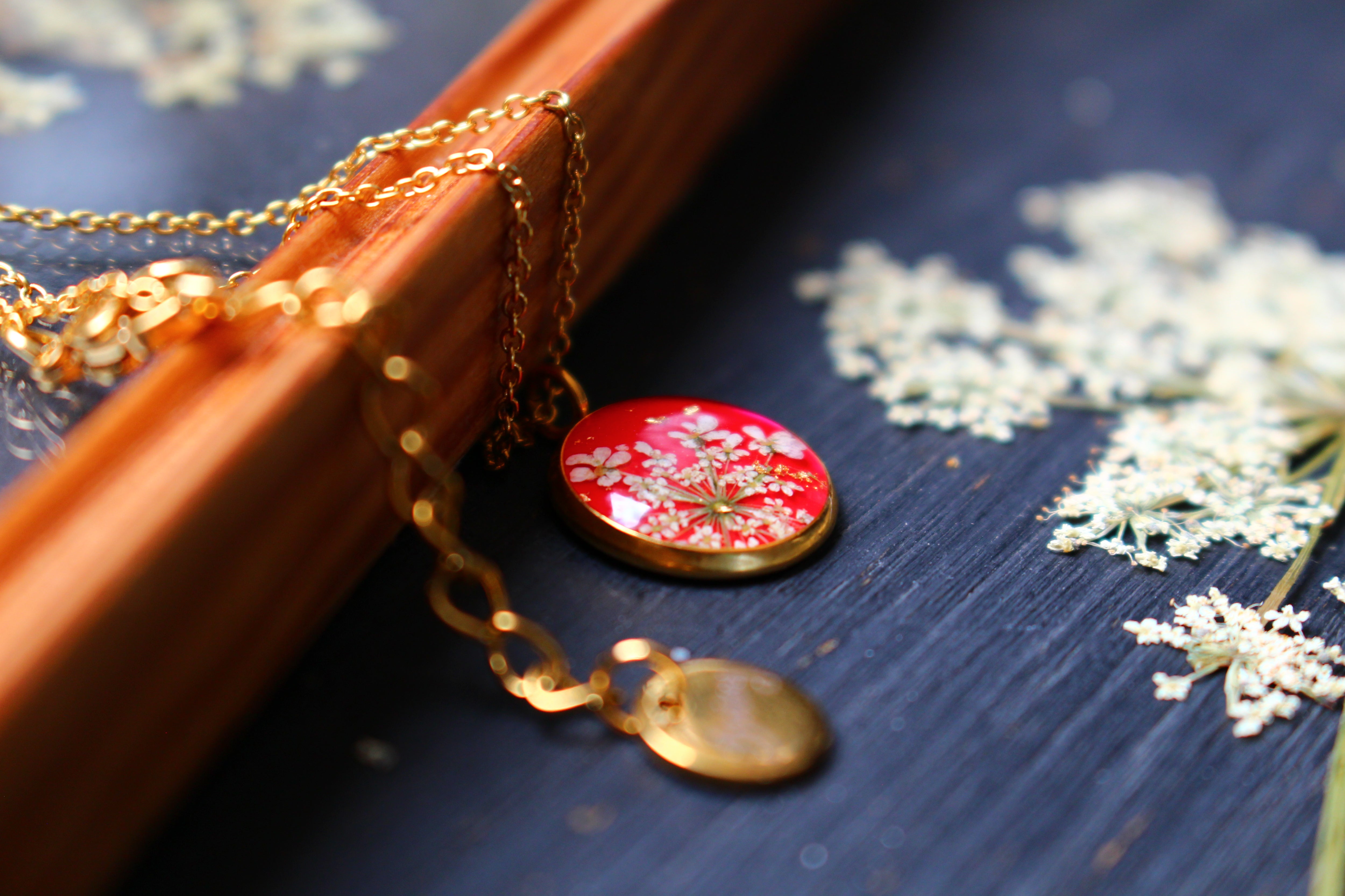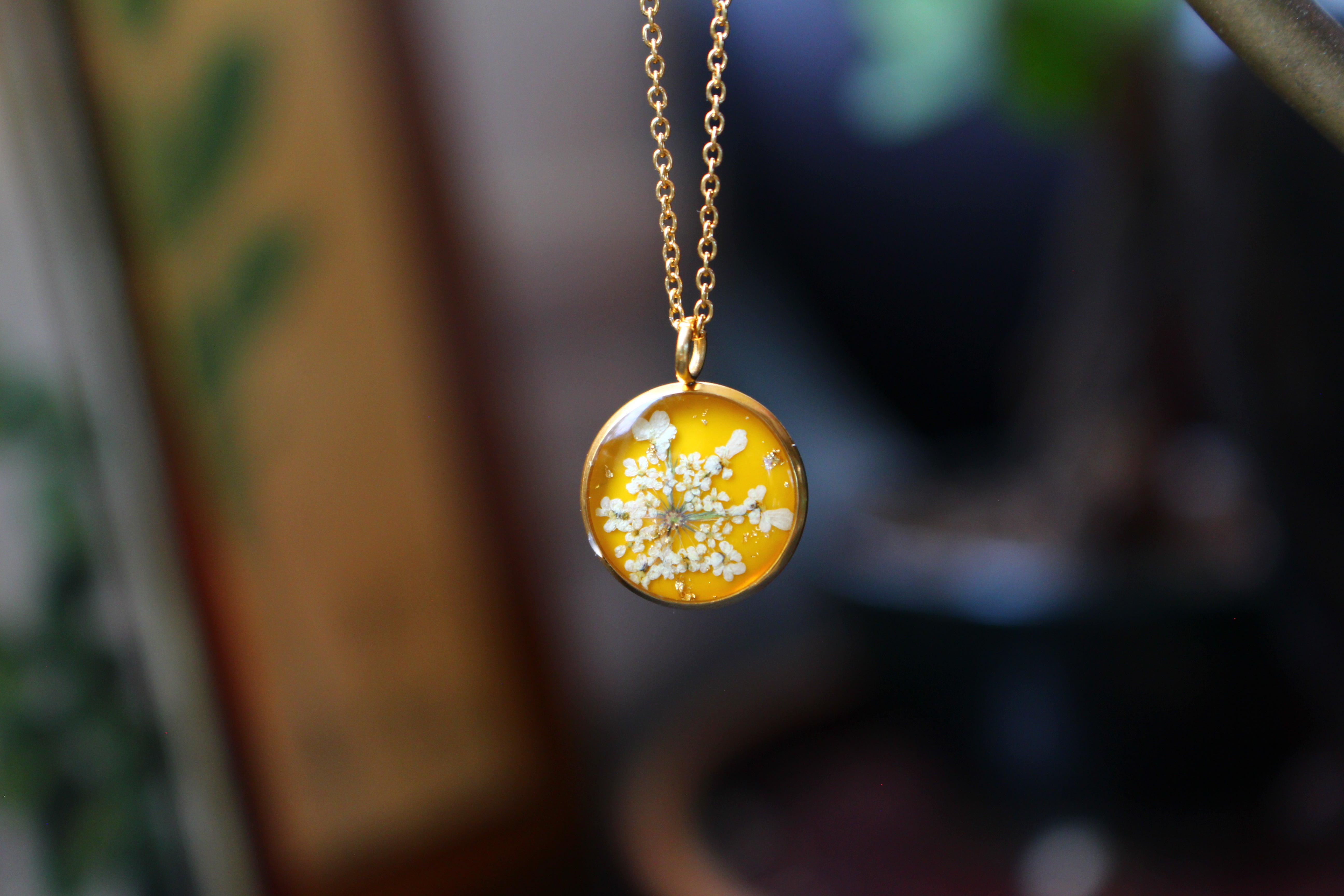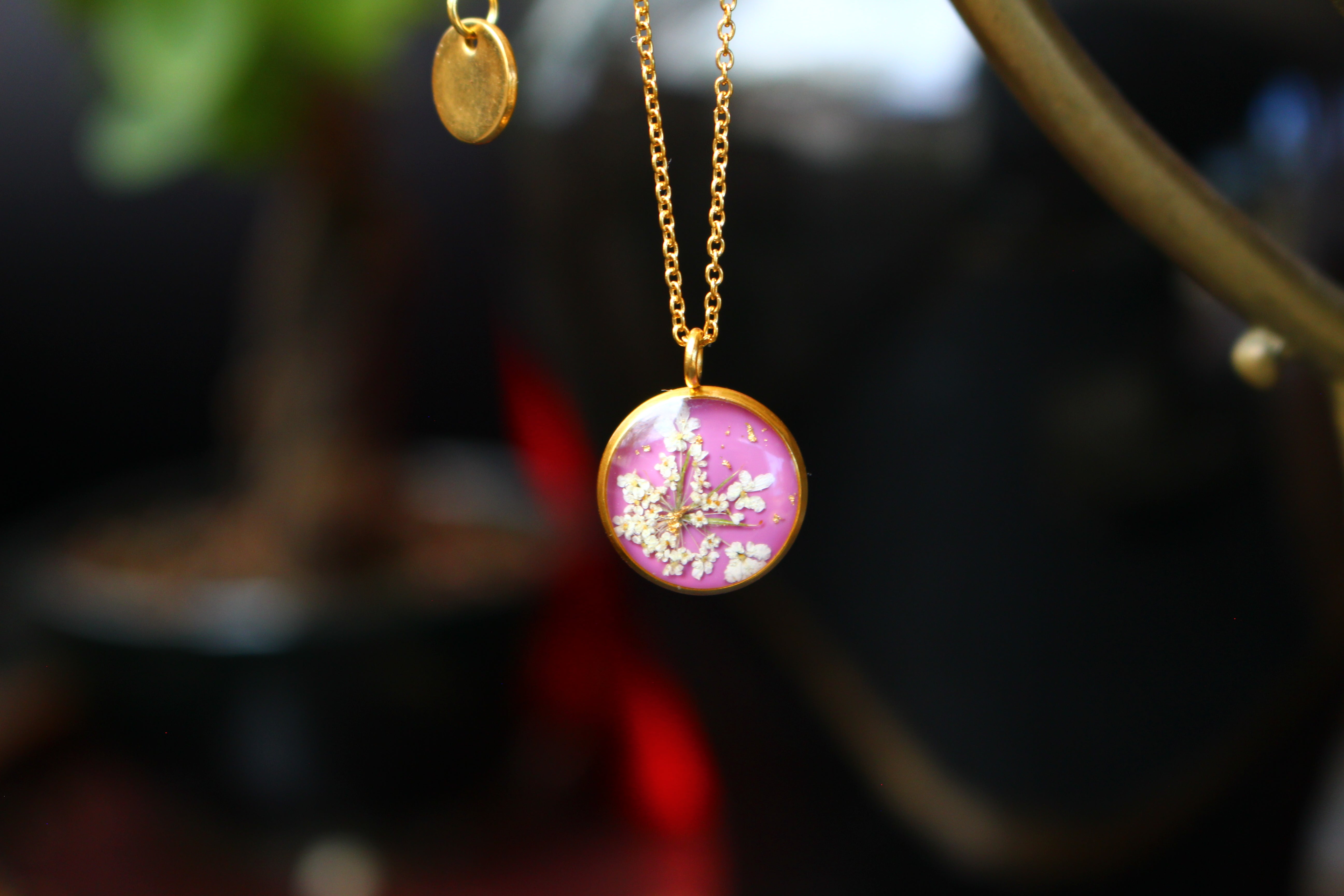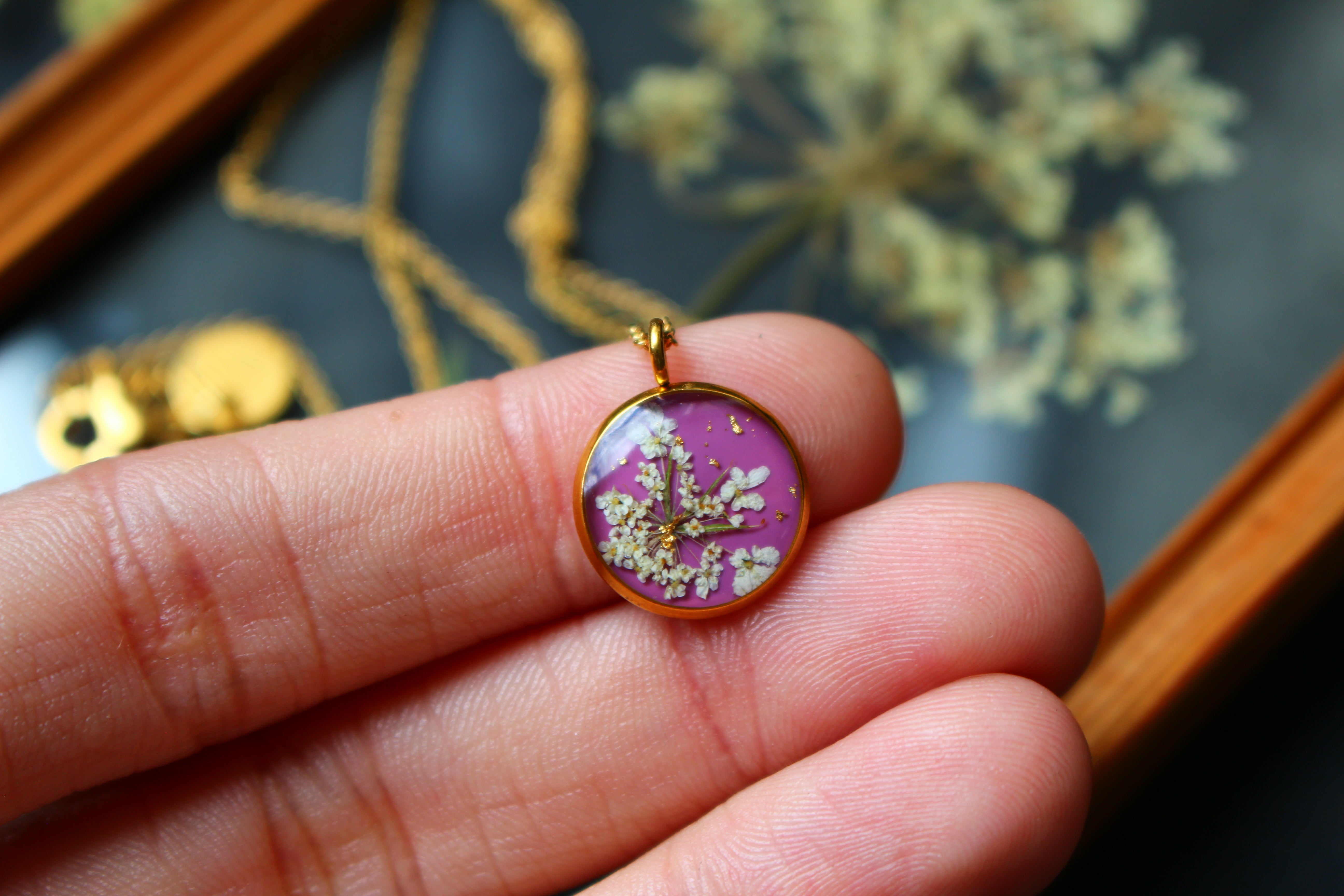 Collier composé d'un médaillon de 12mm de diamètre dans lequel j'ai incrusté dans de la résine, des petites fleurs séchées appelées dentelle de la Reine d'Anne et quelques feuilles d'or