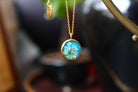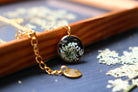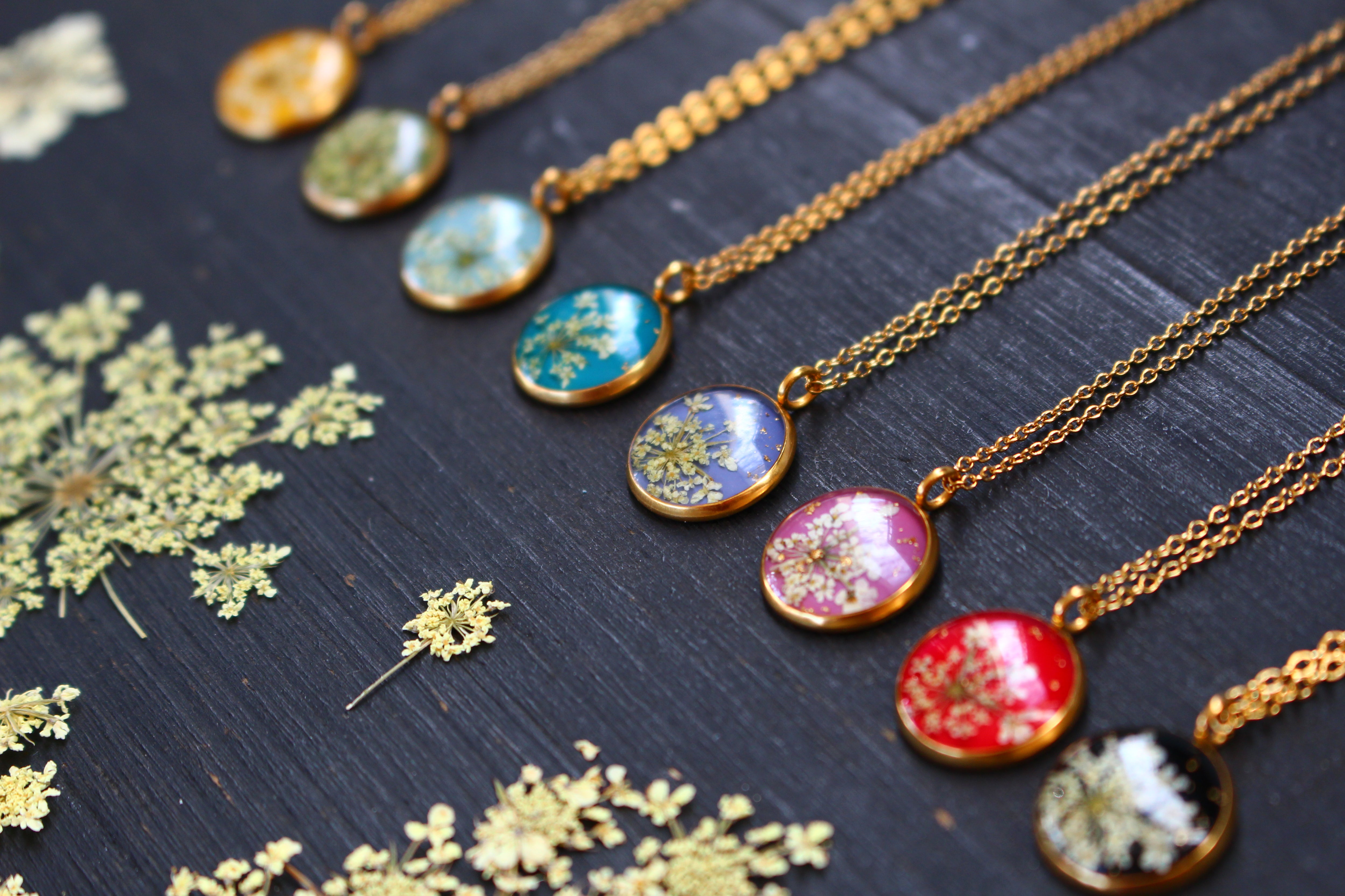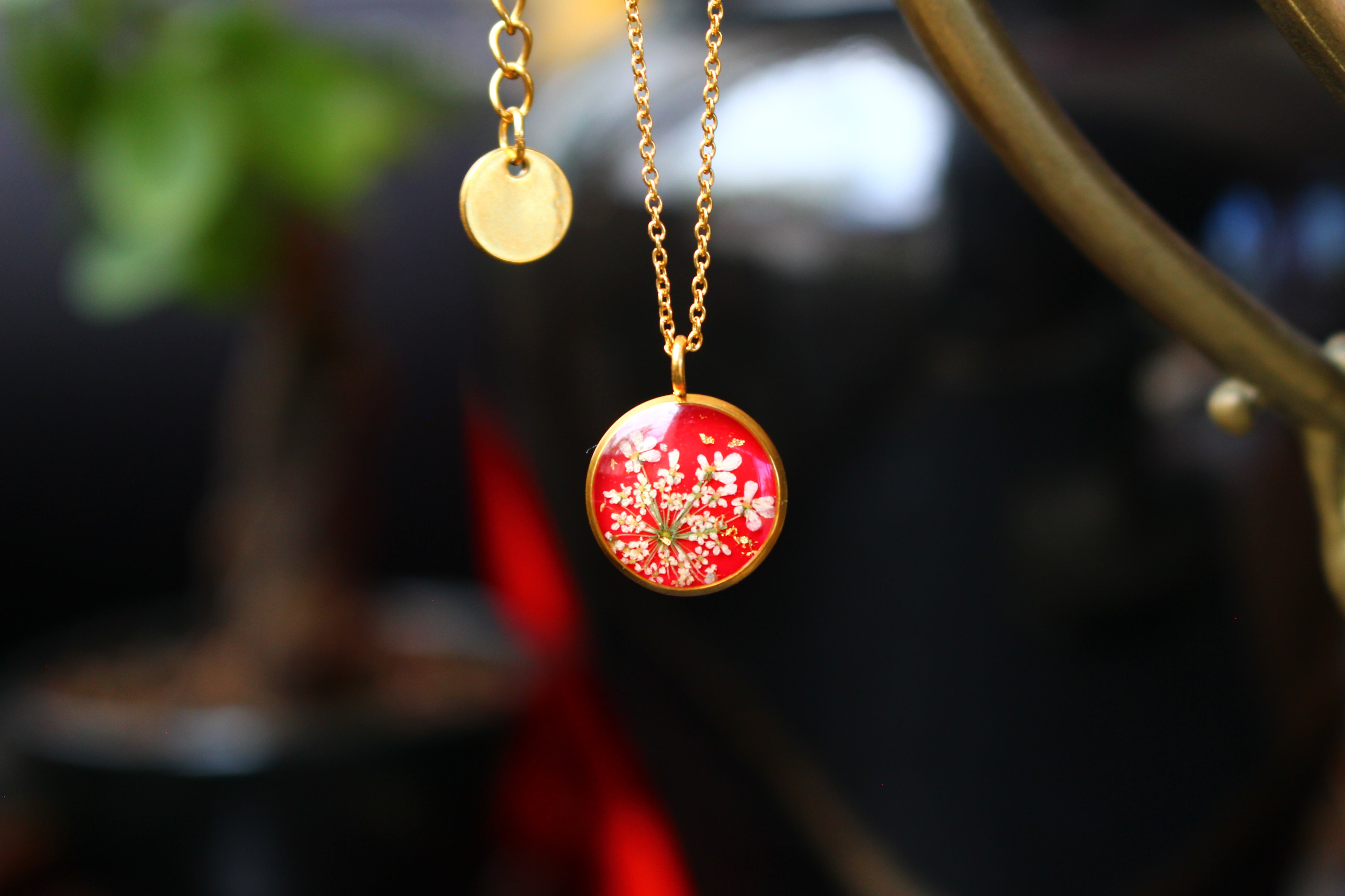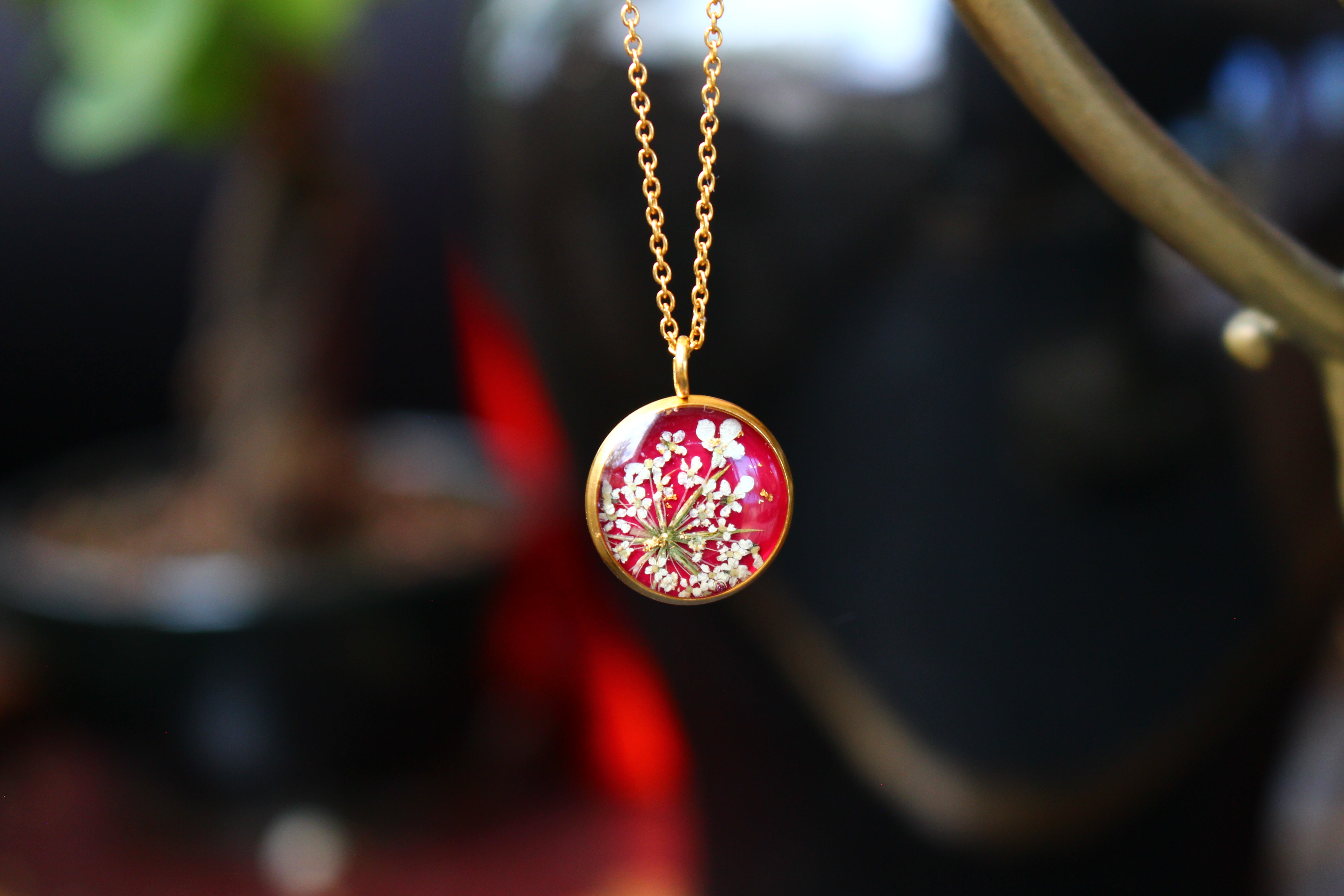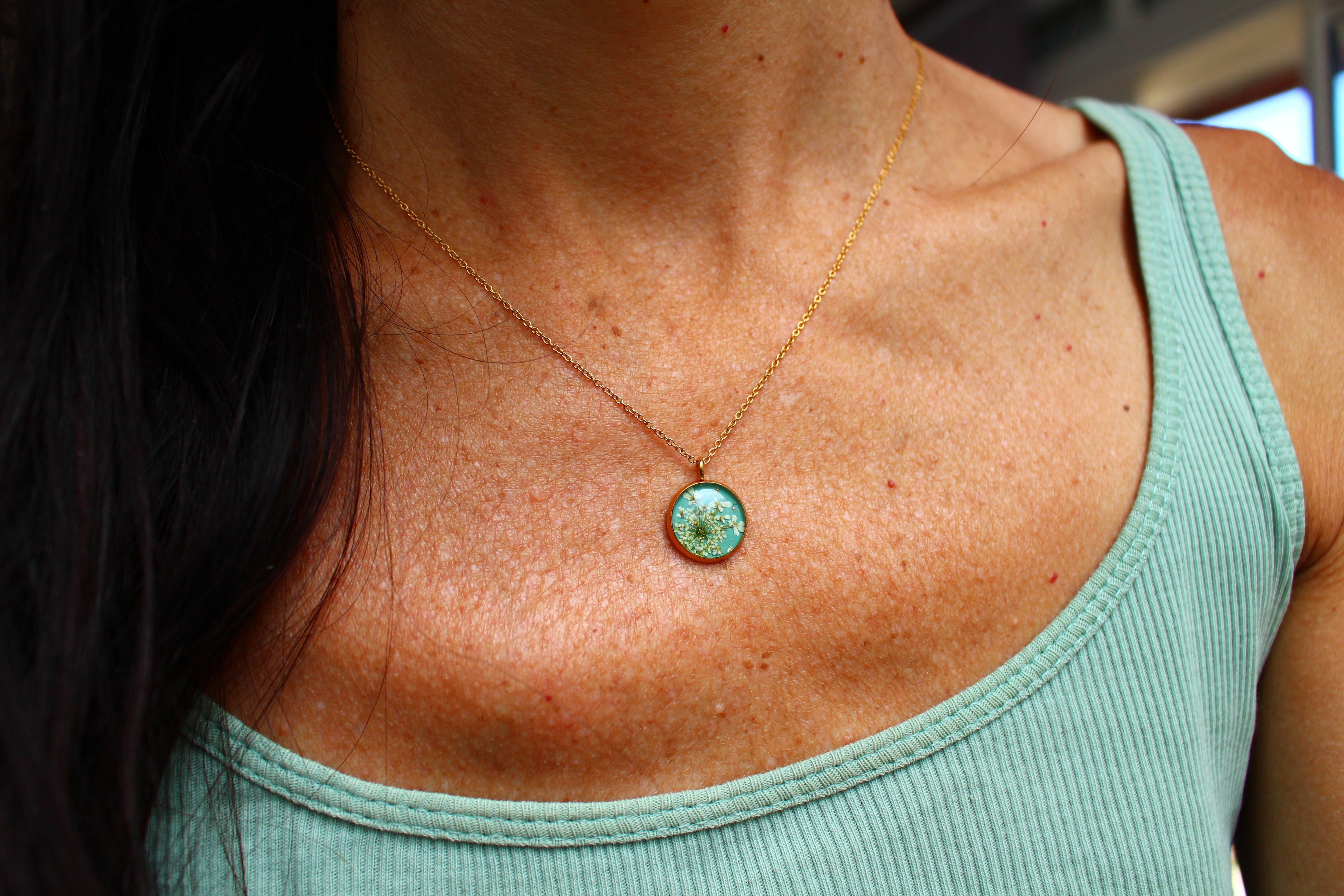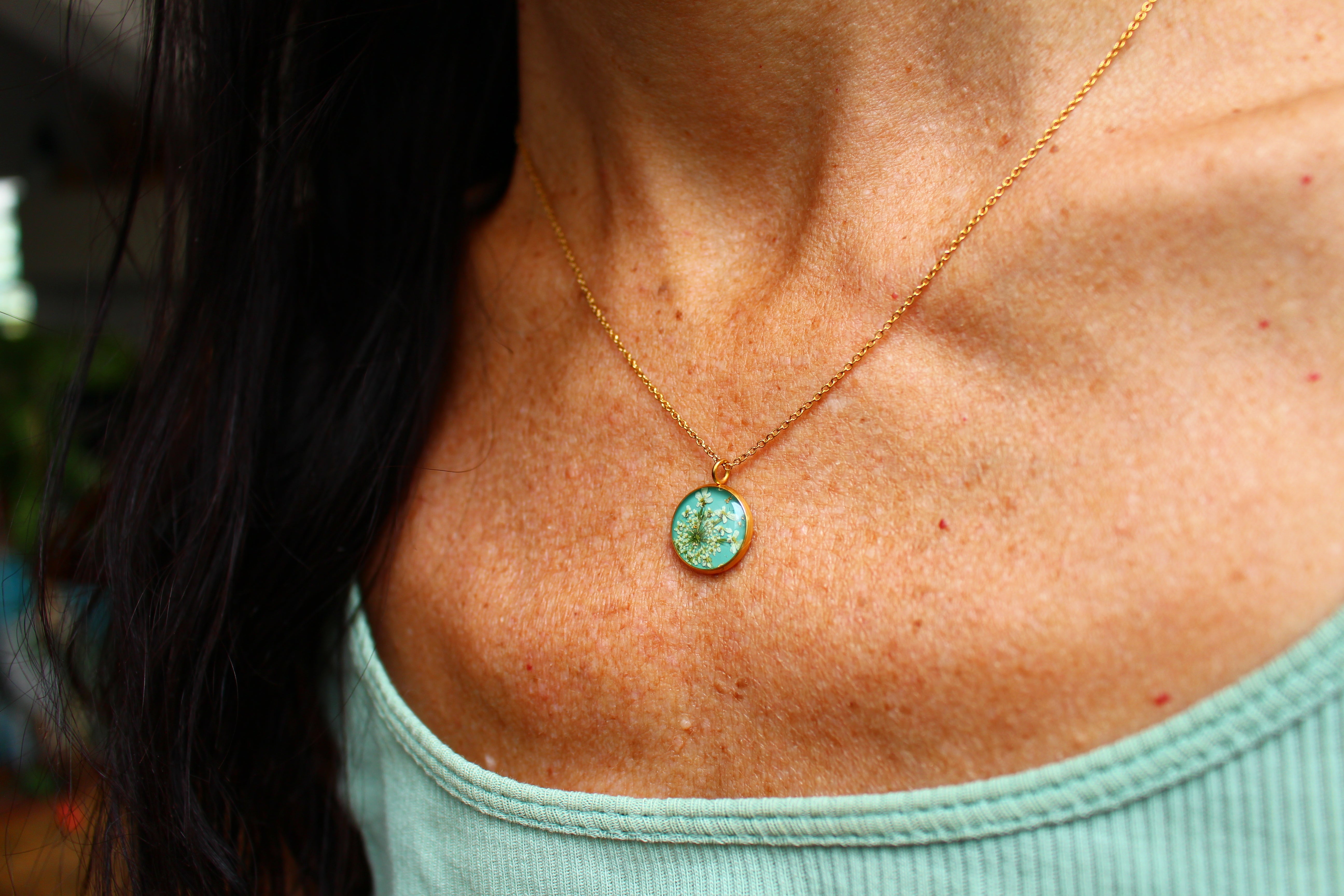 Collier composé d'un médaillon de 12mm de diamètre dans lequel j'ai incrusté dans de la résine, des petites fleurs séchées appelées dentelle de la Reine d'Anne et quelques feuilles d'or
