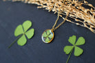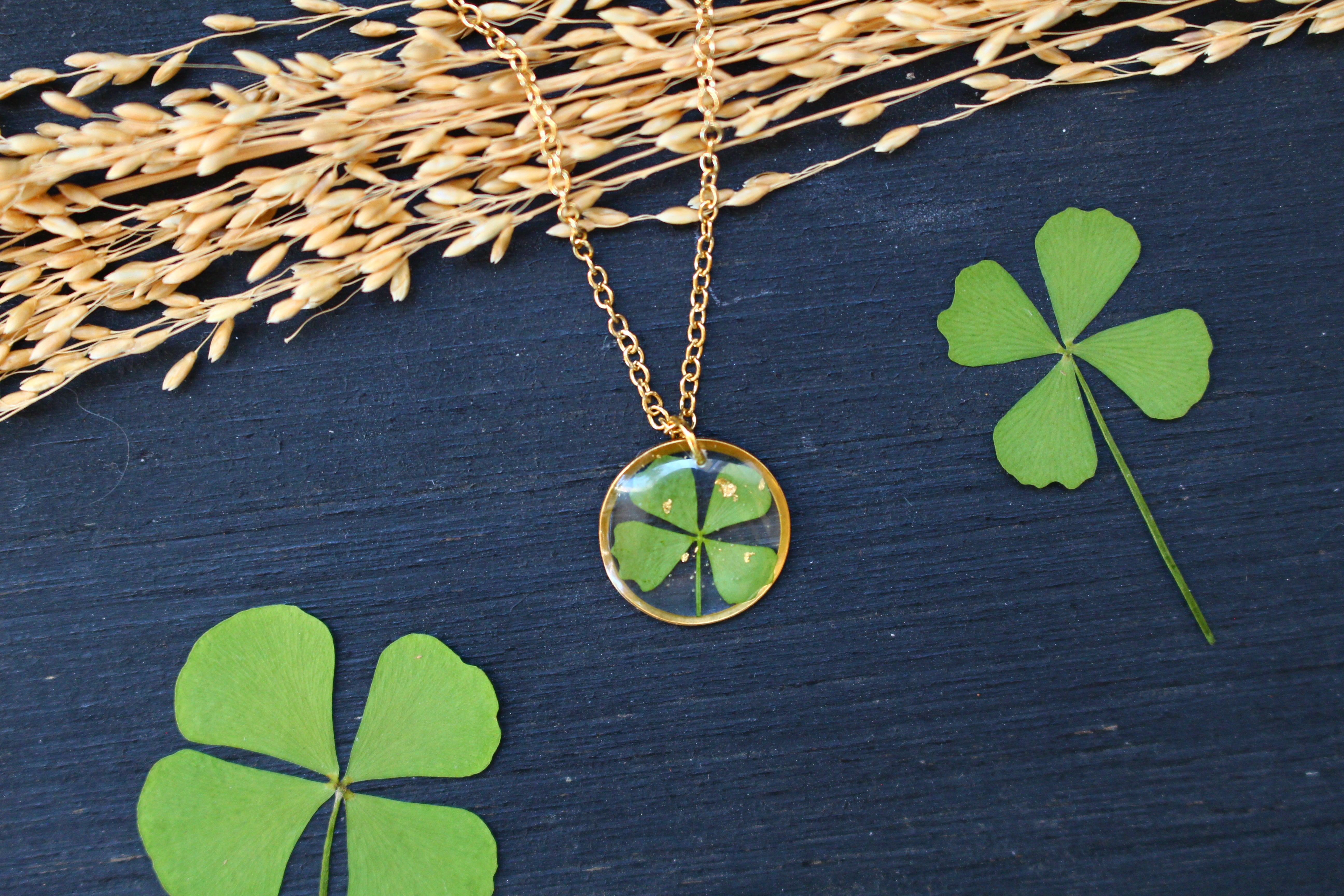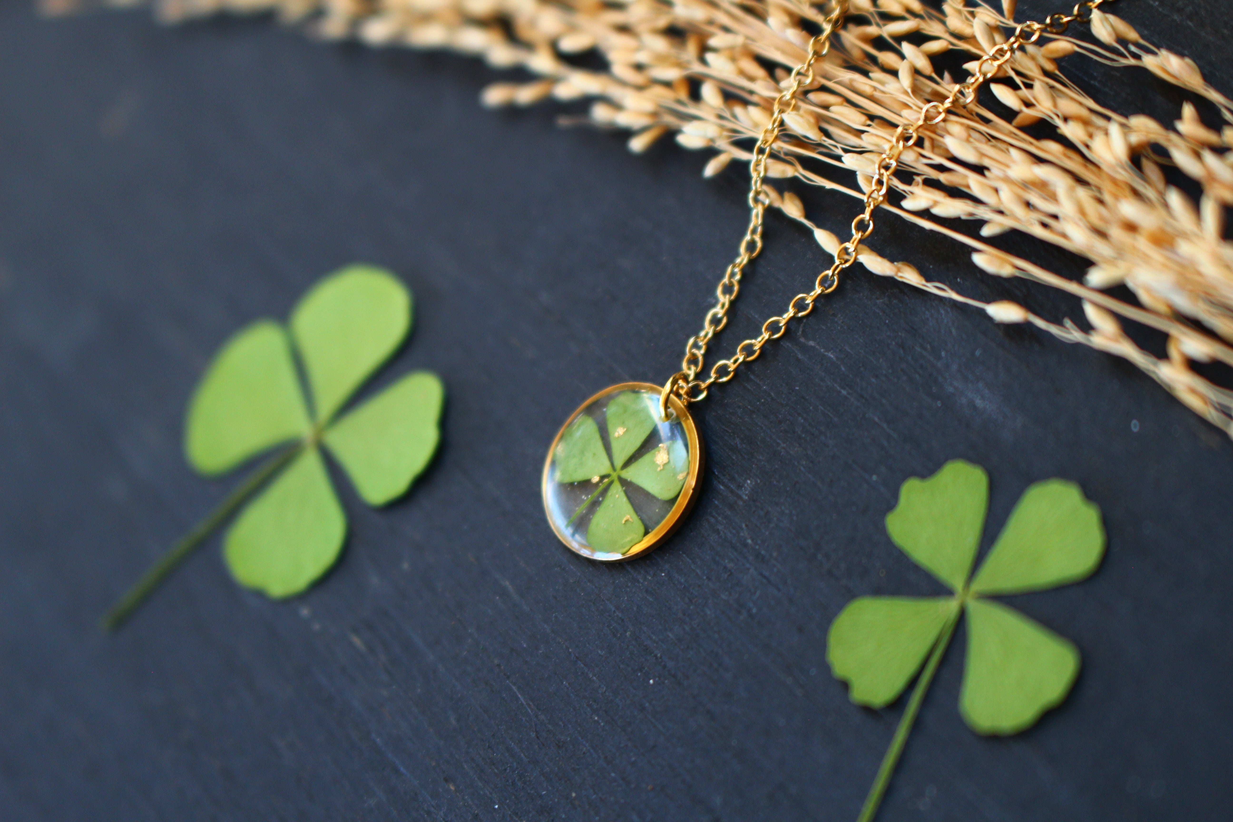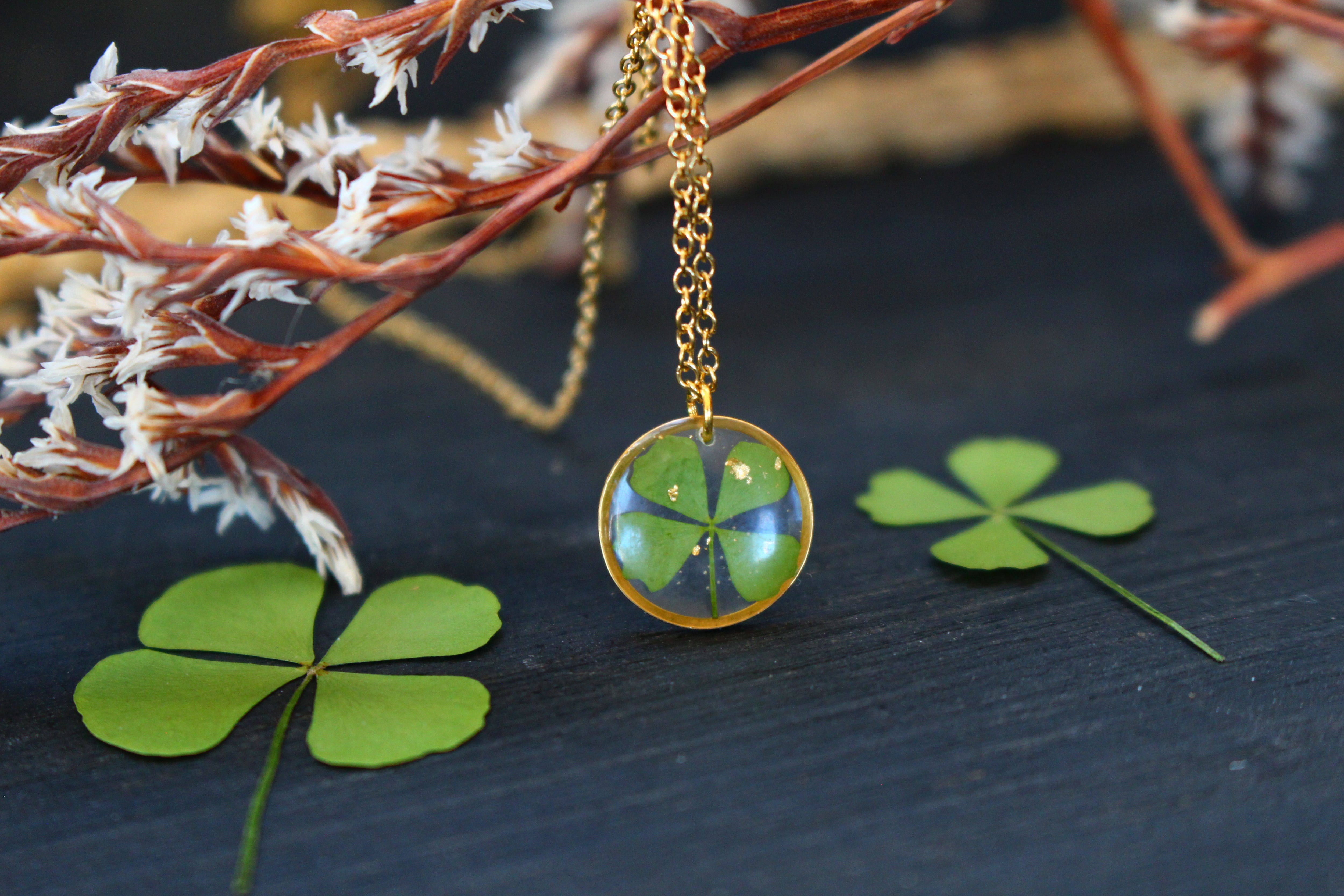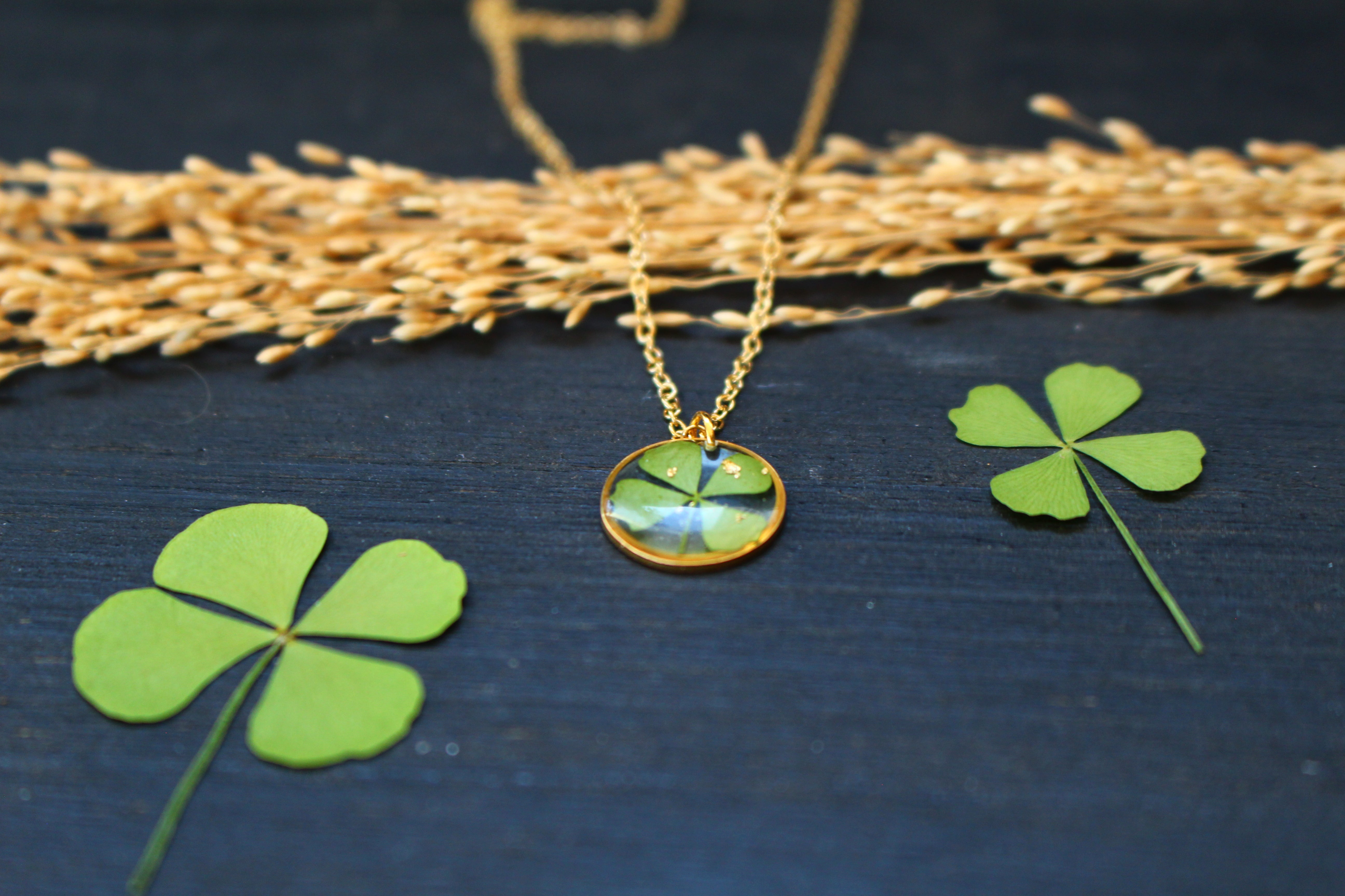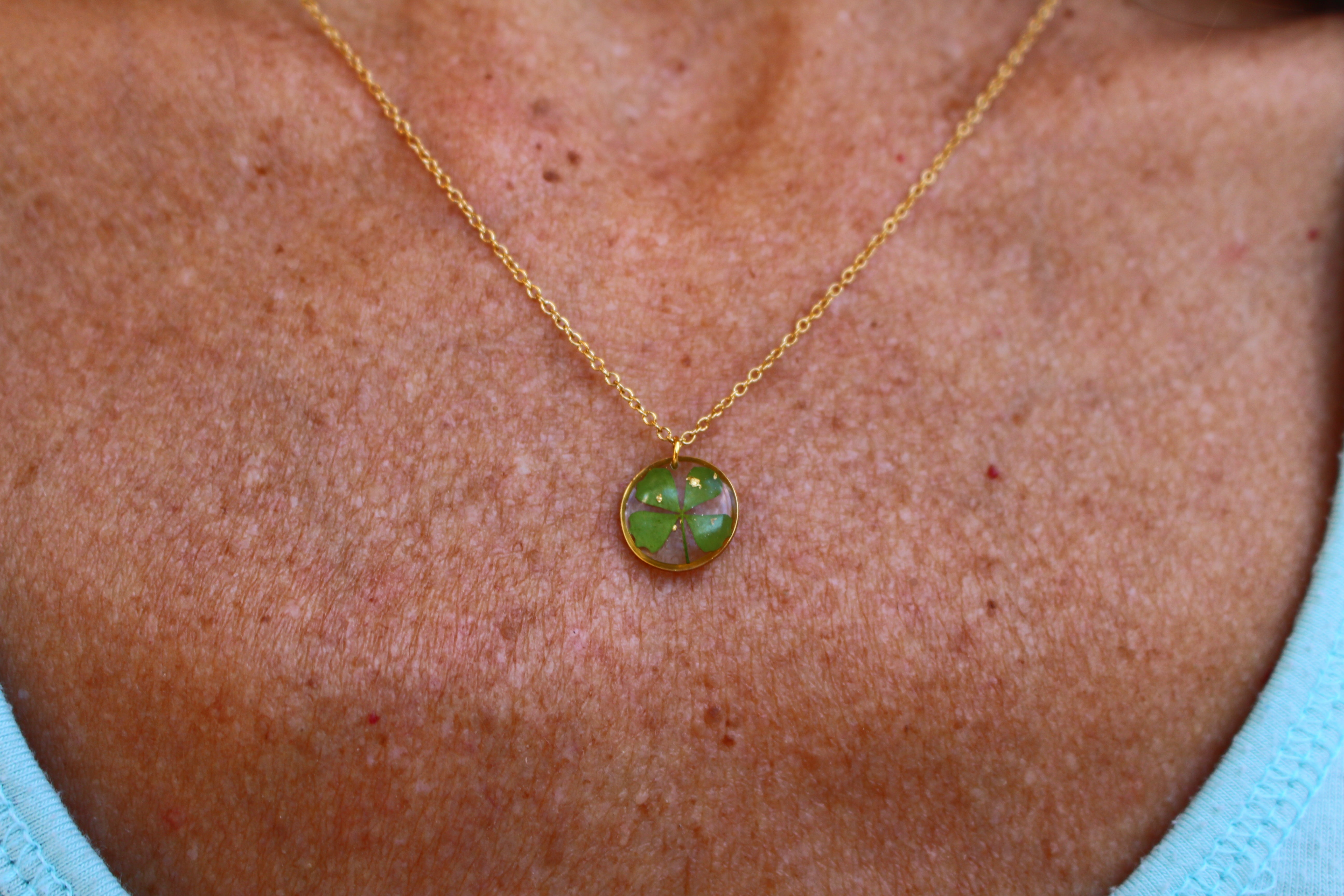 Collier composé d'un anneau de 12mm de diamètre rempli de résine dans laquelle j'ai incrusté un petit trèfle à 4 feuilles provenant de Saint leu sur l'île de la Réunion et quelques particules de feuilles d'or