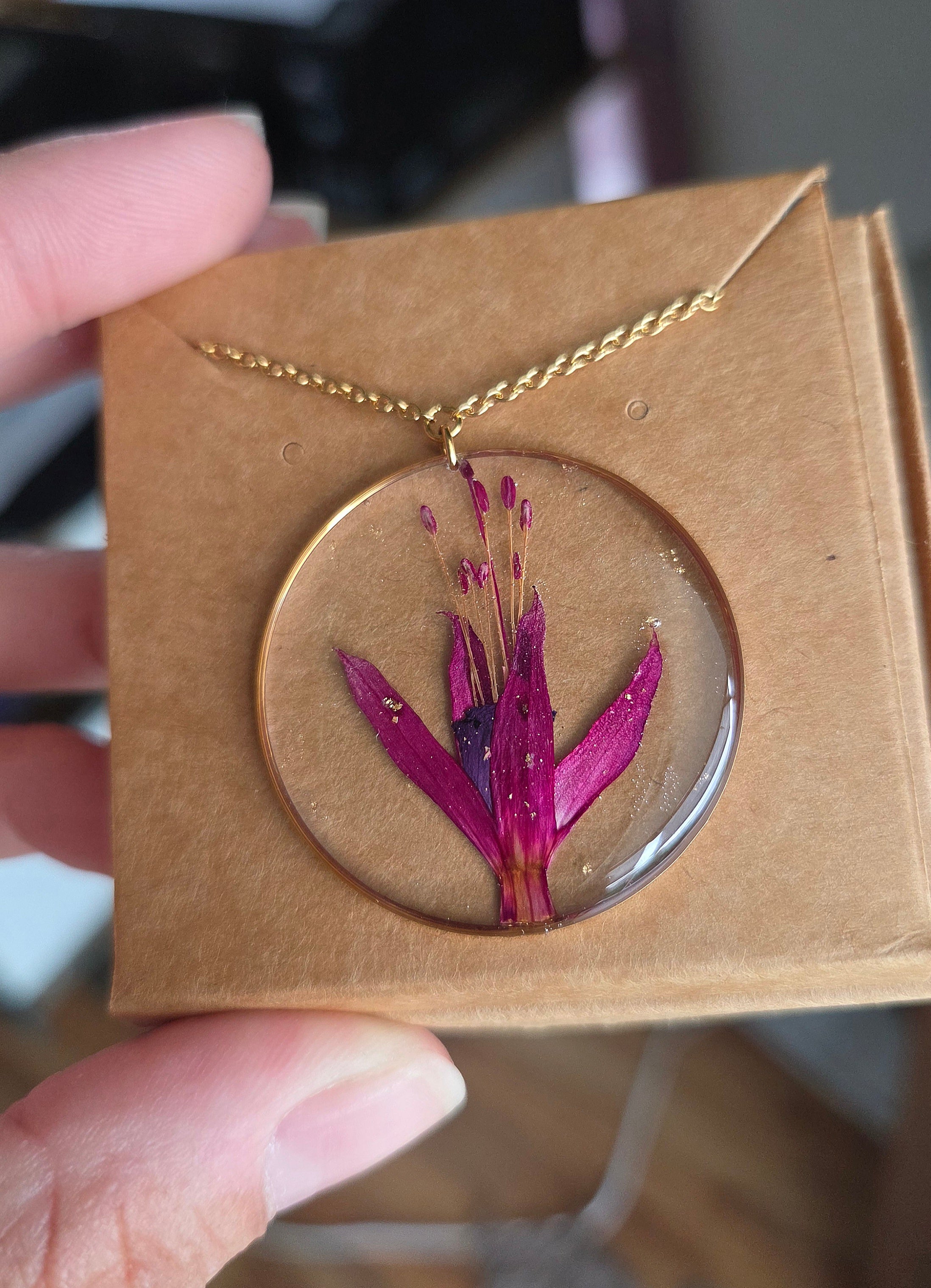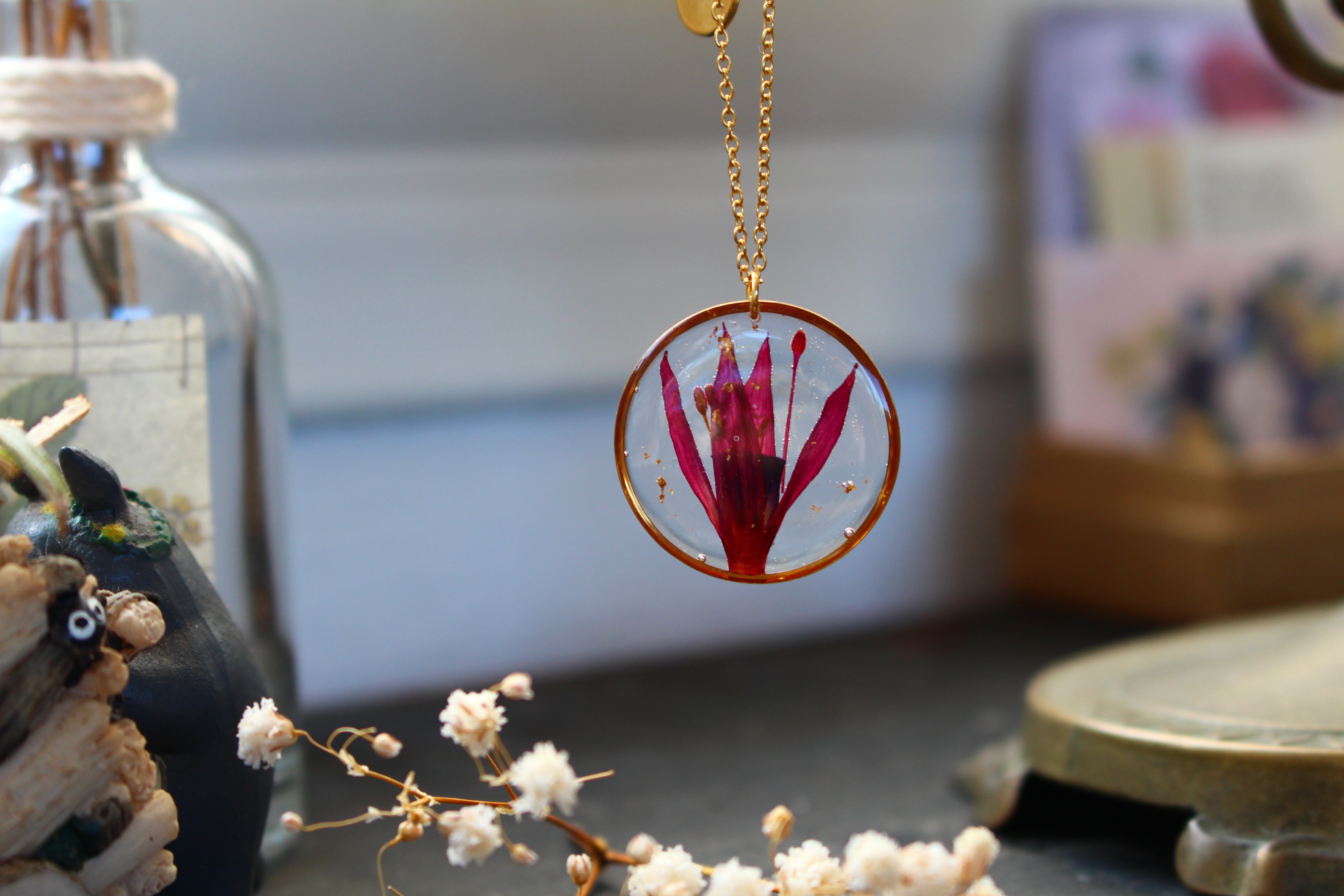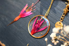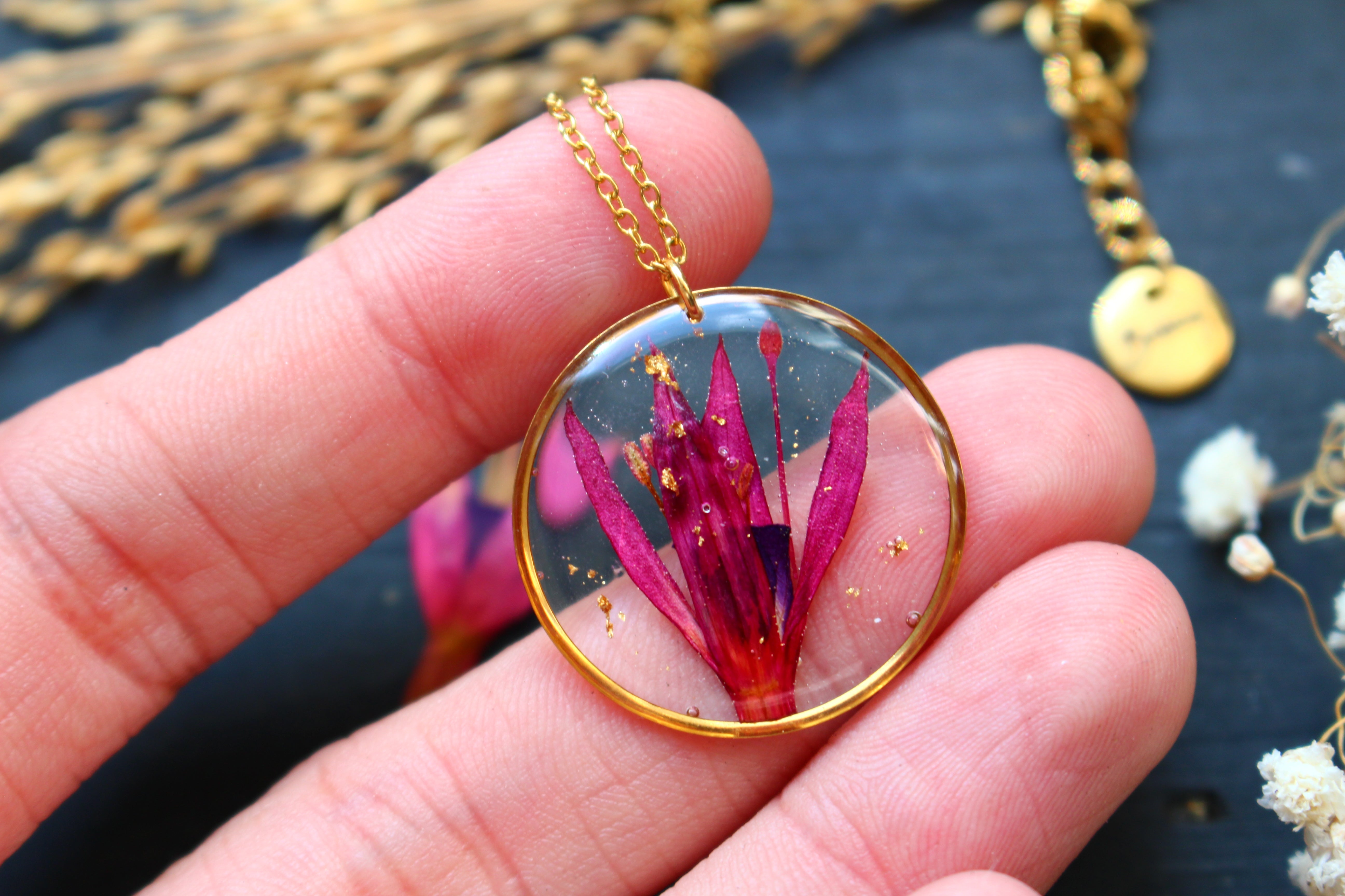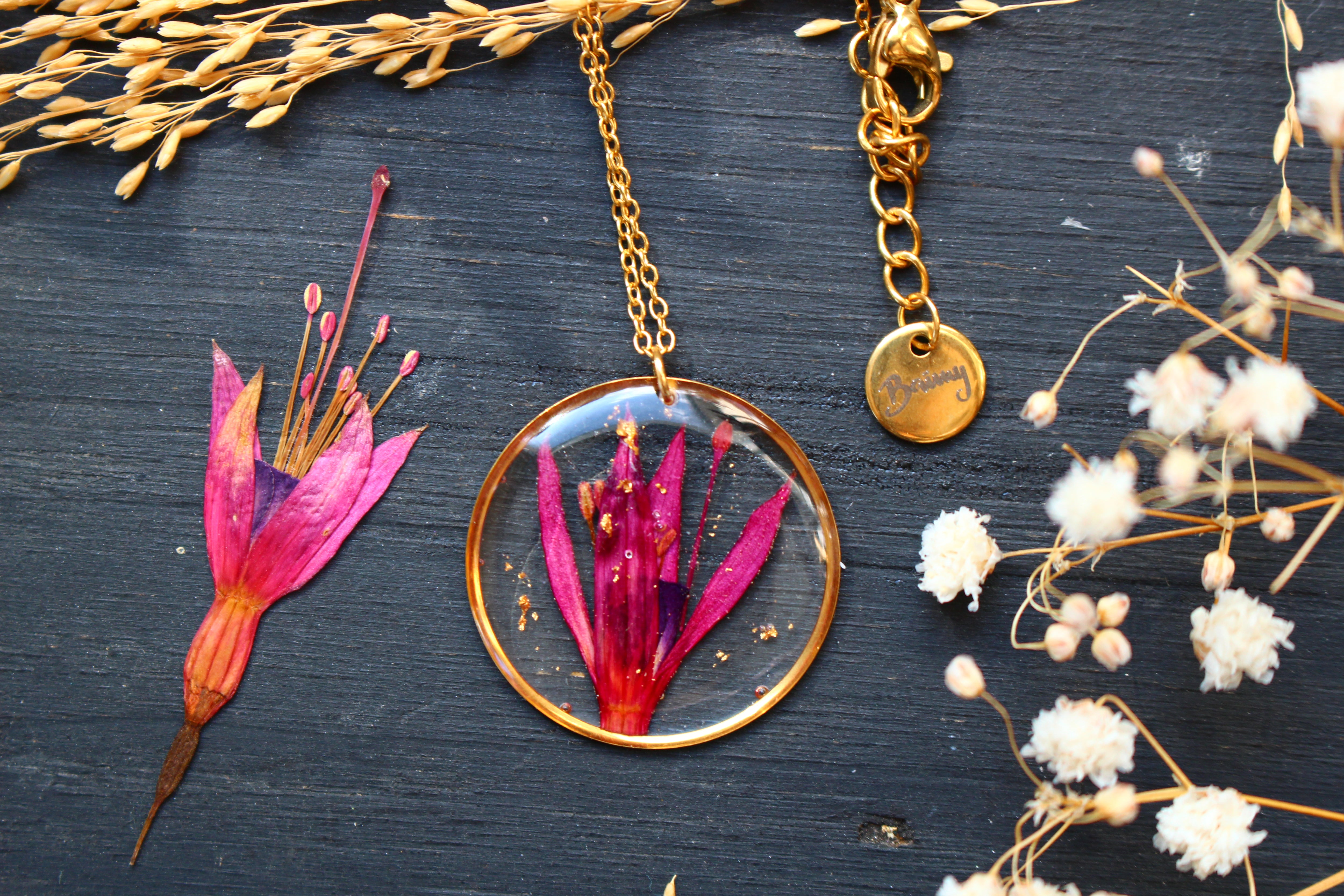 Sautoir composé d'un médaillon de 35mm de diamètre rempli de résine dans laquelle j'ai incrusté une fleur de fuchsia et quelques particules de feuilles d'or.