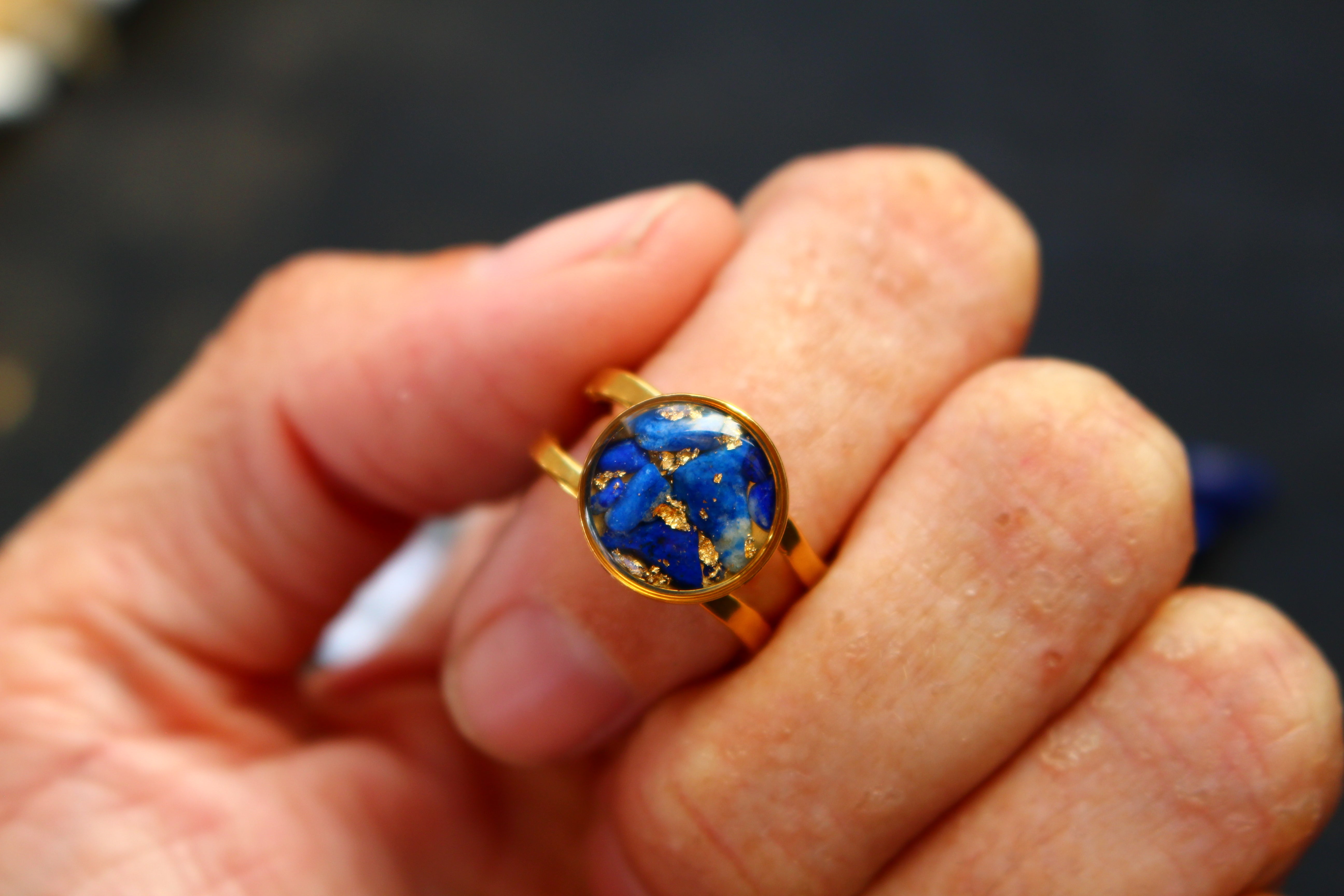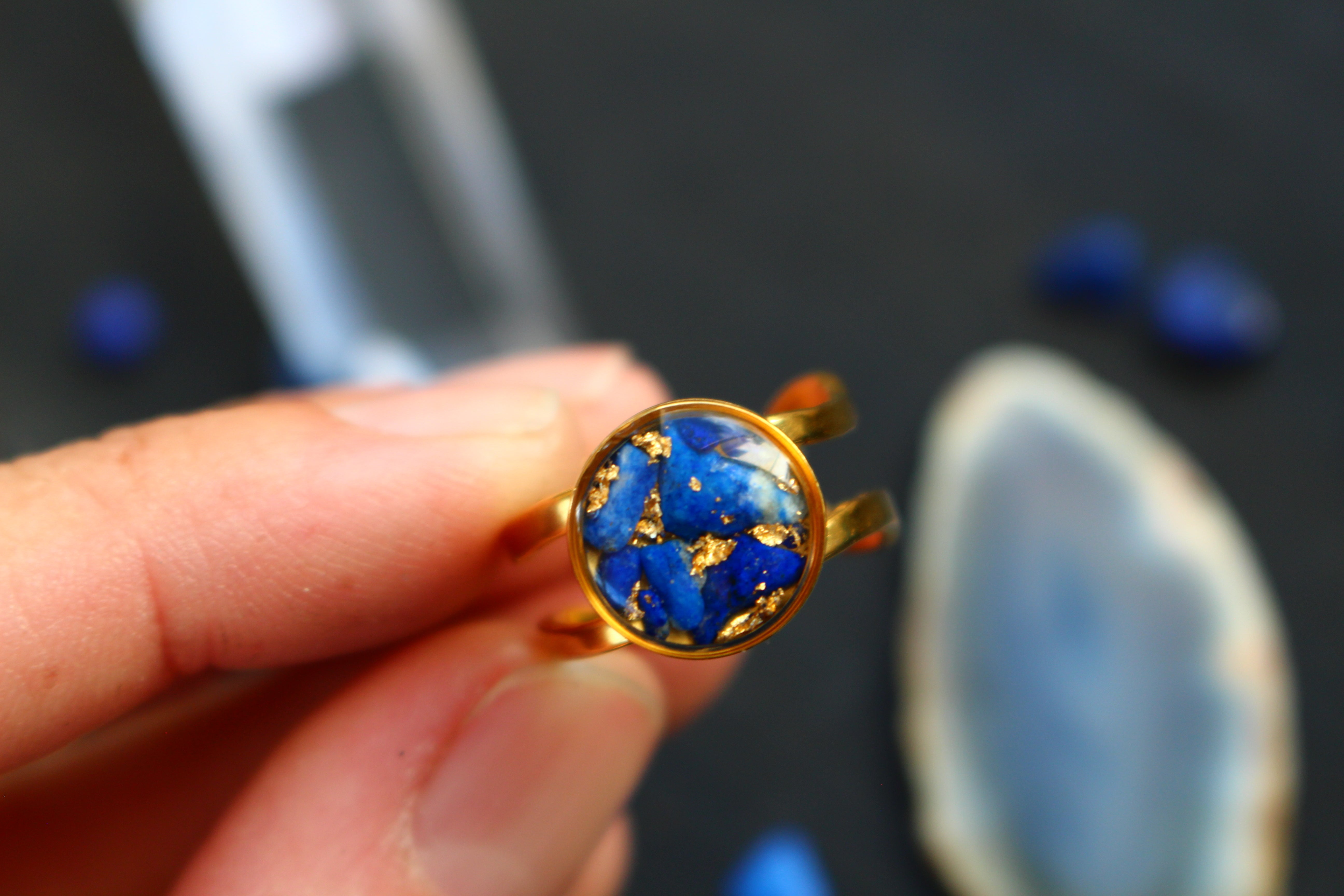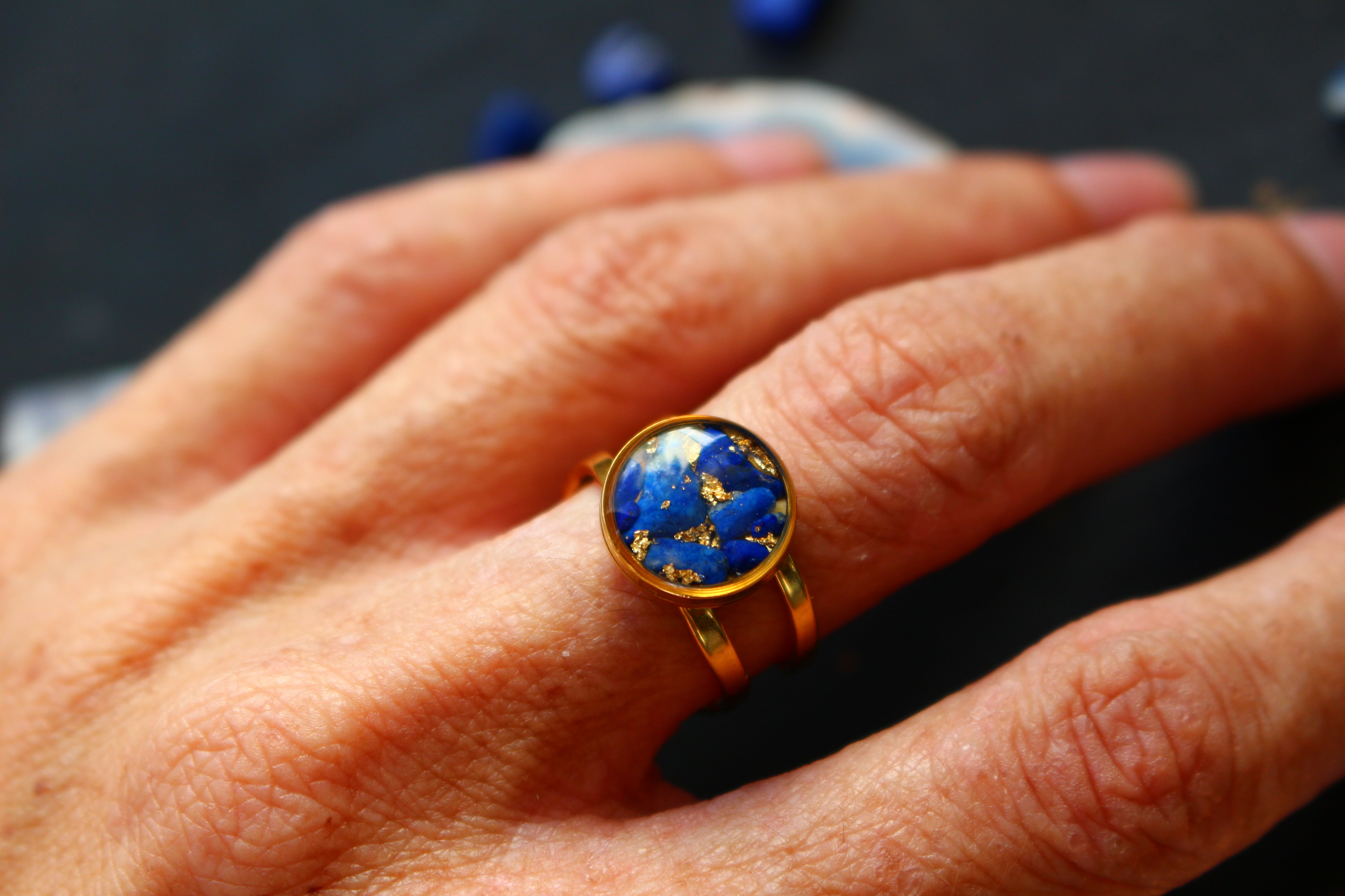 Bague avec cabochon de 12mm de diamètre rempli de résine dans laquelle sont incrustées de petites pierres de lapis lazuli et des paillettes de feuilles d'or.