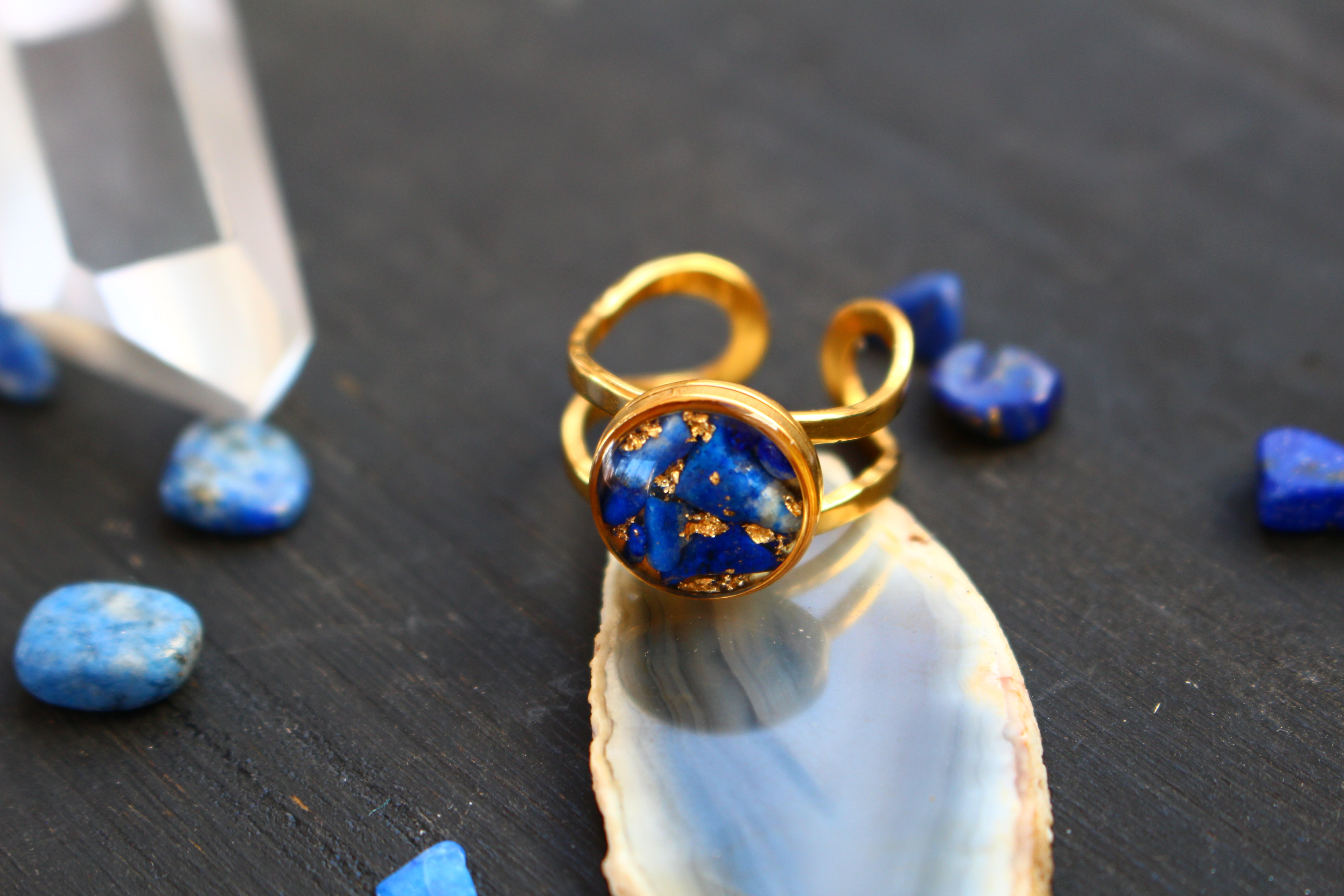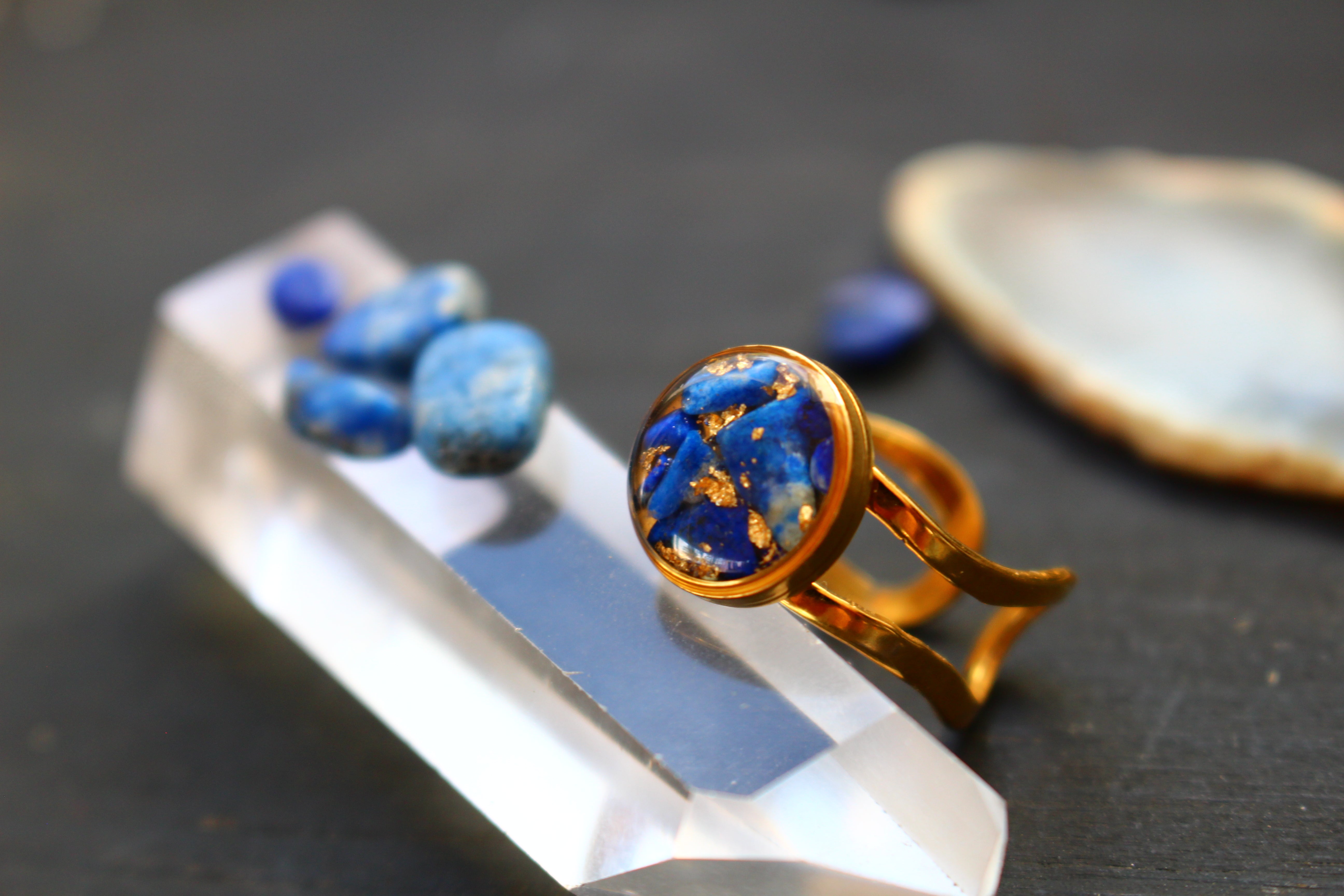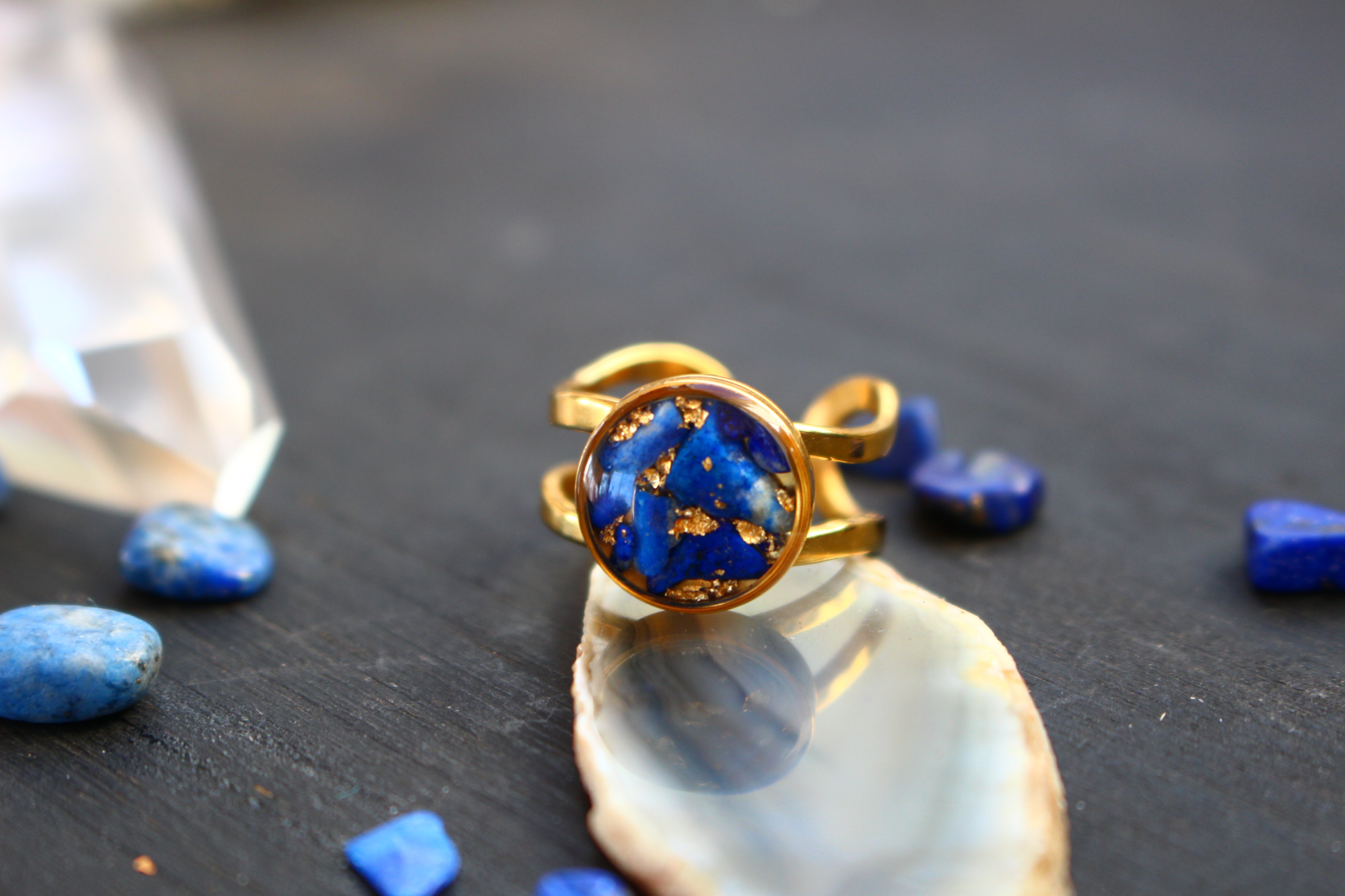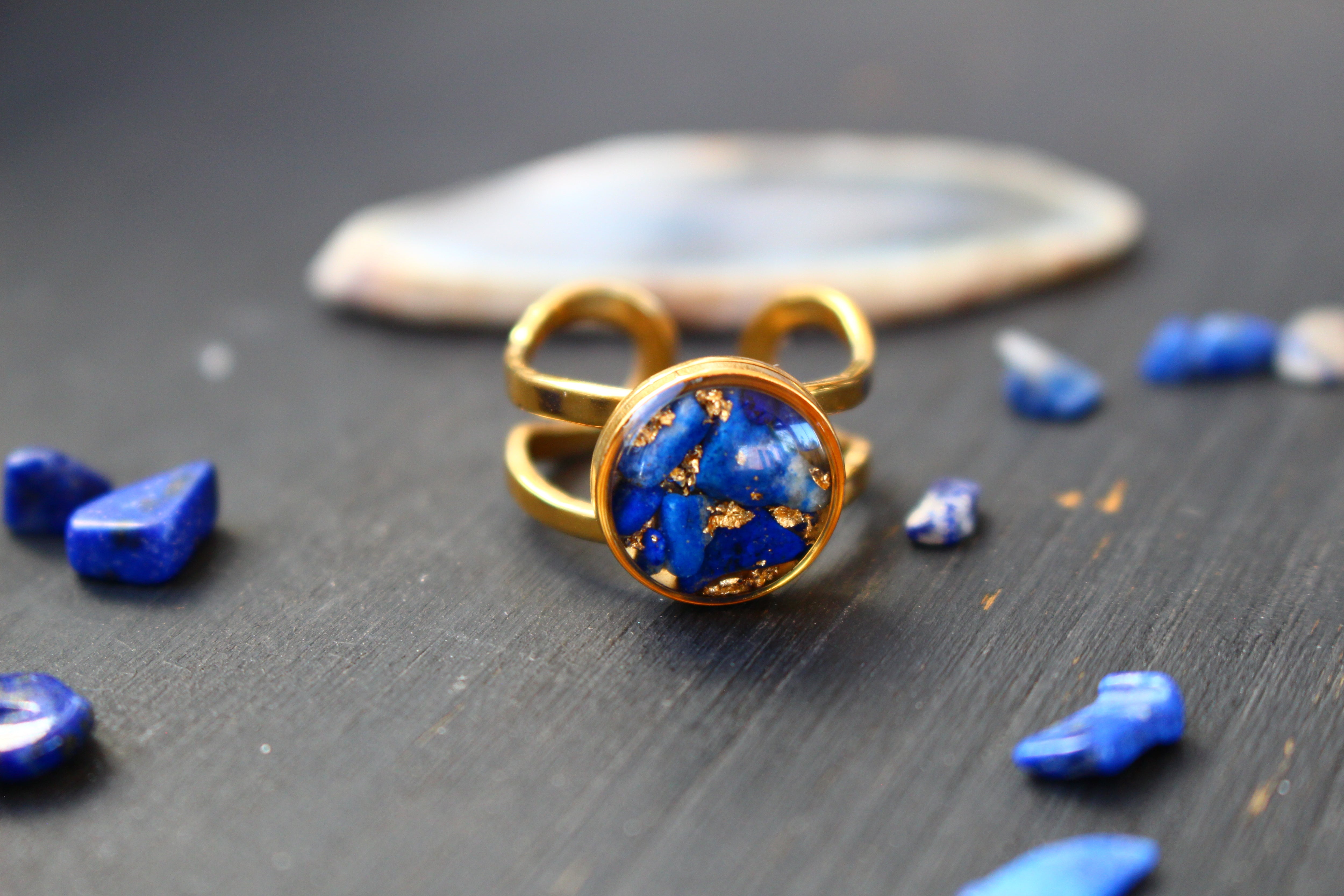 Bague avec cabochon de 12mm de diamètre rempli de résine dans laquelle sont incrustées de petites pierres de lapis lazuli et des paillettes de feuilles d'or.