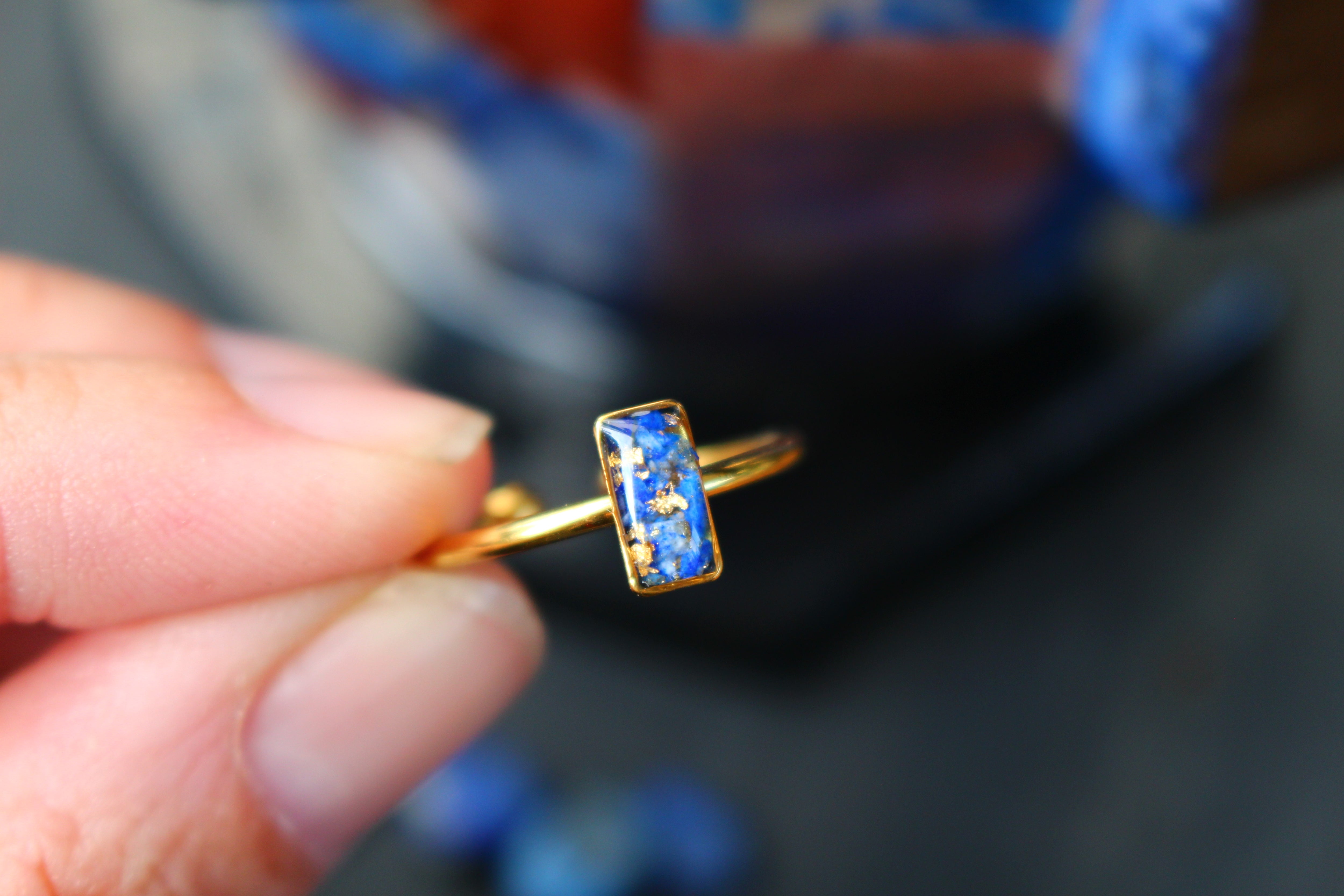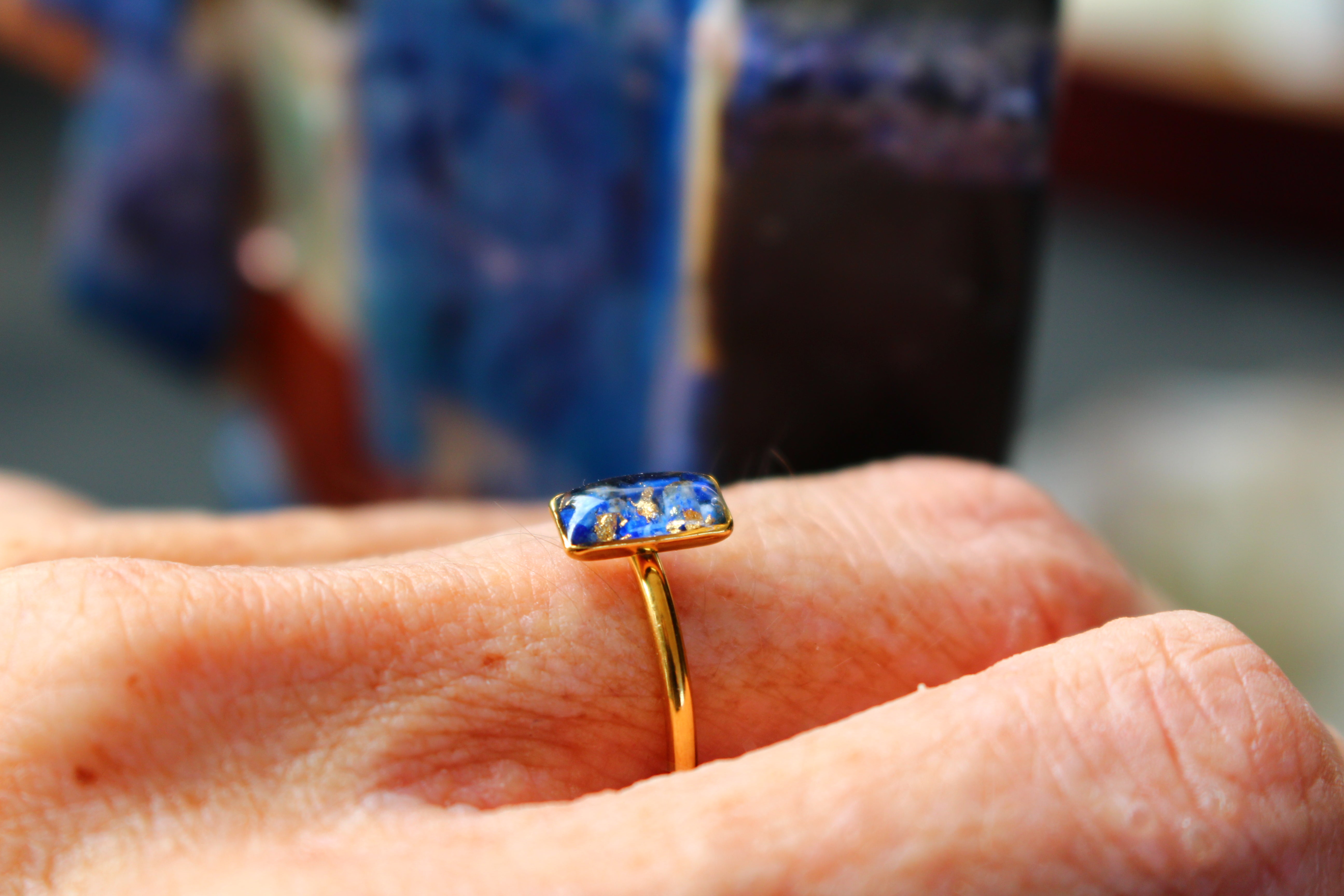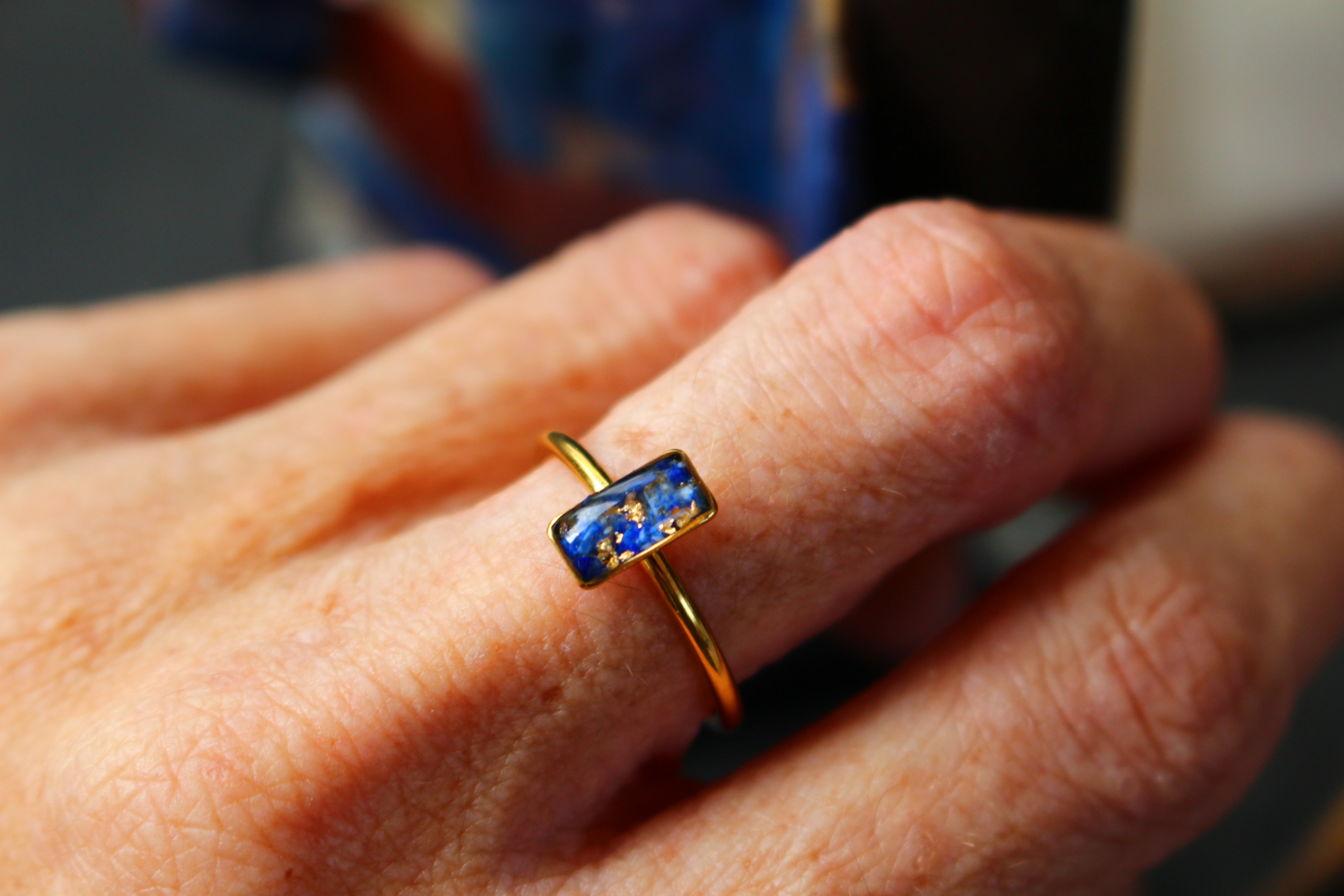 Bague avec cabochon rectangulaire rempli de résine dans laquelle sont incrustées de petits morceaux de pierres de lapis lazuli et des paillettes de feuilles d'or.